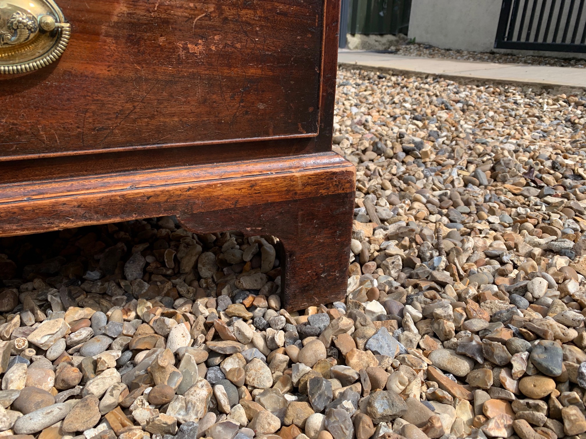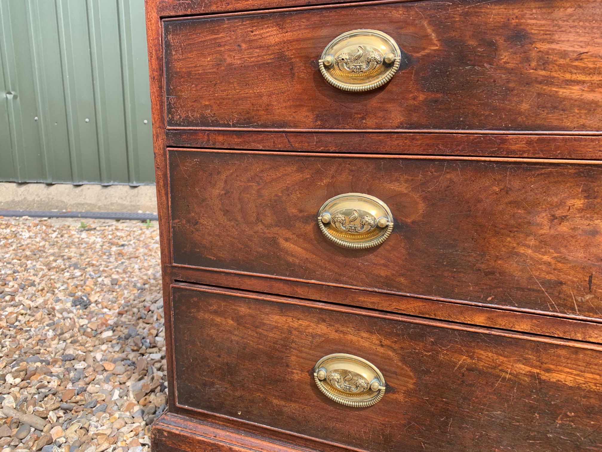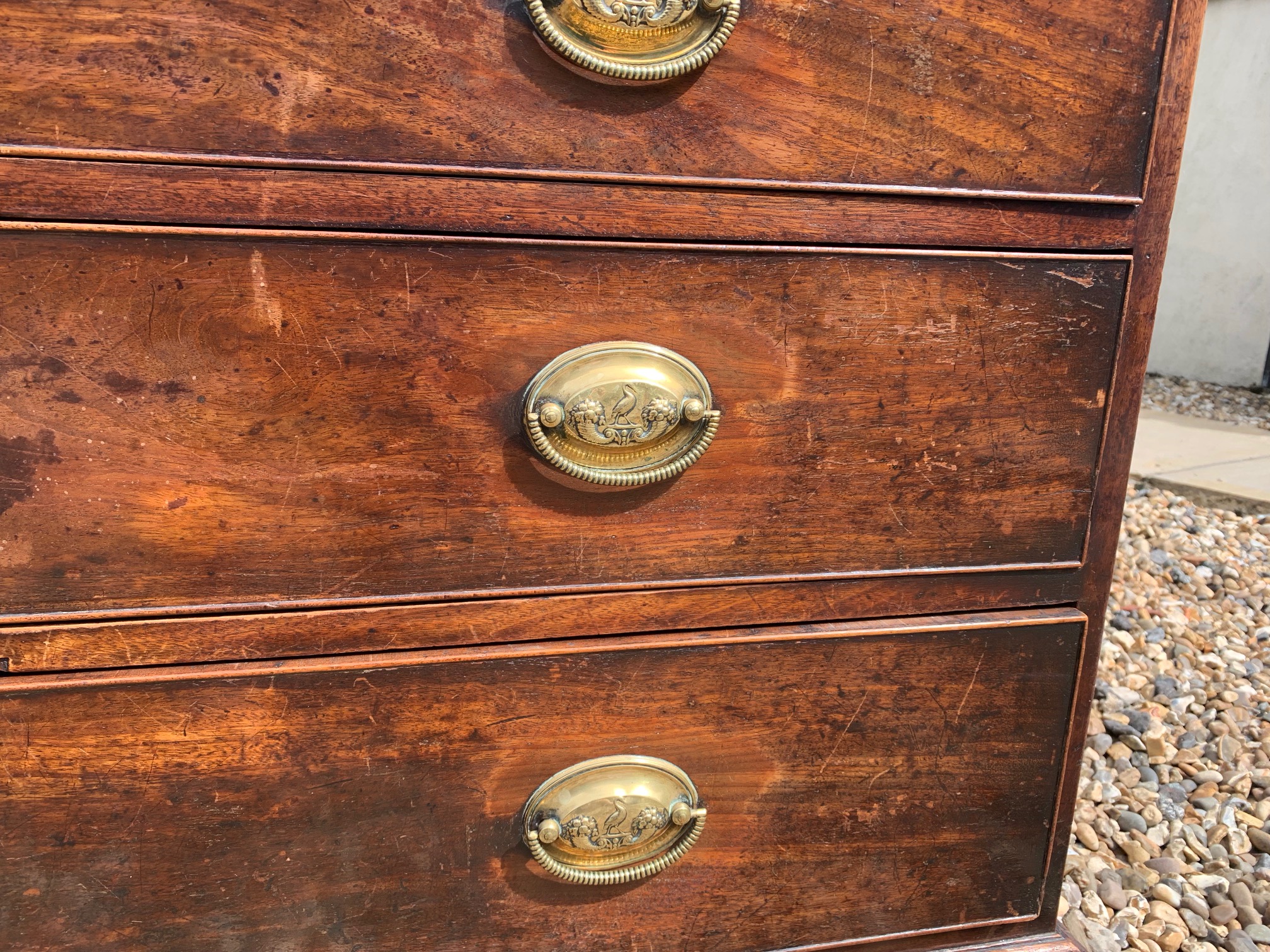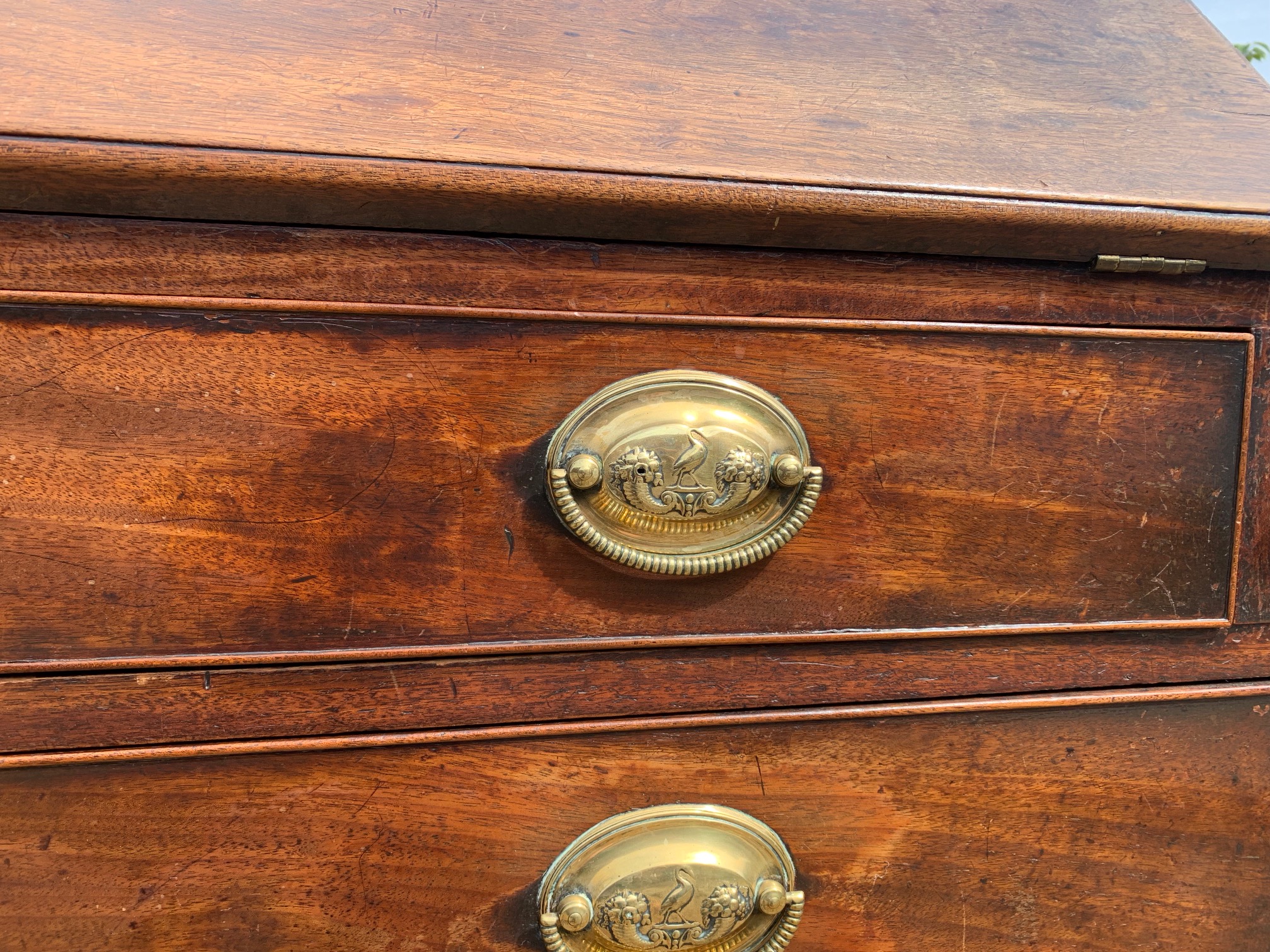 A George III Period mahogany bureau. Constructed throughout in beautifully figured Cuban mahogany and having a sloping front which opens to reveal a fitted interior with a baize lined writing surface retaining the original oval brass handles, having solid mahogany sides and raised on the original shaped bracket feet. English circa 1780-1800 in good original condition