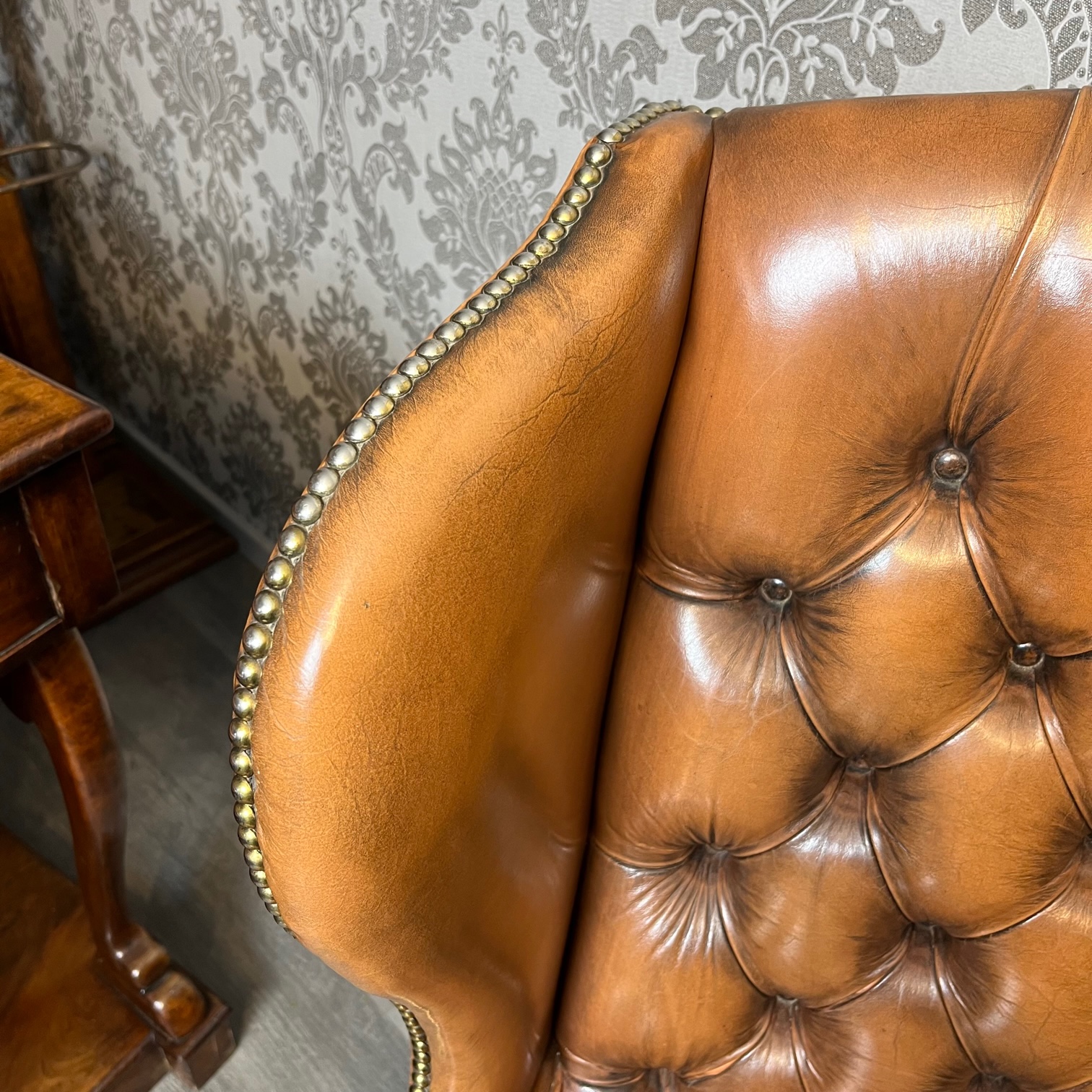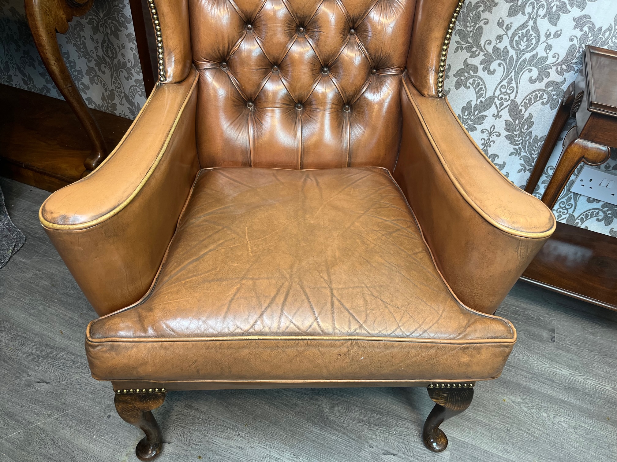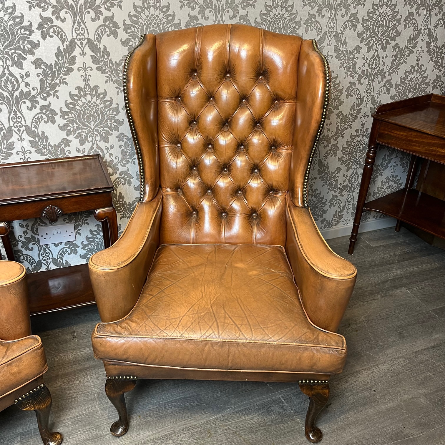 CompareA good pair of Edwardian Period Georgian Style leather wing armchairs. Each of traditional form with deep buttoned backs, wing arms and close nailed brass studded detail. Having removable leather cushions and raised on elegant cabriole supports united by turned stretchers. English circa 1910