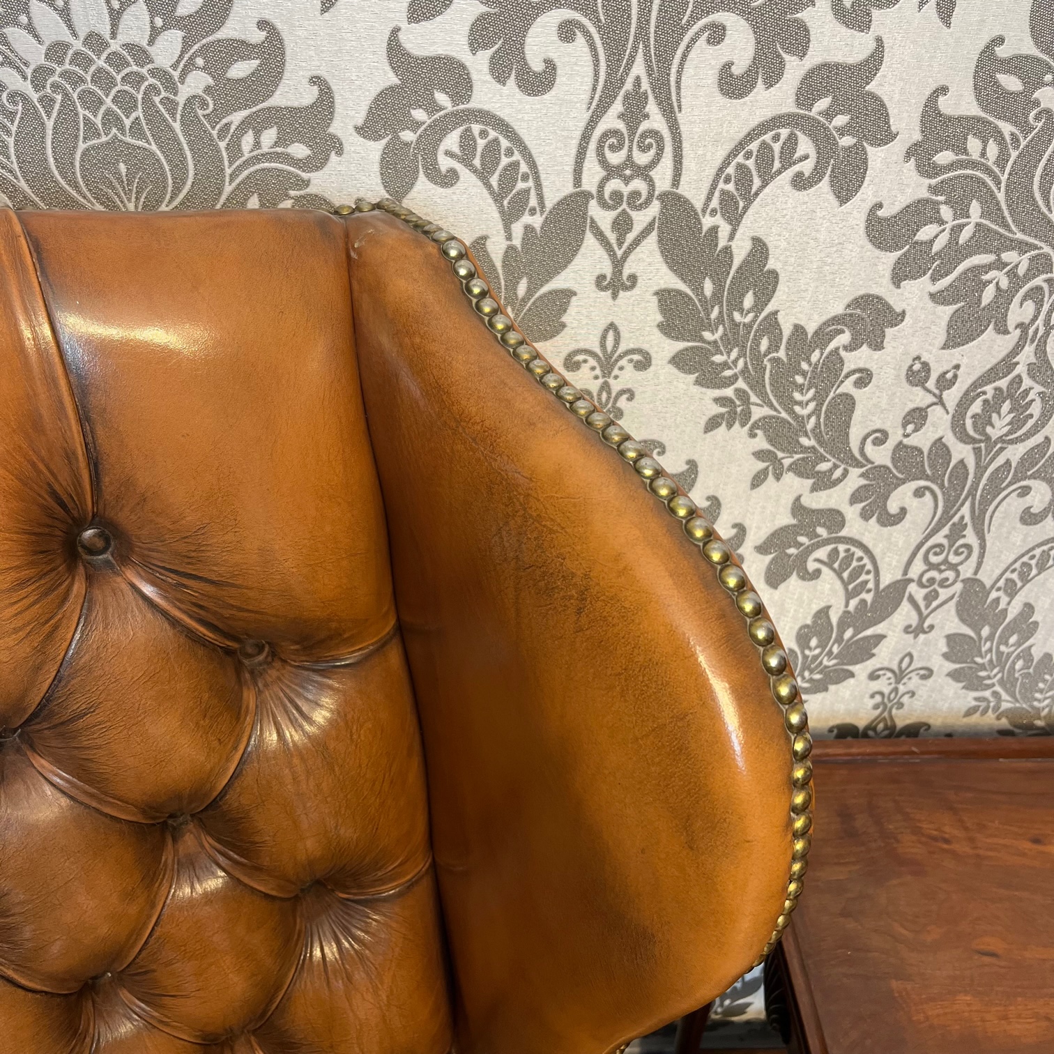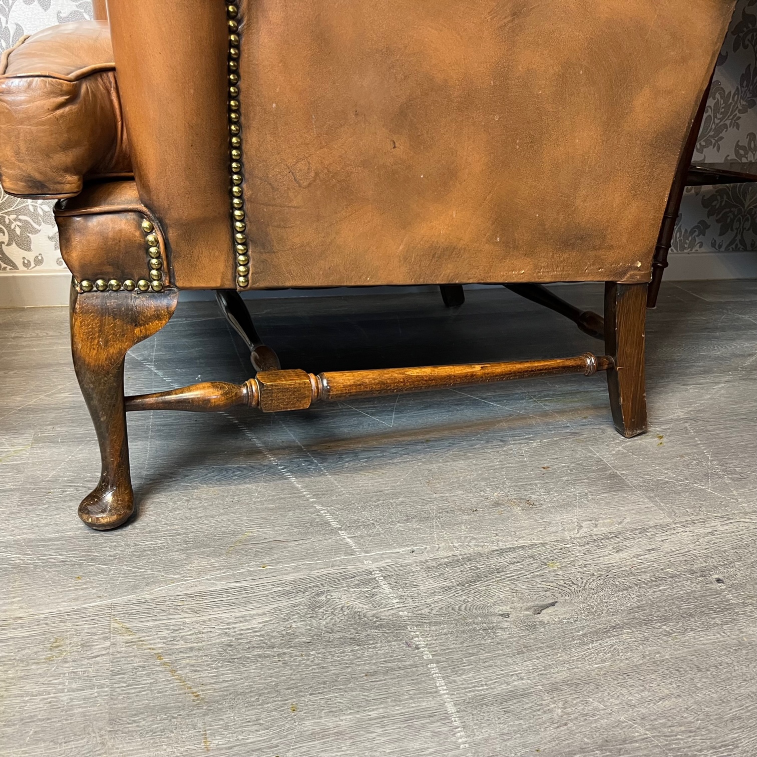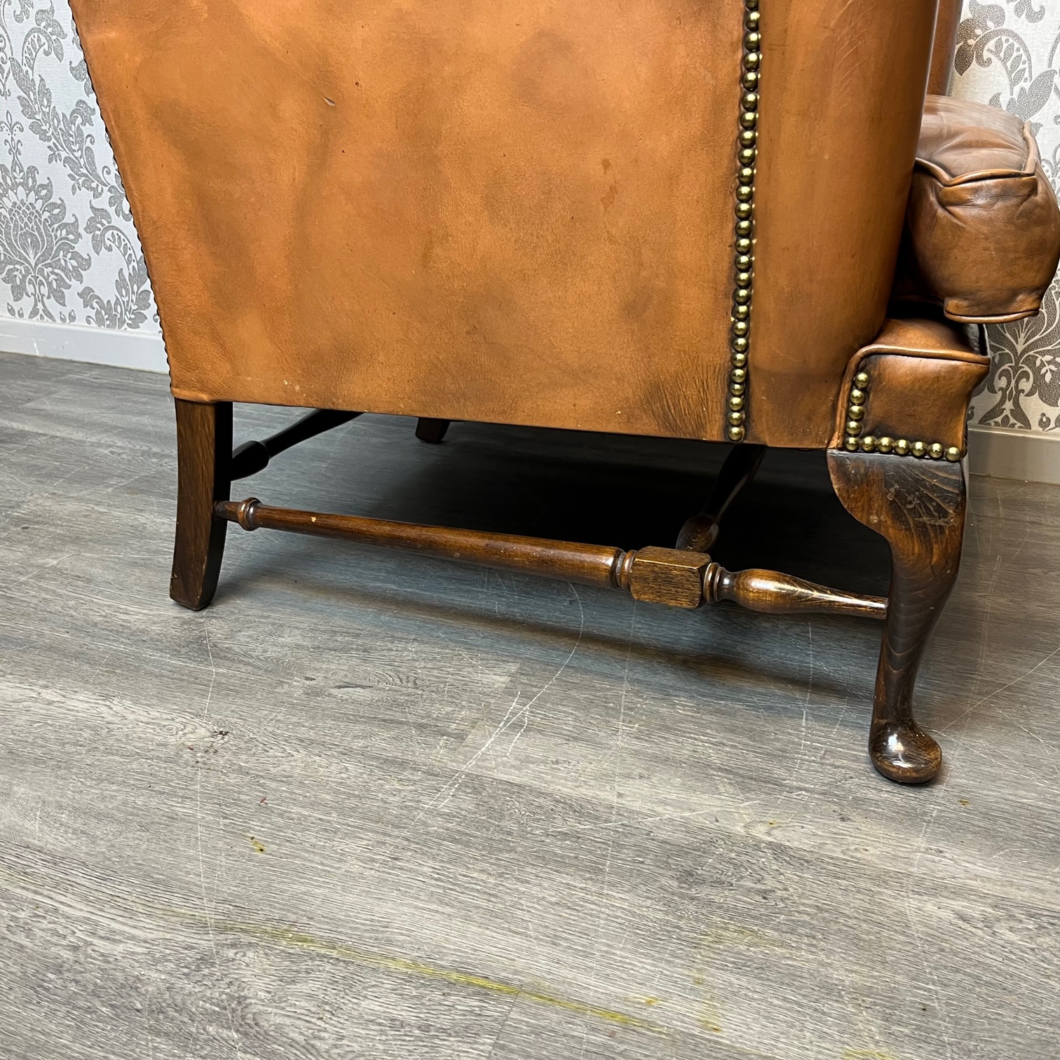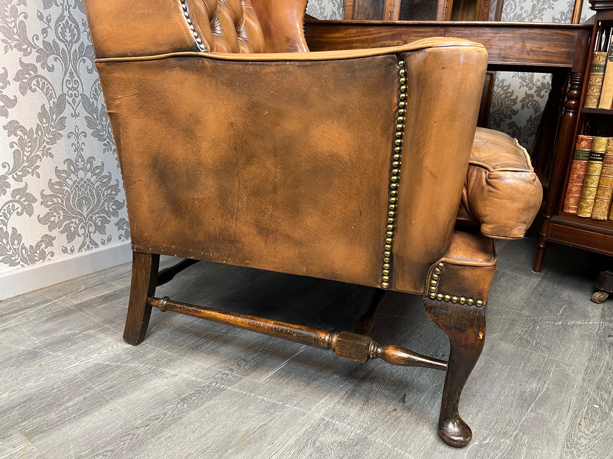 CompareA good pair of Edwardian Period Georgian Style leather wing armchairs. Each of traditional form with deep buttoned backs, wing arms and close nailed brass studded detail. Having removable leather cushions and raised on elegant cabriole supports united by turned stretchers. English circa 1910
