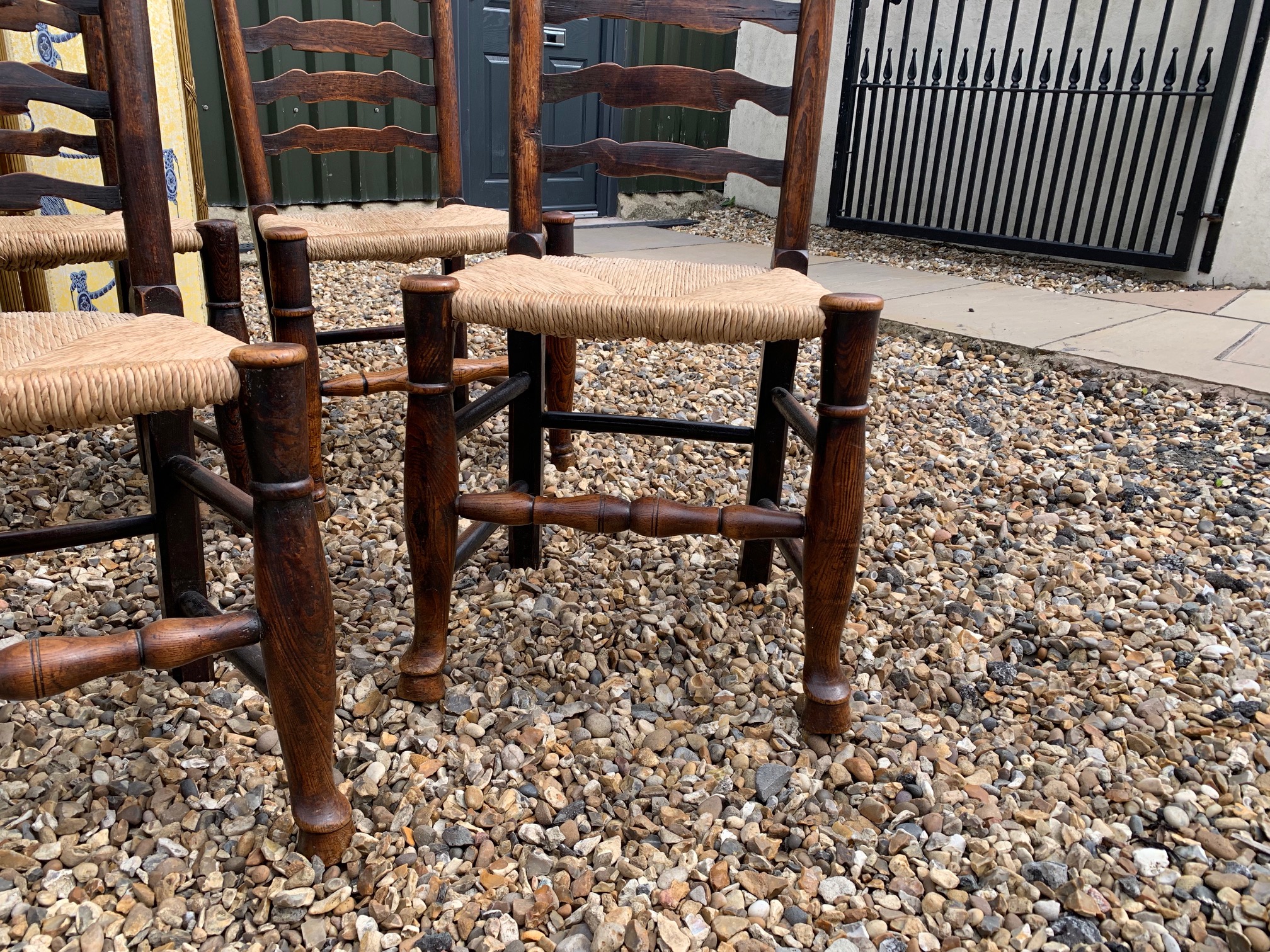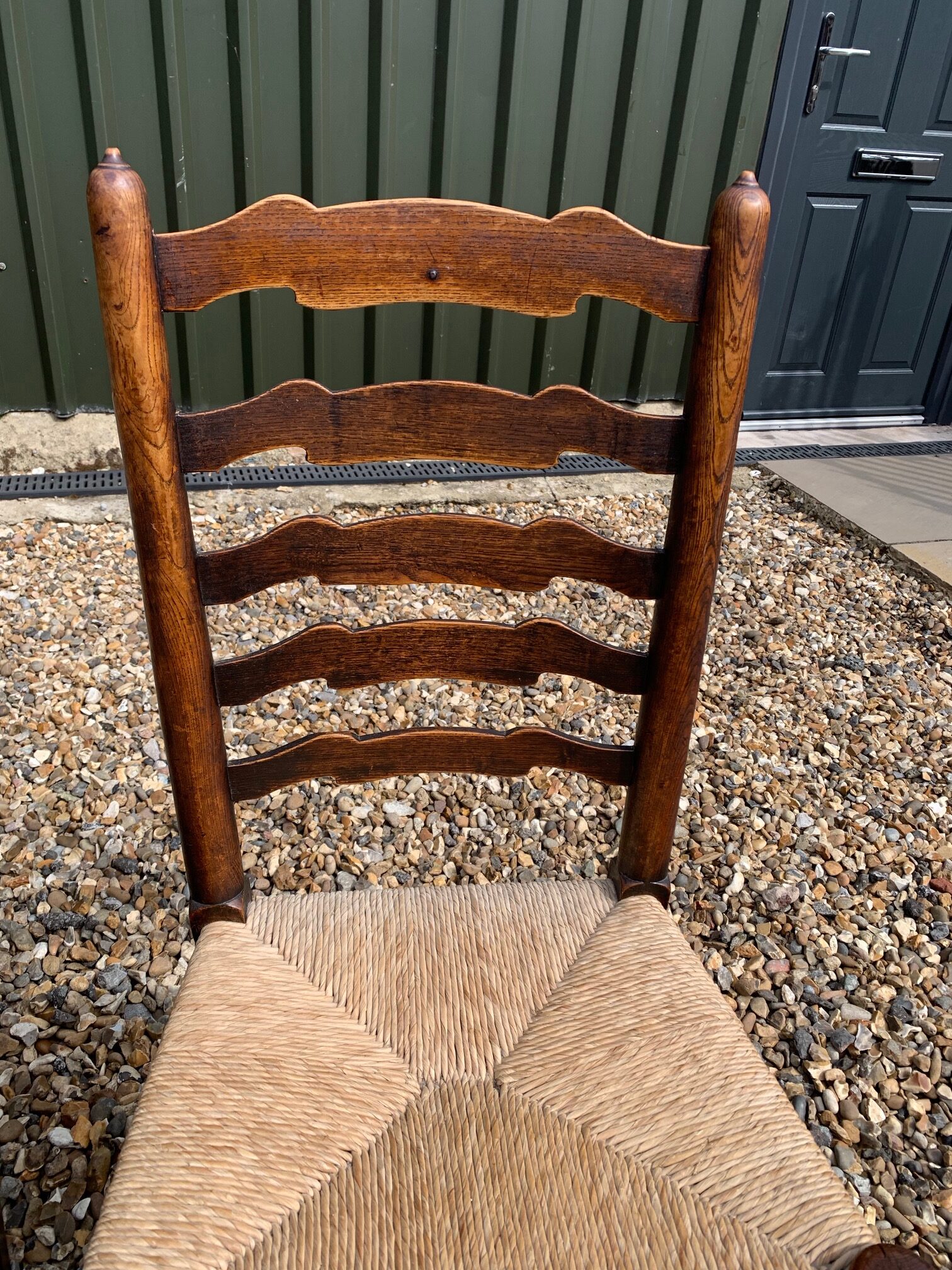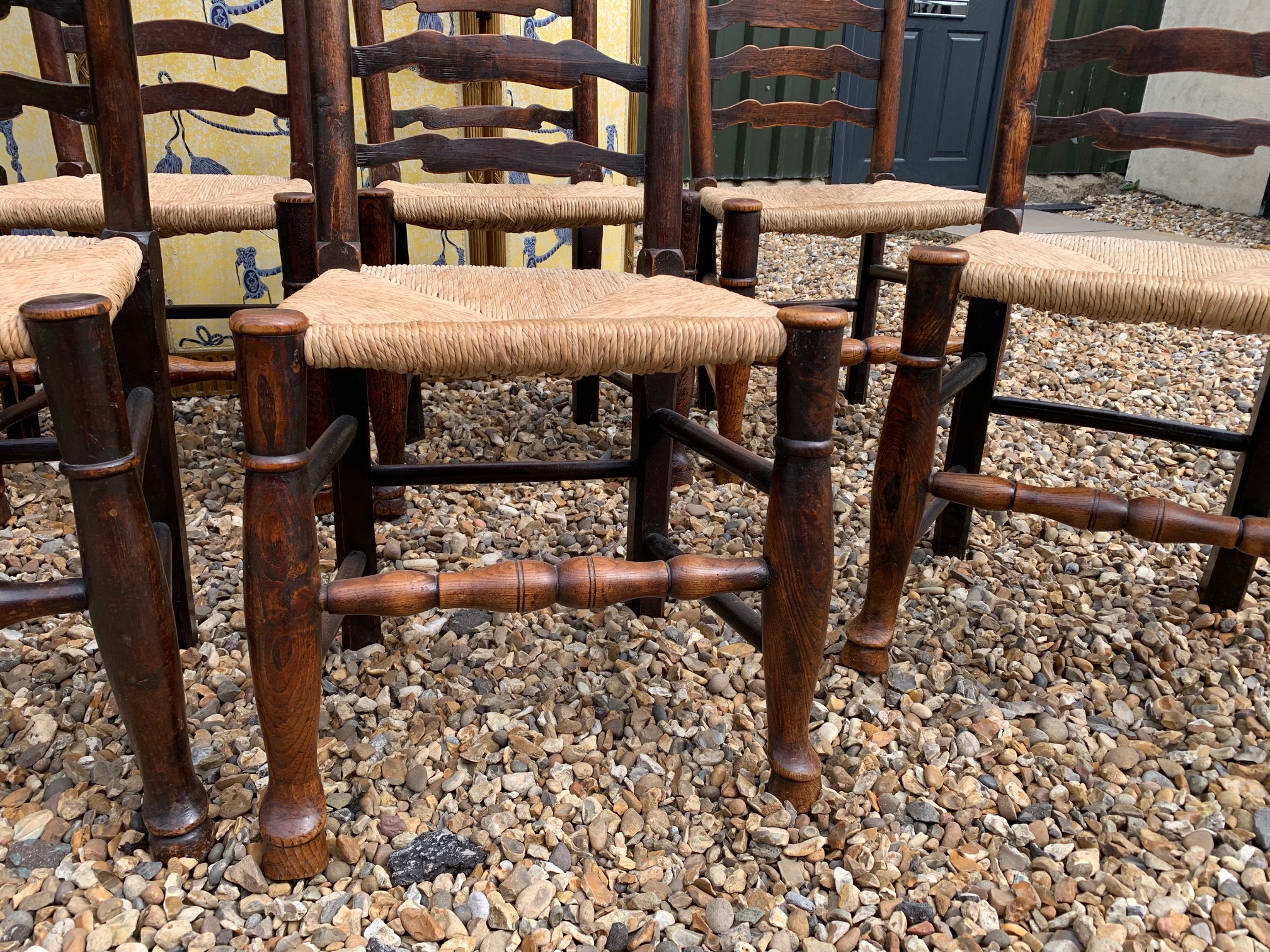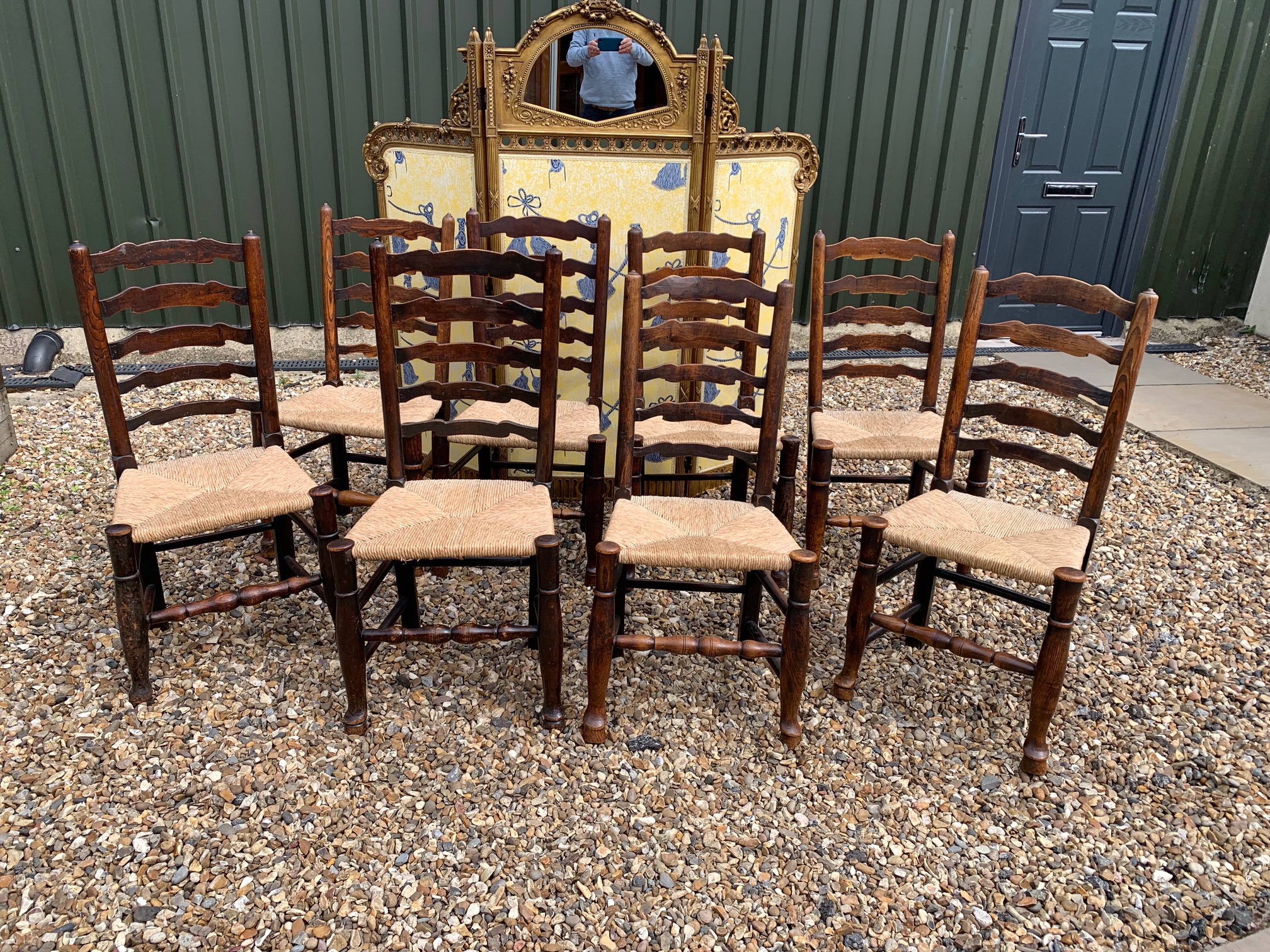 CompareA good set of eight 19th Century ash and elm ladder back dining chairs. Each having turned uprights with five wavy ladder back supports, rushed seats and raised on turned supports united by stretchers with pad feet. English circa 1830-1840, excellent condition, a lovely colour and patination. Extremely sturdy, no wobbles and the seats have been re-rushed by the previous owners