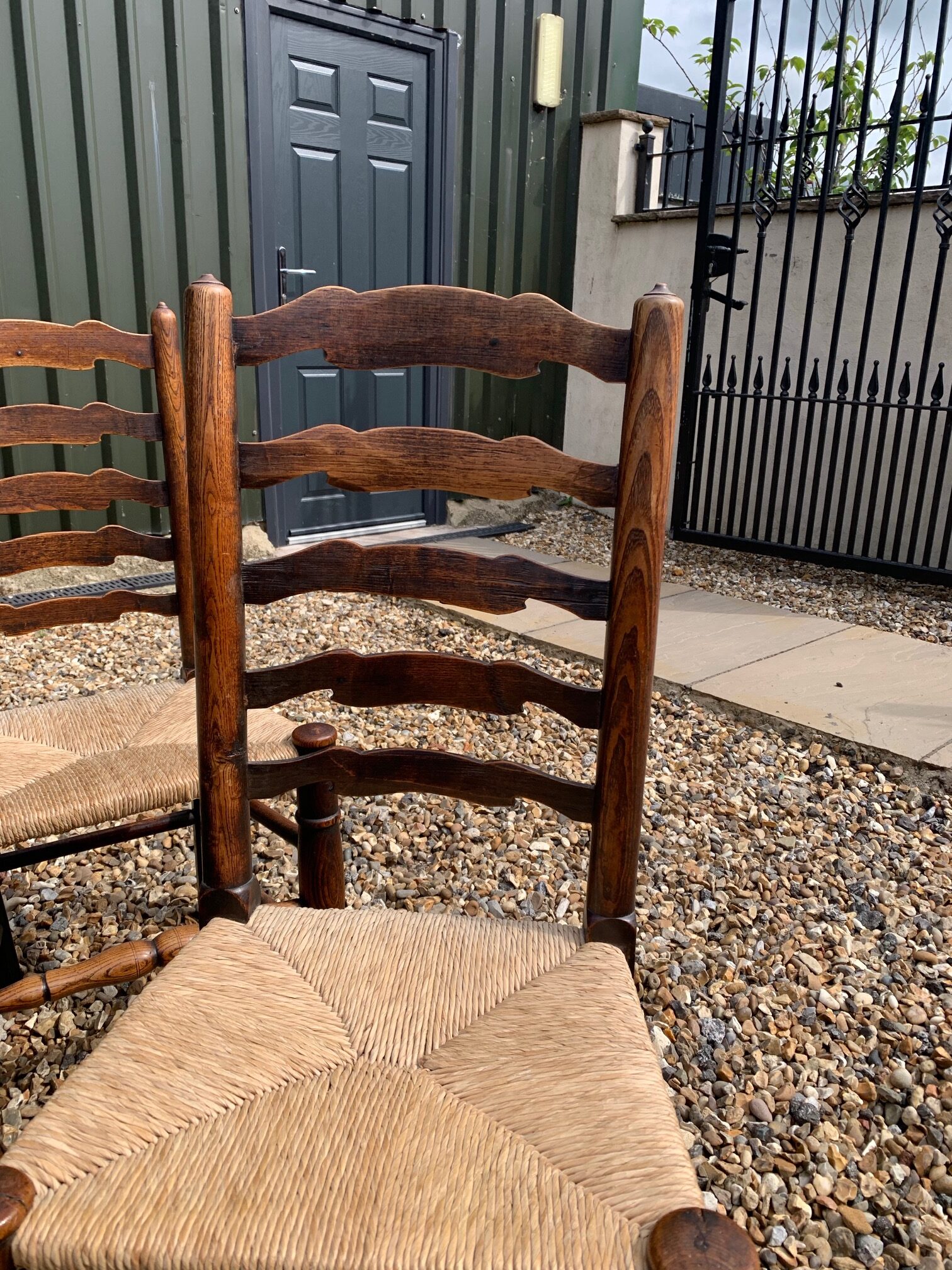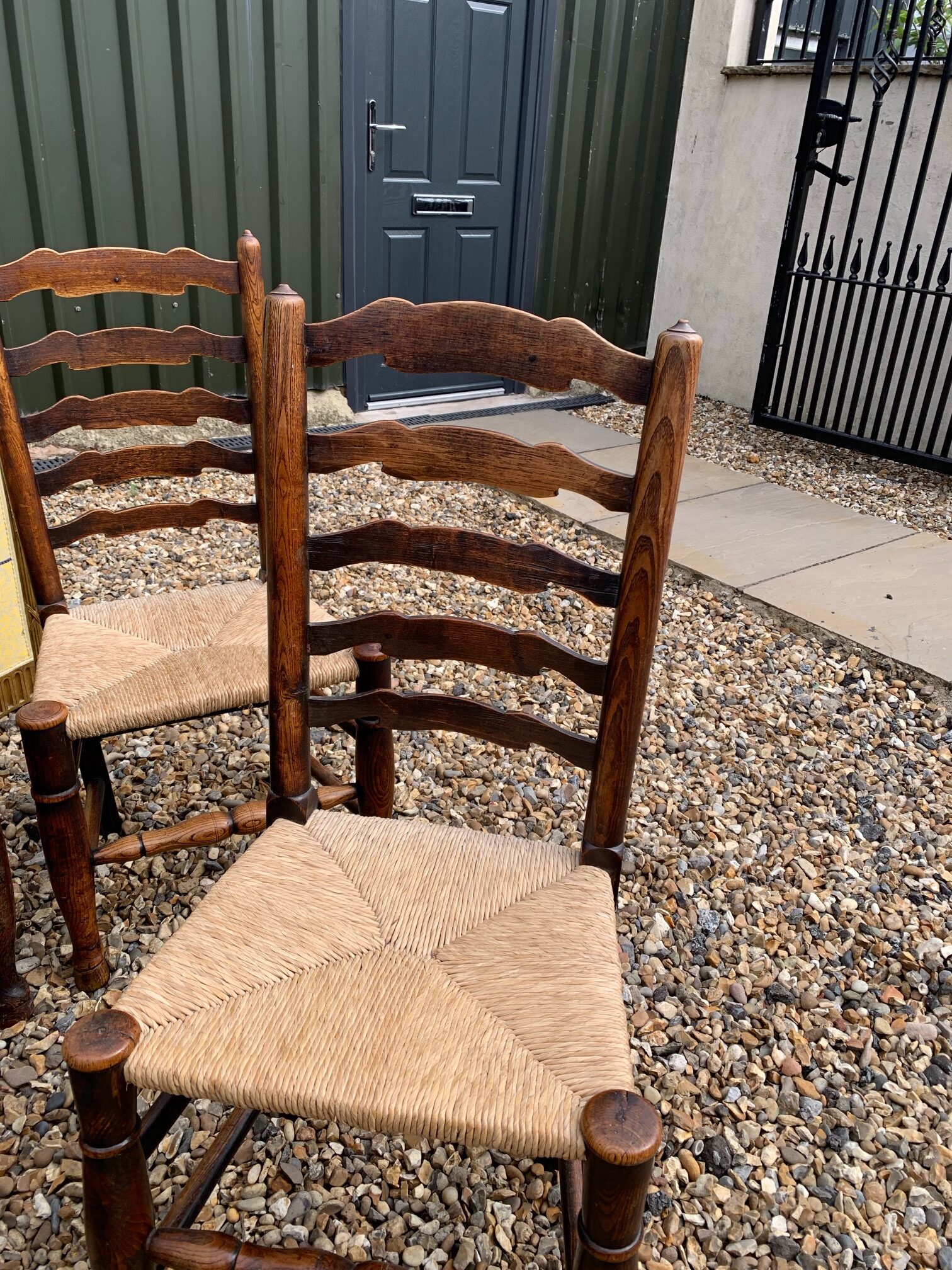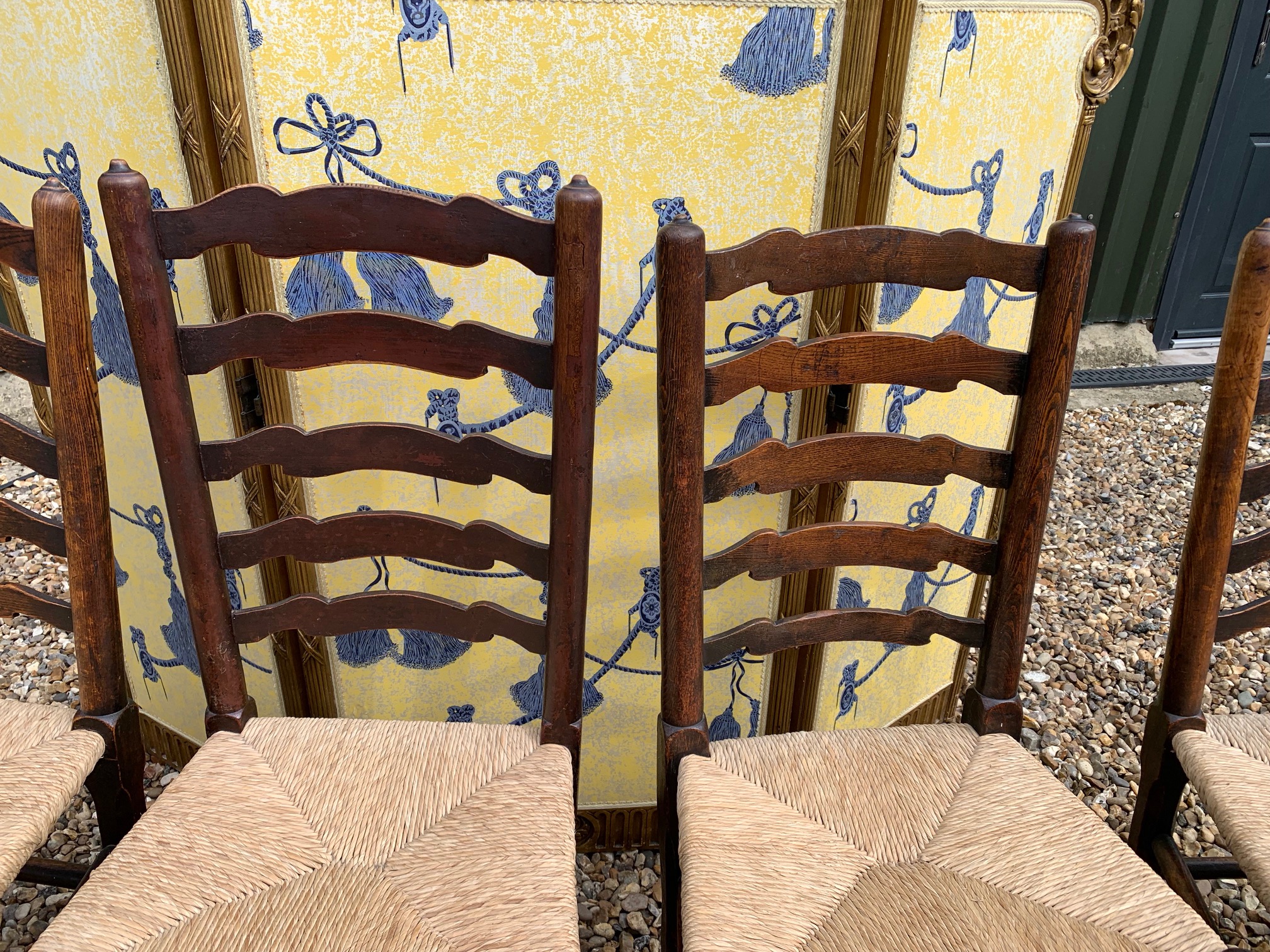 CompareA good set of eight 19th Century ash and elm ladder back dining chairs. Each having turned uprights with five wavy ladder back supports, rushed seats and raised on turned supports united by stretchers with pad feet. English circa 1830-1840, excellent condition, a lovely colour and patination. Extremely sturdy, no wobbles and the seats have been re-rushed by the previous owners
