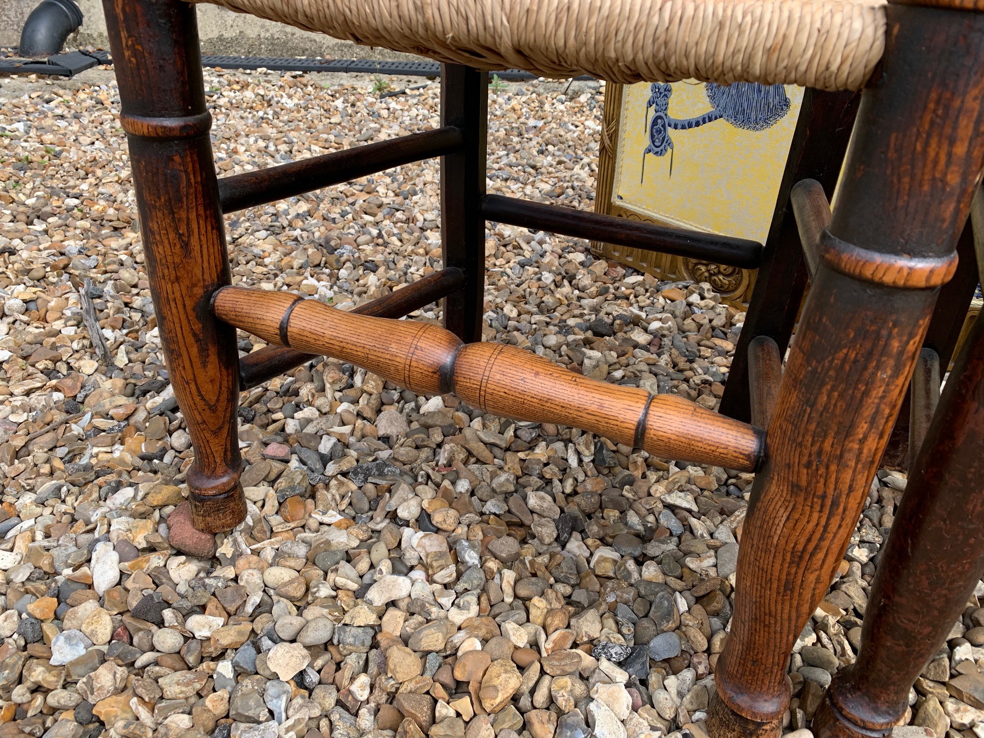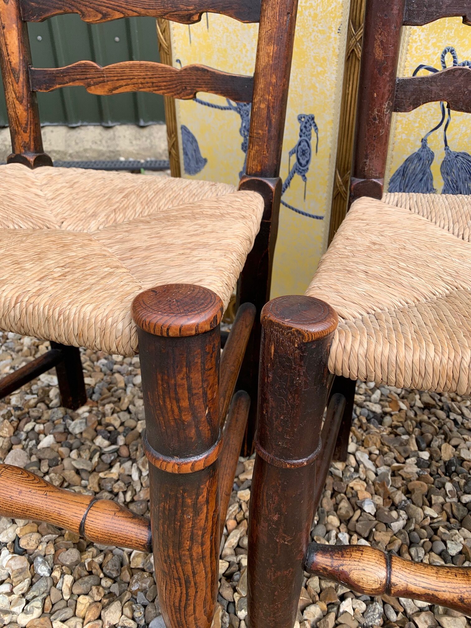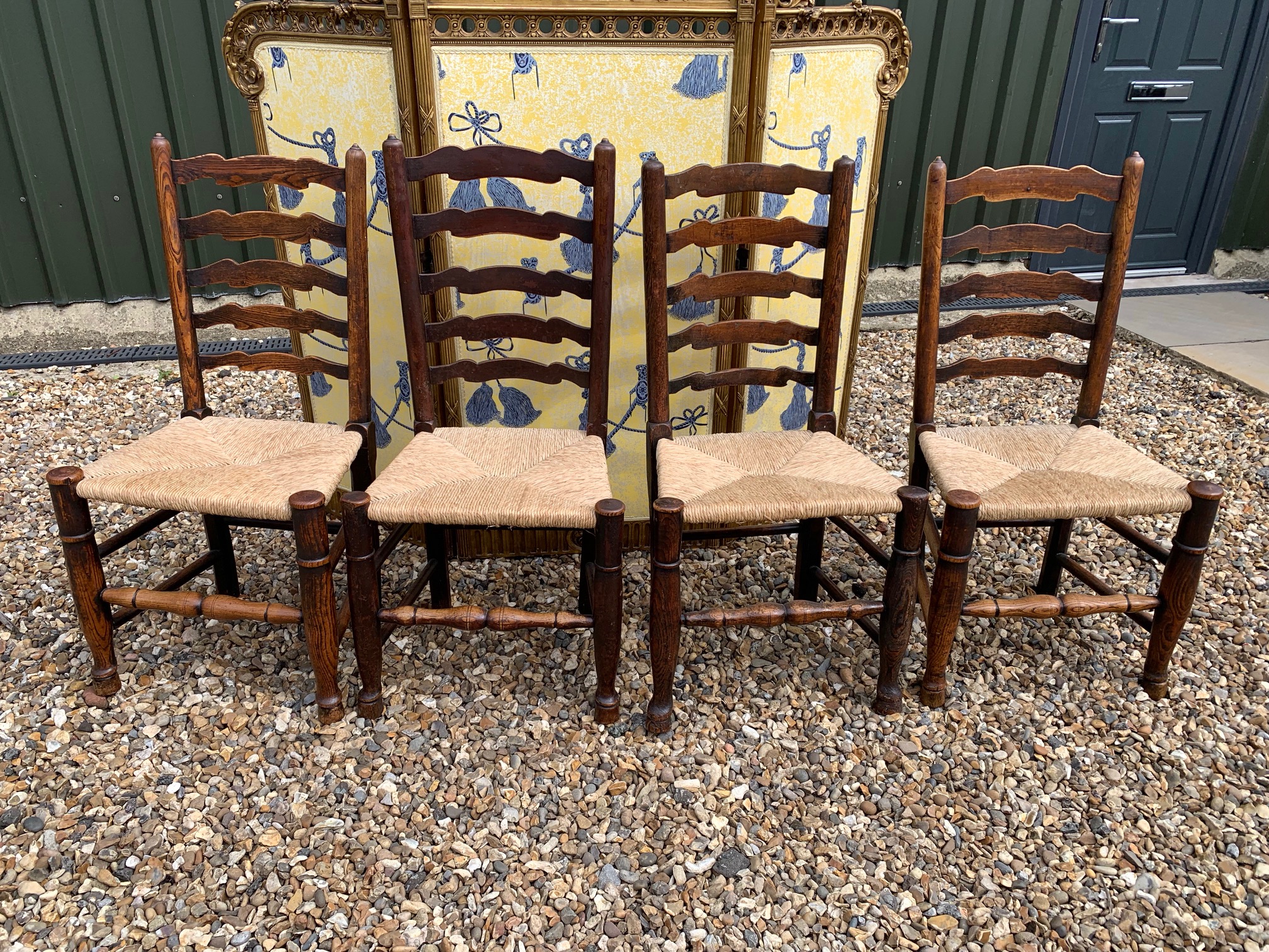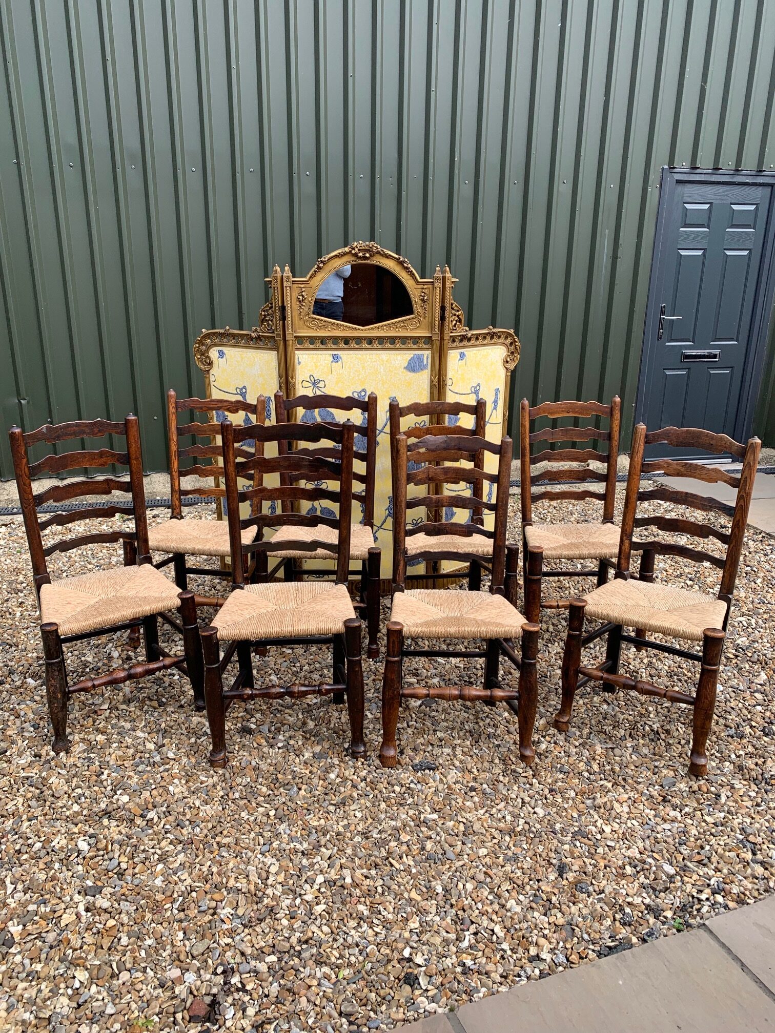 CompareA good set of eight 19th Century ash and elm ladder back dining chairs. Each having turned uprights with five wavy ladder back supports, rushed seats and raised on turned supports united by stretchers with pad feet. English circa 1830-1840, excellent condition, a lovely colour and patination. Extremely sturdy, no wobbles and the seats have been re-rushed by the previous owners