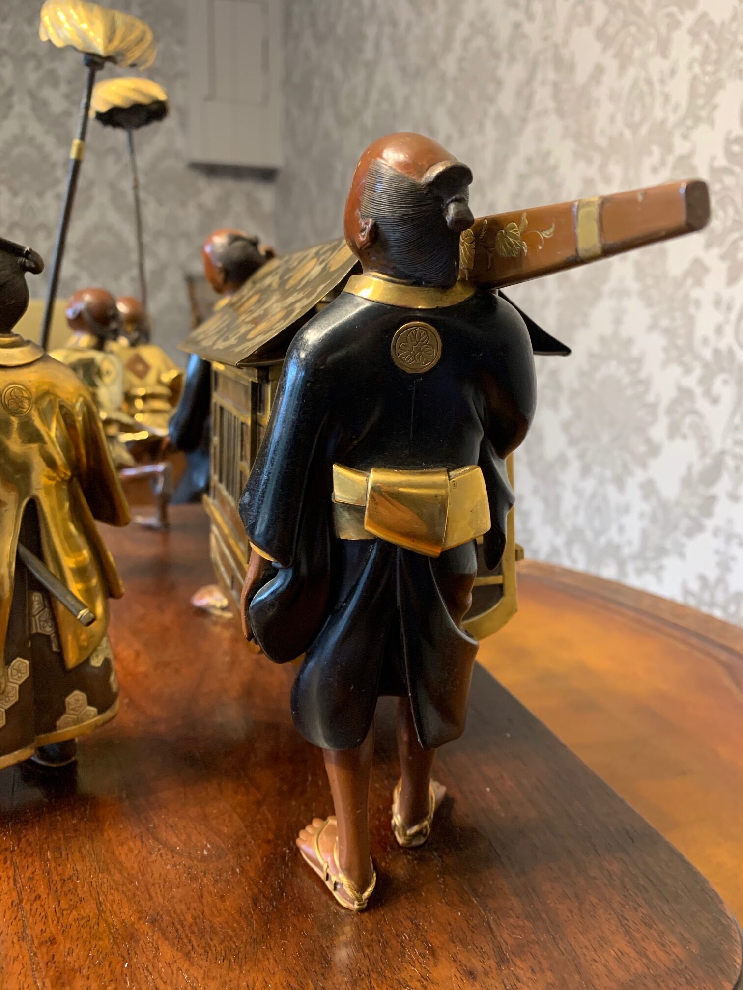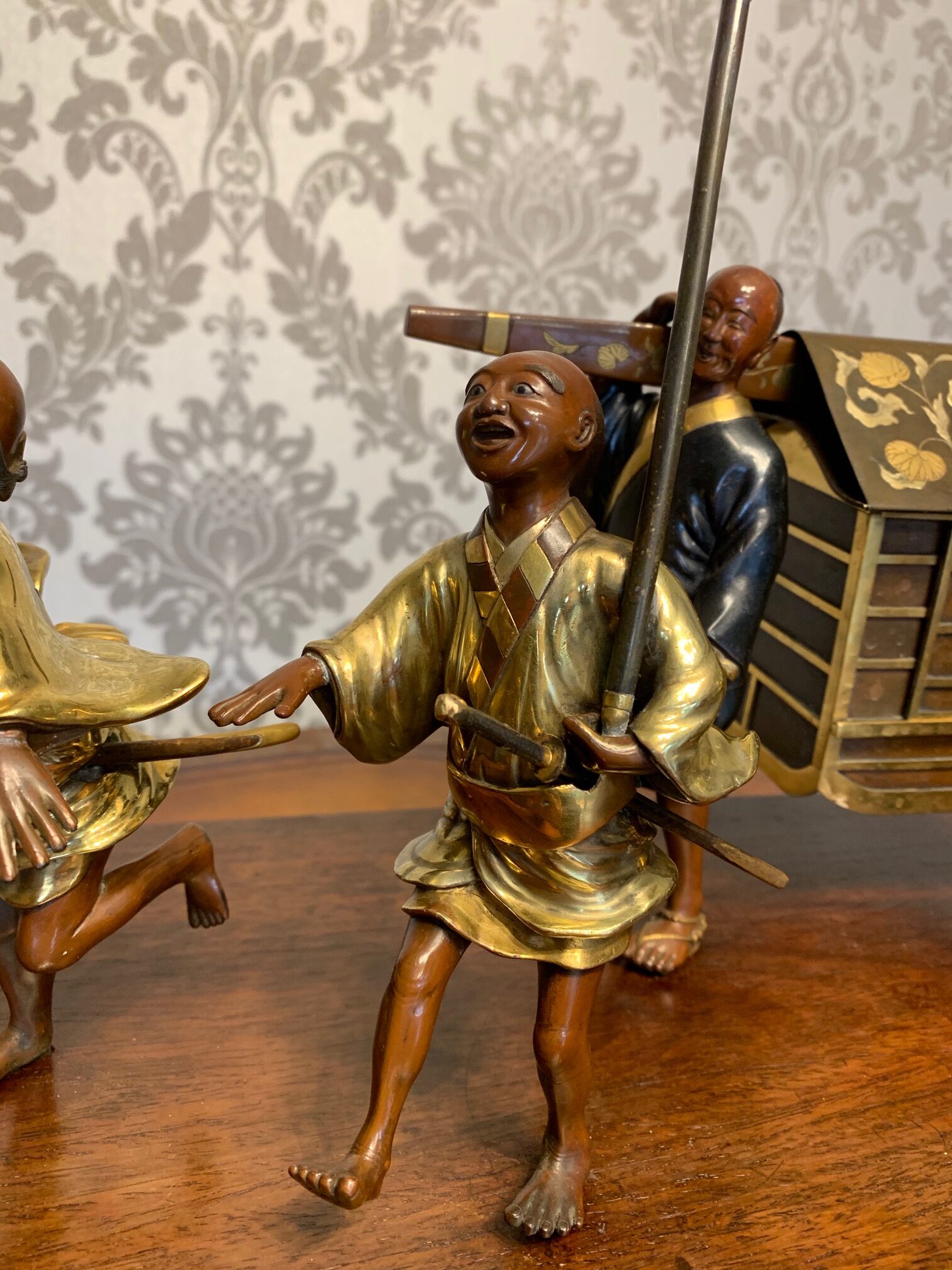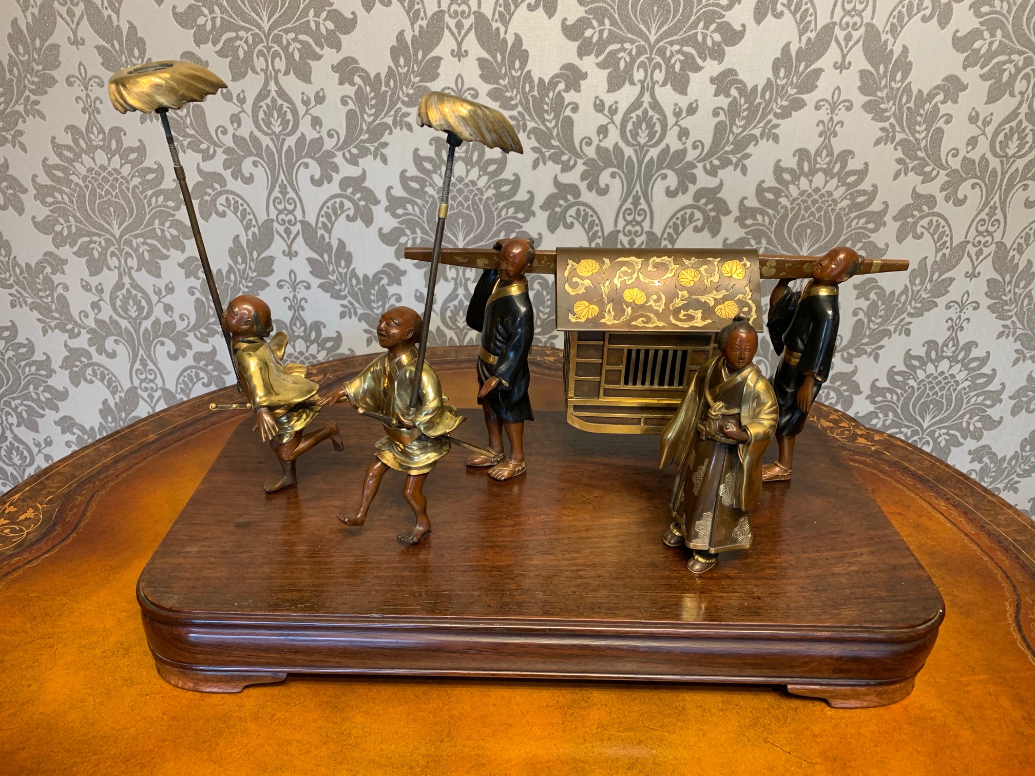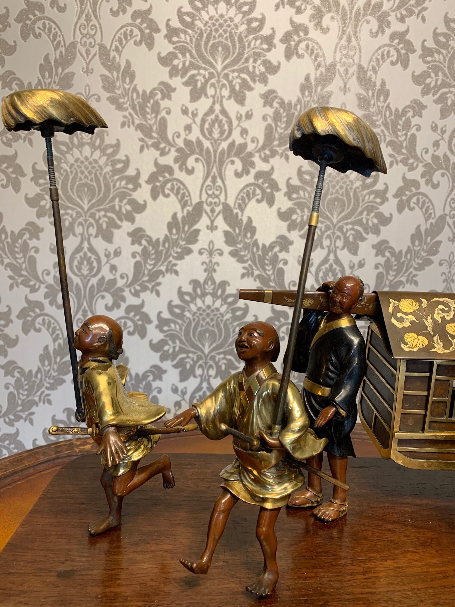 CompareA Japanese Meiji period bronze, gold and shakudo inlaid group. A fine quality Japanese bronze group depicting a procession carrying a palanquin probably made by Miyao. The group raised on the original Japanese hardwood stand. Japanese Meiji period circa 1880. In excellent original condition, colour and patination