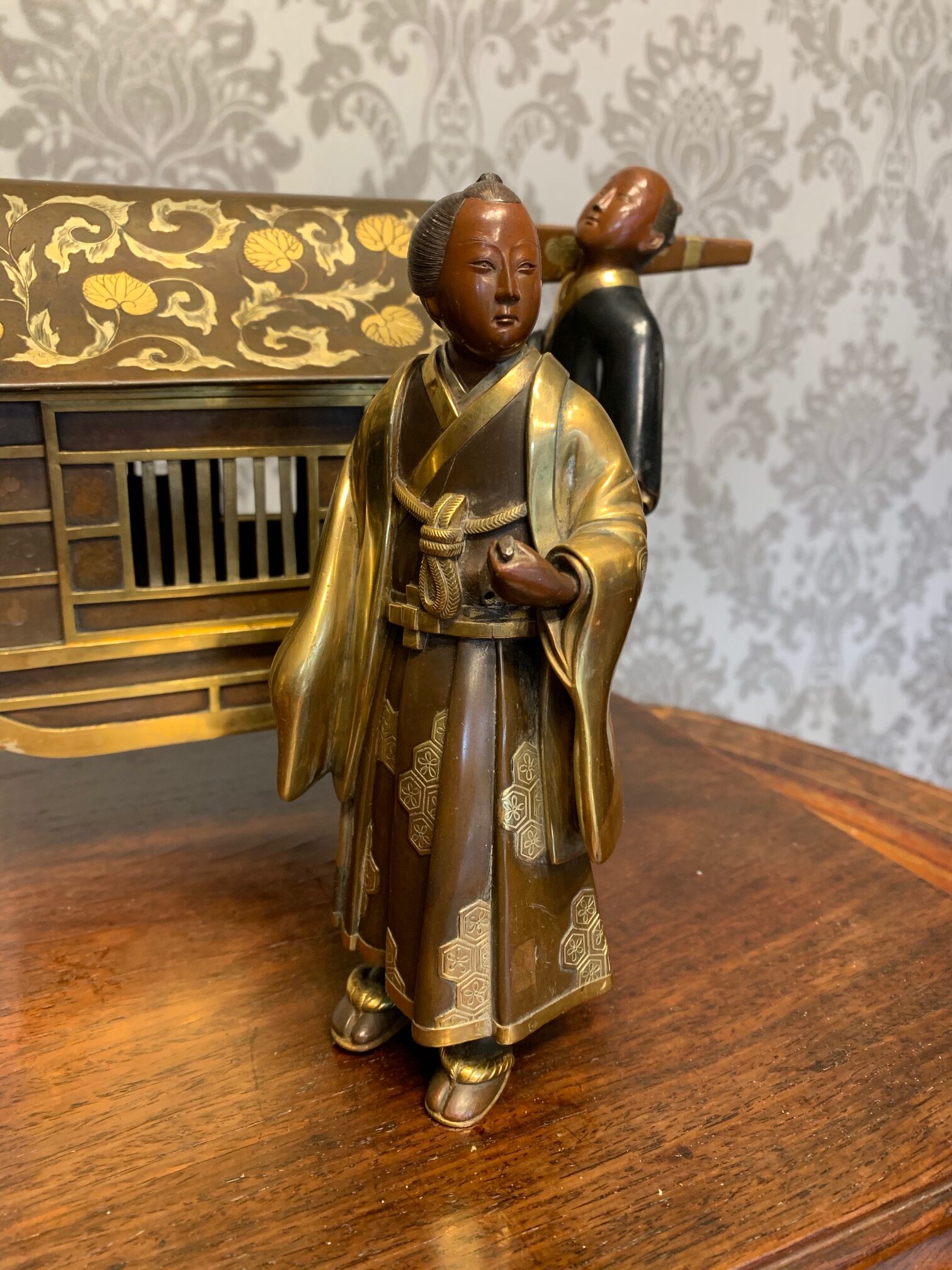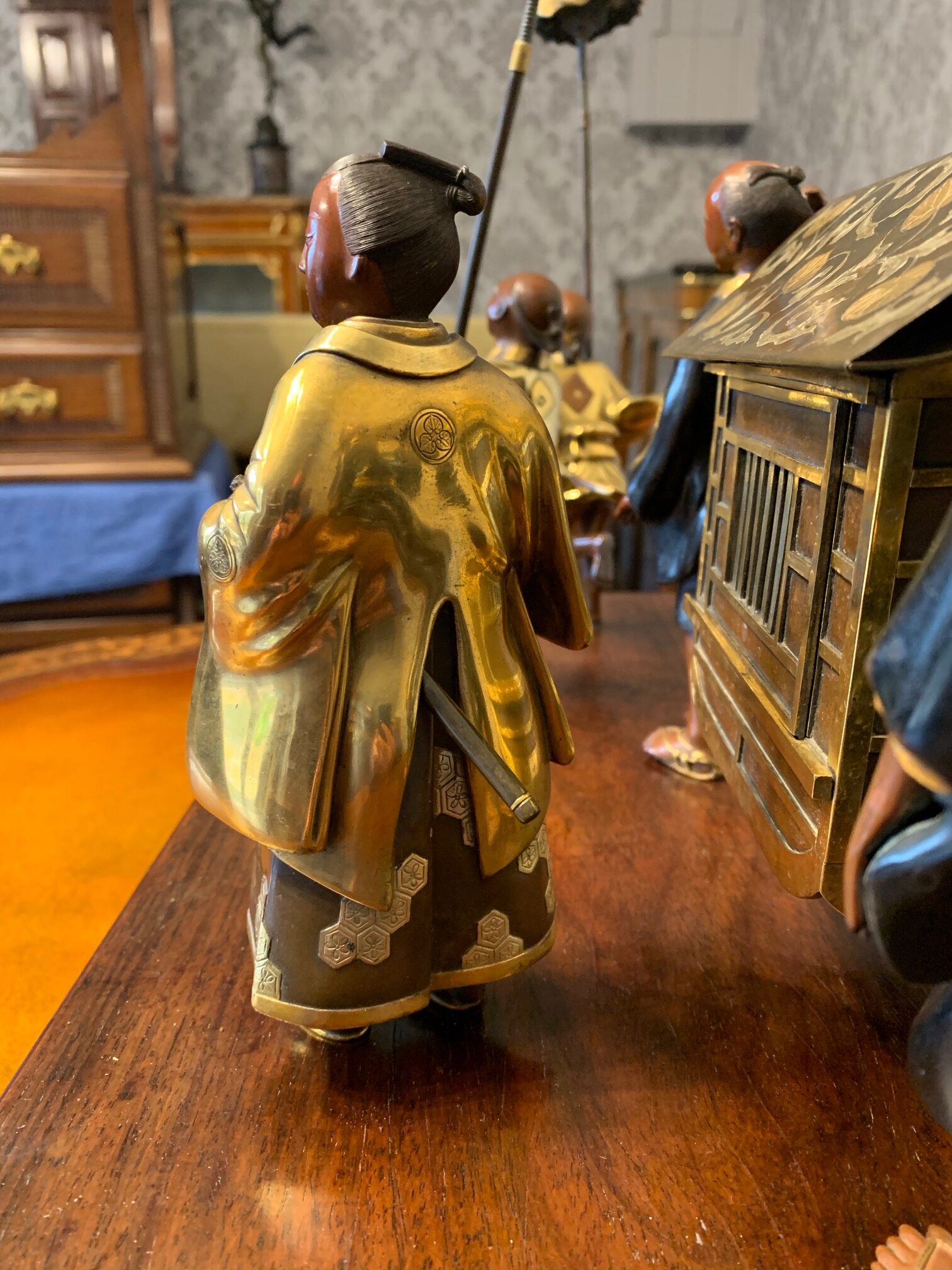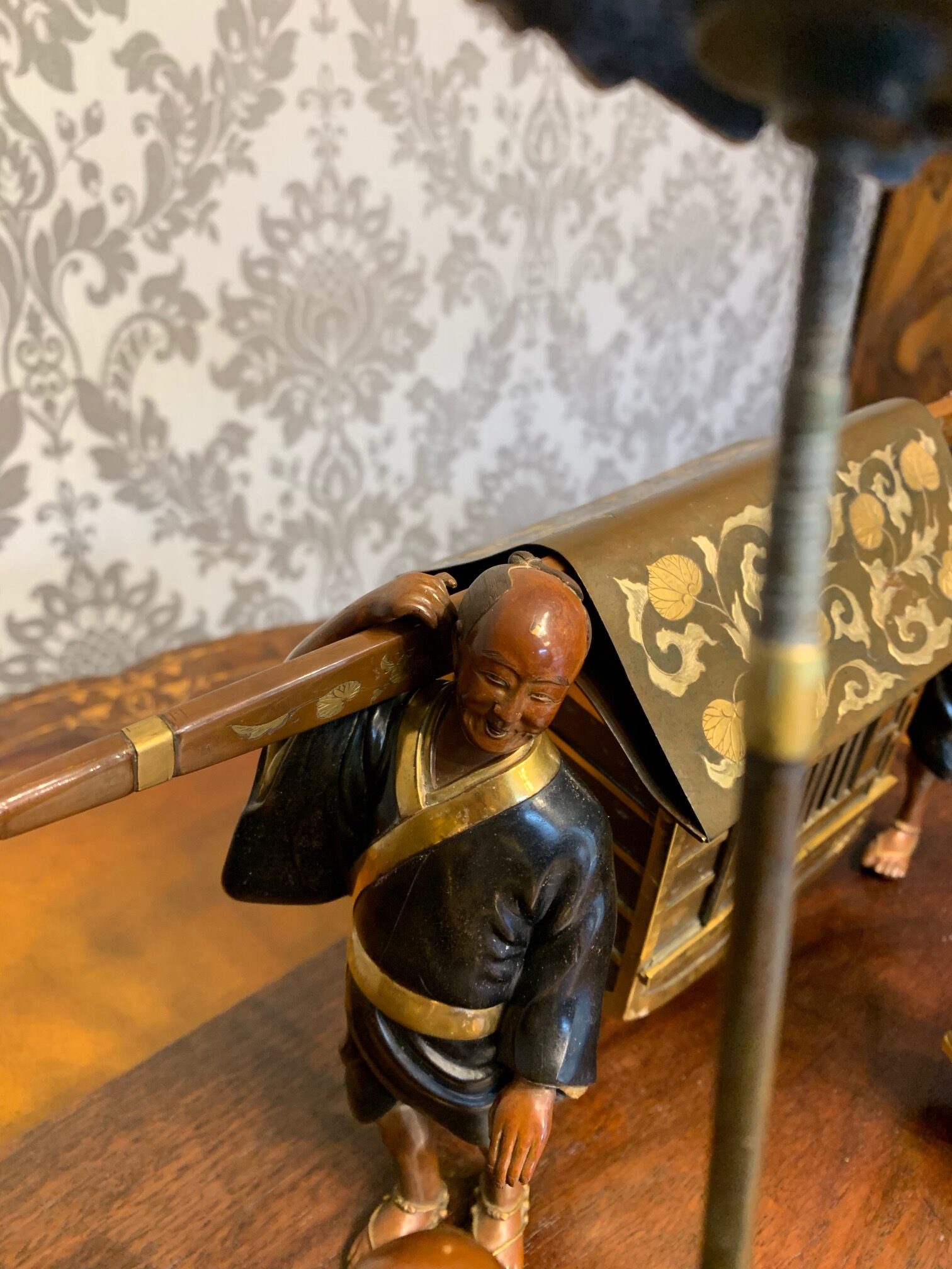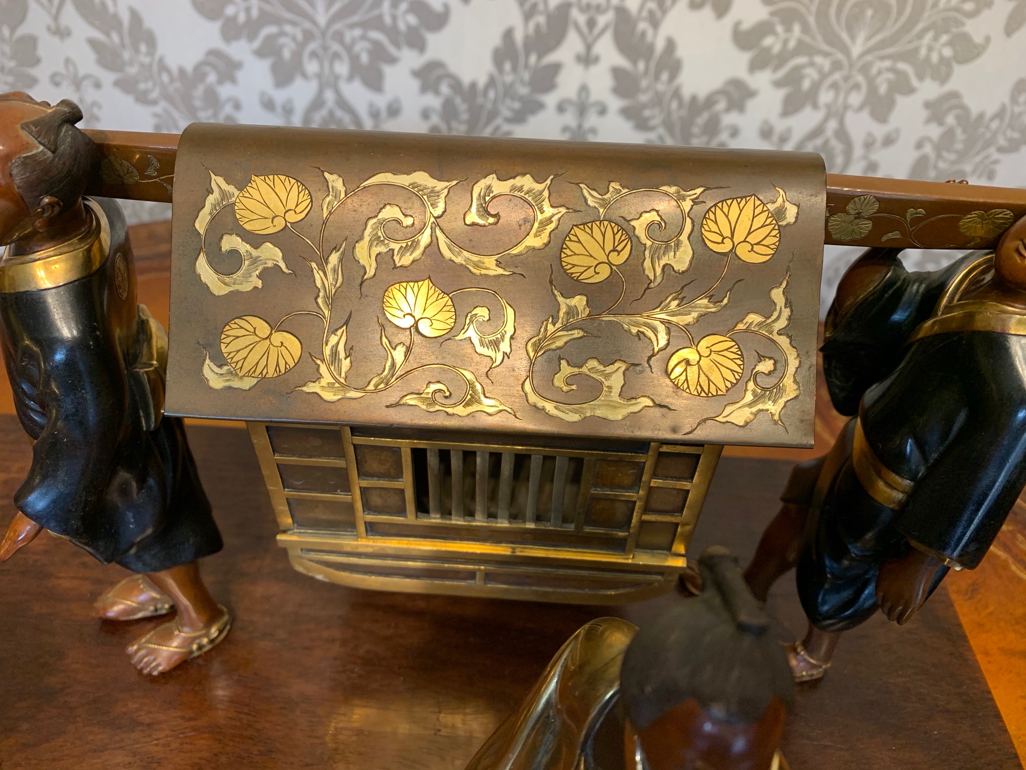 CompareA Japanese Meiji period bronze, gold and shakudo inlaid group. A fine quality Japanese bronze group depicting a procession carrying a palanquin probably made by Miyao. The group raised on the original Japanese hardwood stand. Japanese Meiji period circa 1880. In excellent original condition, colour and patination