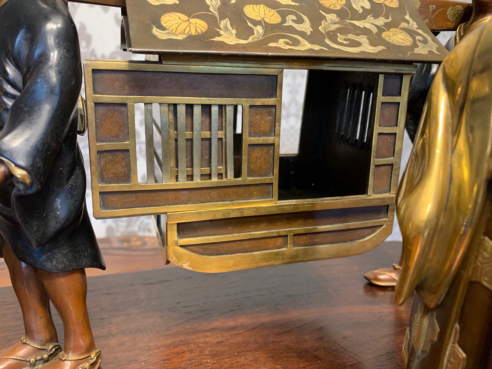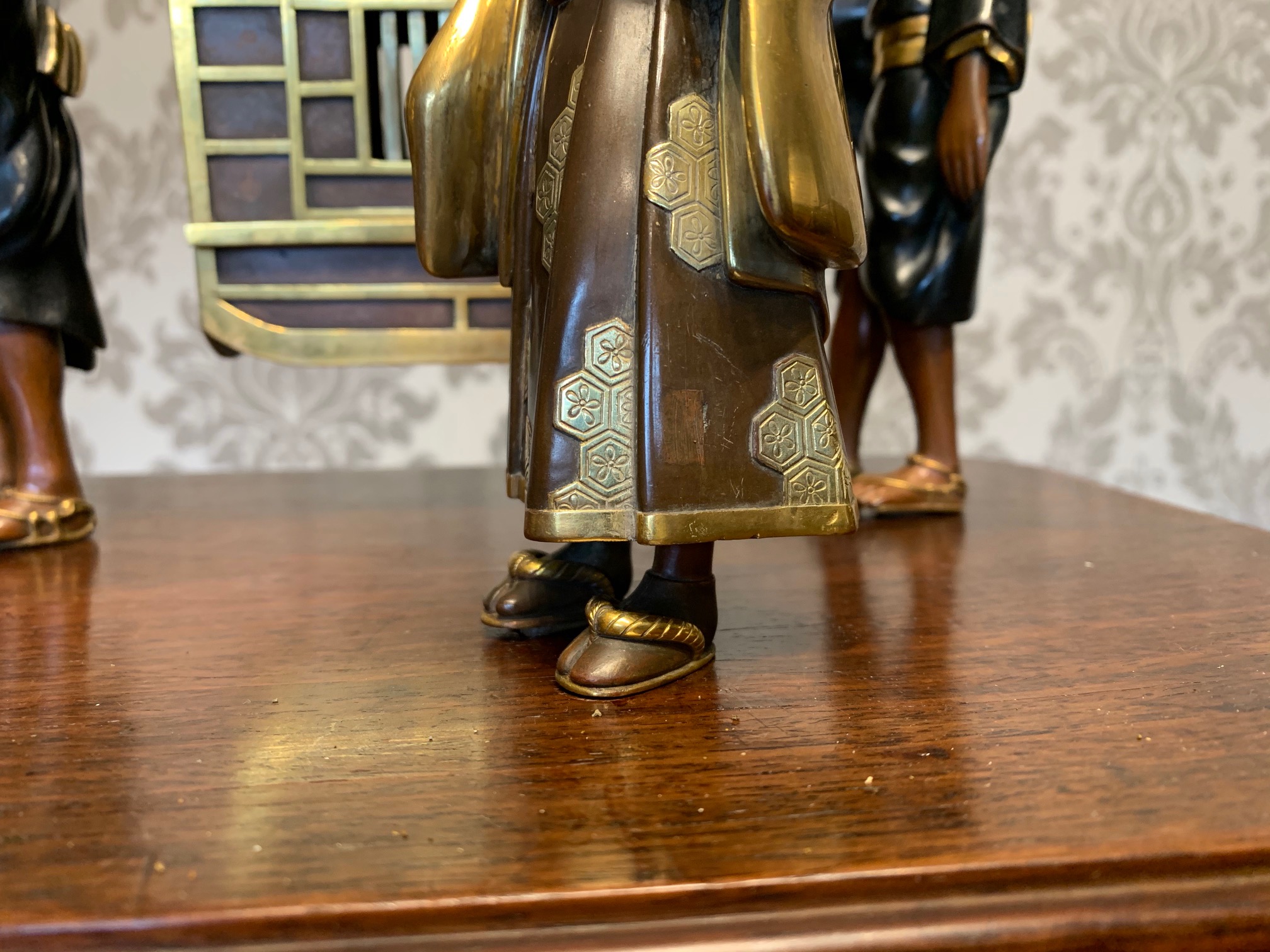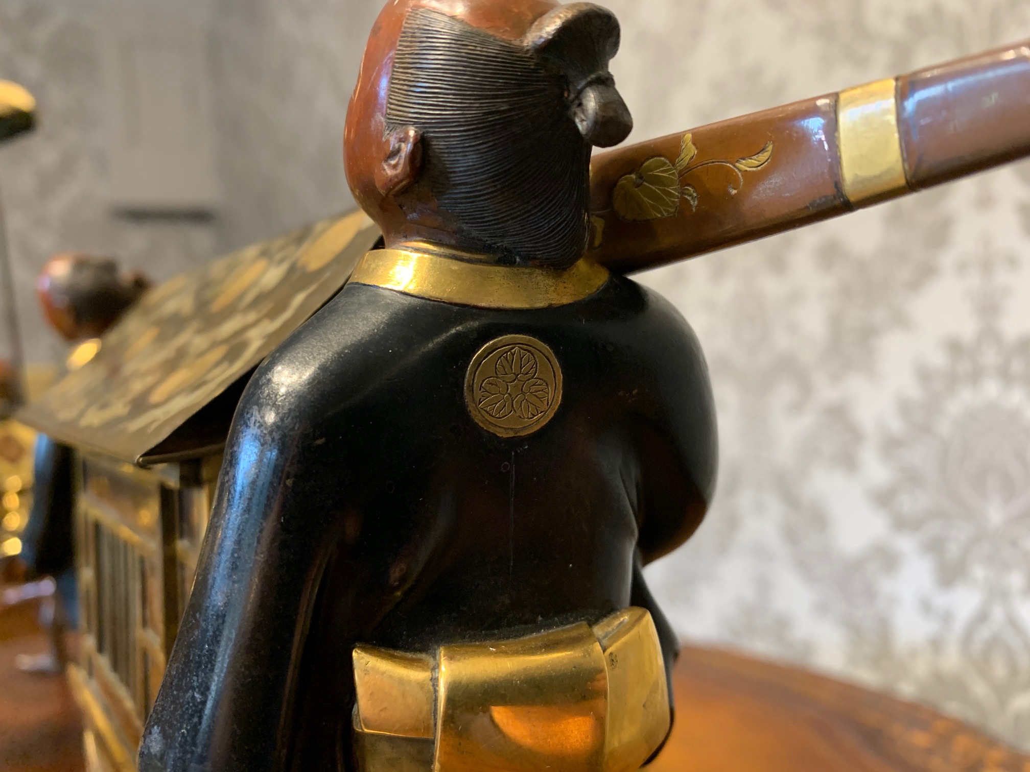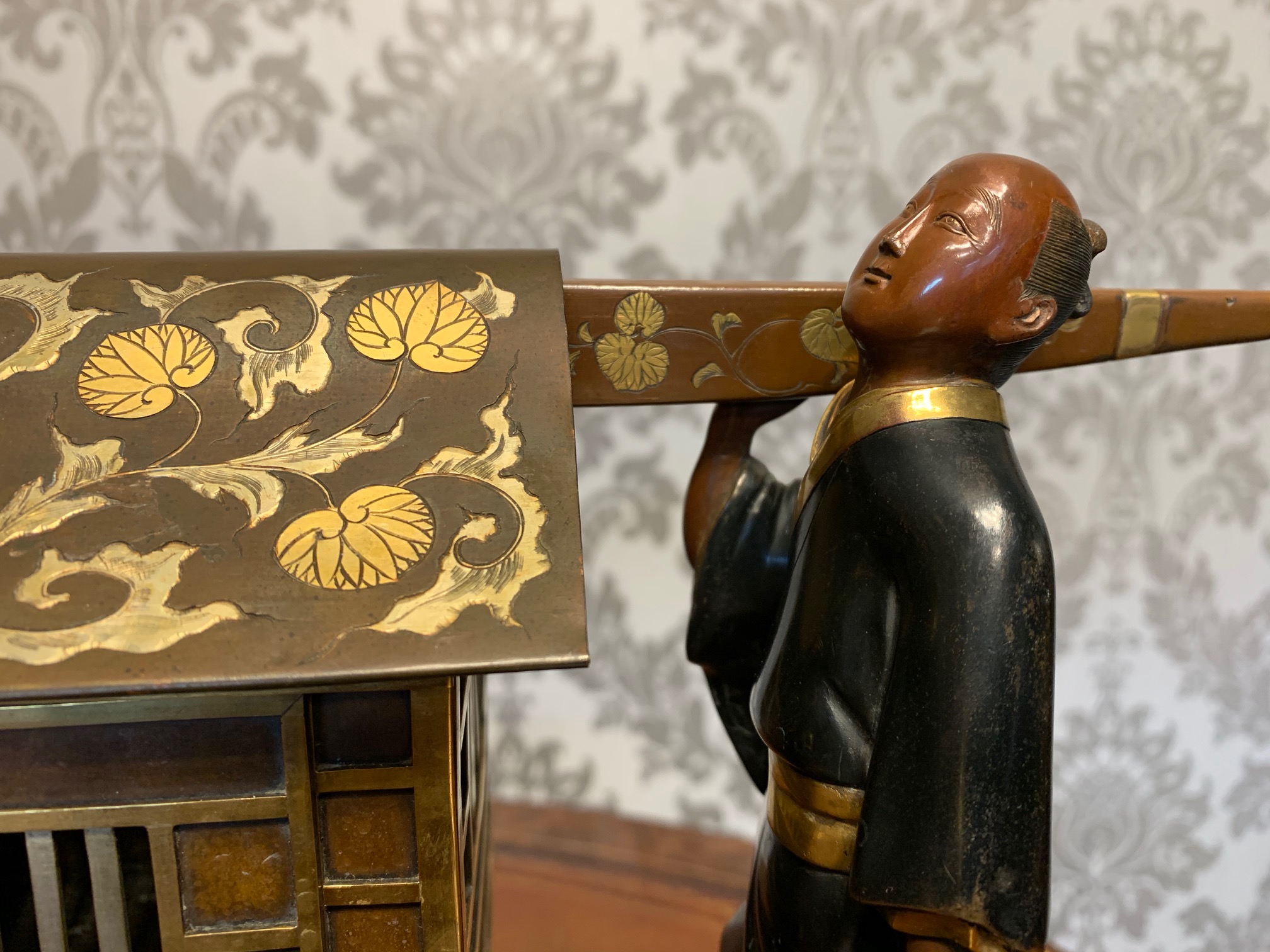 CompareA Japanese Meiji period bronze, gold and shakudo inlaid group. A fine quality Japanese bronze group depicting a procession carrying a palanquin probably made by Miyao. The group raised on the original Japanese hardwood stand. Japanese Meiji period circa 1880. In excellent original condition, colour and patination
