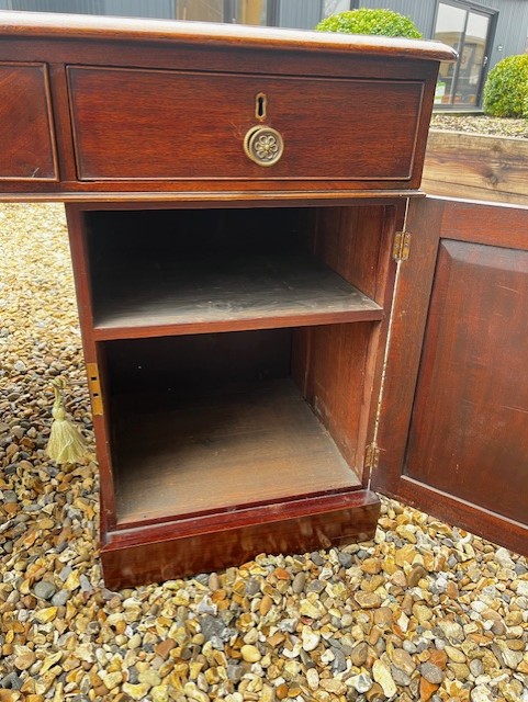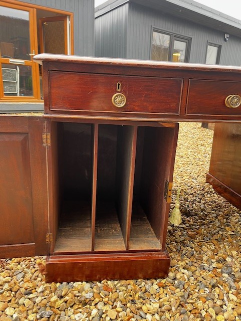 A Large Victorian Period Mahogany Partners Desk. The rectangular mahogany top having an inset faded green leather writing surface with gilt tooled detail. Having three ash lined mahogany drawers with brass circular drawer pulls, the original locks and working keys to both sides of the frieze. Each pedestal having three graduated drawers to the front side and hinged panelled doors to the reverse. Raised on a mahogany plinth base with inset brass castors. English circa 1860-1870. In excellent original condition, cleaned and waxed. The desks splits into three sections for easy transportation.