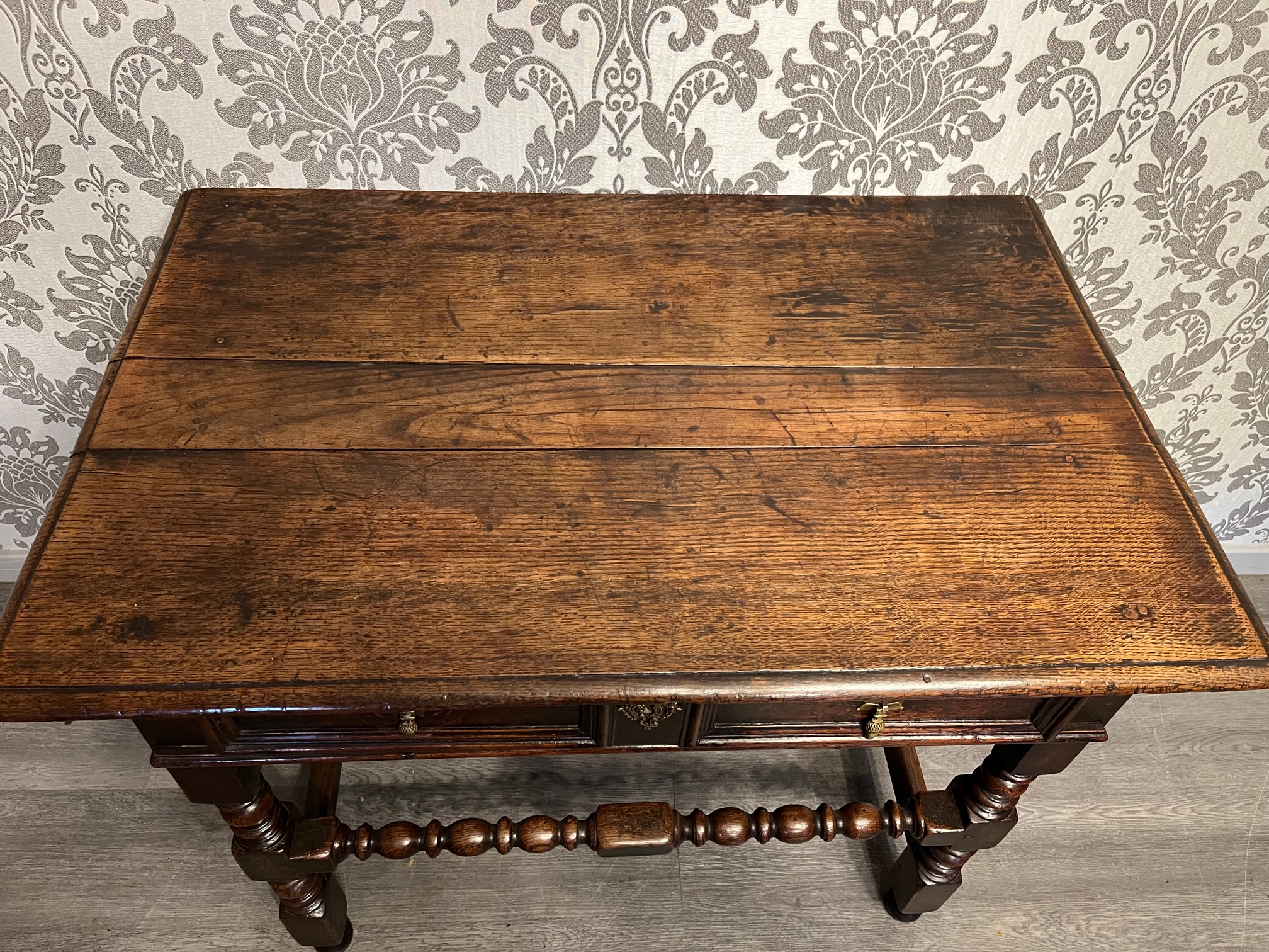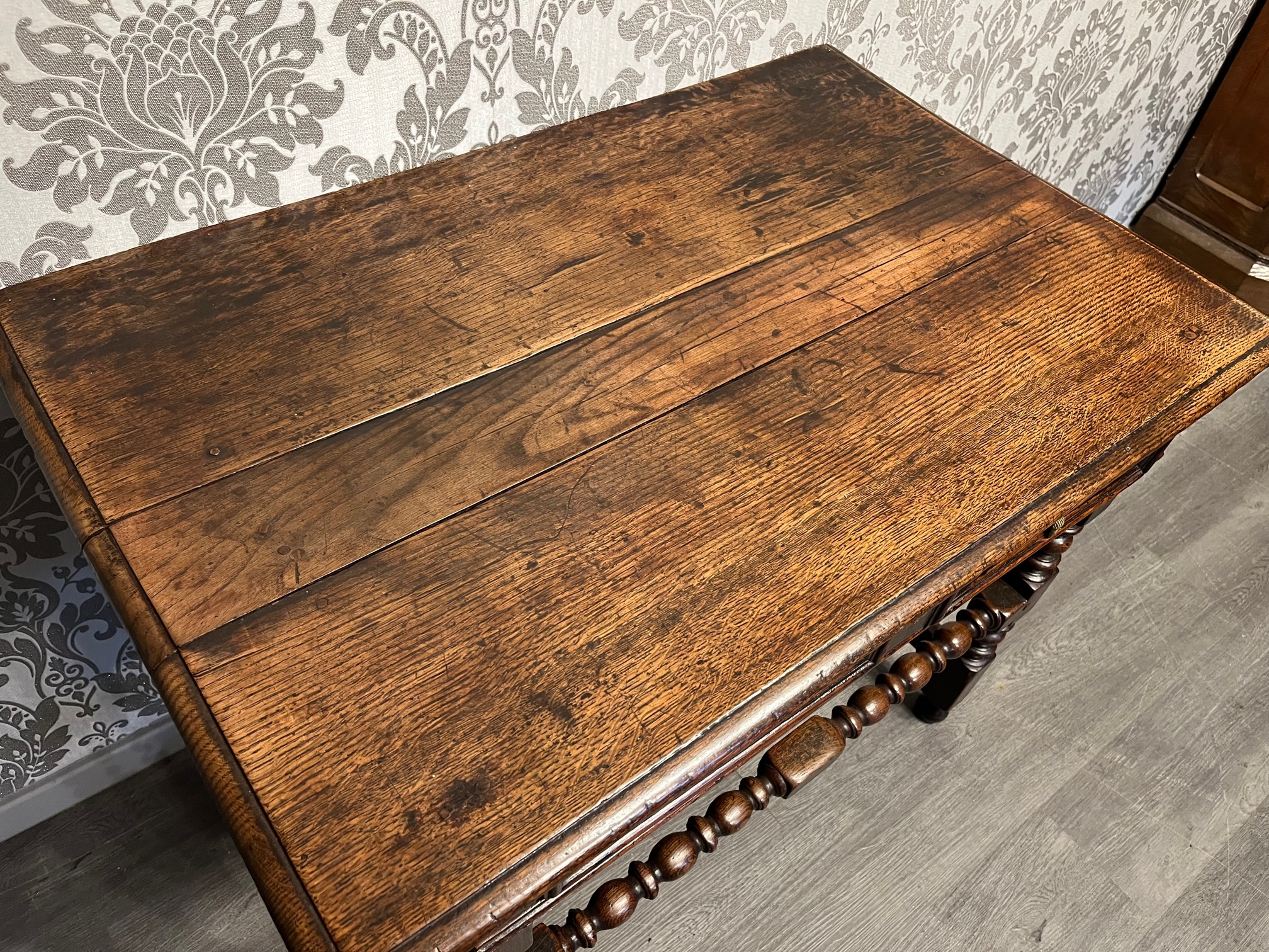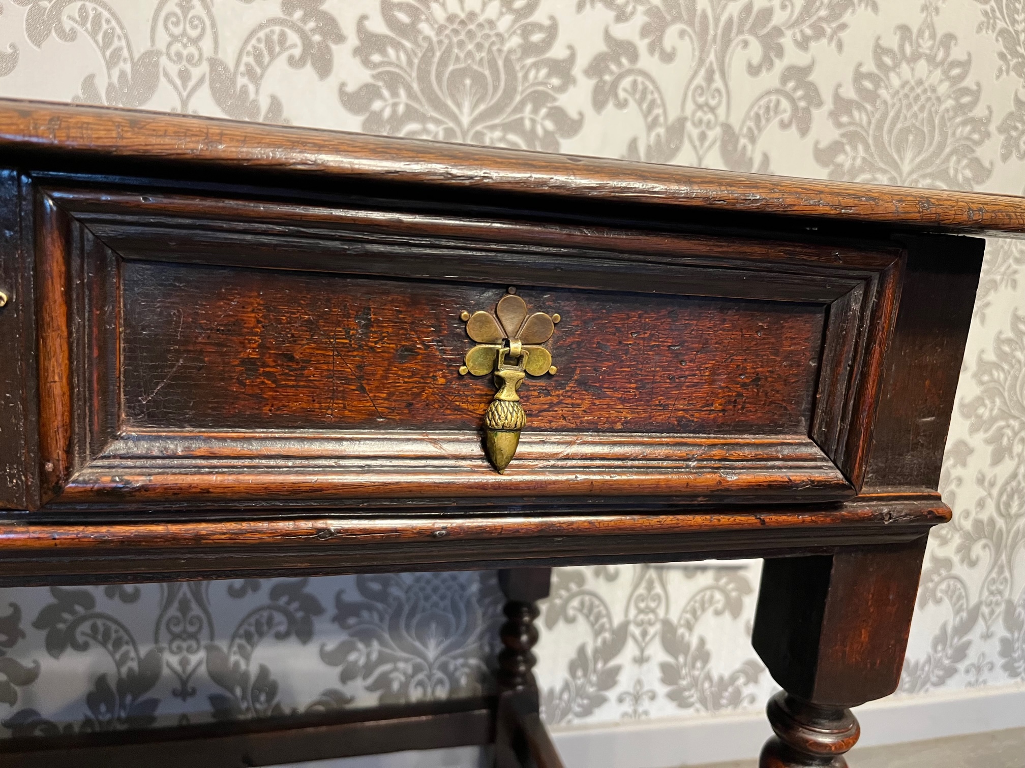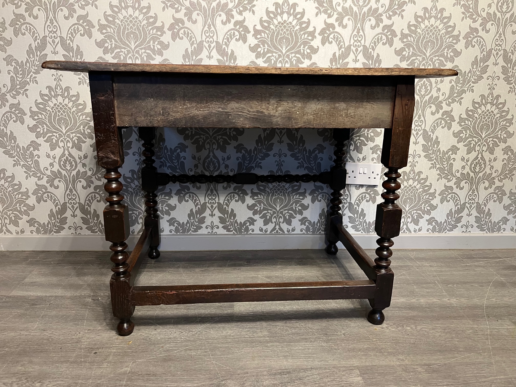 CompareA Late 17th Century oak antique side table. Having a rectangular planked top above a rectangular frieze drawer. Raised on turned supports united by a stretcher. Of pegged construction throughout. English circa 1680 of fabulous colour and patination. The drawer bottom has been replaced