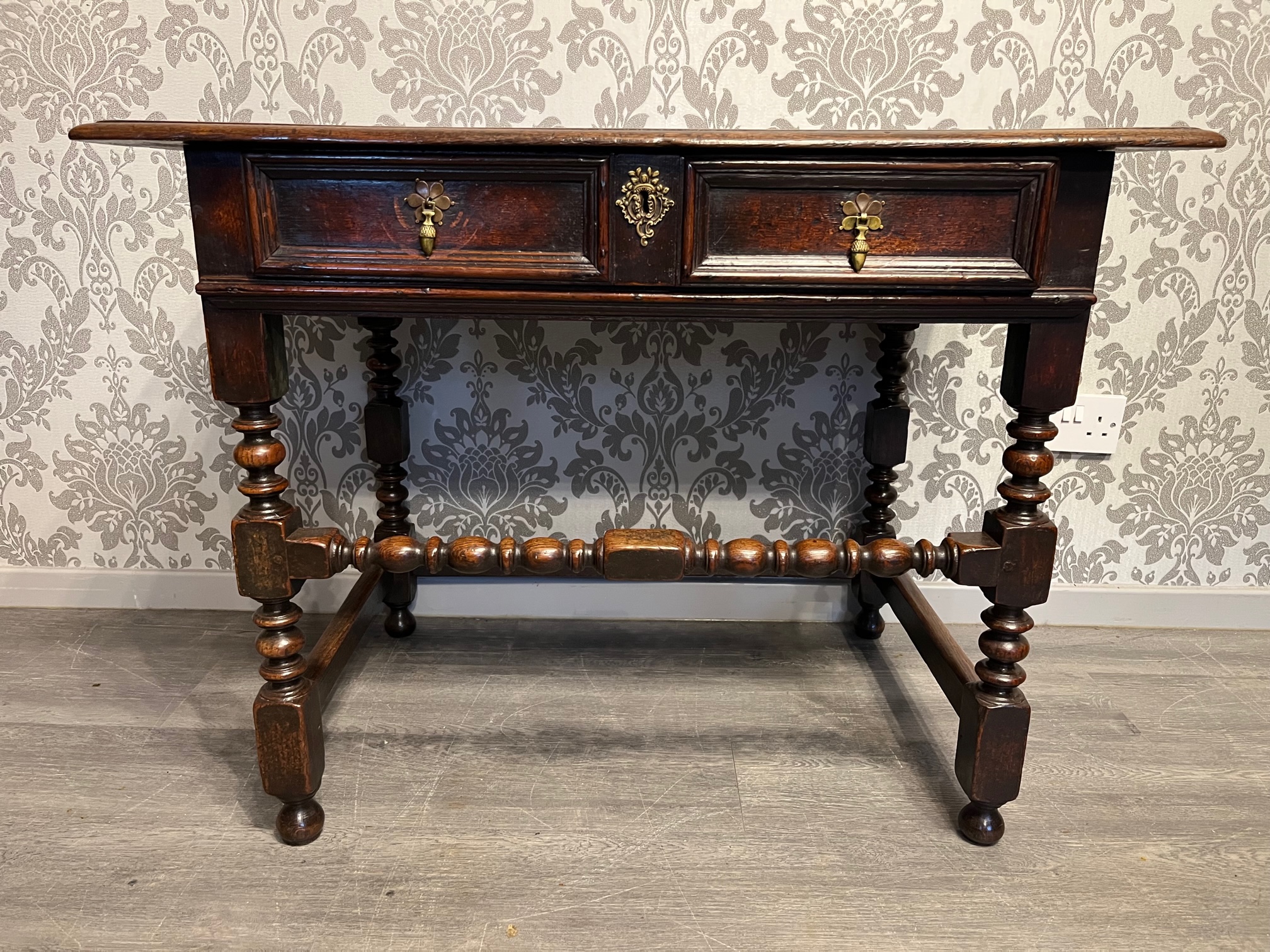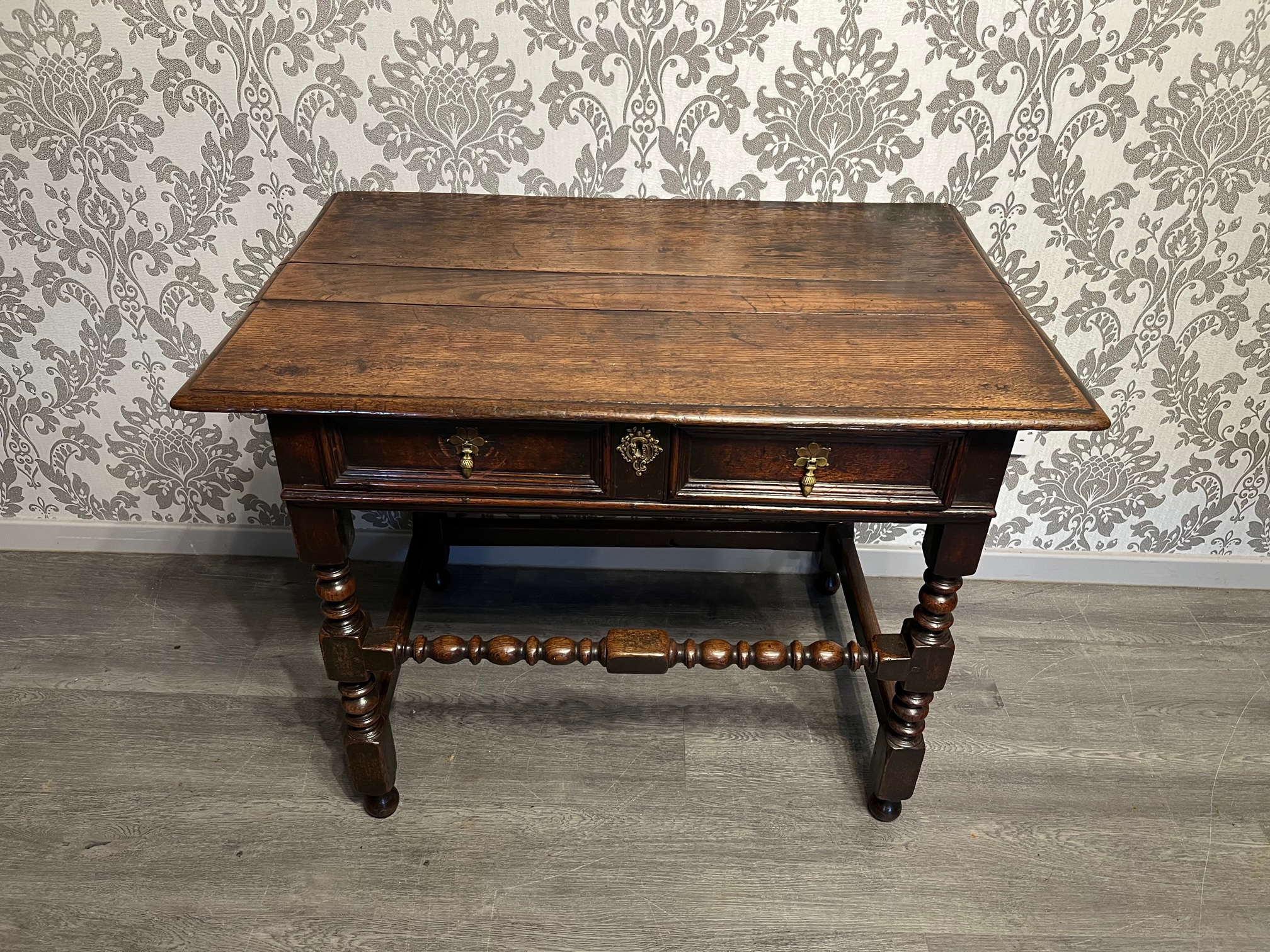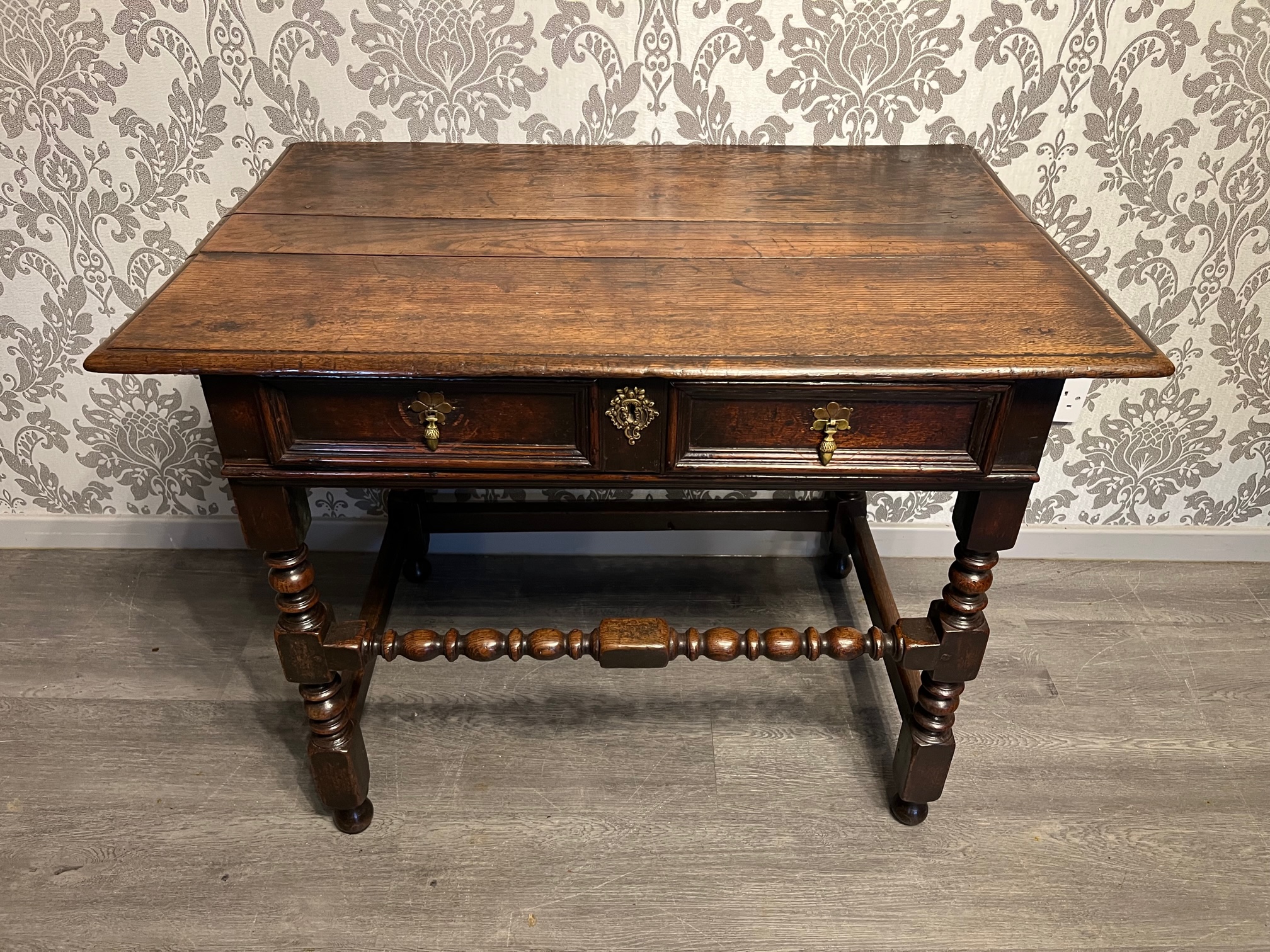 CompareA Late 17th Century oak antique side table. Having a rectangular planked top above a rectangular frieze drawer. Raised on turned supports united by a stretcher. Of pegged construction throughout. English circa 1680 of fabulous colour and patination. The drawer bottom has been replaced
