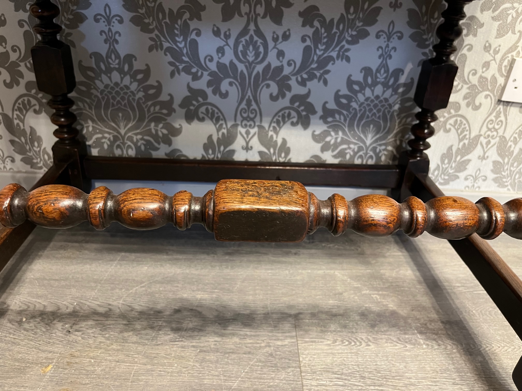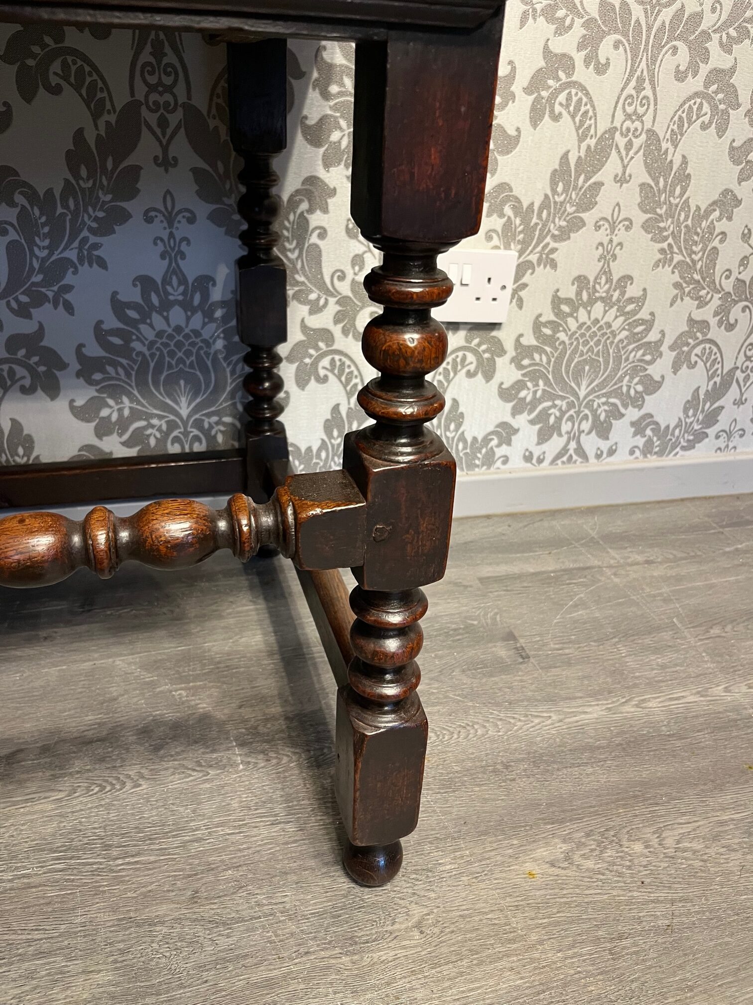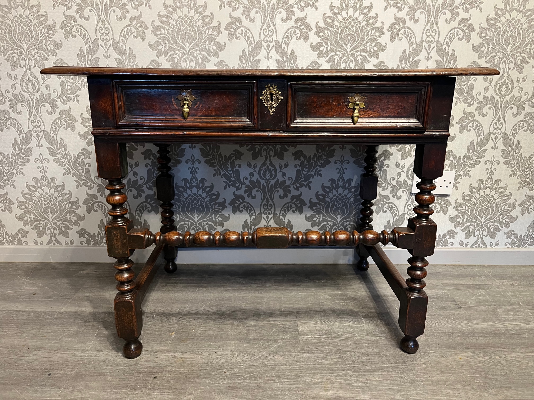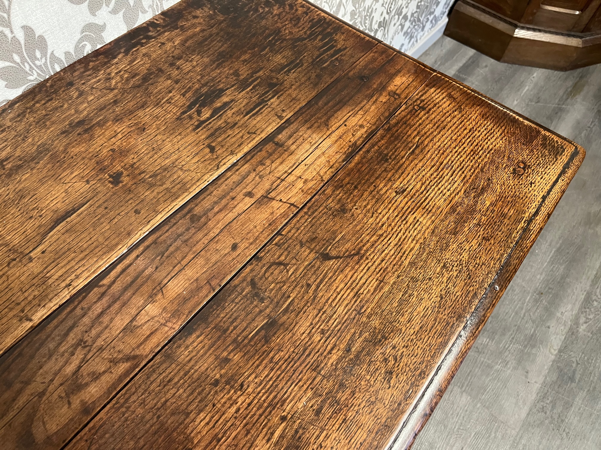 CompareA Late 17th Century oak antique side table. Having a rectangular planked top above a rectangular frieze drawer. Raised on turned supports united by a stretcher. Of pegged construction throughout. English circa 1680 of fabulous colour and patination. The drawer bottom has been replaced