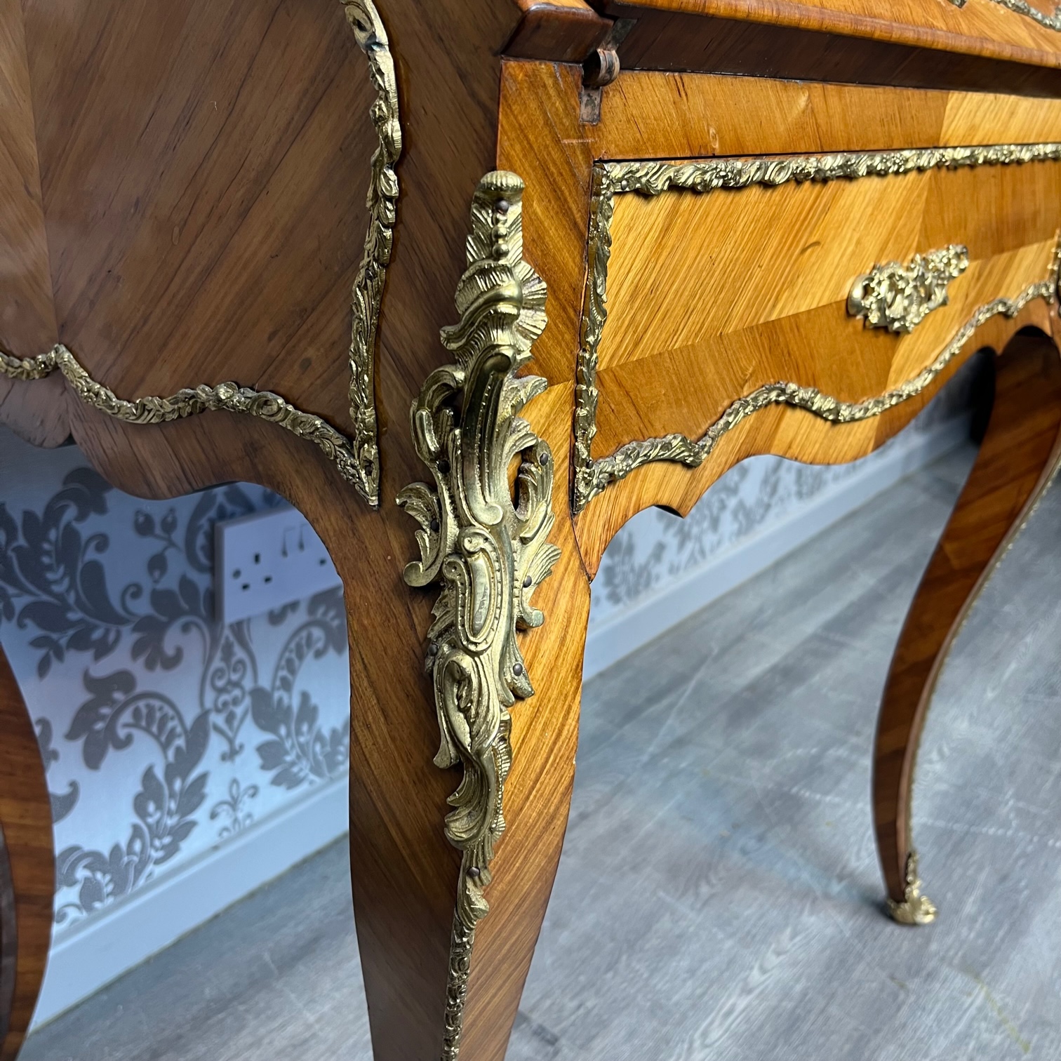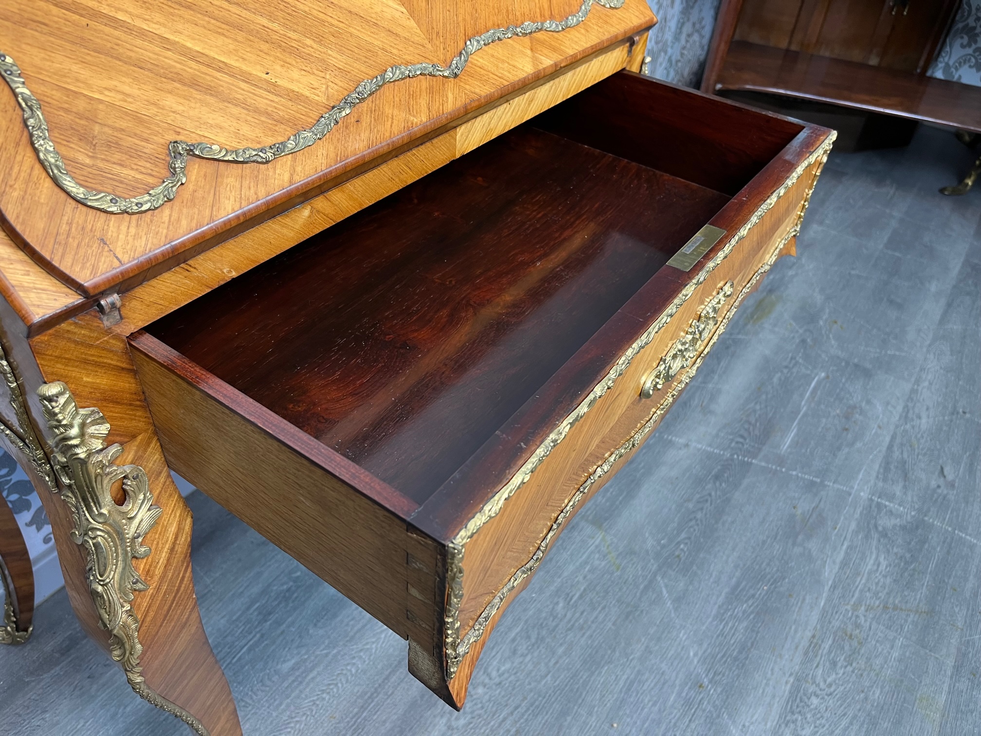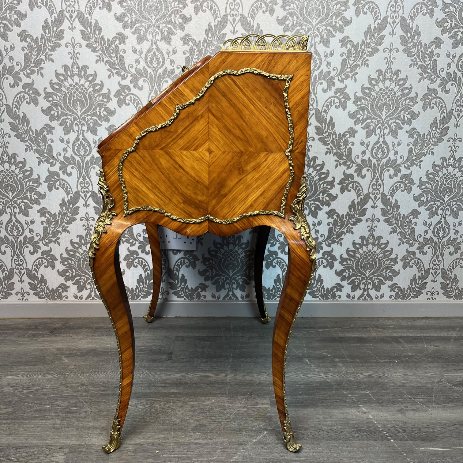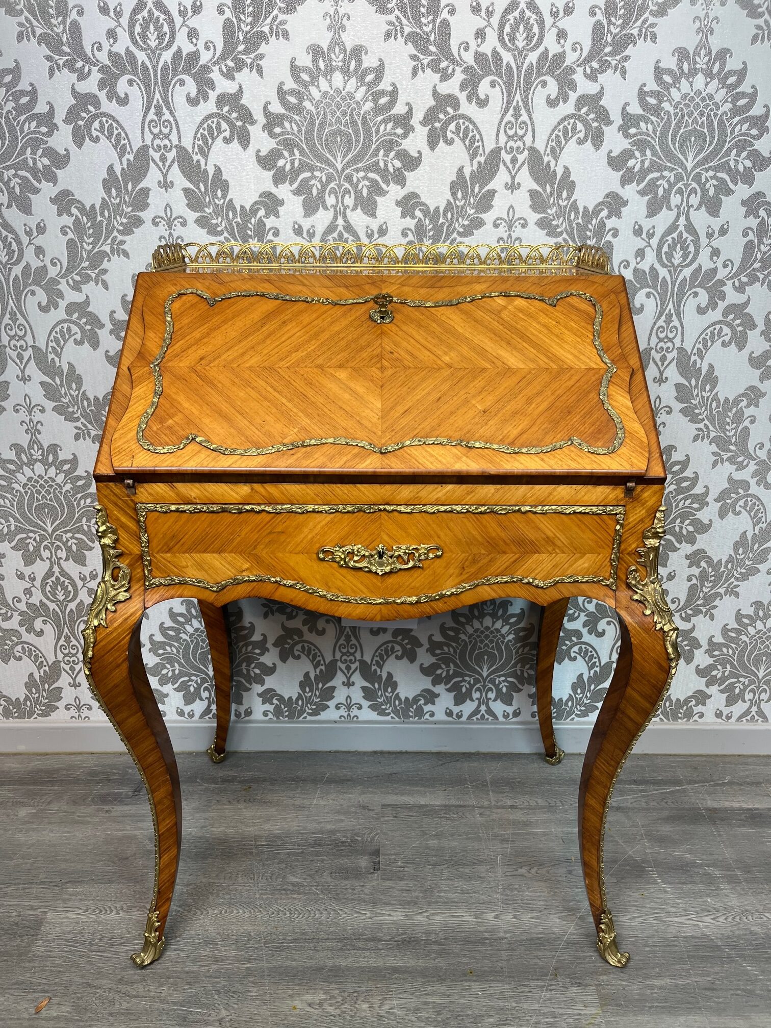 CompareA Late 19th Century French Kingwood bureau de dame. Having a raised brass gallery with a fall front opening to reveal a mahogany lined interior with drawers and writing surface. Raised on cabriole legs with fine quality ormolu mounts throughout and veneered in the finest kingwood. French circa 1890-1900 in superb original condition, a wonderful colour and patination