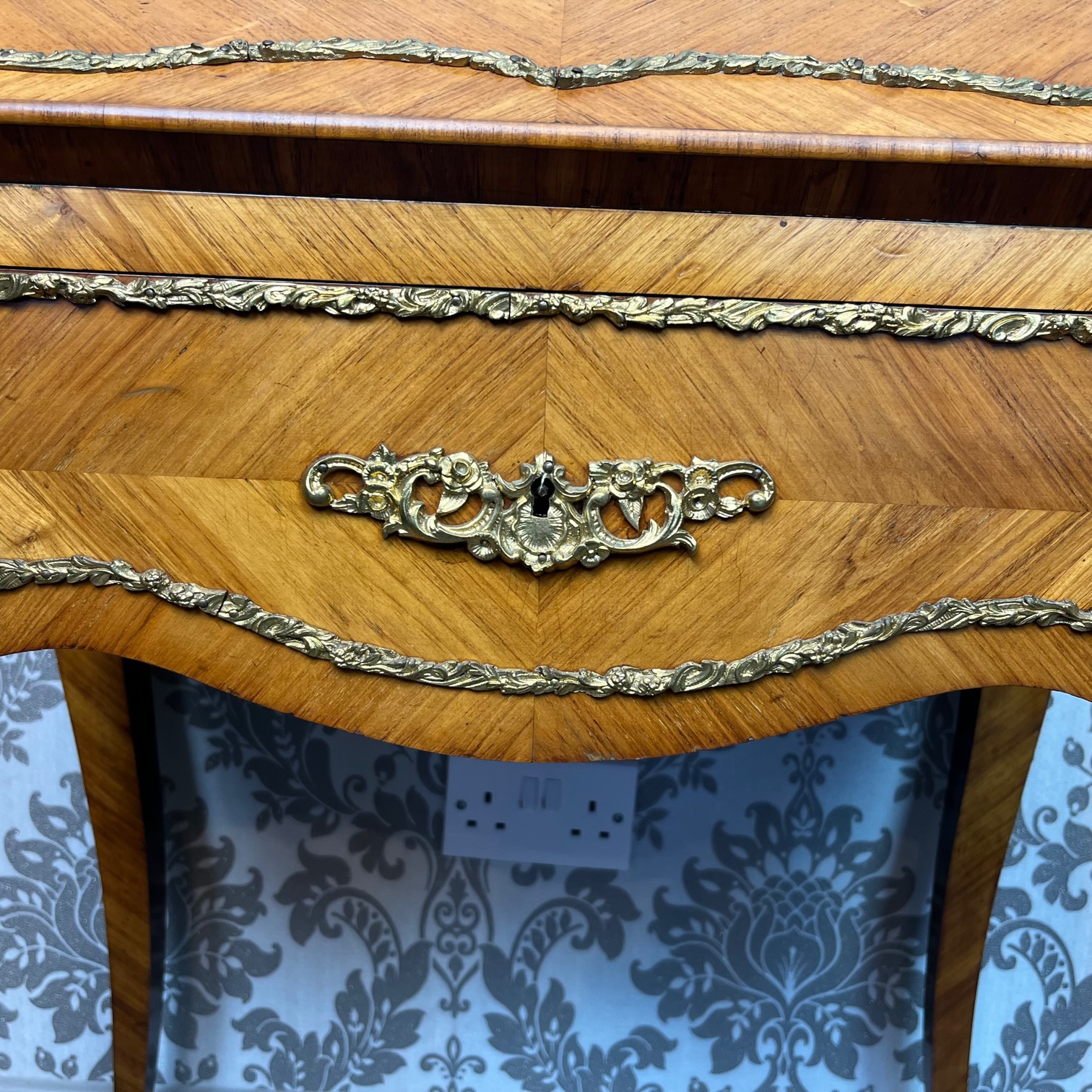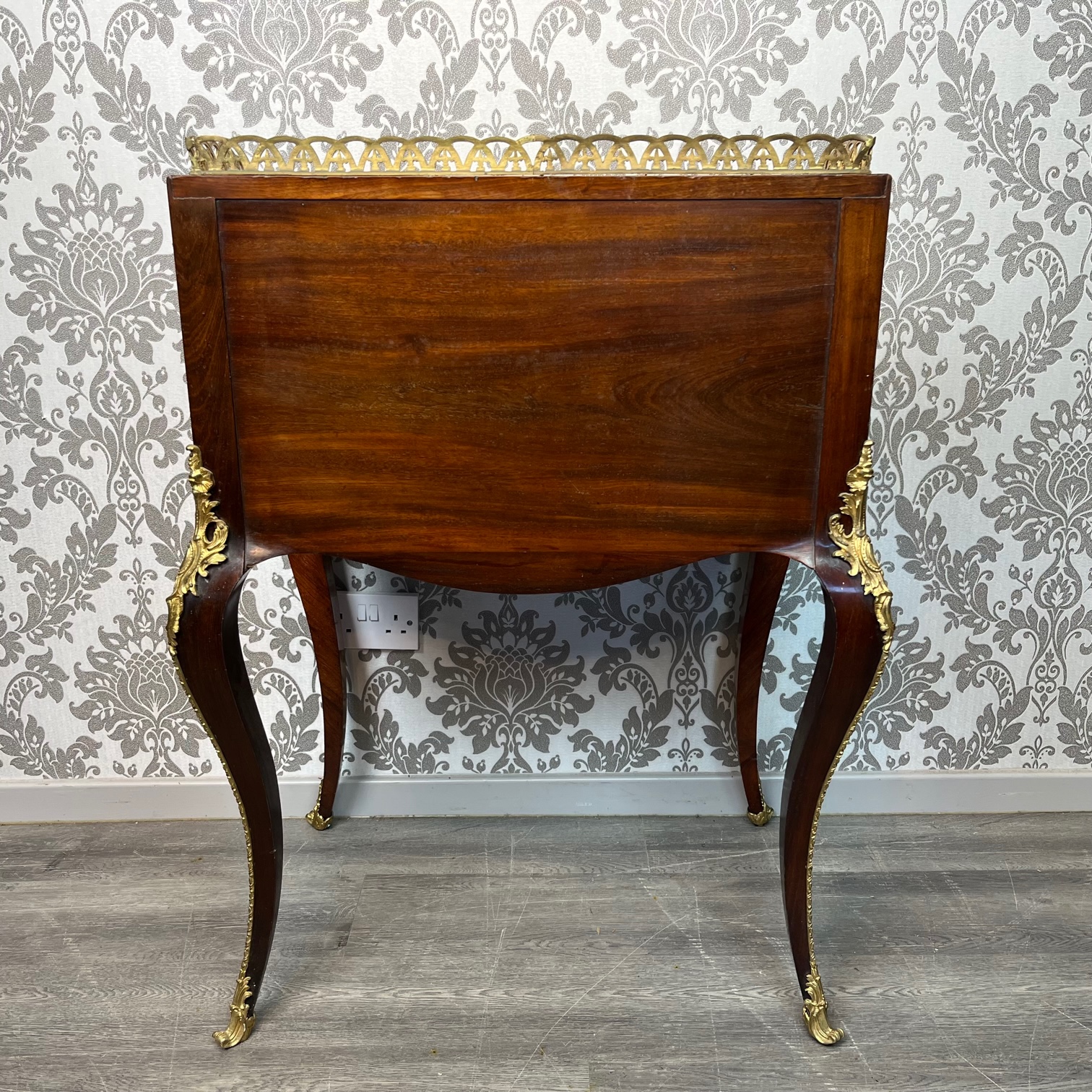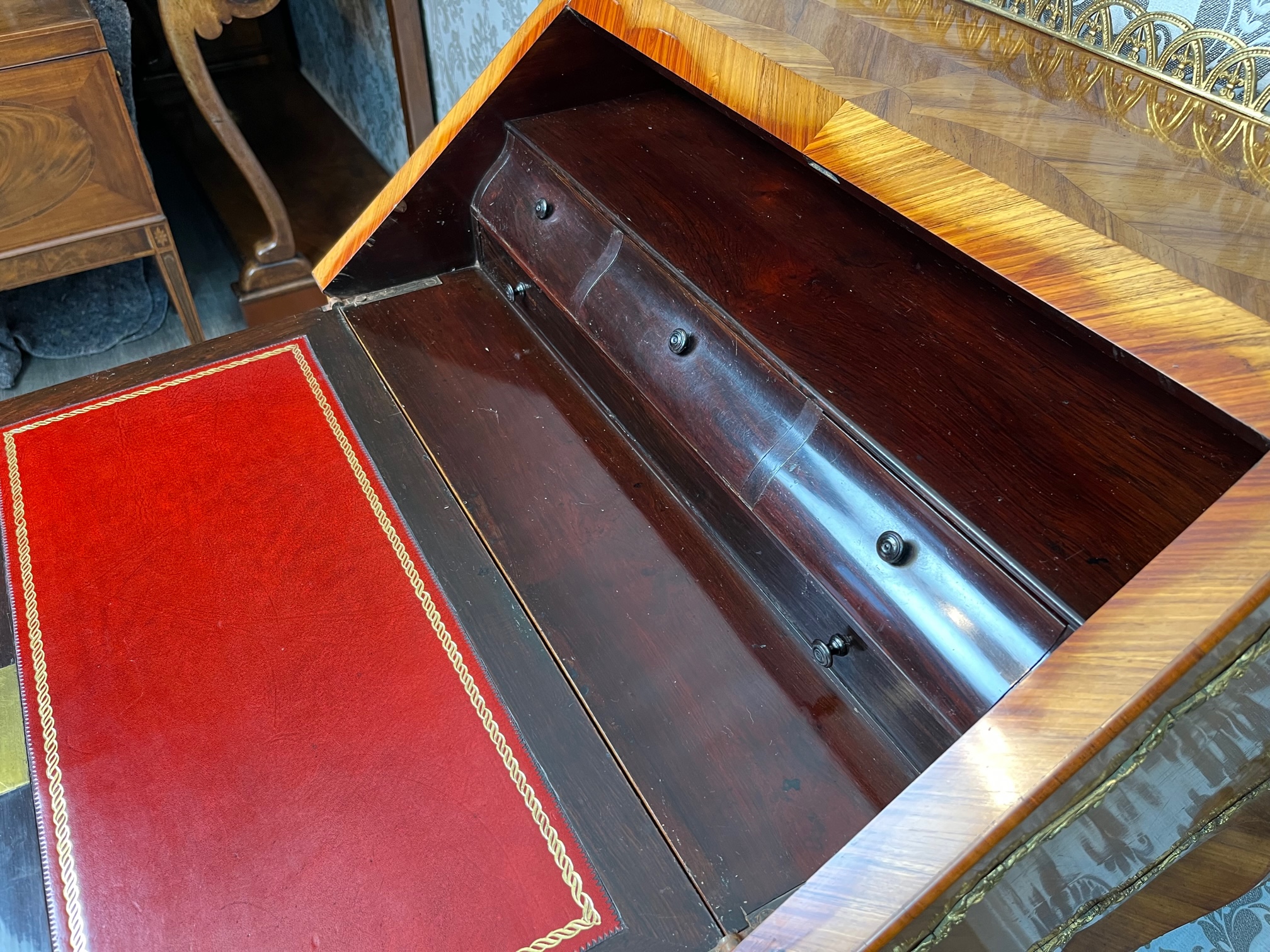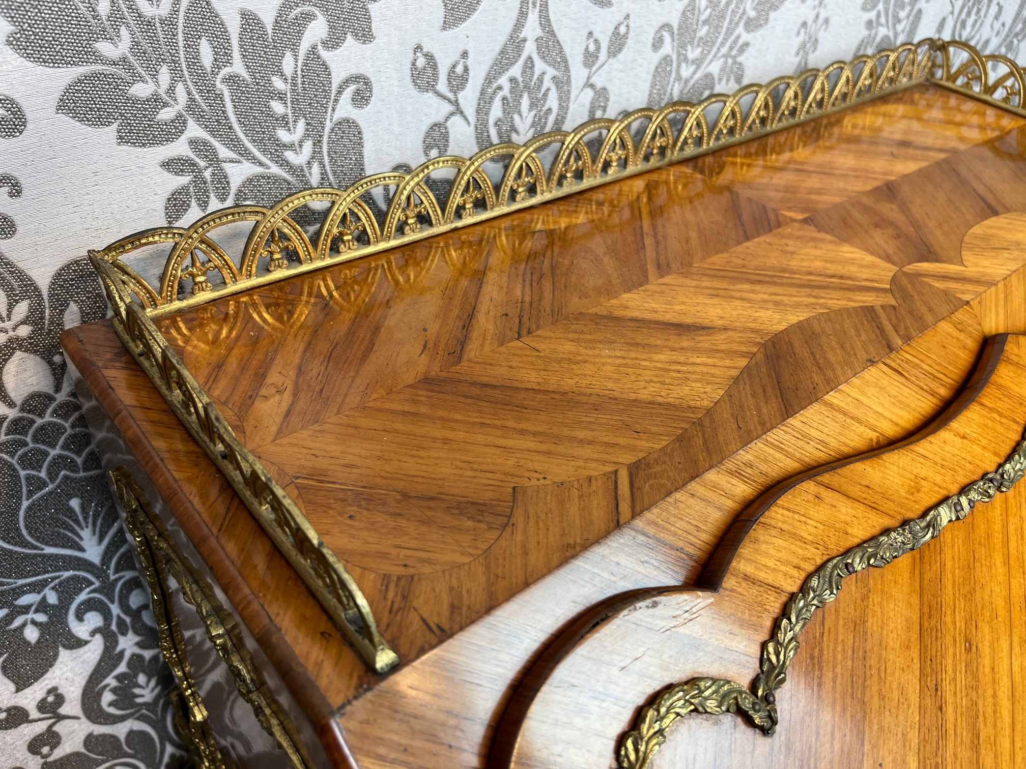 CompareA Late 19th Century French Kingwood bureau de dame. Having a raised brass gallery with a fall front opening to reveal a mahogany lined interior with drawers and writing surface. Raised on cabriole legs with fine quality ormolu mounts throughout and veneered in the finest kingwood. French circa 1890-1900 in superb original condition, a wonderful colour and patination