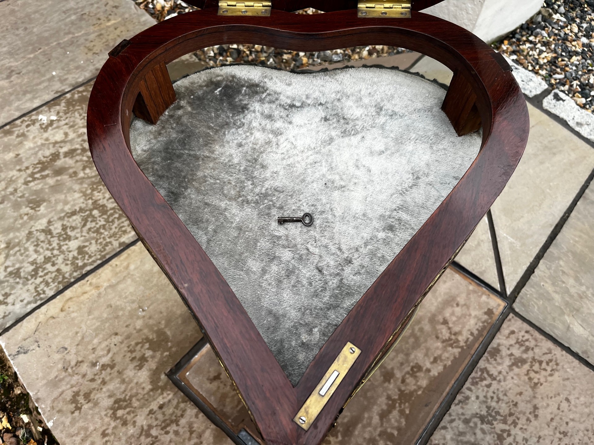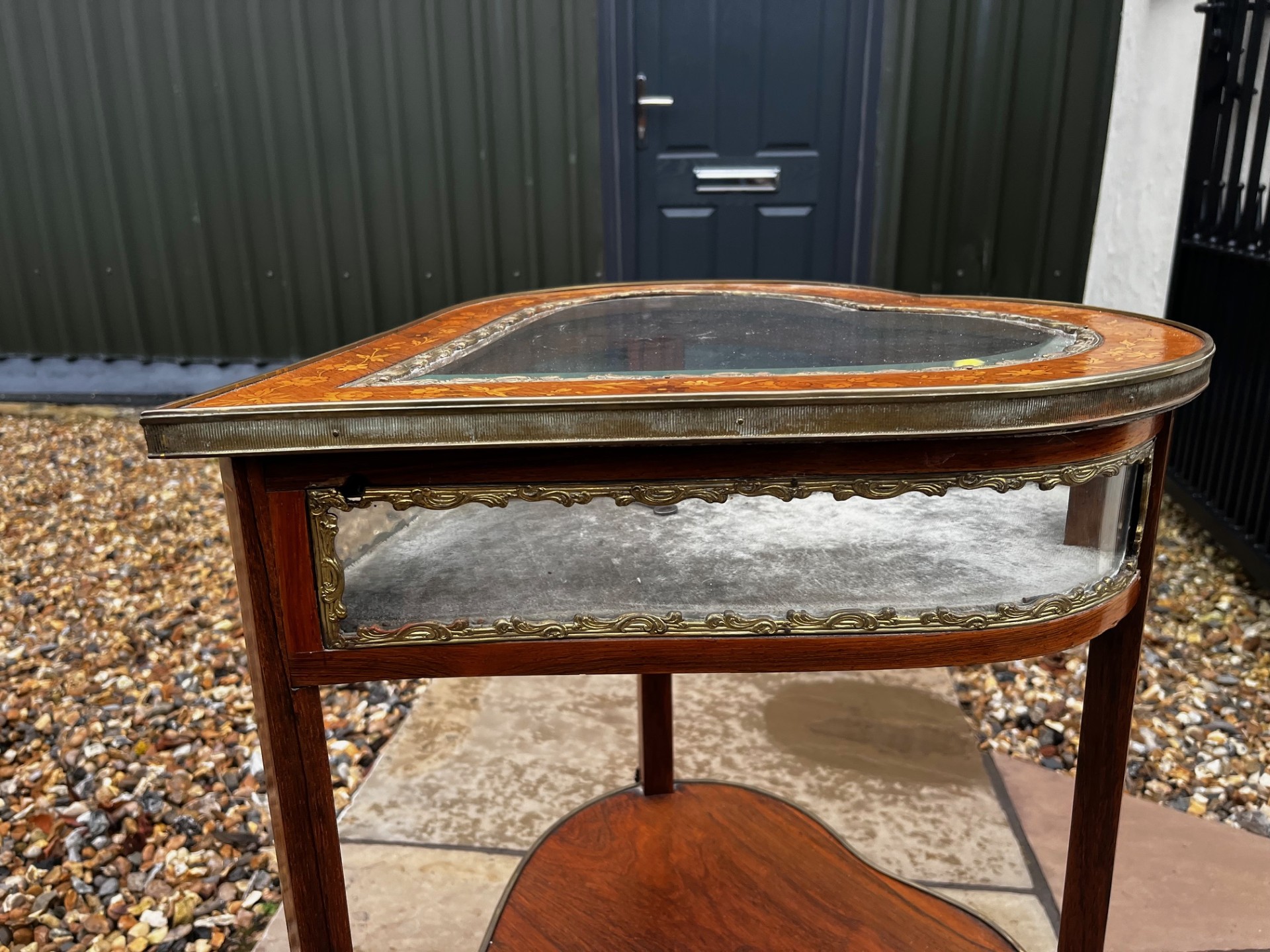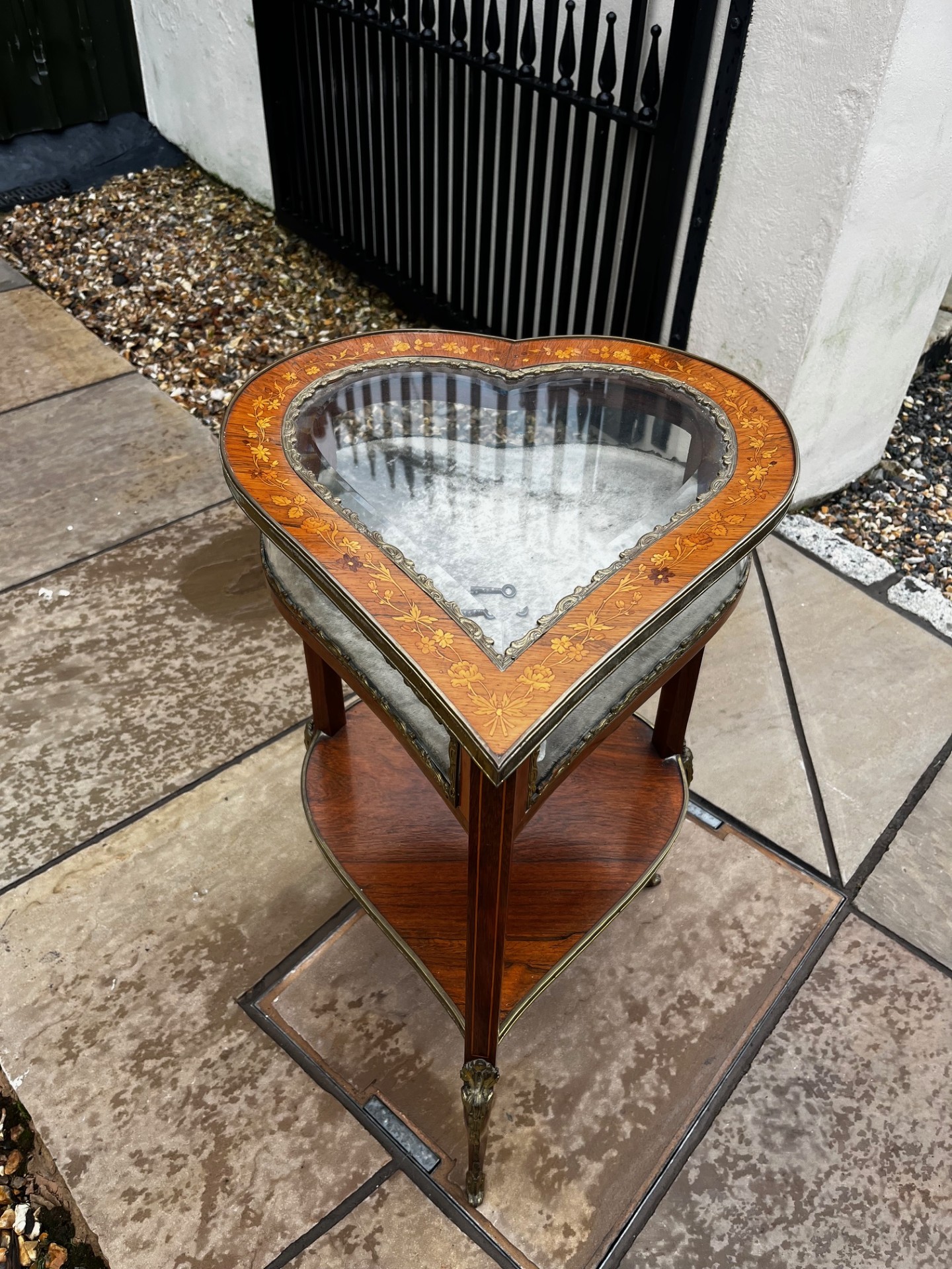 A Late 19th Century French Rosewood, Marquetry Inlaid And Brass Mounted Bijouterie Table. Having a heart shaped glass hinged top with. fine quality marquetry inlaid detail, opening to reveal a velvet lined display area. Having glazed sides and raised inelegant brass mounted cabriole supports united by a heart shaped under-tier. French Circa 1890-1900
