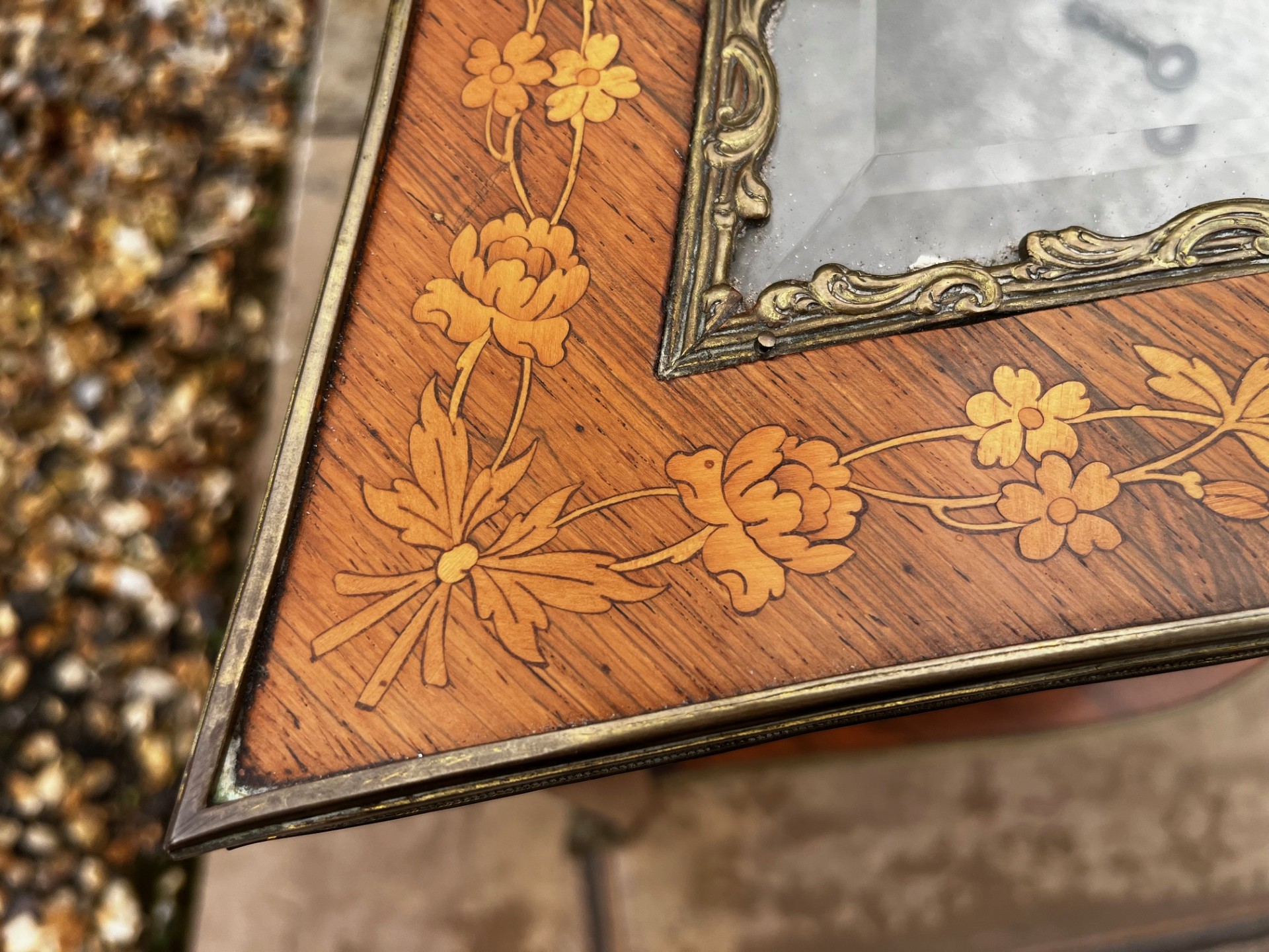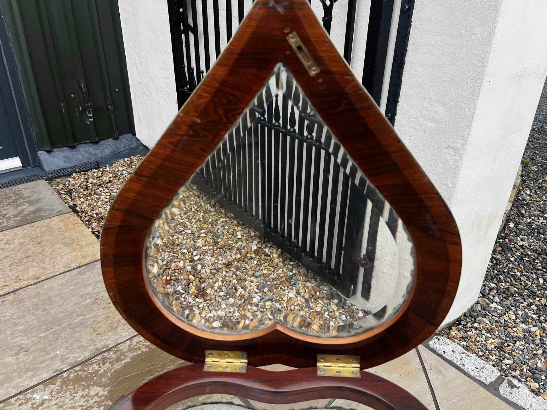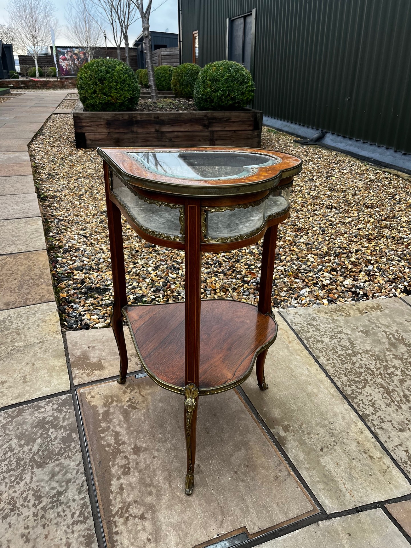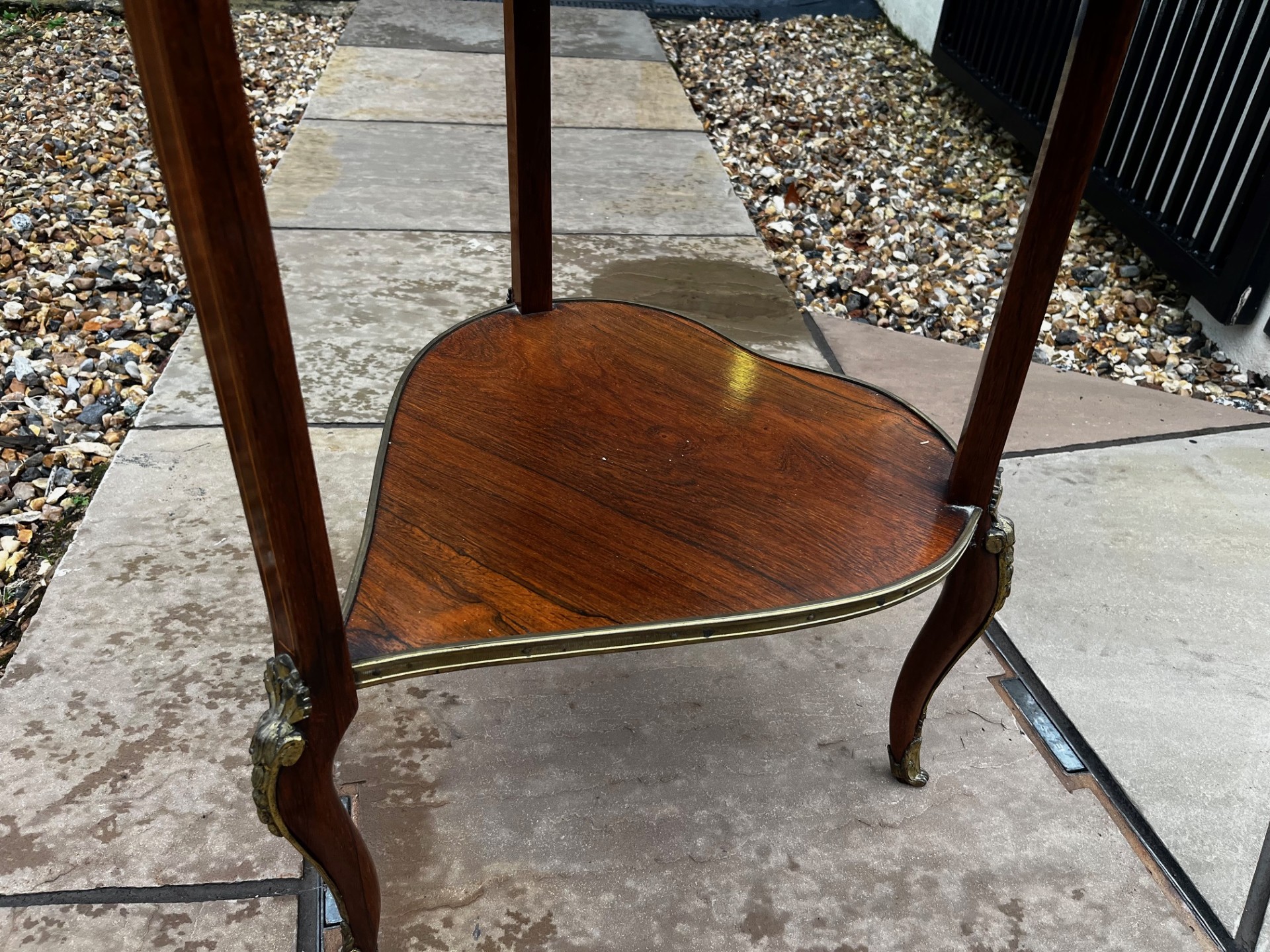 A Late 19th Century French Rosewood, Marquetry Inlaid And Brass Mounted Bijouterie Table. Having a heart shaped glass hinged top with. fine quality marquetry inlaid detail, opening to reveal a velvet lined display area. Having glazed sides and raised inelegant brass mounted cabriole supports united by a heart shaped under-tier. French Circa 1890-1900