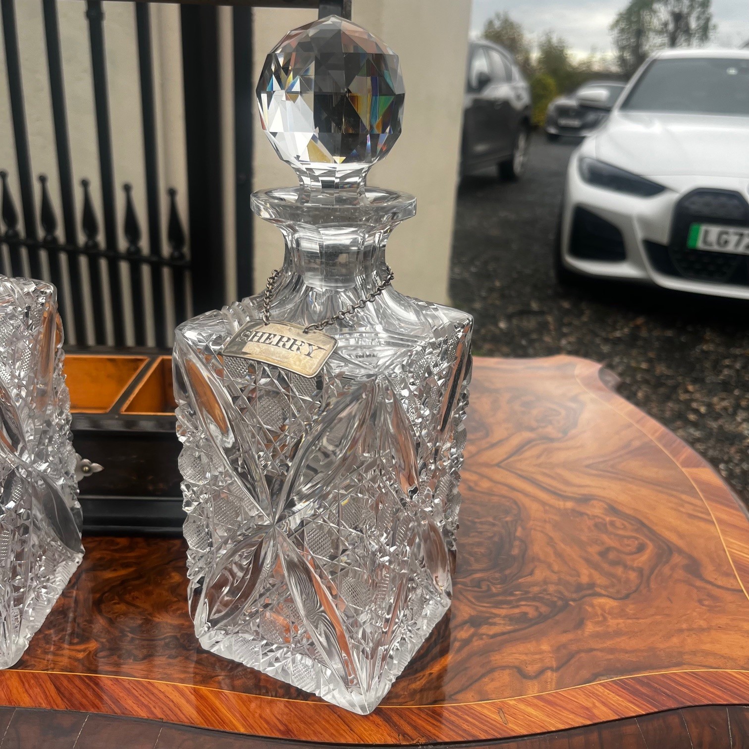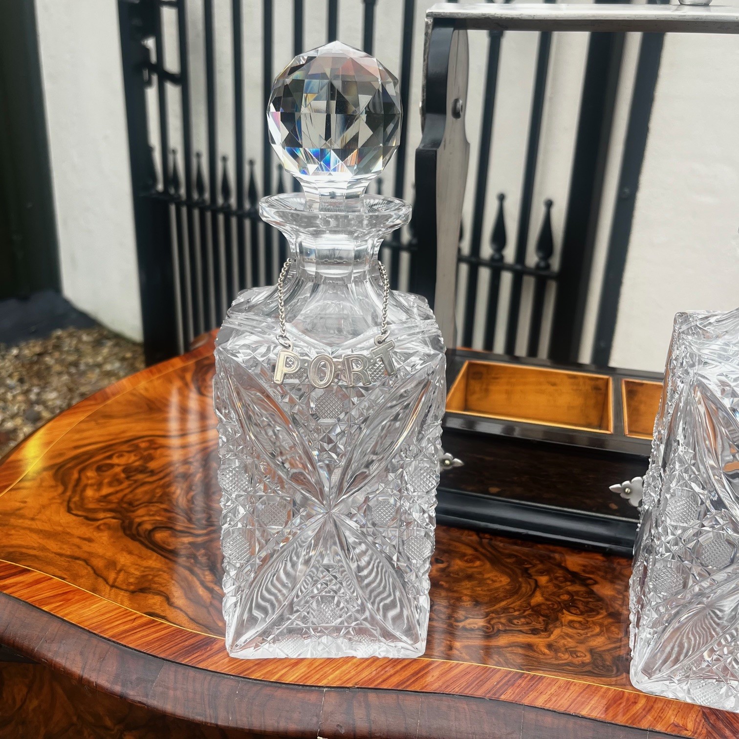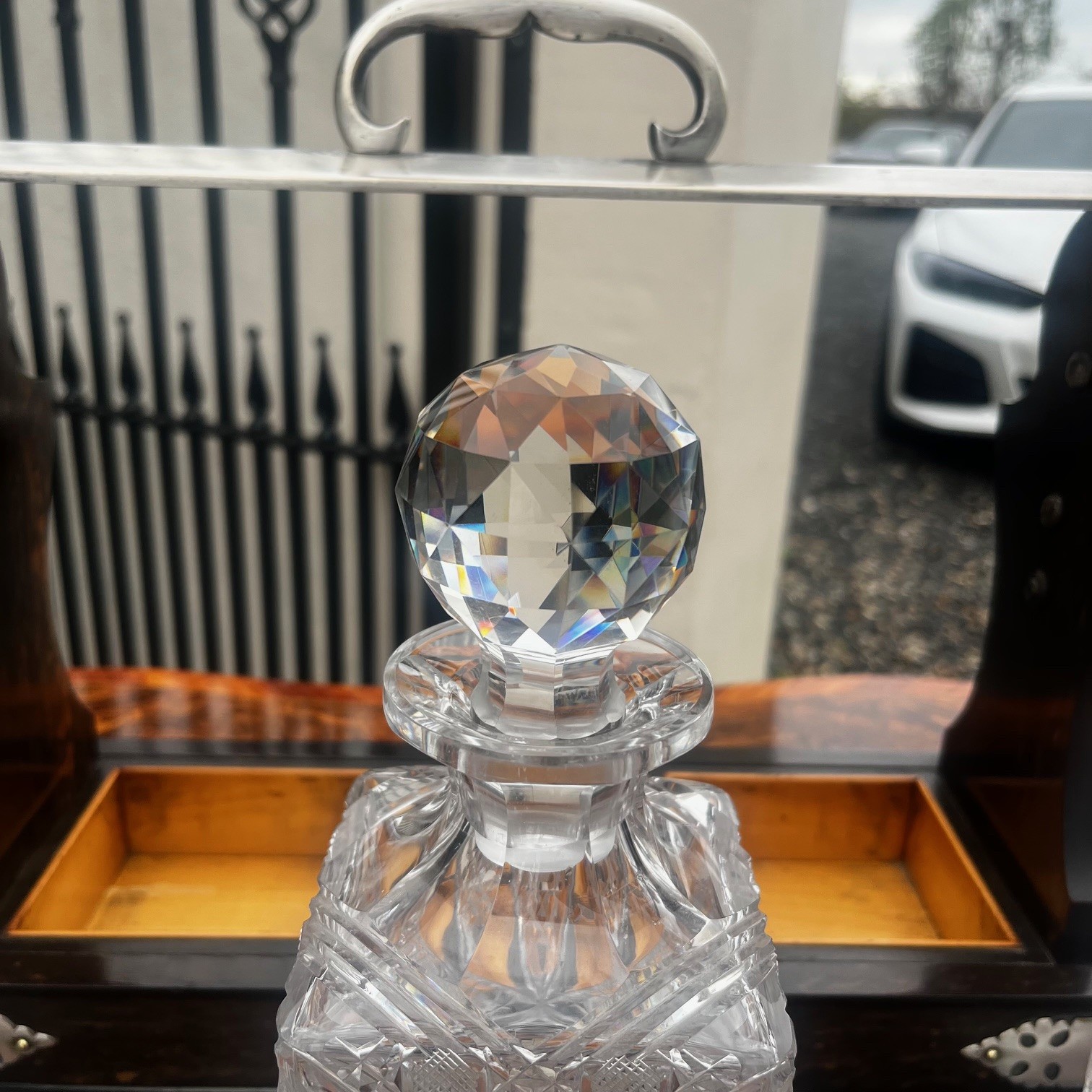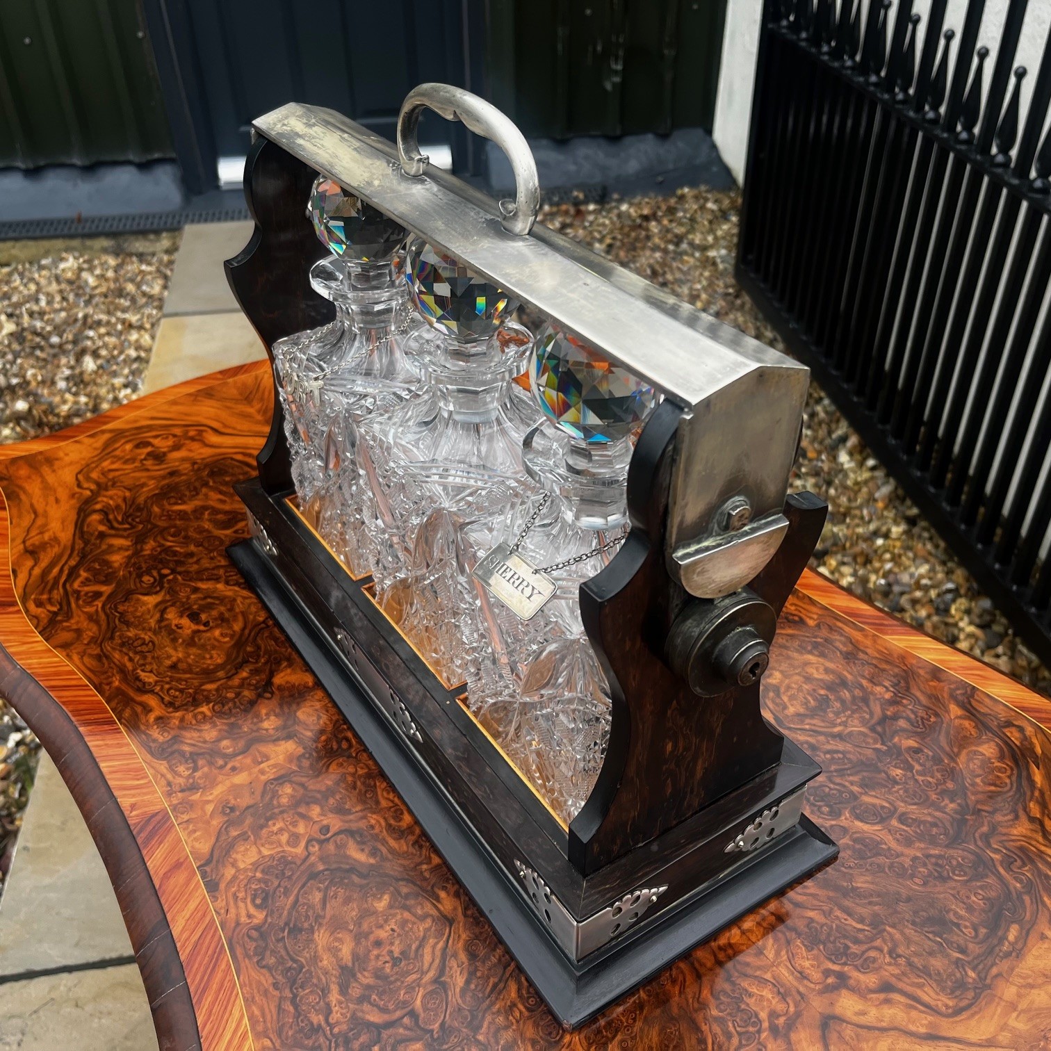 A Late Victorian Period Coromandel and silver plated tantalus. The case constructed in coromandel which is a rare and exotic timber, native to Sri Lanka and India and was used in the 19th Century for boxes, tea caddies and writing slopes etc. It was originally imported in small logs and used for cross banding due to its expense. The tantalus having a hinged silver plated handle and locking mechanism which opens to reveal three cut glass decanters and stoppers, with further silver plated mounts to the case. English circa 1890-1900