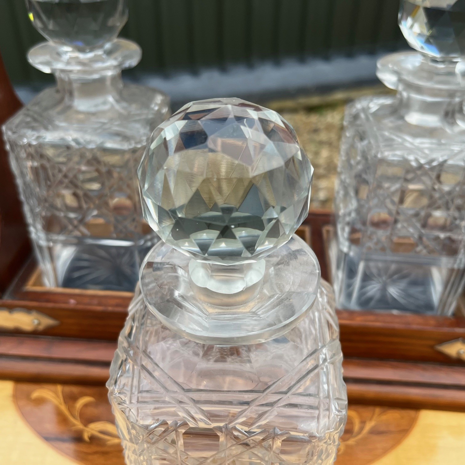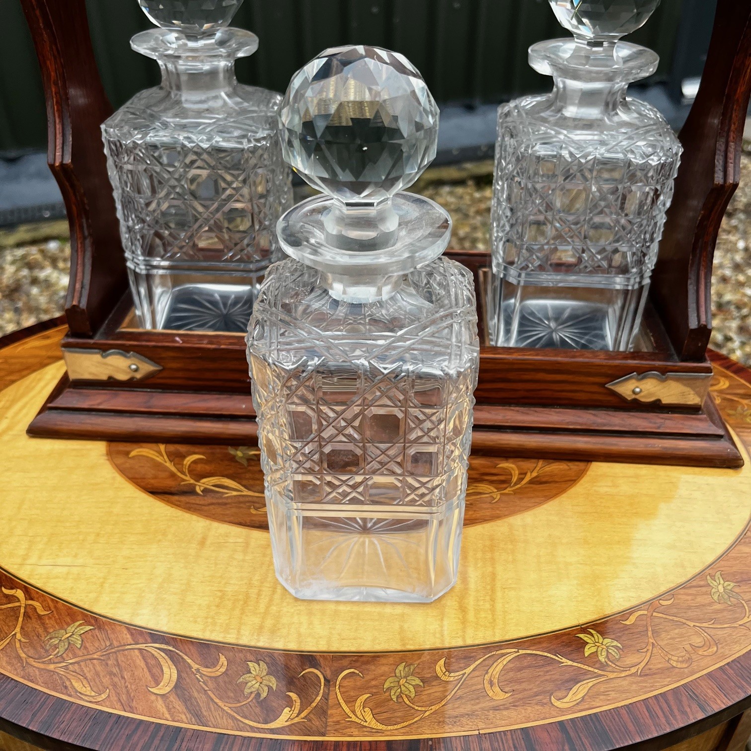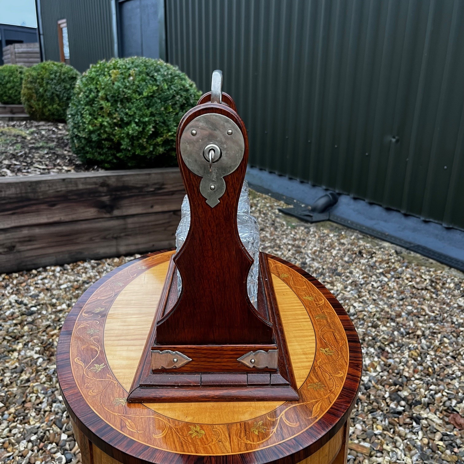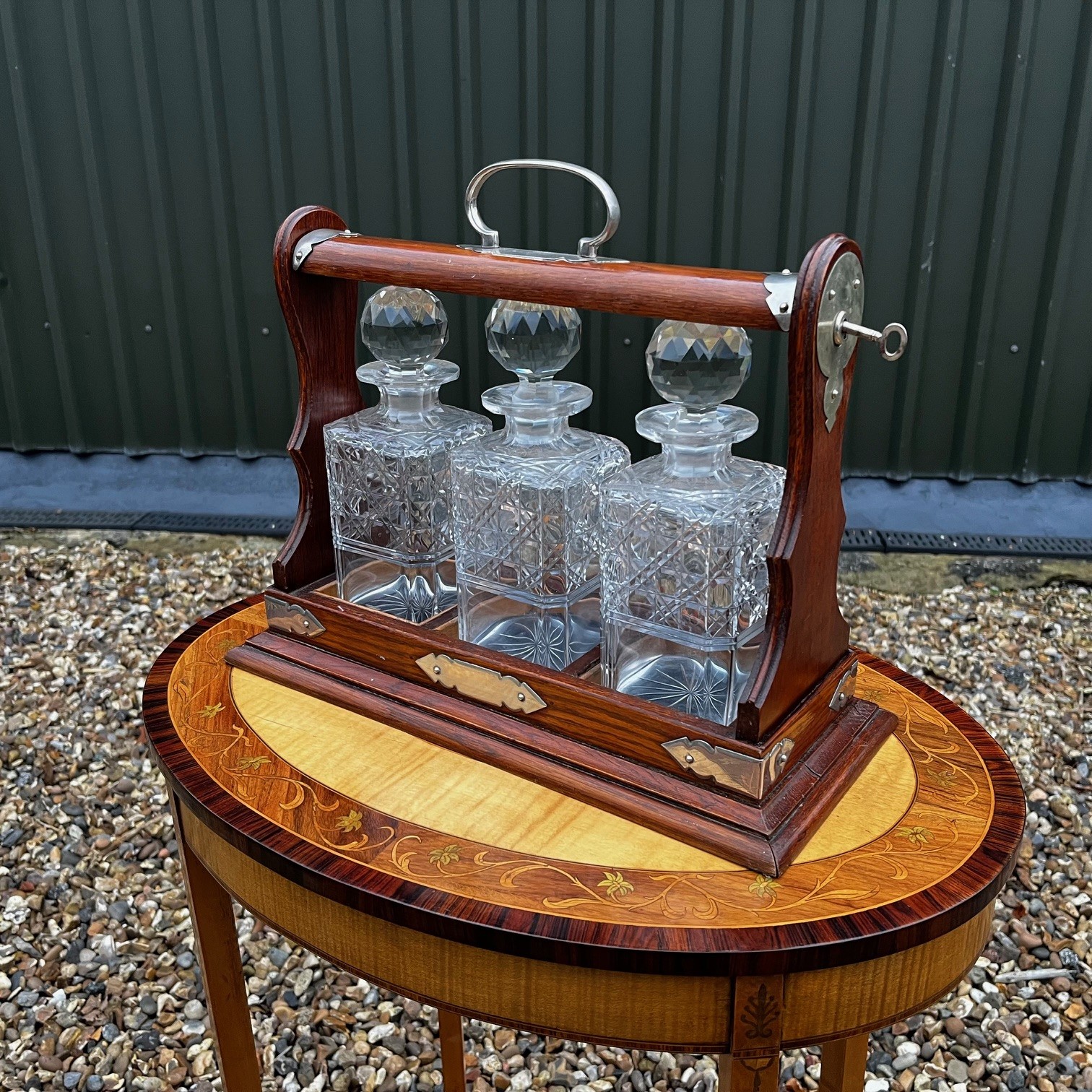 A Late Victorian Period oak three bottle after dinner tantalus. The solid oak frame with silver plated handle and fittings, complete with working key. Housing three hobnail cut glass decanters. English circa 1900