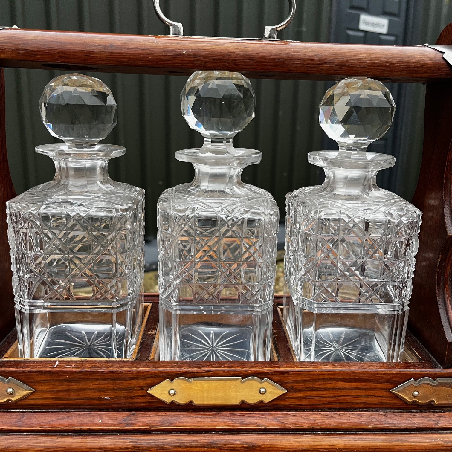 A Late Victorian Period oak three bottle after dinner tantalus