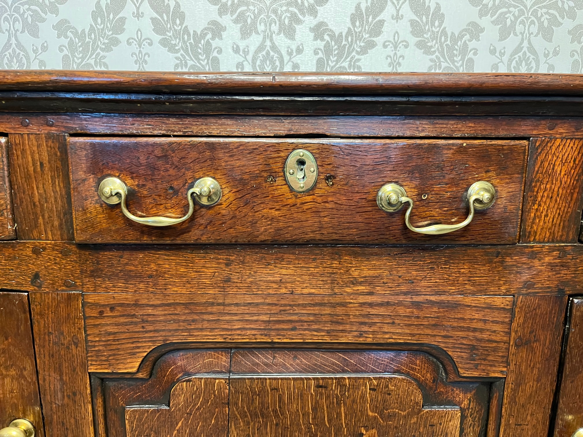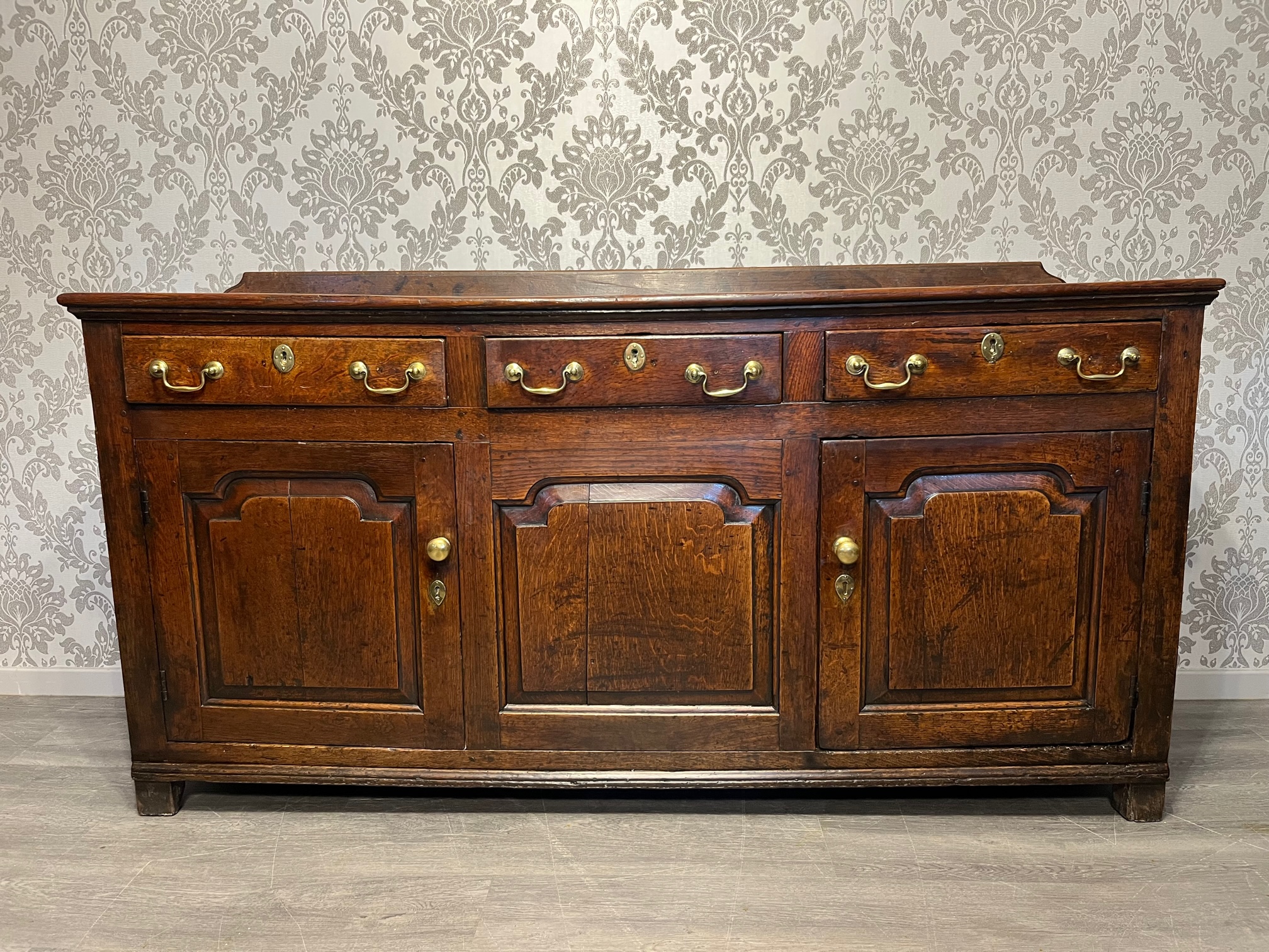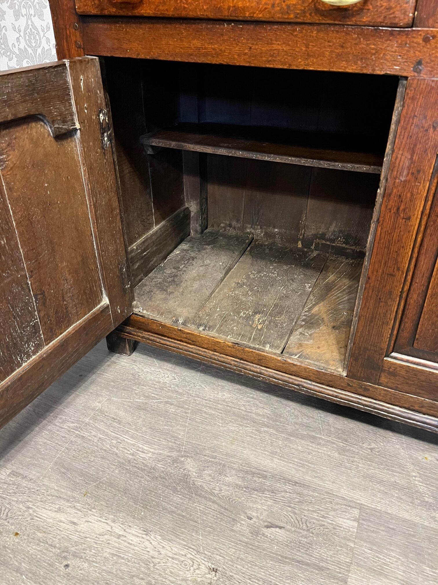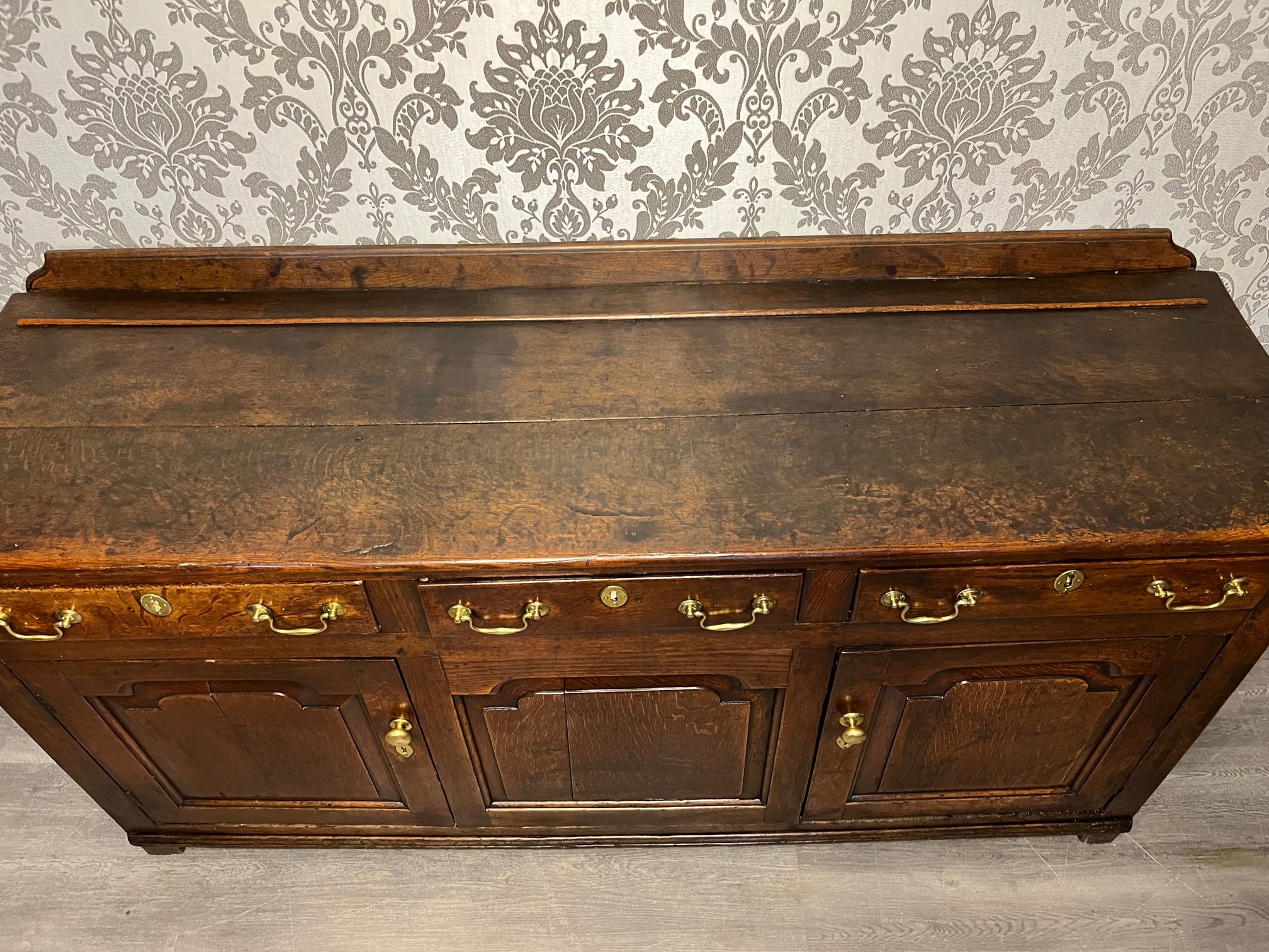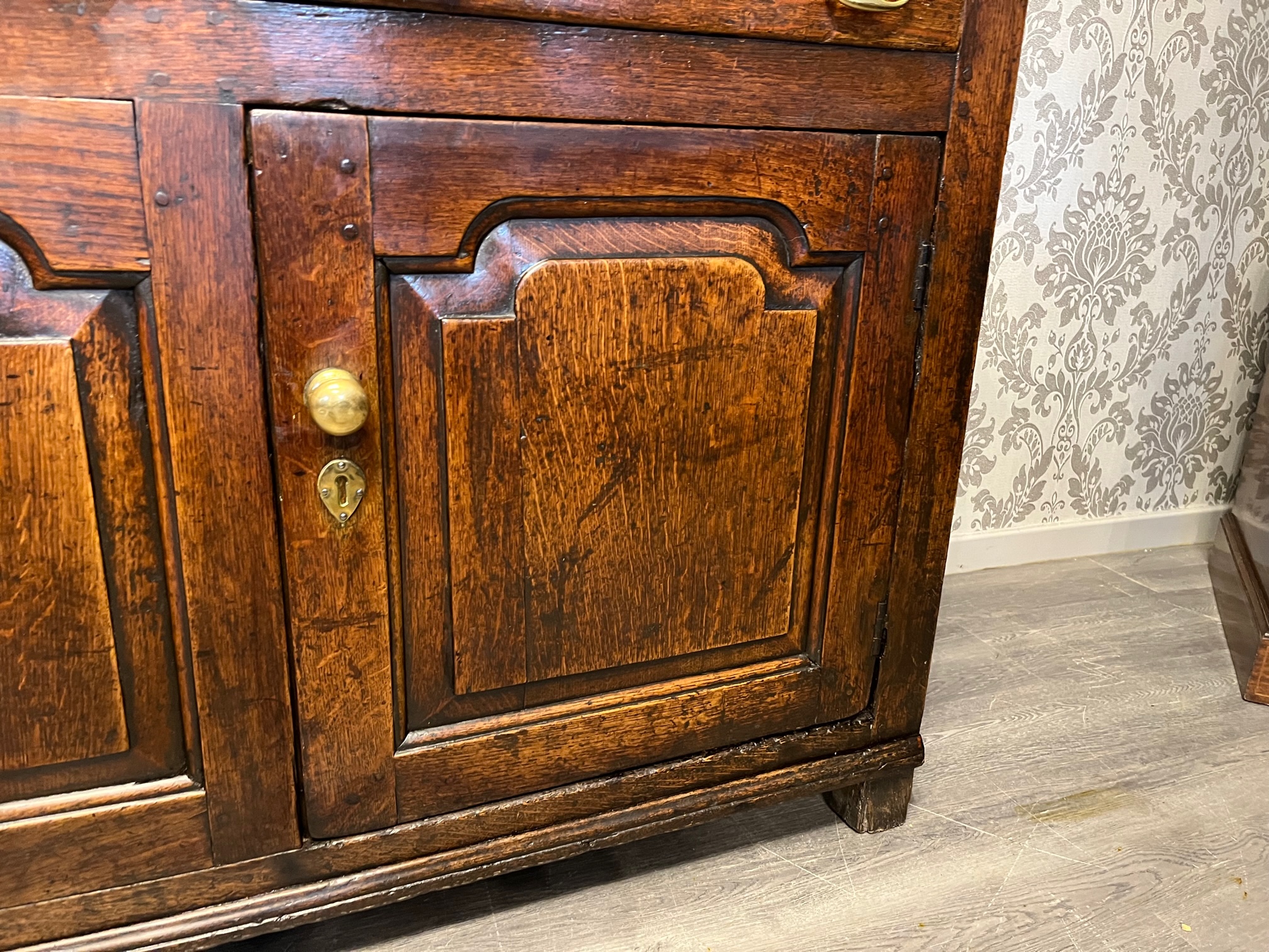 CompareA lovely 18th Century oak antique dresser base. Having a rectangular two plank top of fabulous colour and patination above three rectangular drawers with oak linings and brass swan neck handles. The front having oak doors with fielded panels and opening to enclose storage space and a shelf. The whole raised on stile feet with panelled ends. Circa 1750-1760, of superb colour and patination