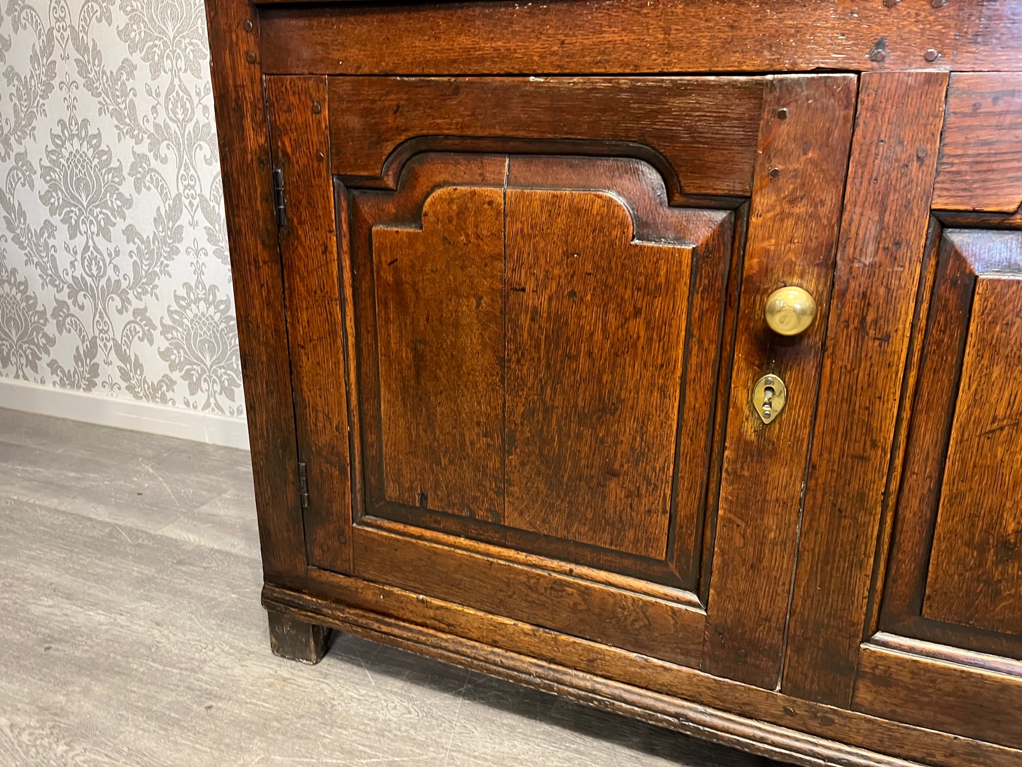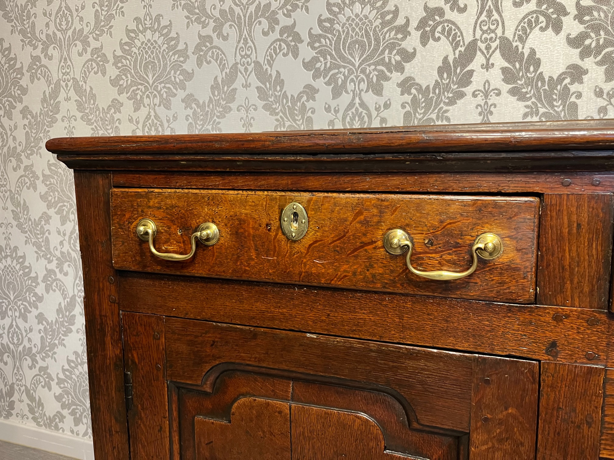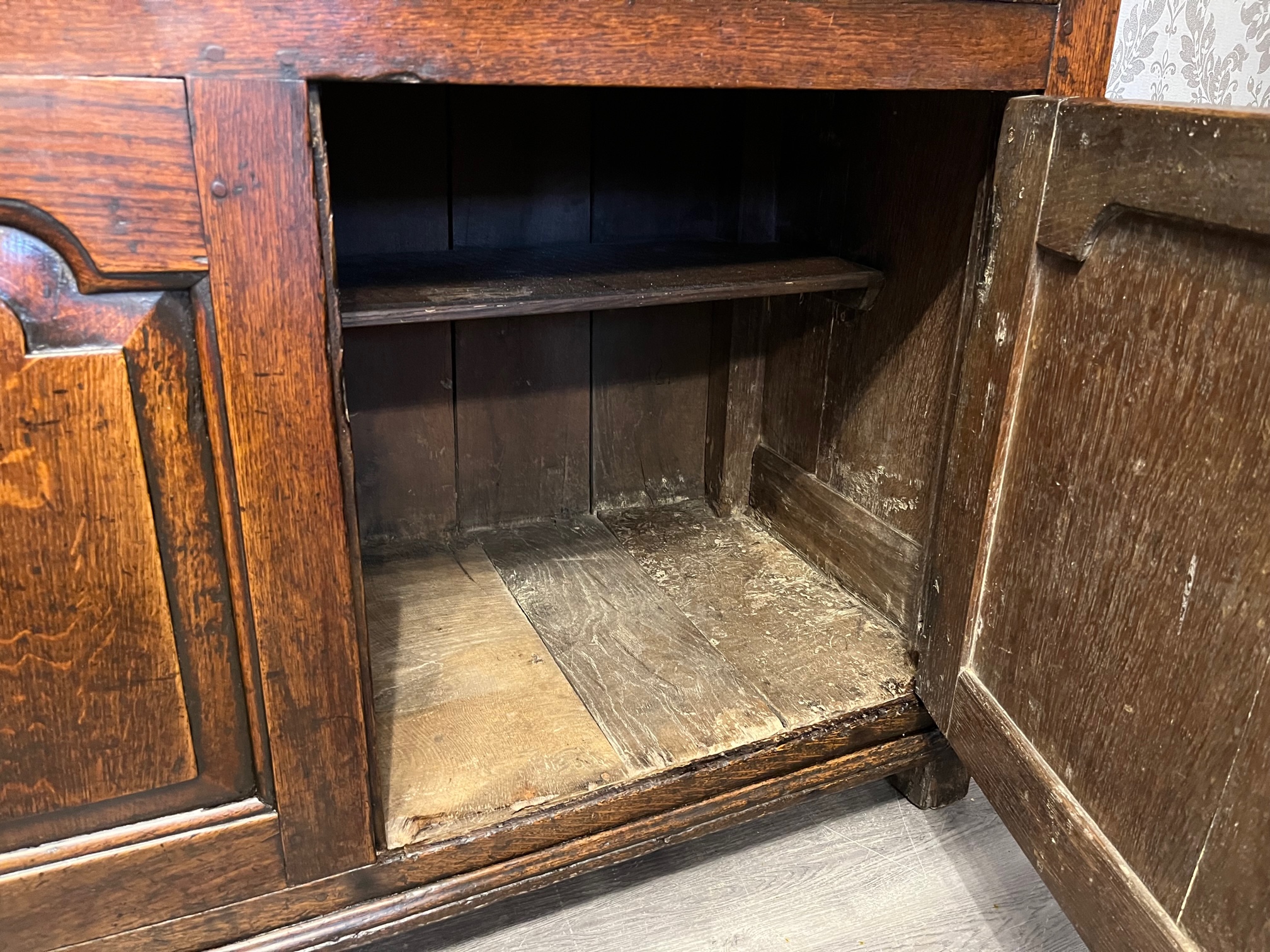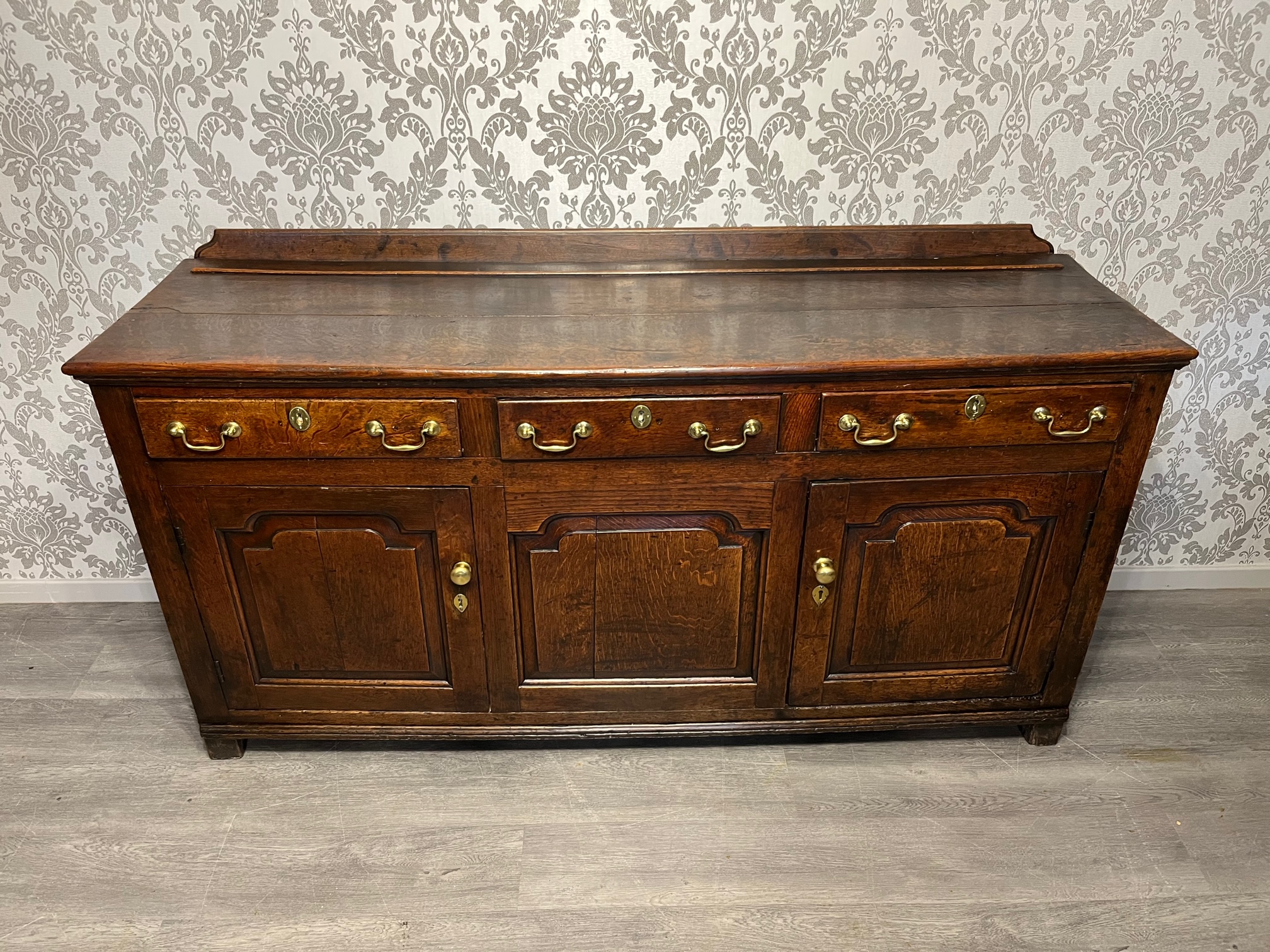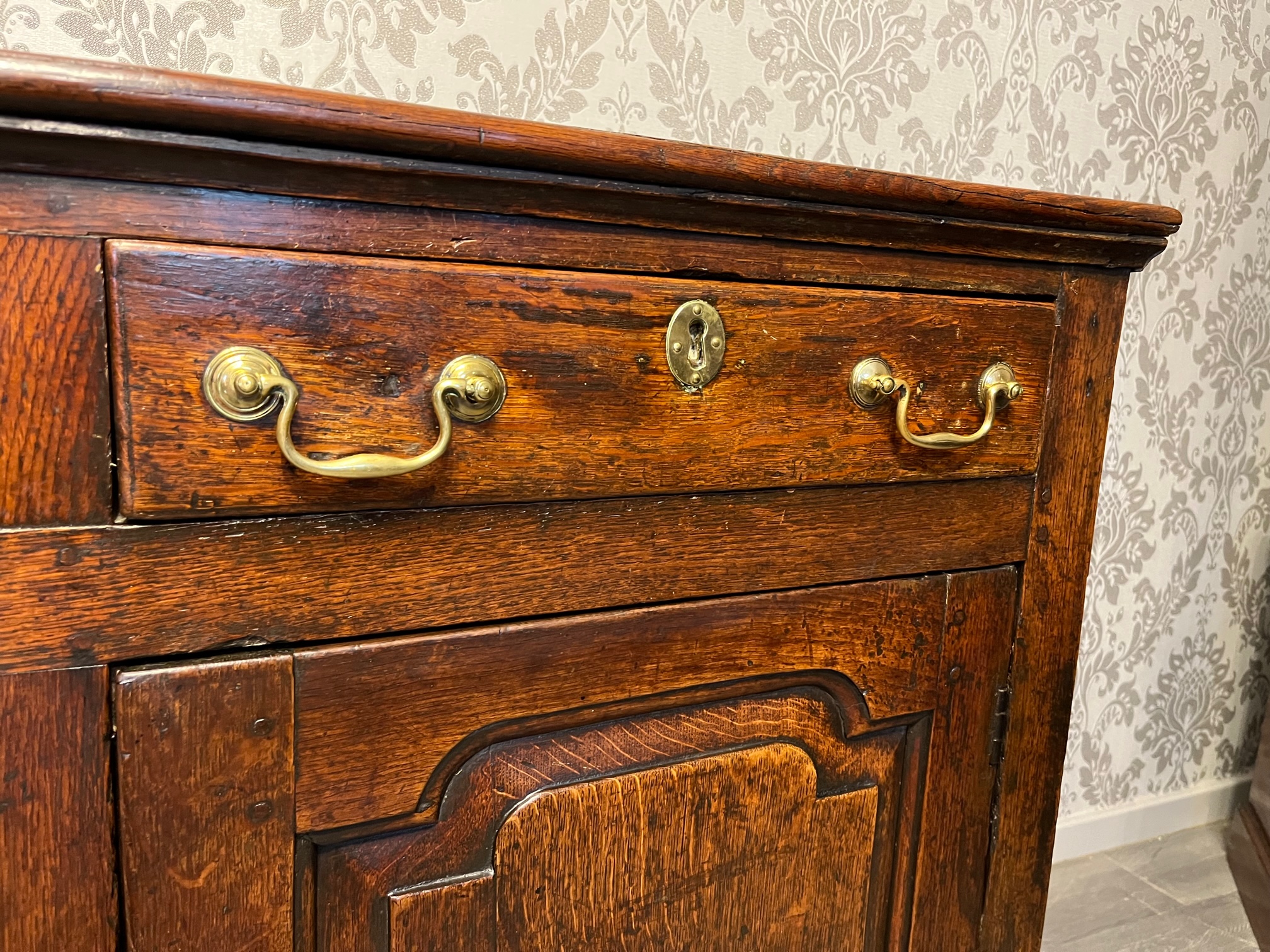 CompareA lovely 18th Century oak antique dresser base. Having a rectangular two plank top of fabulous colour and patination above three rectangular drawers with oak linings and brass swan neck handles. The front having oak doors with fielded panels and opening to enclose storage space and a shelf. The whole raised on stile feet with panelled ends. Circa 1750-1760, of superb colour and patination