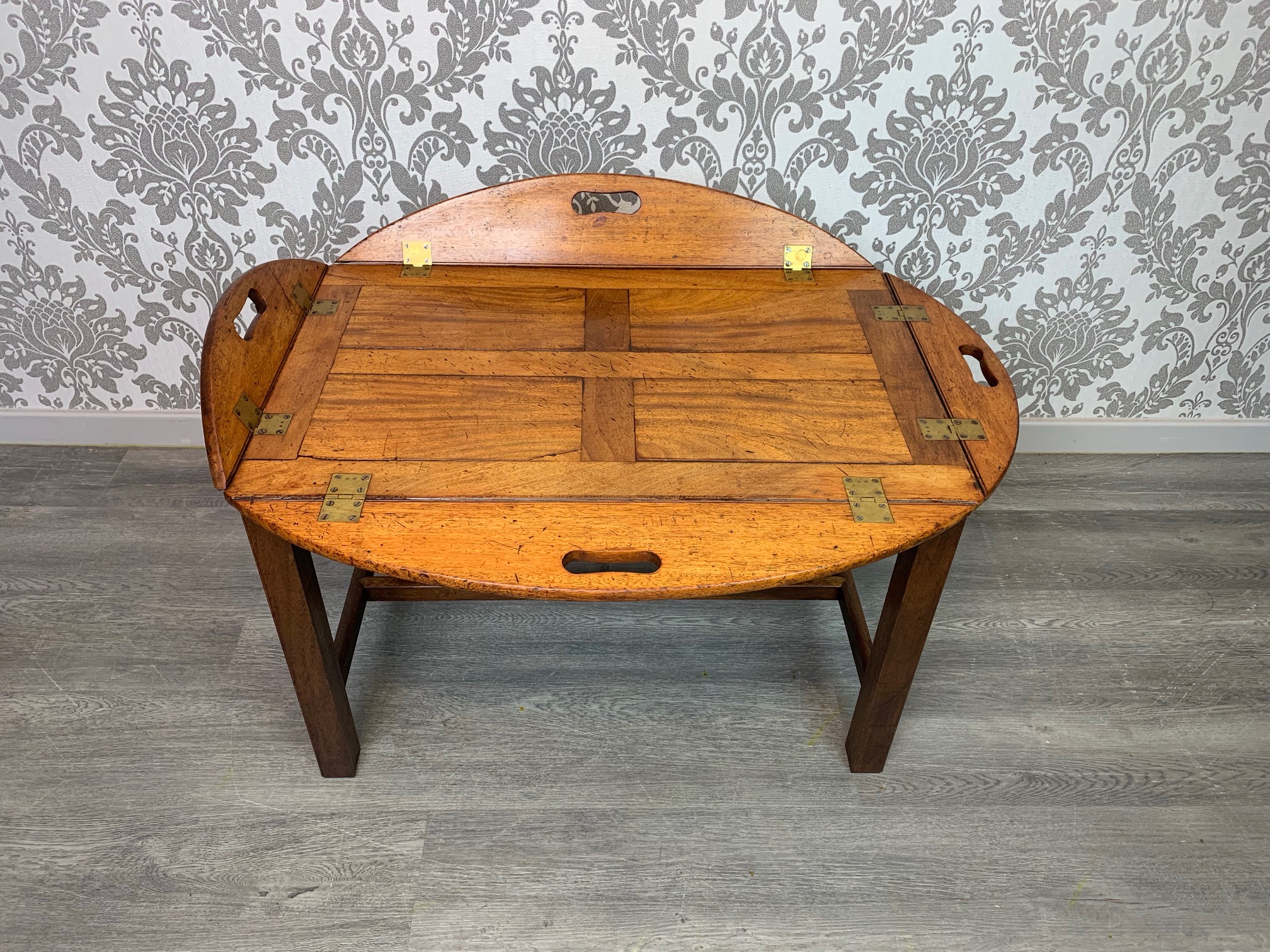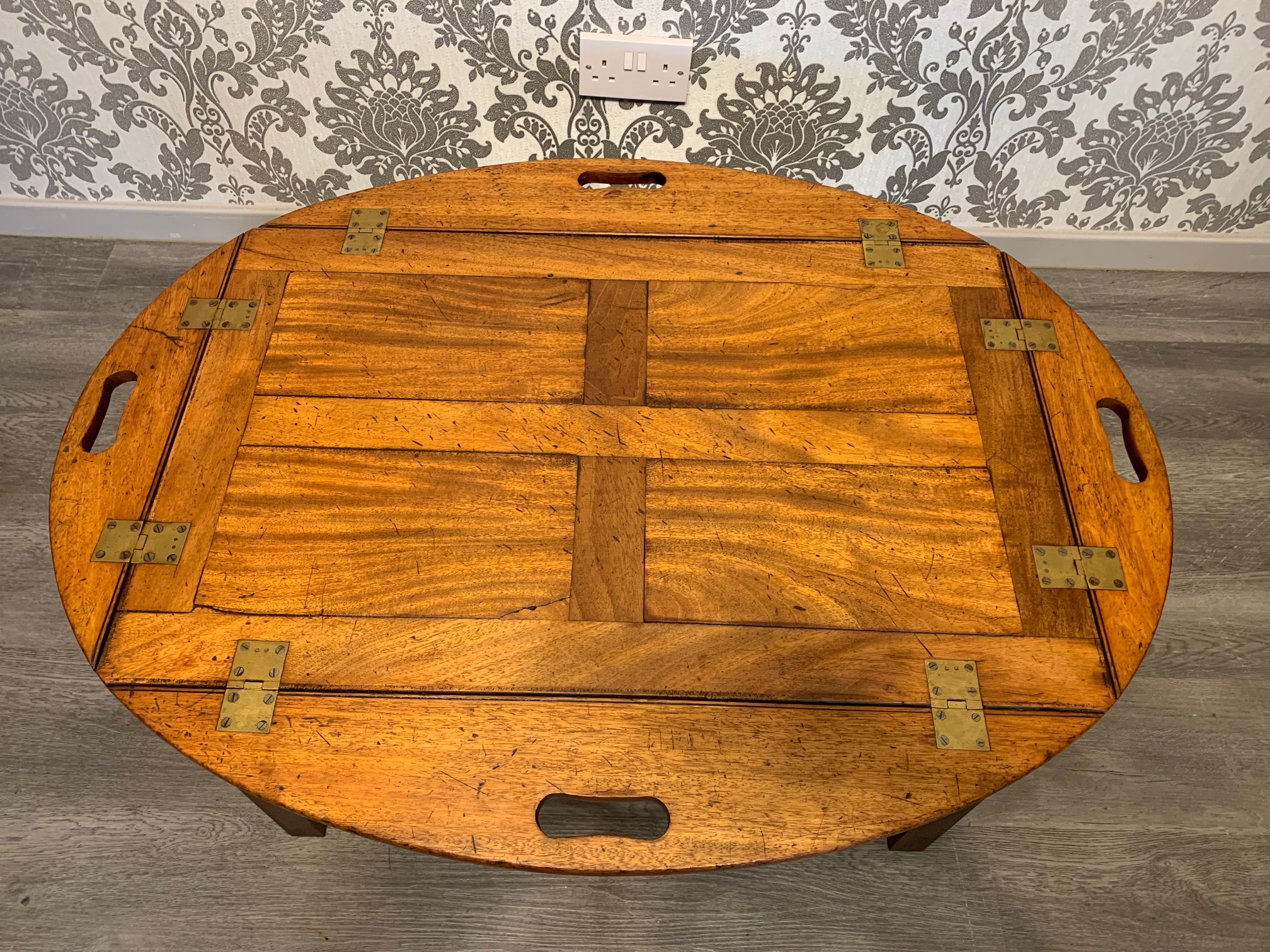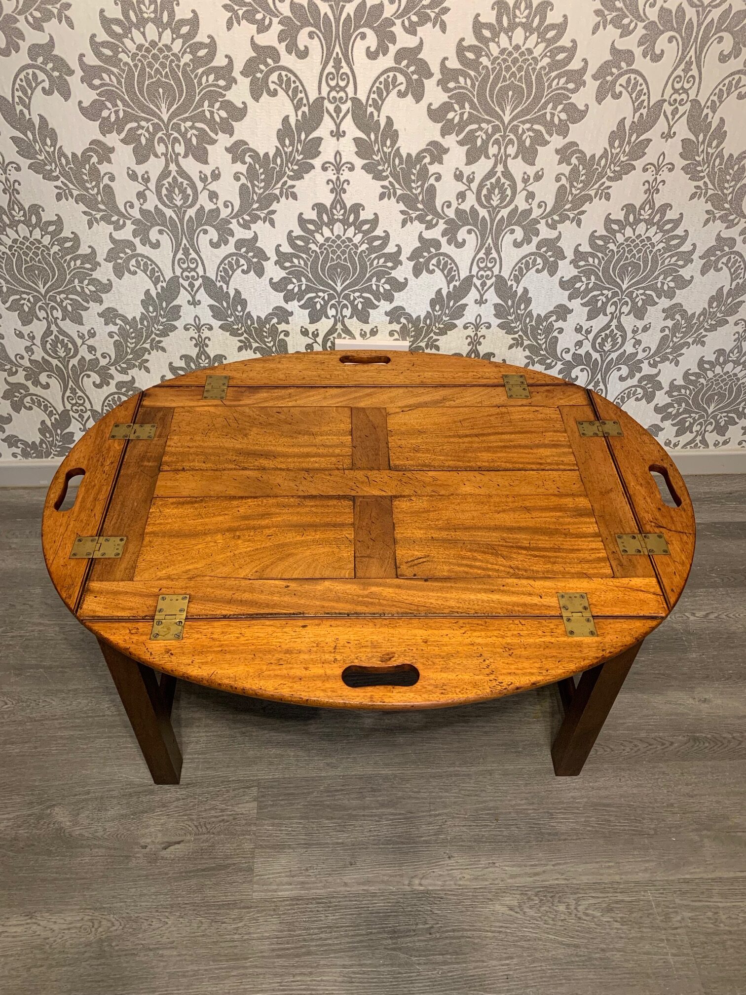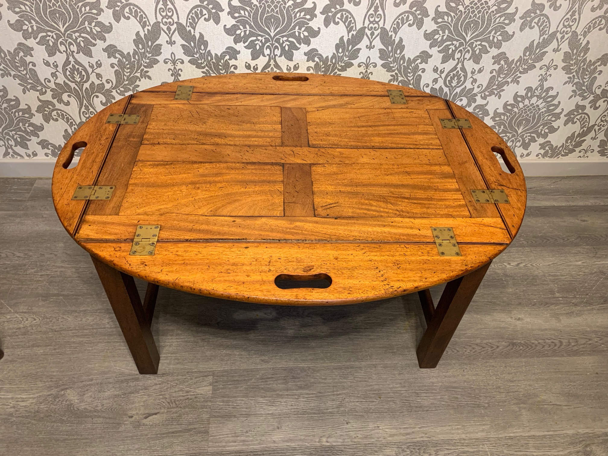 CompareA lovely 19th Century mahogany butlers tray/coffee table. The top in beautifully figured mahogany and of a lovely colour and patination, of oval form, with hinged carrying handles and brass hinges. Raised on a high quality cabinet made stand of a later date. English, the tope circa 1850, the mahogany base circa 1920. In excellent condition