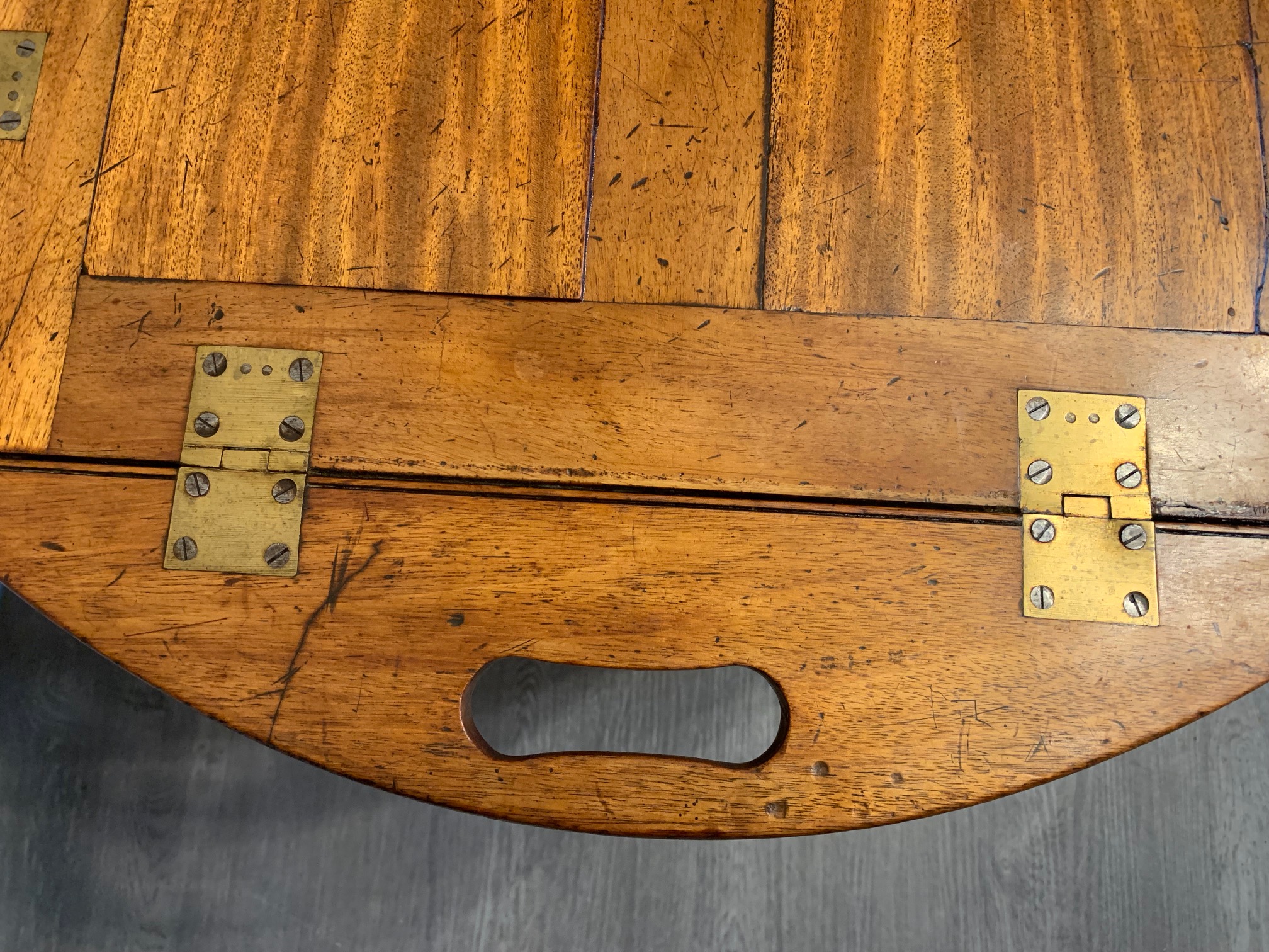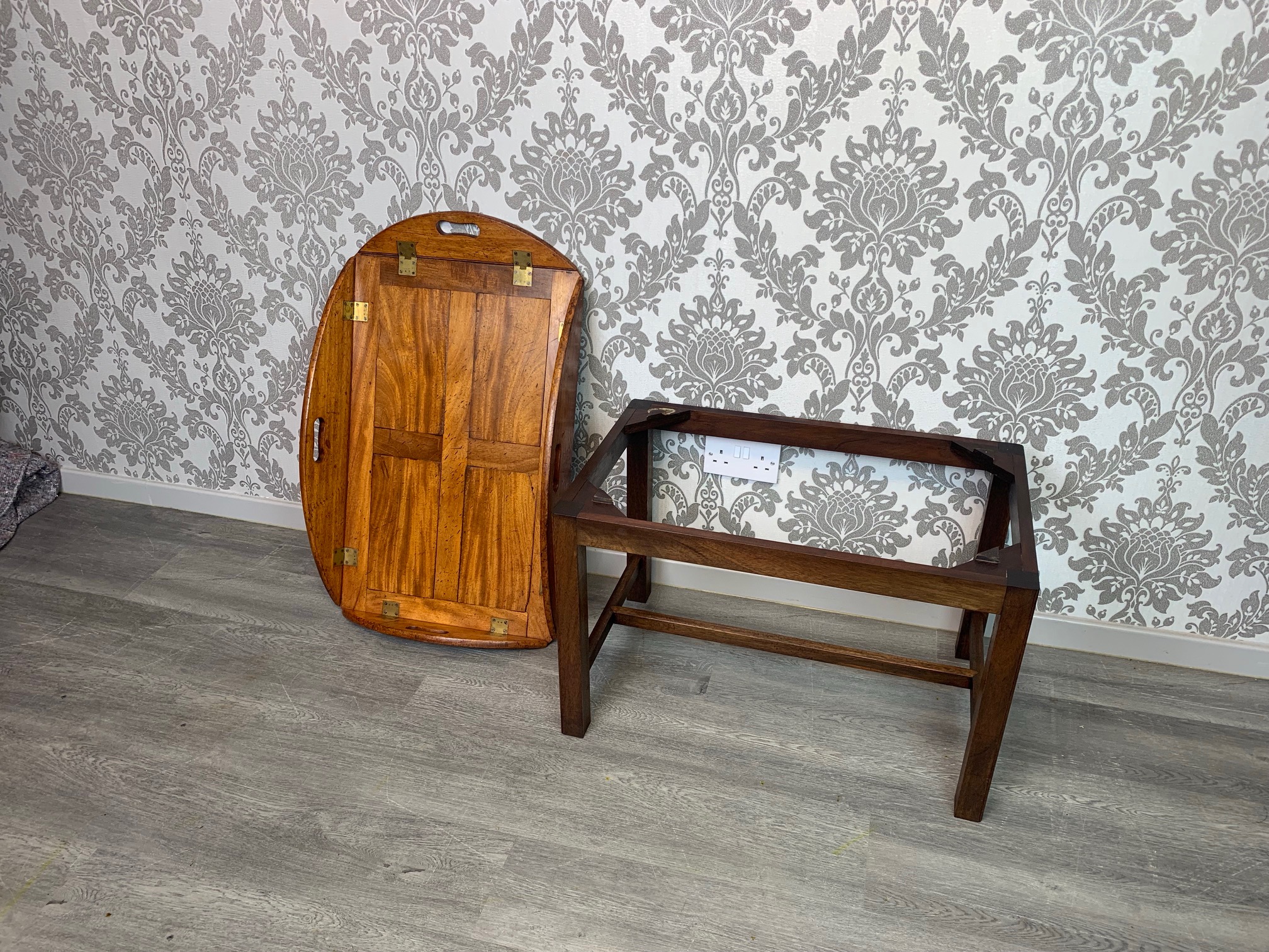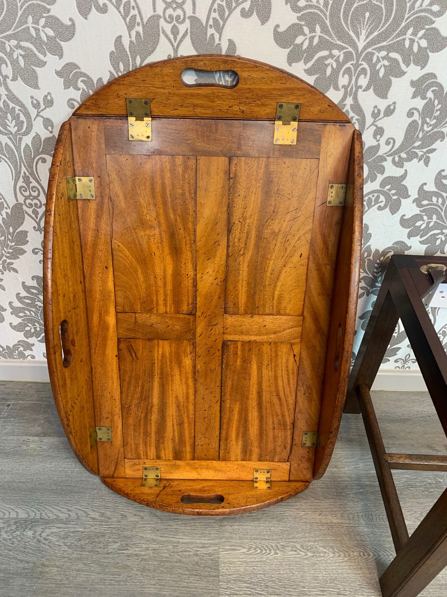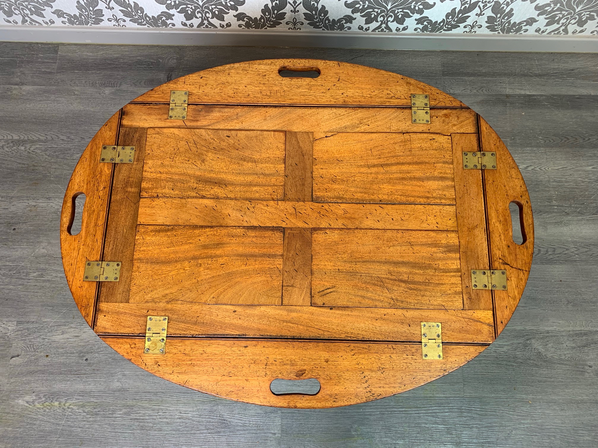 CompareA lovely 19th Century mahogany butlers tray/coffee table. The top in beautifully figured mahogany and of a lovely colour and patination, of oval form, with hinged carrying handles and brass hinges. Raised on a high quality cabinet made stand of a later date. English, the tope circa 1850, the mahogany base circa 1920. In excellent condition