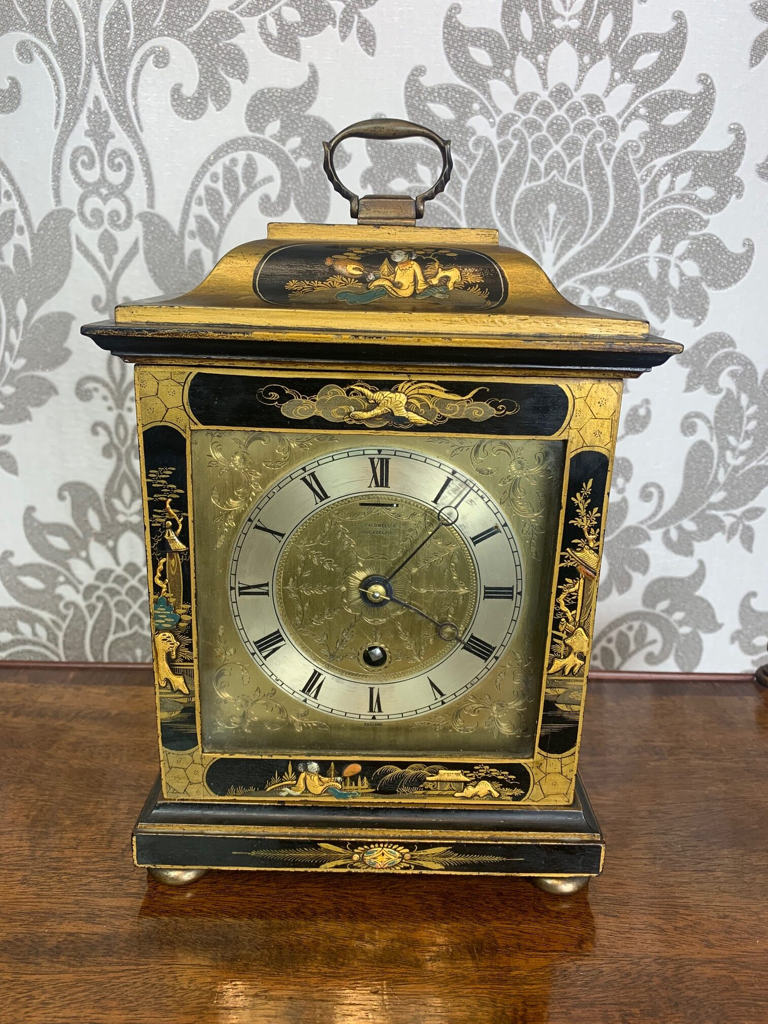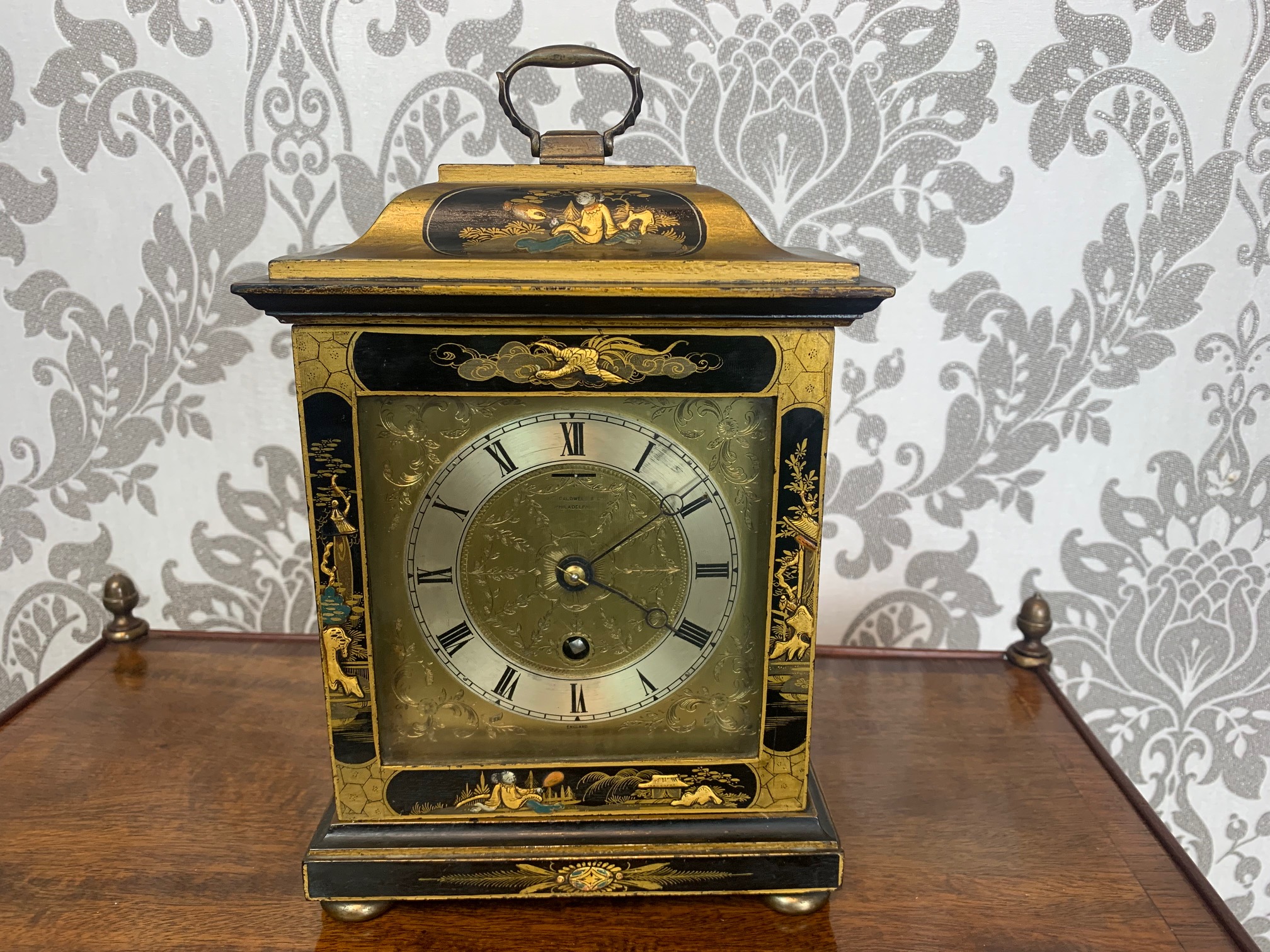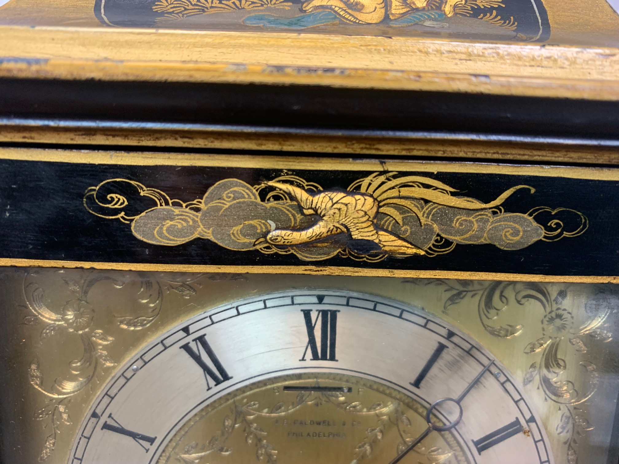 CompareA lovely Edwardian Period chinoiserie carriage clock. The case beautifully decorated with chinoiserie panels and having a brass movement with a finely engraved dial, bearing the retailers name of Caldwell & Co, Philadelphia. In lovely original condition and full working order. Circa 1900-1910