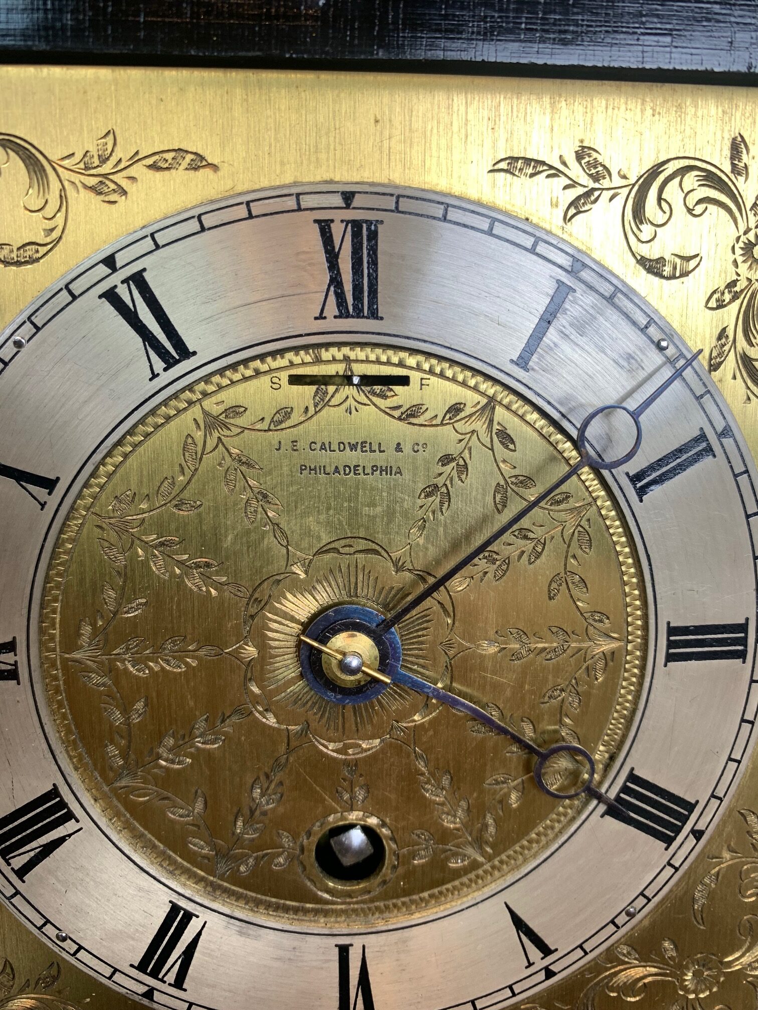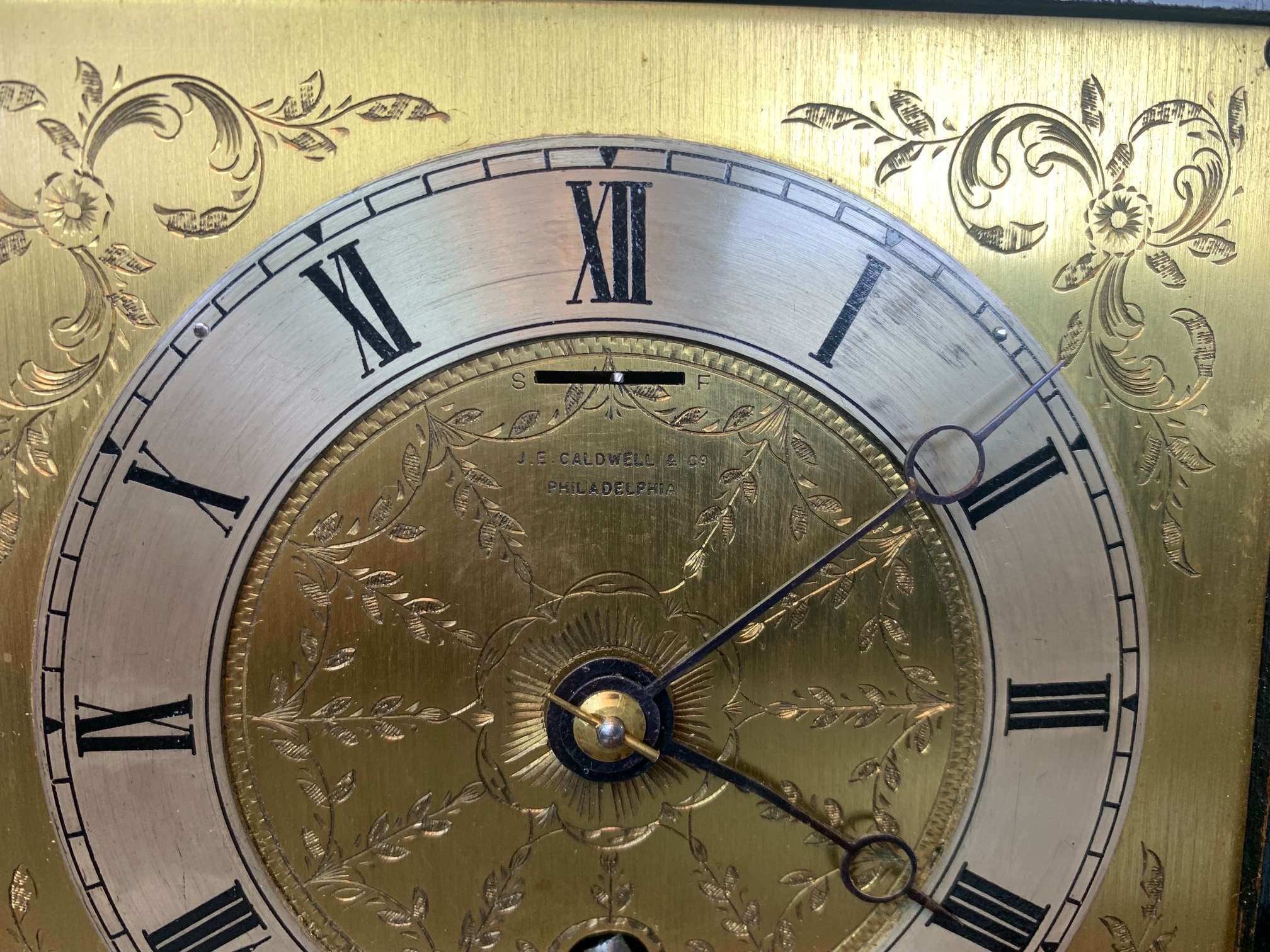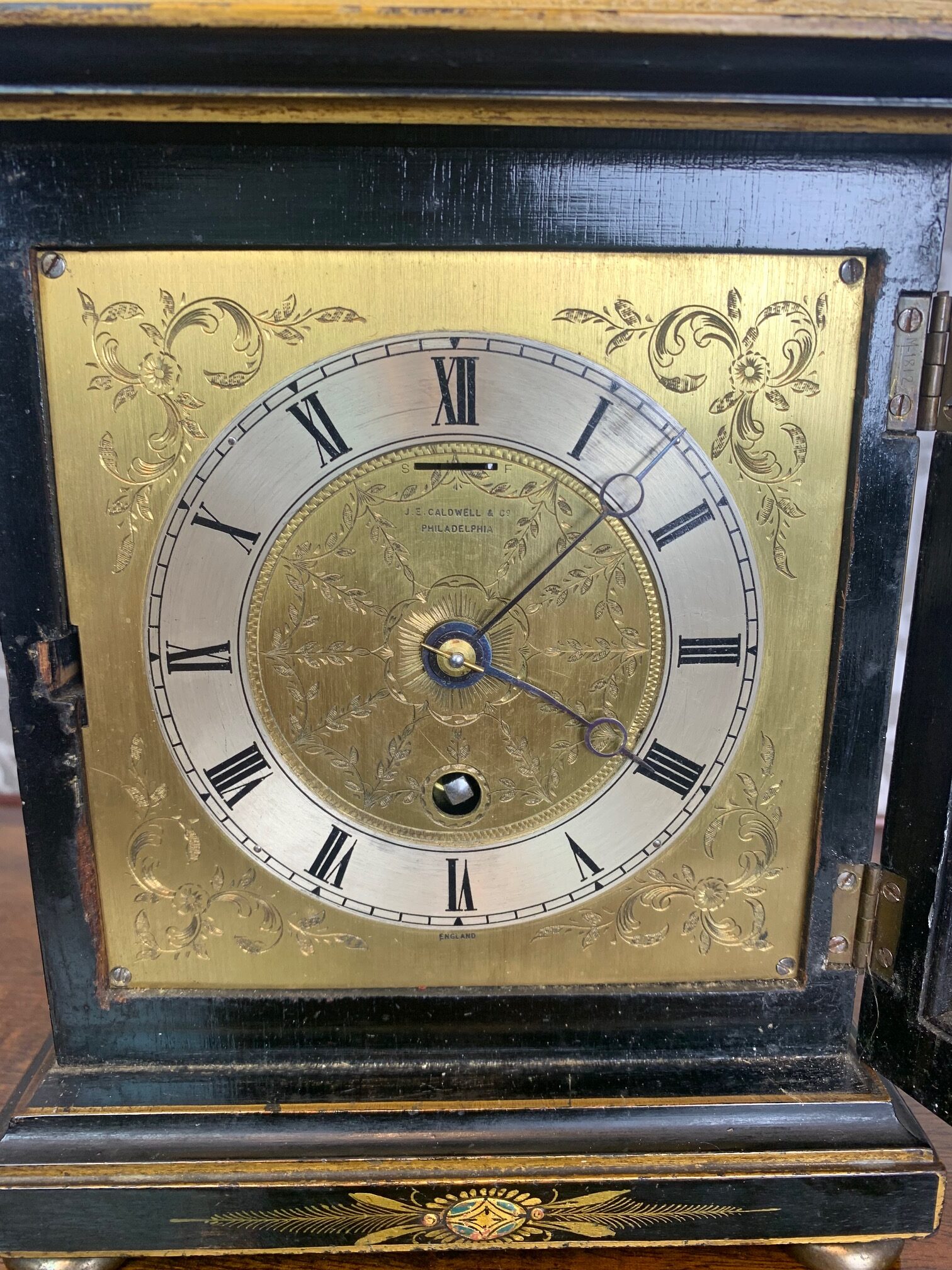 CompareA lovely Edwardian Period chinoiserie carriage clock. The case beautifully decorated with chinoiserie panels and having a brass movement with a finely engraved dial, bearing the retailers name of Caldwell & Co, Philadelphia. In lovely original condition and full working order. Circa 1900-1910