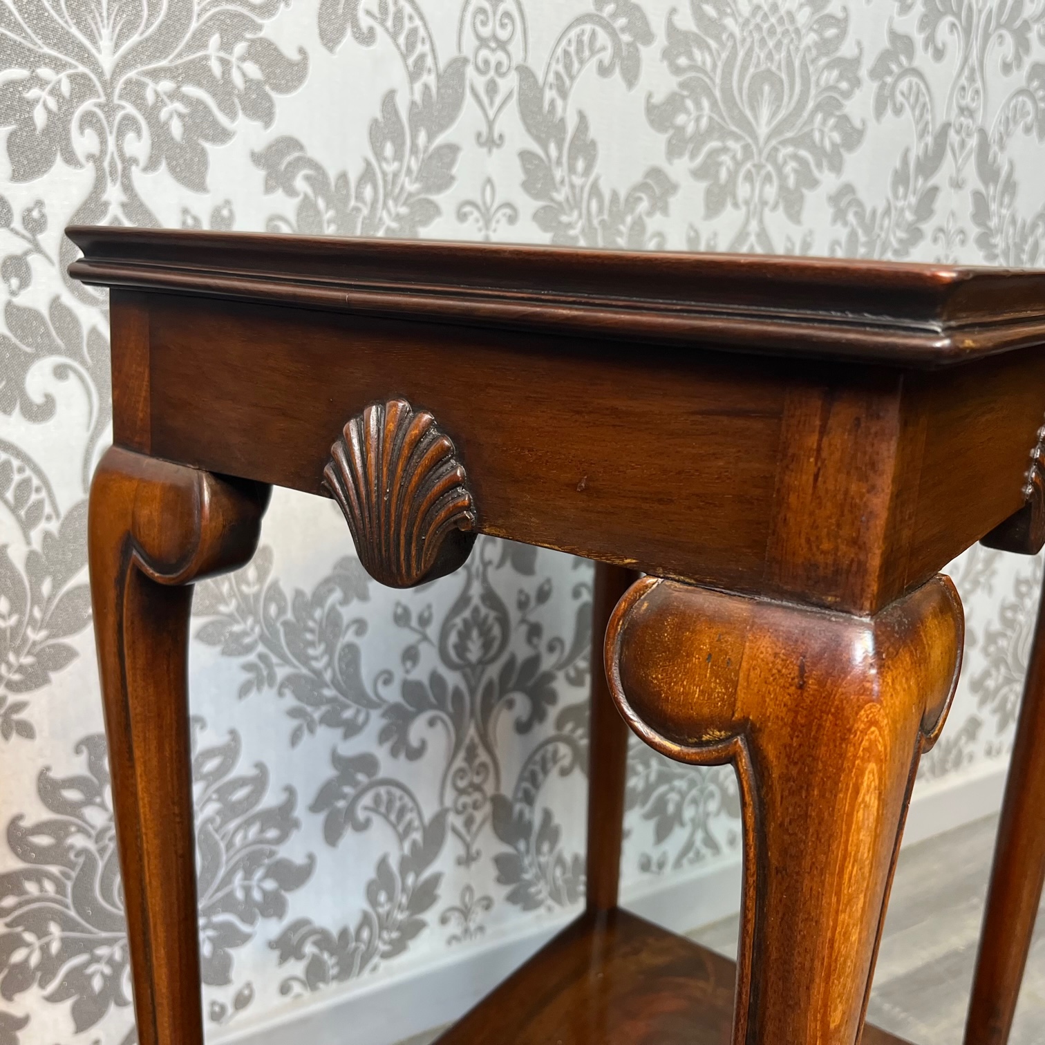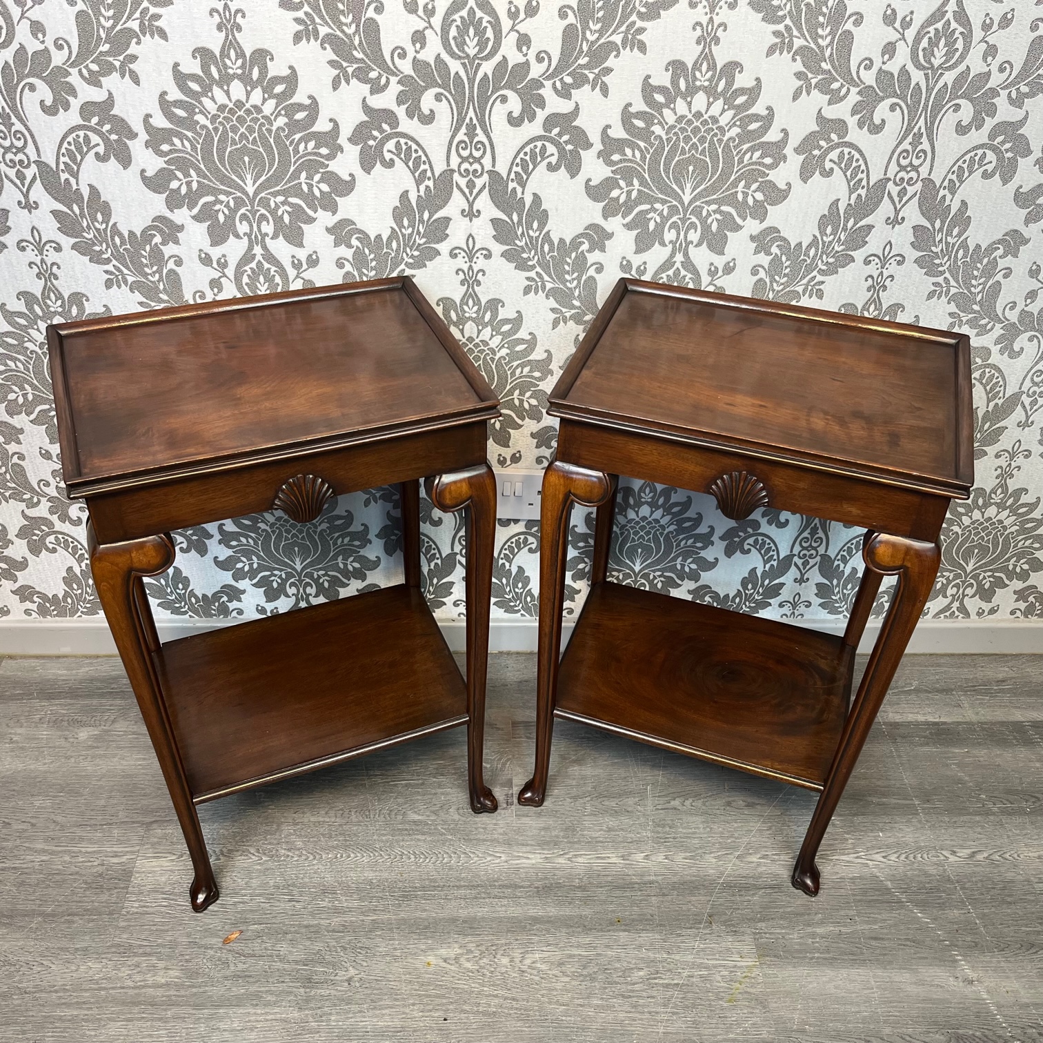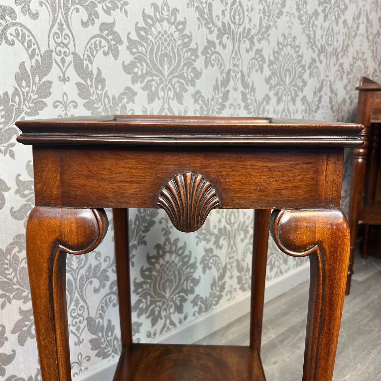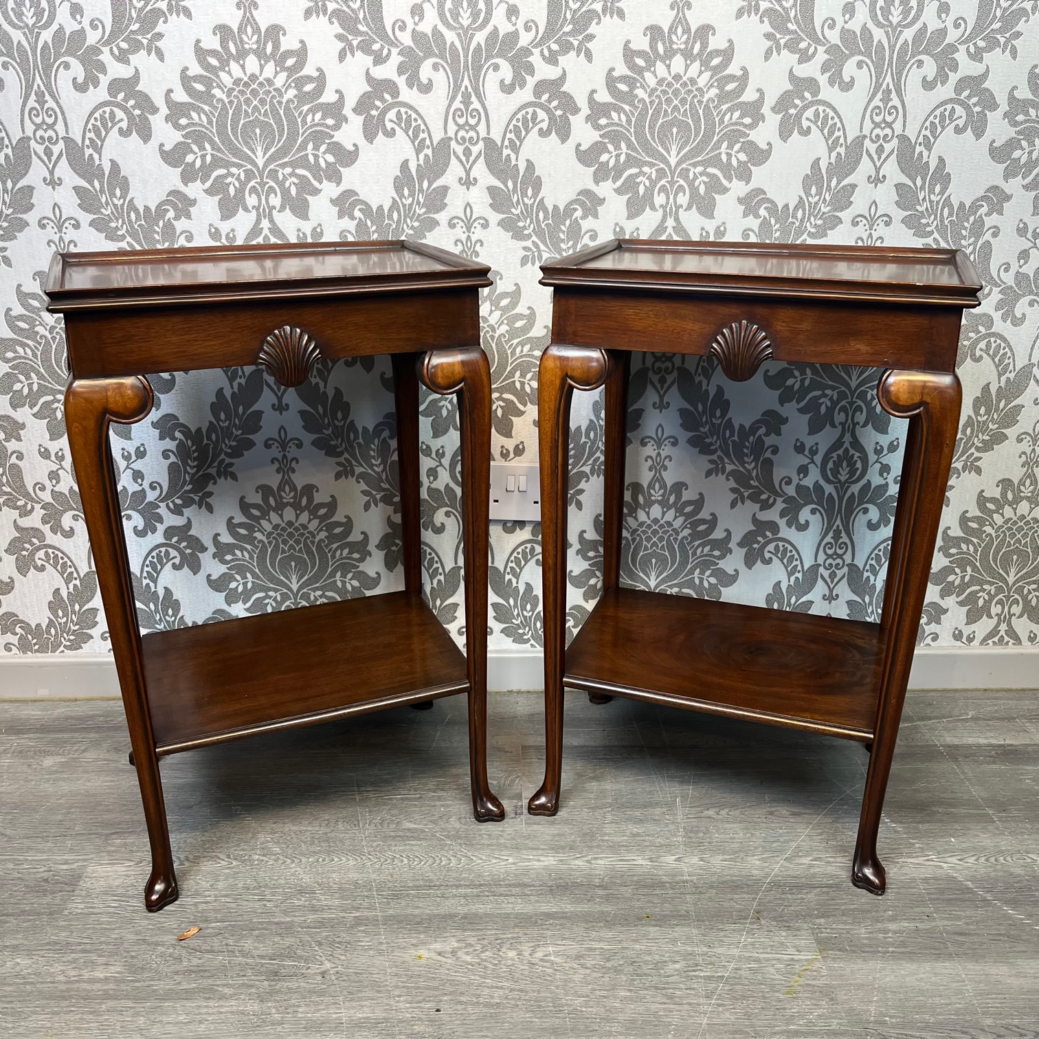 CompareA lovely pair of George I Style mahogany lamp/wine tables. Each constructed in quality mahogany, the rectangular tops with raised galleries raised on elegant shaped cabriole supports with pad feet. The front and reverse of the tables having a classical Georgian style carved shell cartouche. English circa 1920 in superb original condition