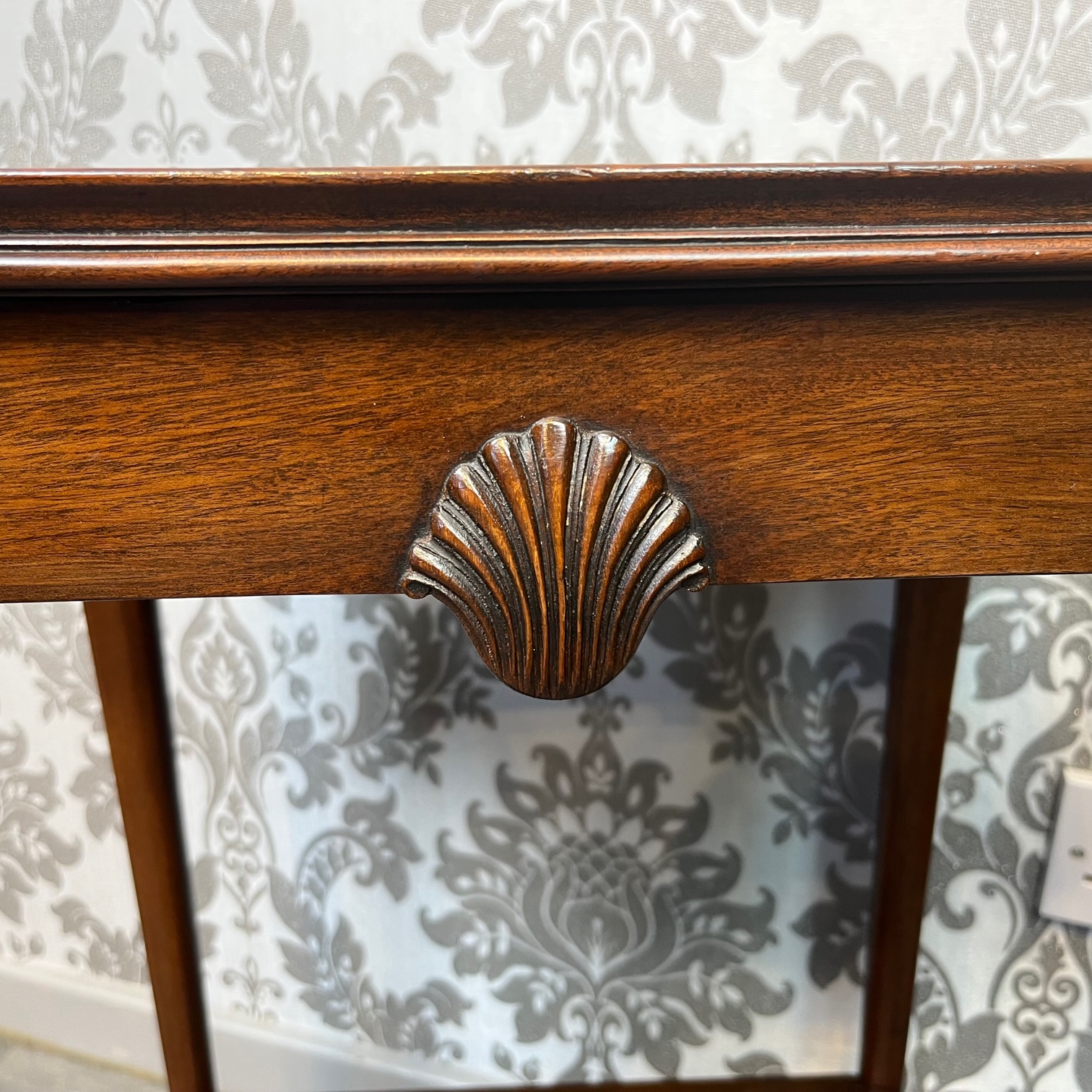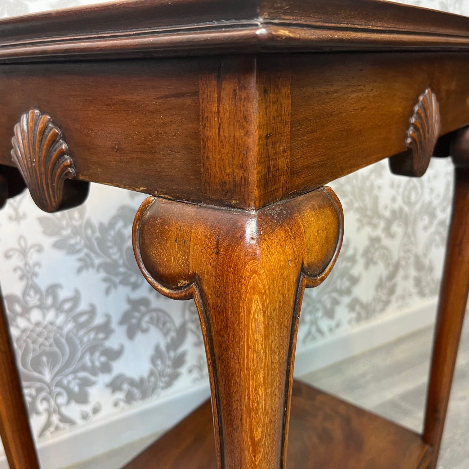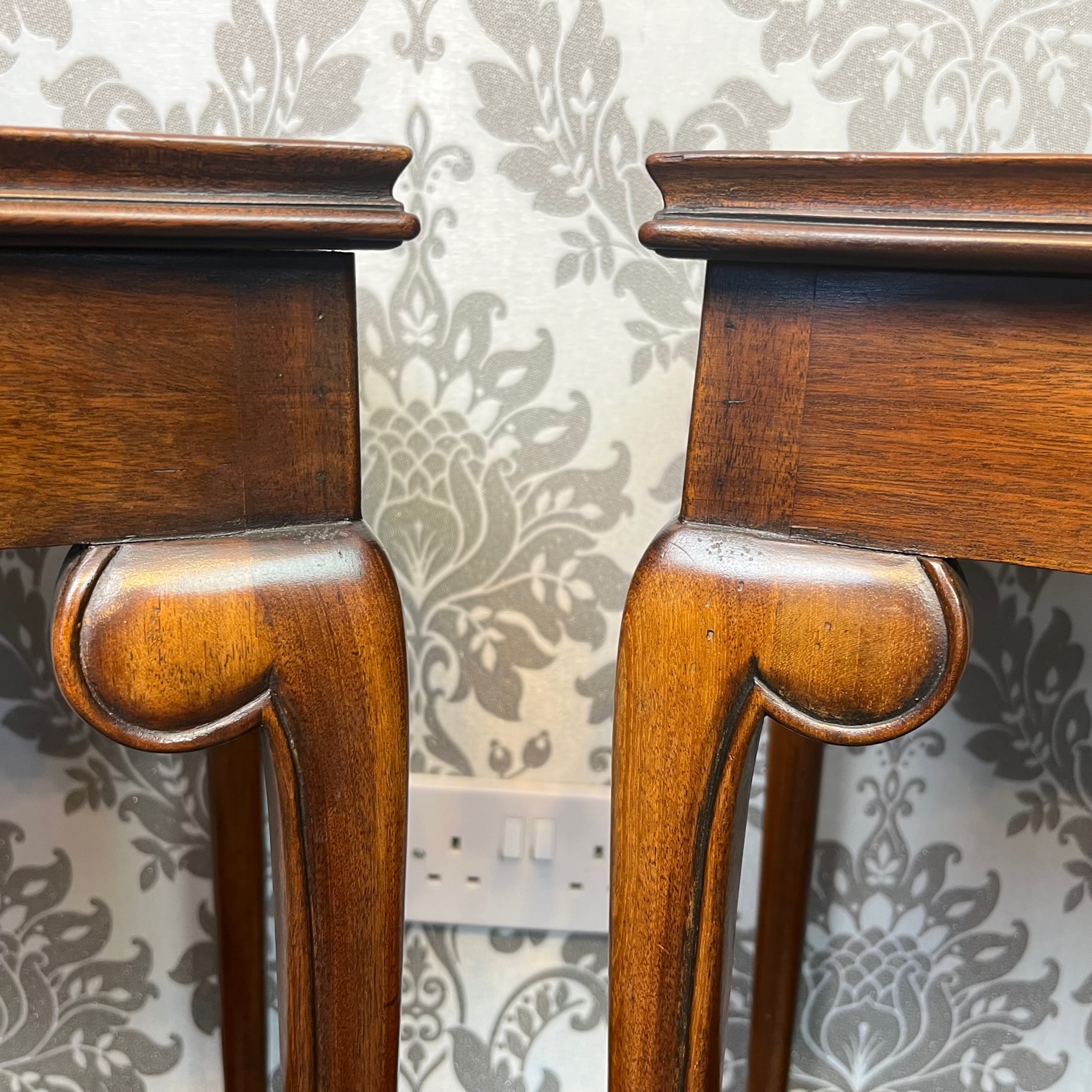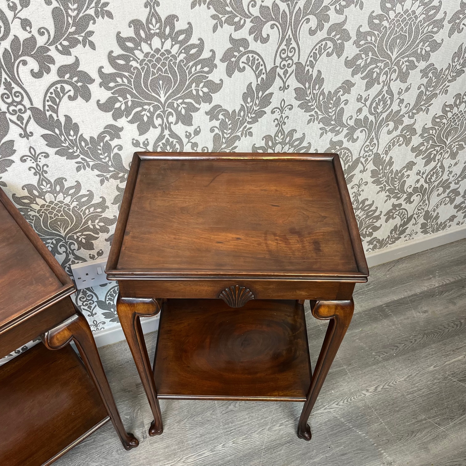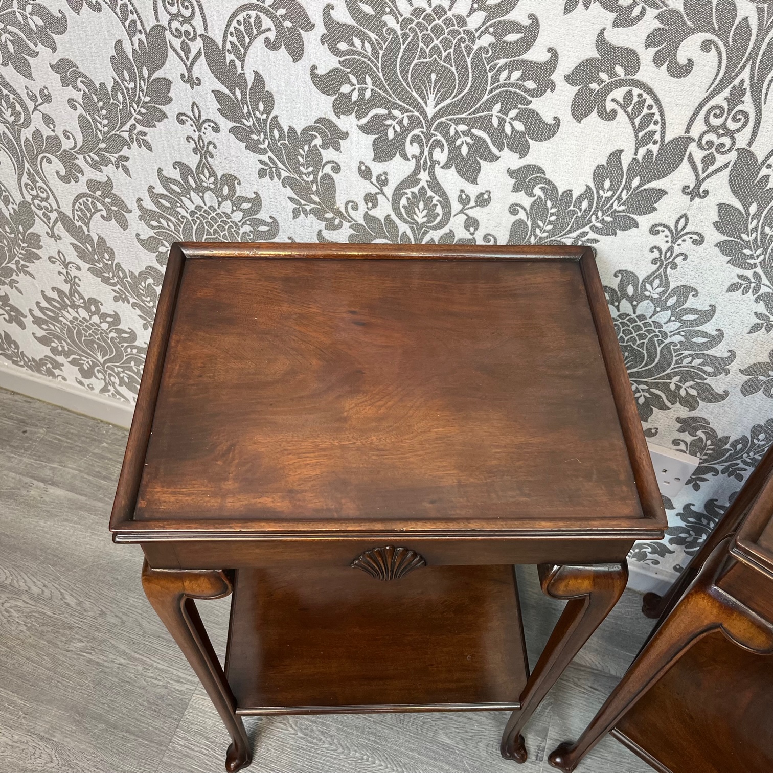 CompareA lovely pair of George I Style mahogany lamp/wine tables. Each constructed in quality mahogany, the rectangular tops with raised galleries raised on elegant shaped cabriole supports with pad feet. The front and reverse of the tables having a classical Georgian style carved shell cartouche. English circa 1920 in superb original condition