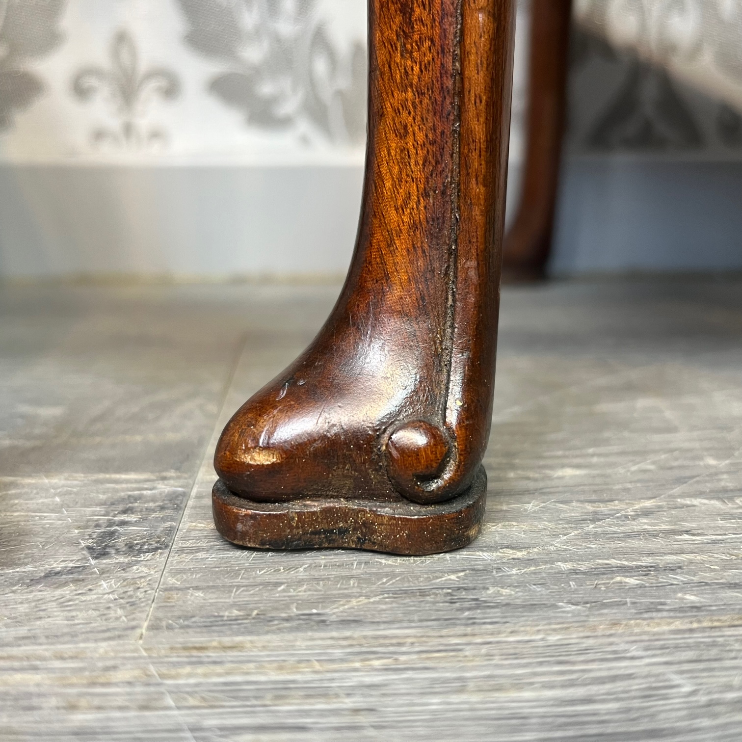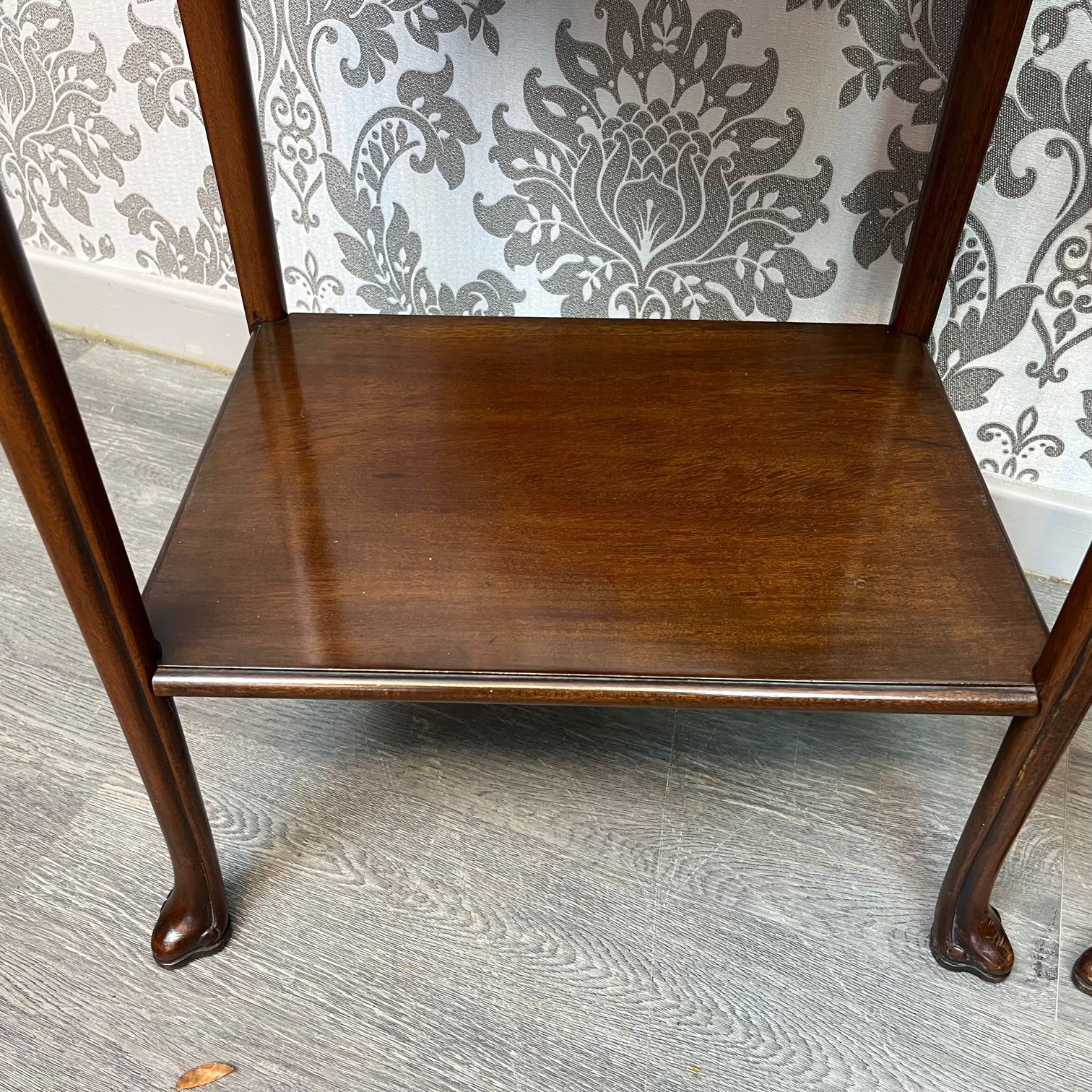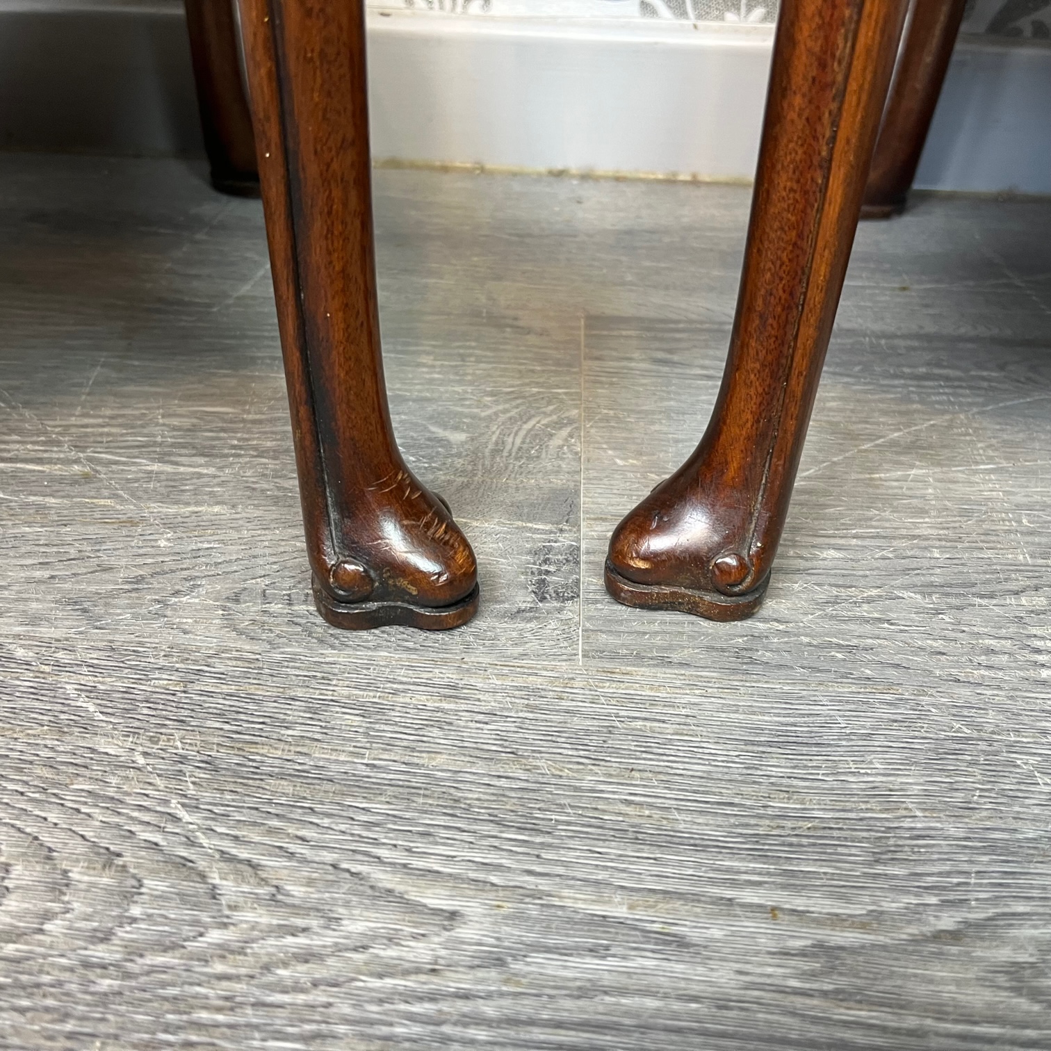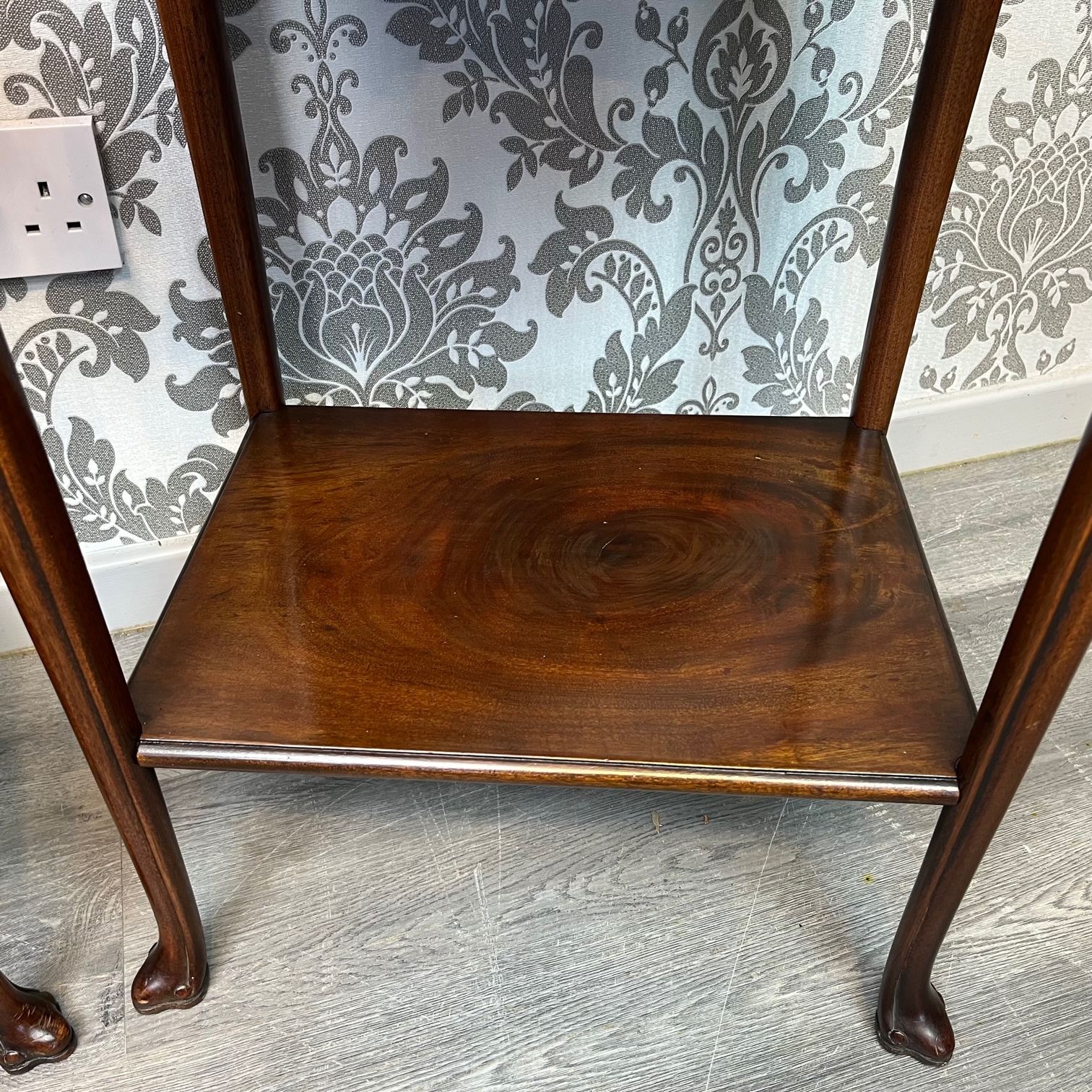CompareA lovely pair of George I Style mahogany lamp/wine tables. Each constructed in quality mahogany, the rectangular tops with raised galleries raised on elegant shaped cabriole supports with pad feet. The front and reverse of the tables having a classical Georgian style carved shell cartouche. English circa 1920 in superb original condition