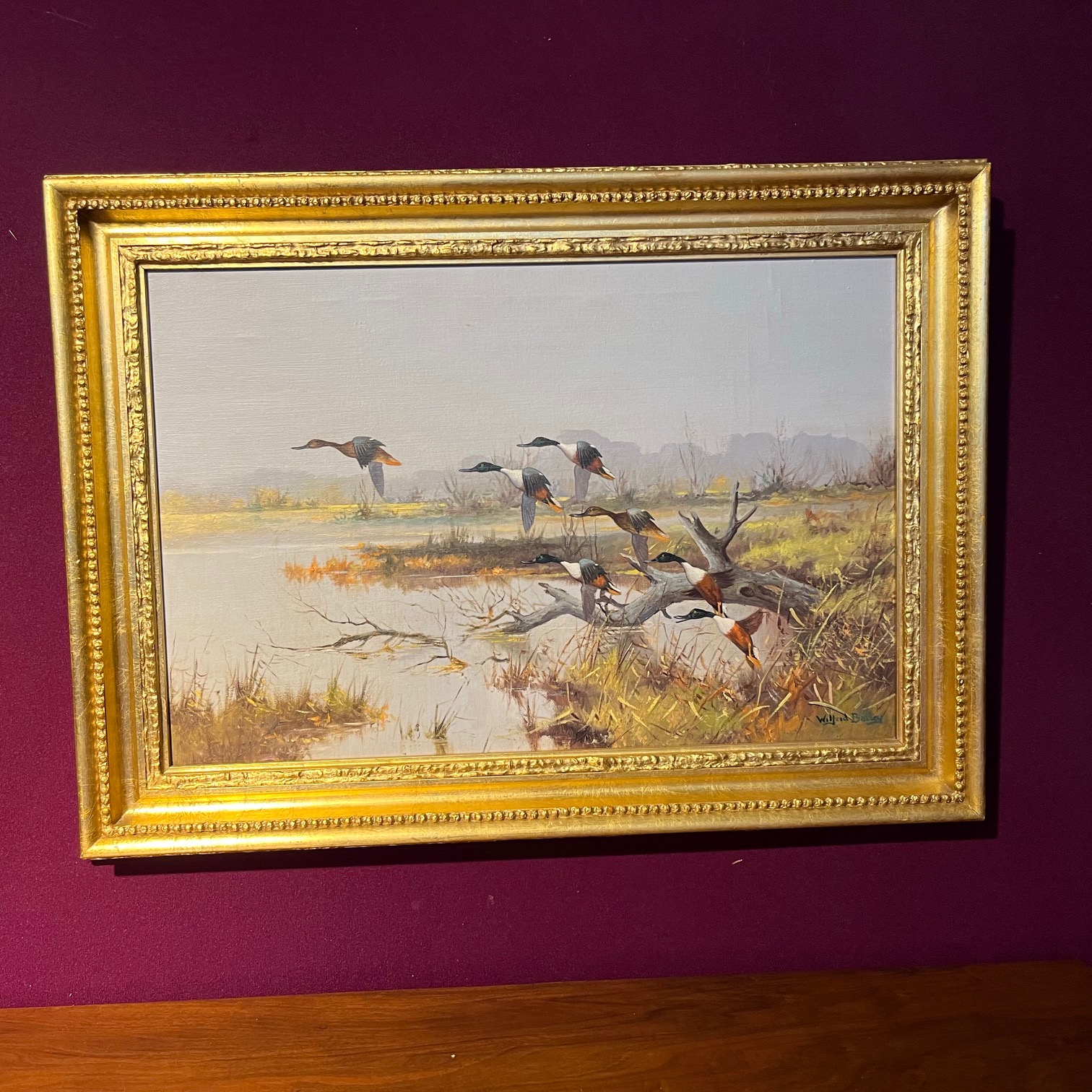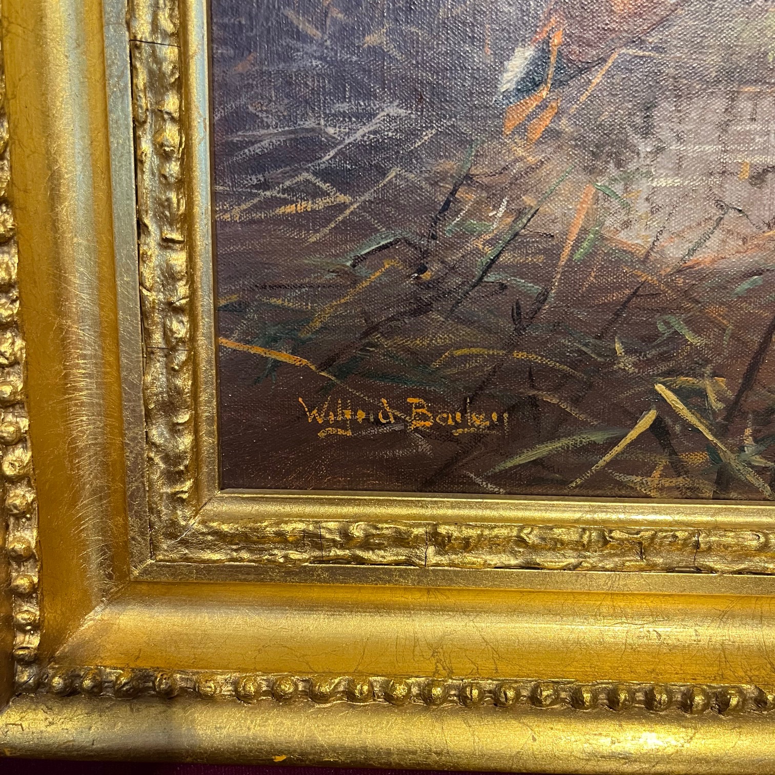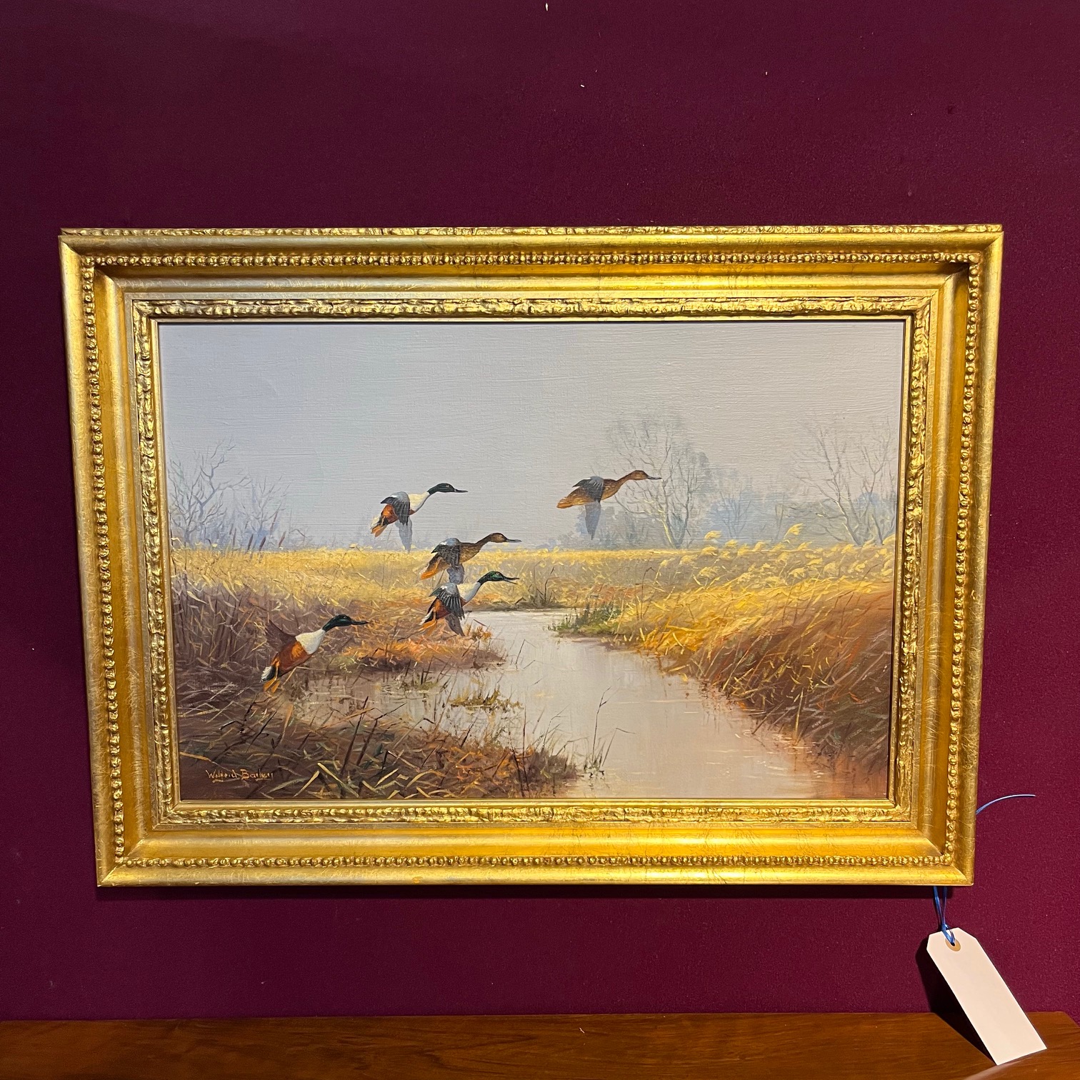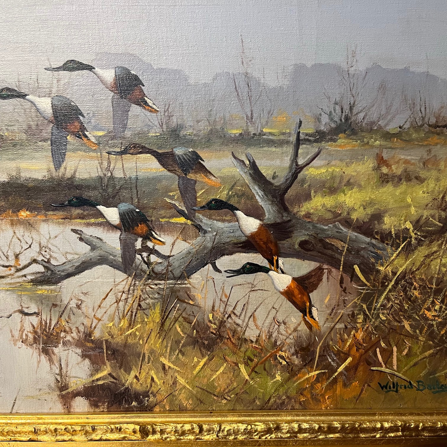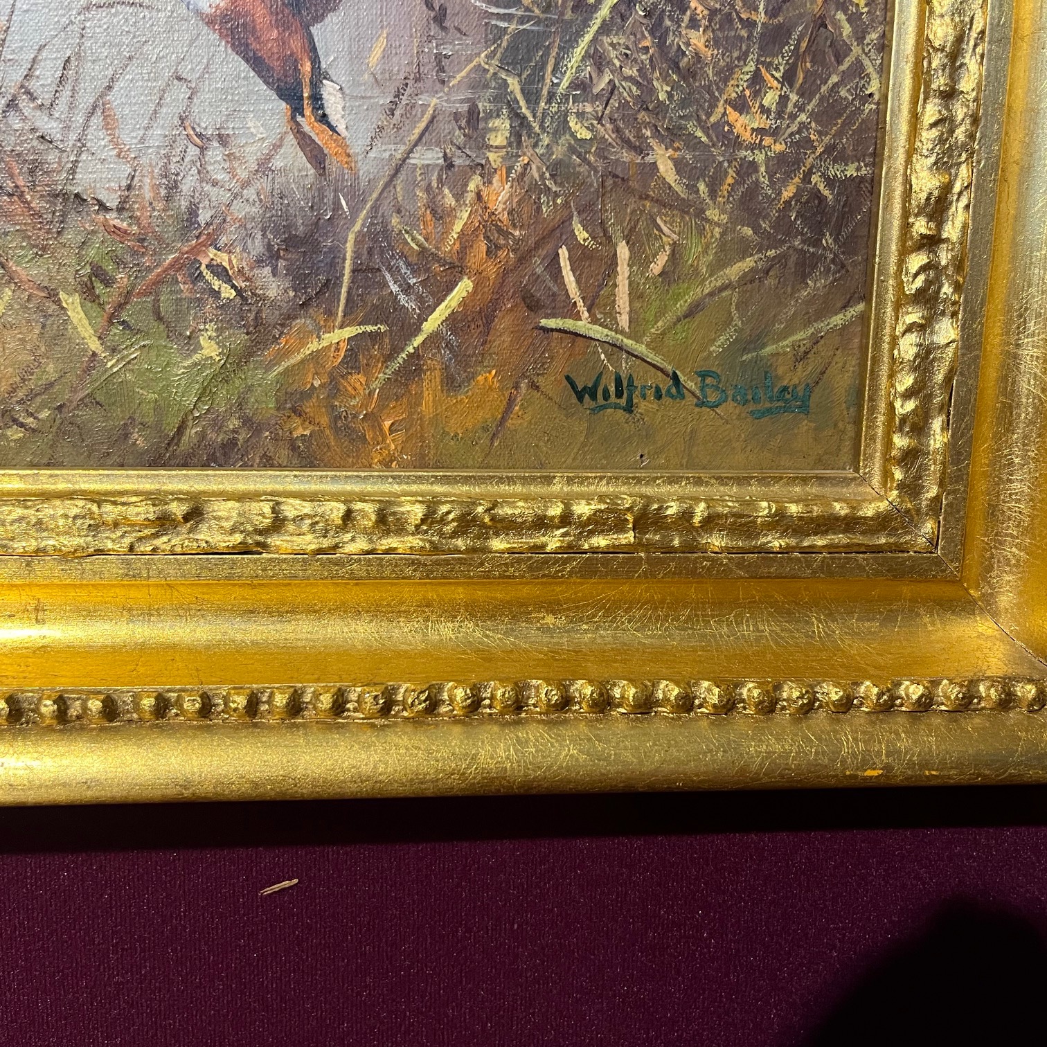 CompareA lovely pair of Oil paintings by Wilfred Bailey (fl 1942-1954) depicting ducks in flight over a stream, both signed and housed in the original carved gilt wood frames. English 1940-1950