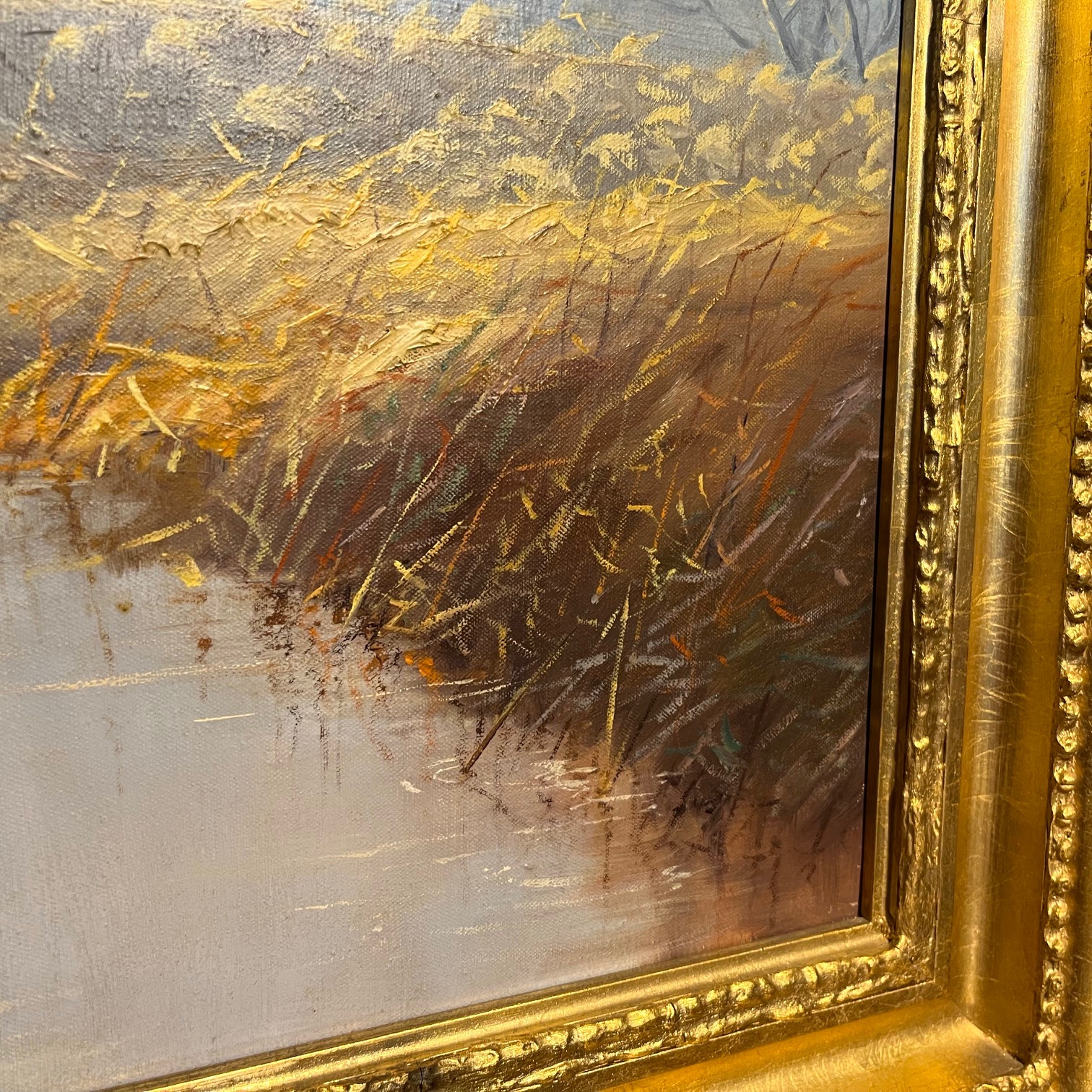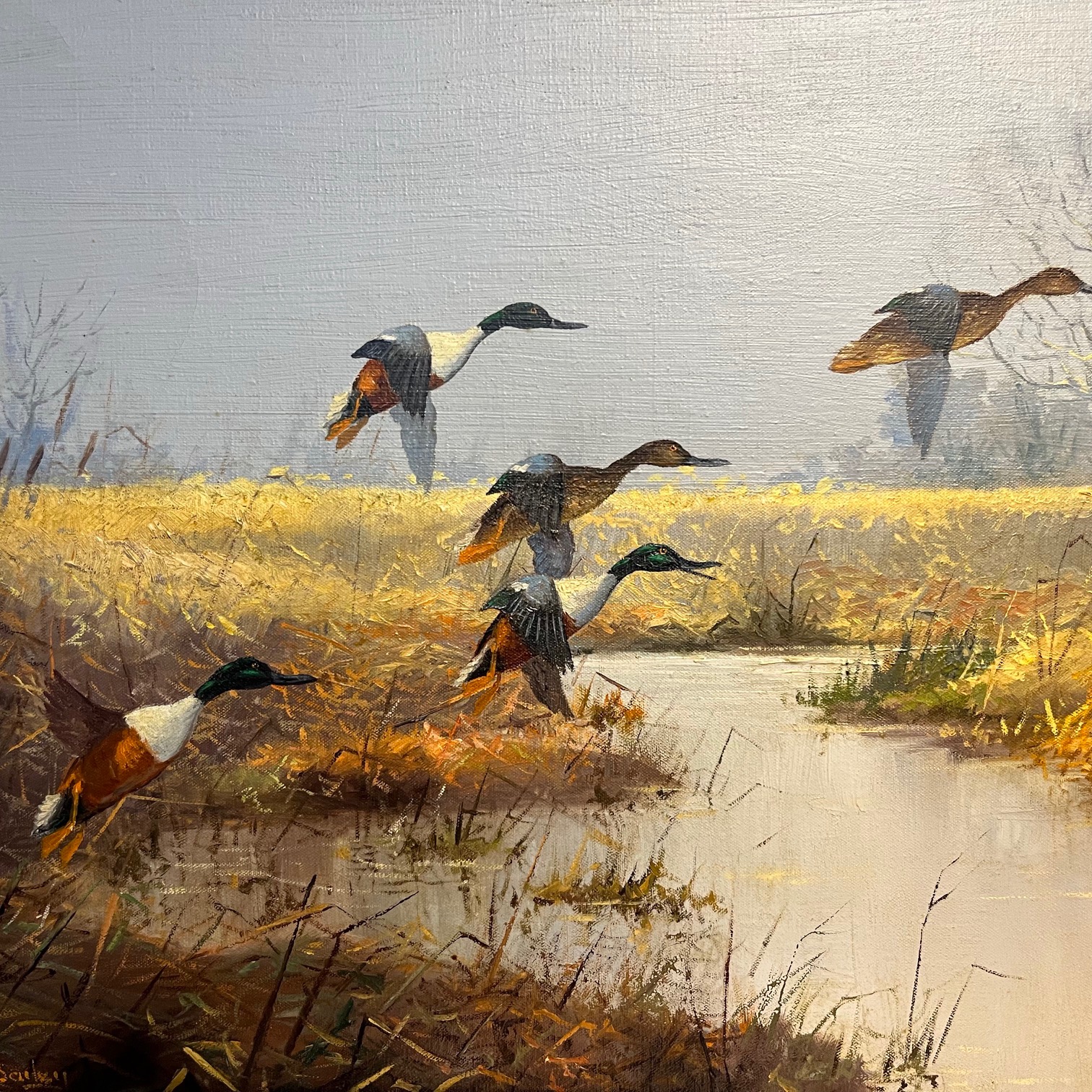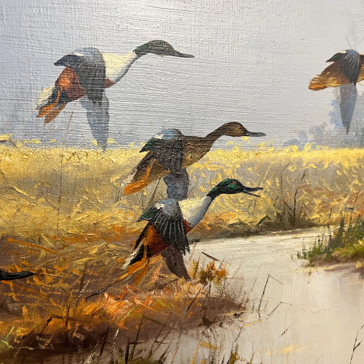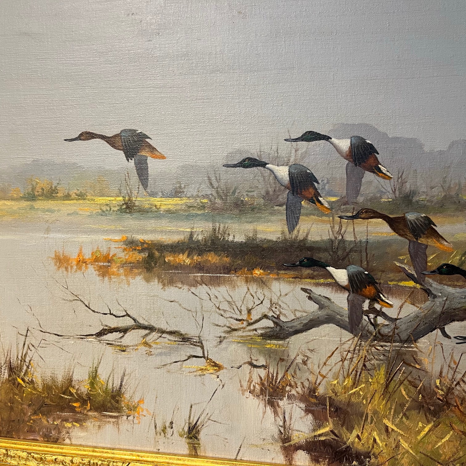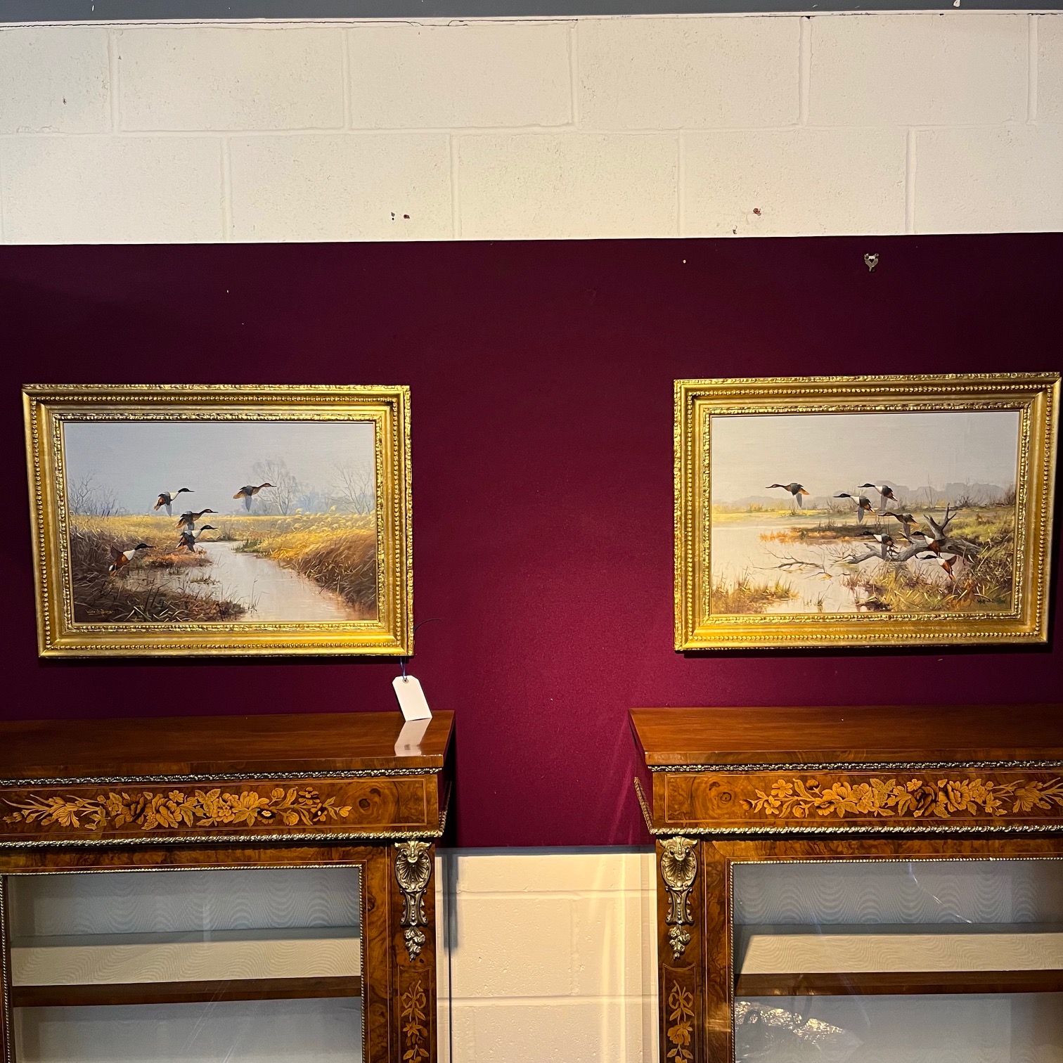 CompareA lovely pair of Oil paintings by Wilfred Bailey (fl 1942-1954) depicting ducks in flight over a stream, both signed and housed in the original carved gilt wood frames. English 1940-1950