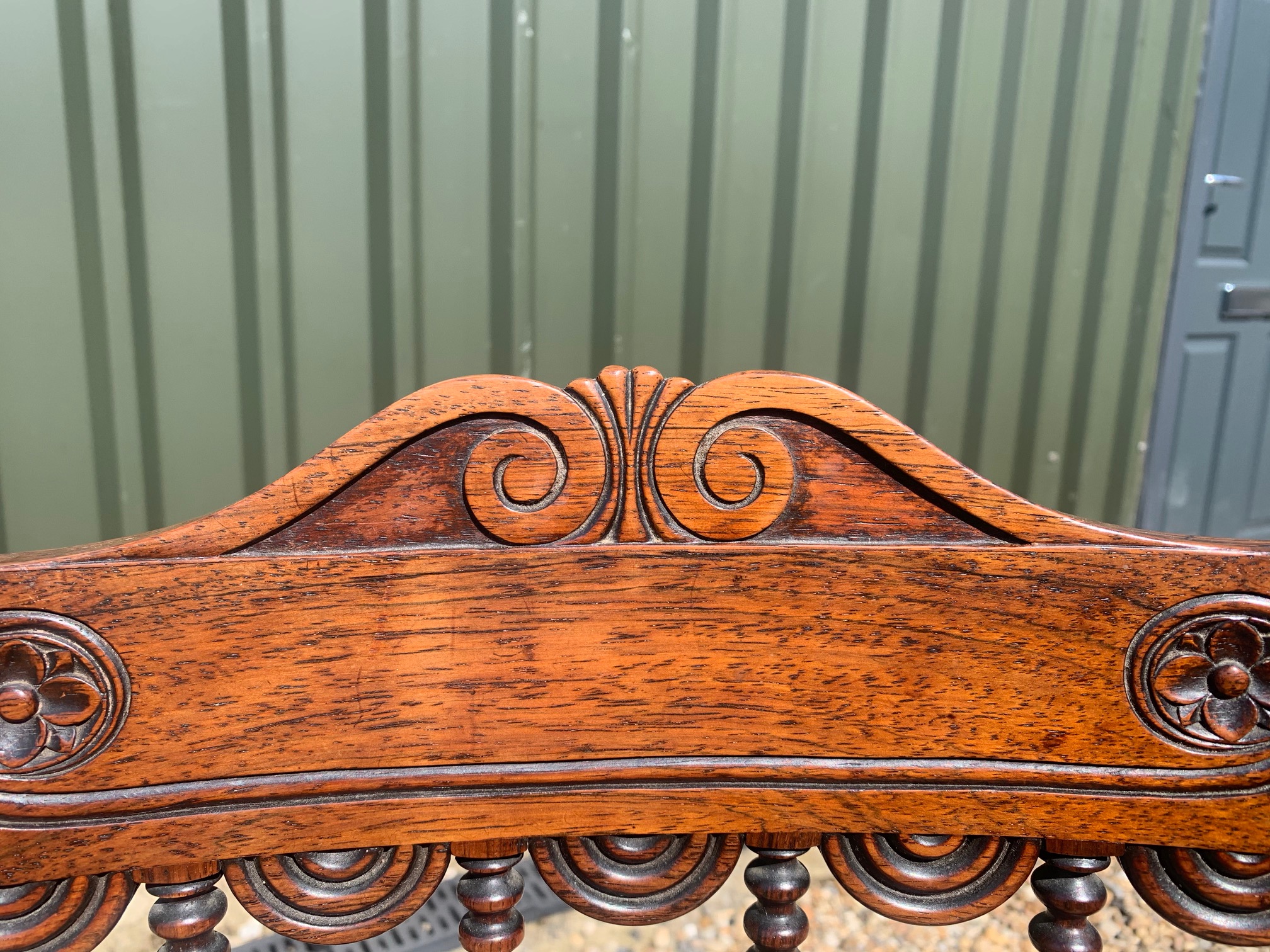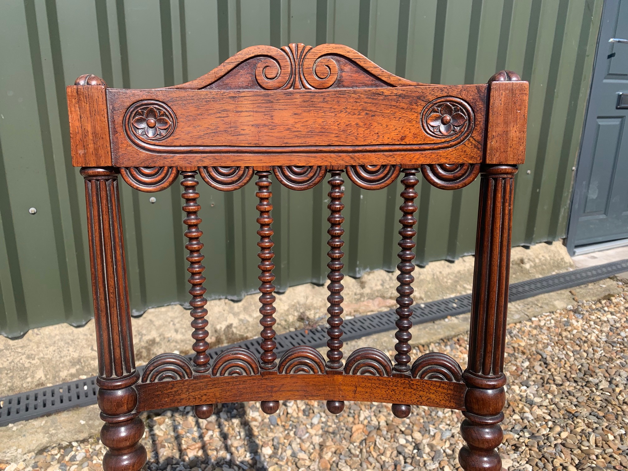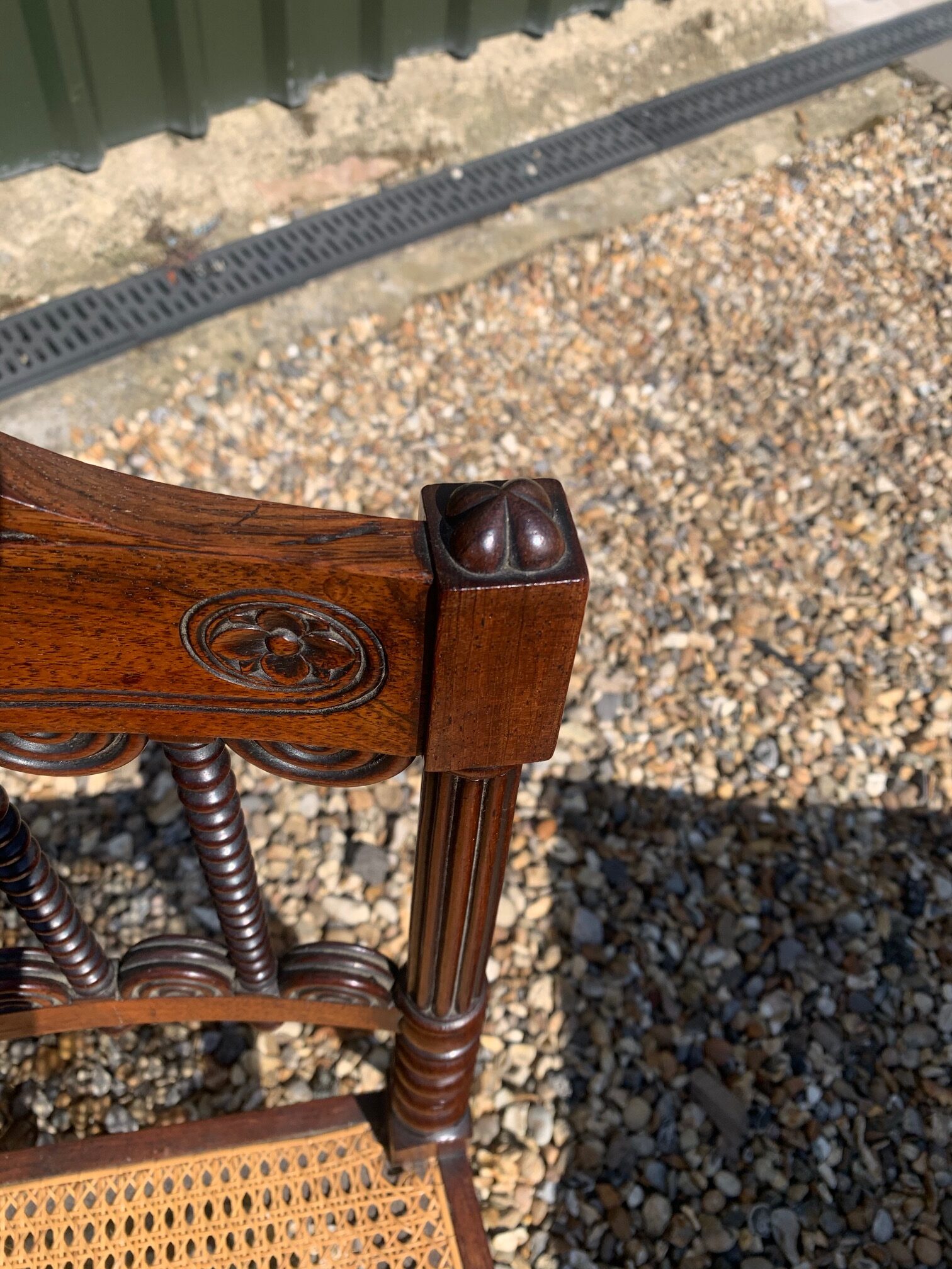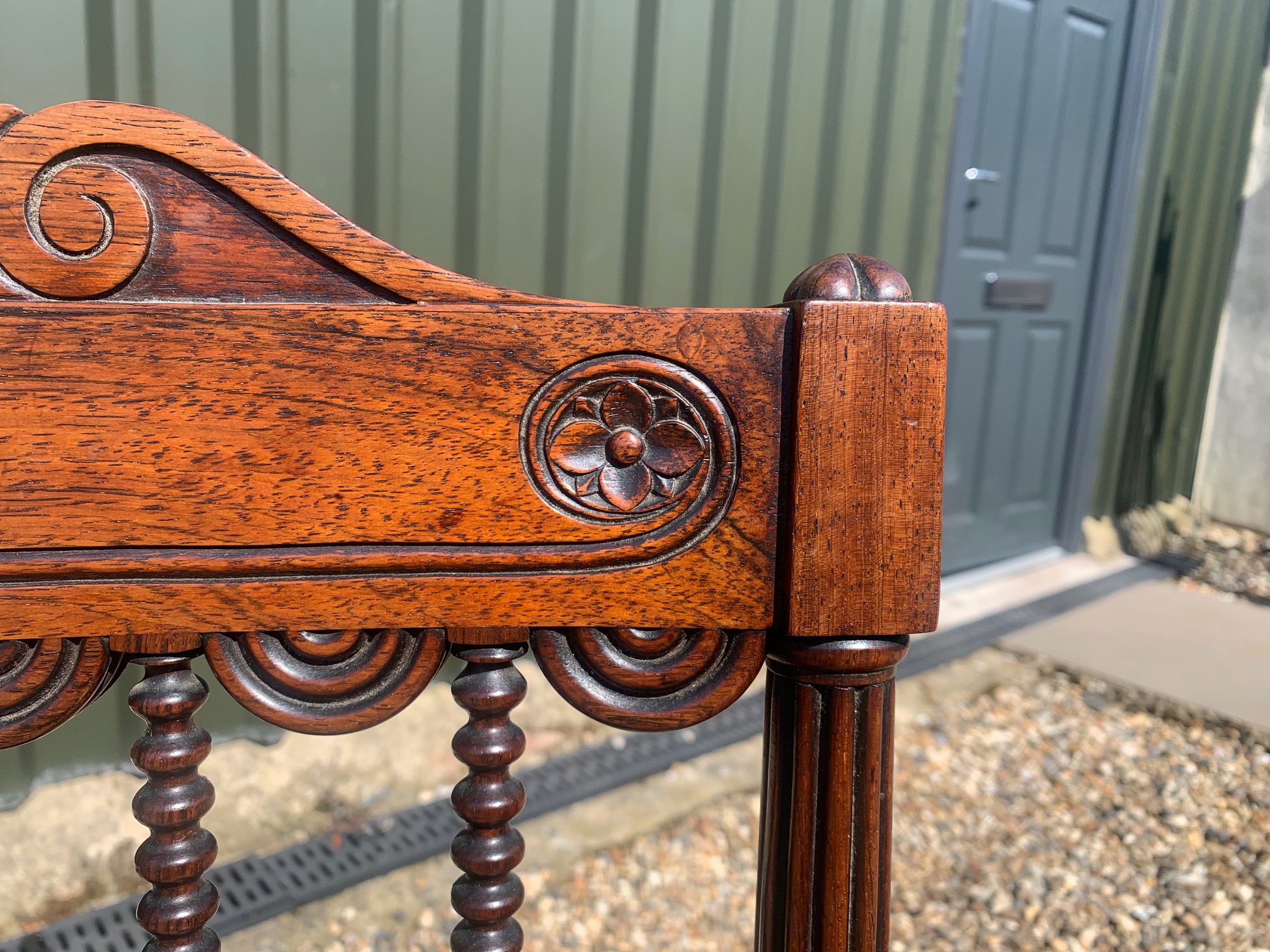 CompareA pair of Regency Period rosewood hall chairs. Each with an intricately carved rosewood back with half roundels, turned spindle supports and reeded columns, above a caned seat with a rosewood frame and turned front and rear supports. Regency circa 1820 very much in the style of George Smith, in lovely un-touched original condition