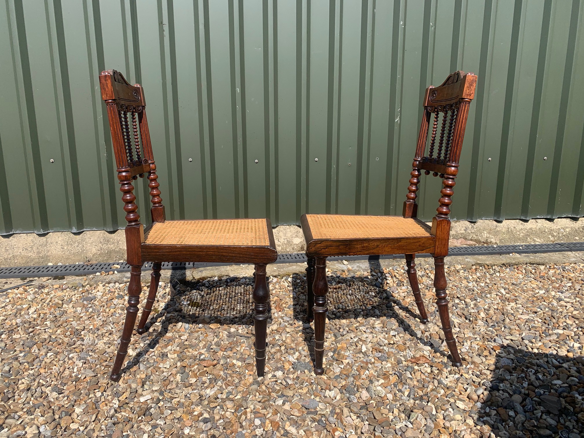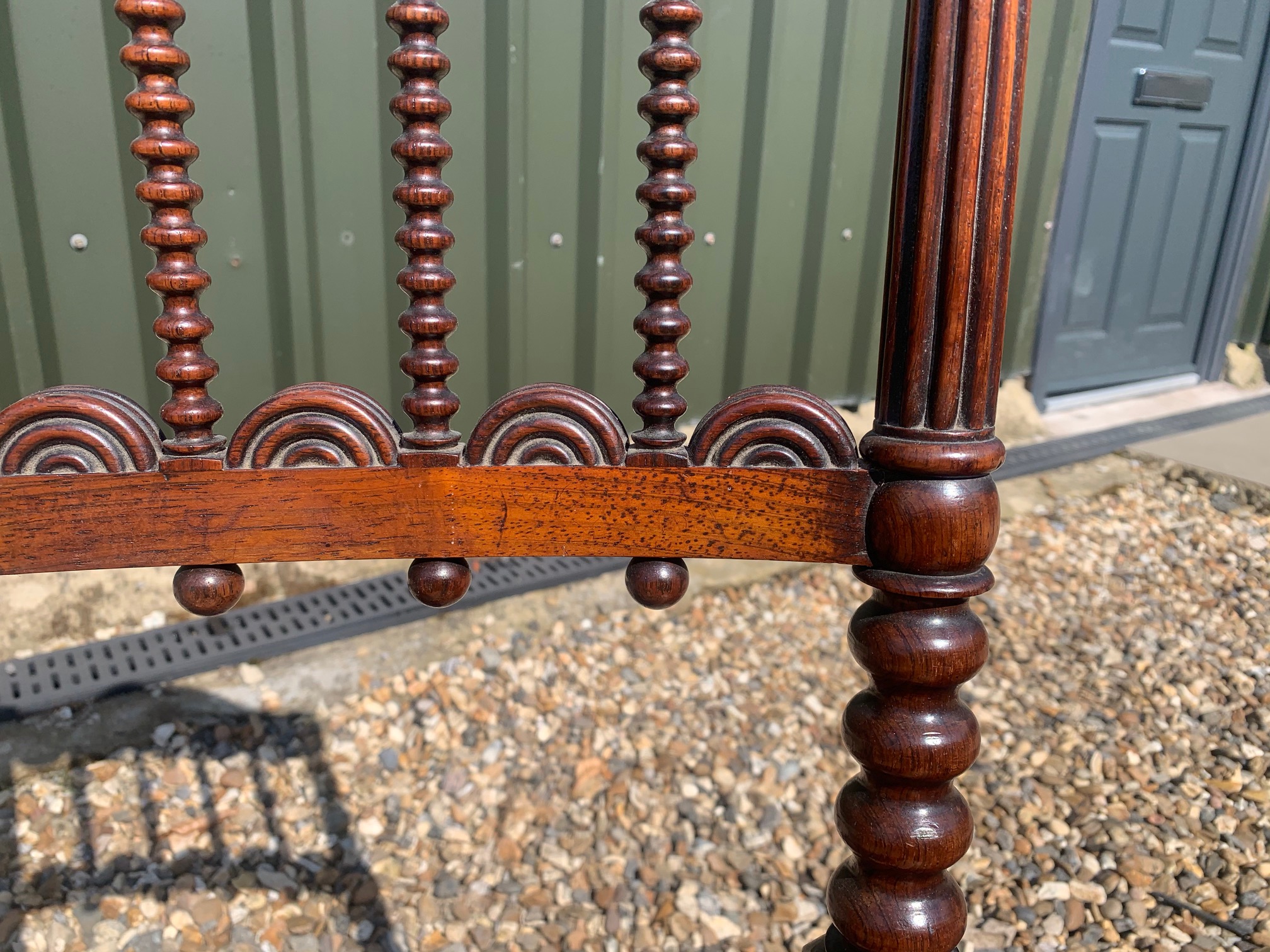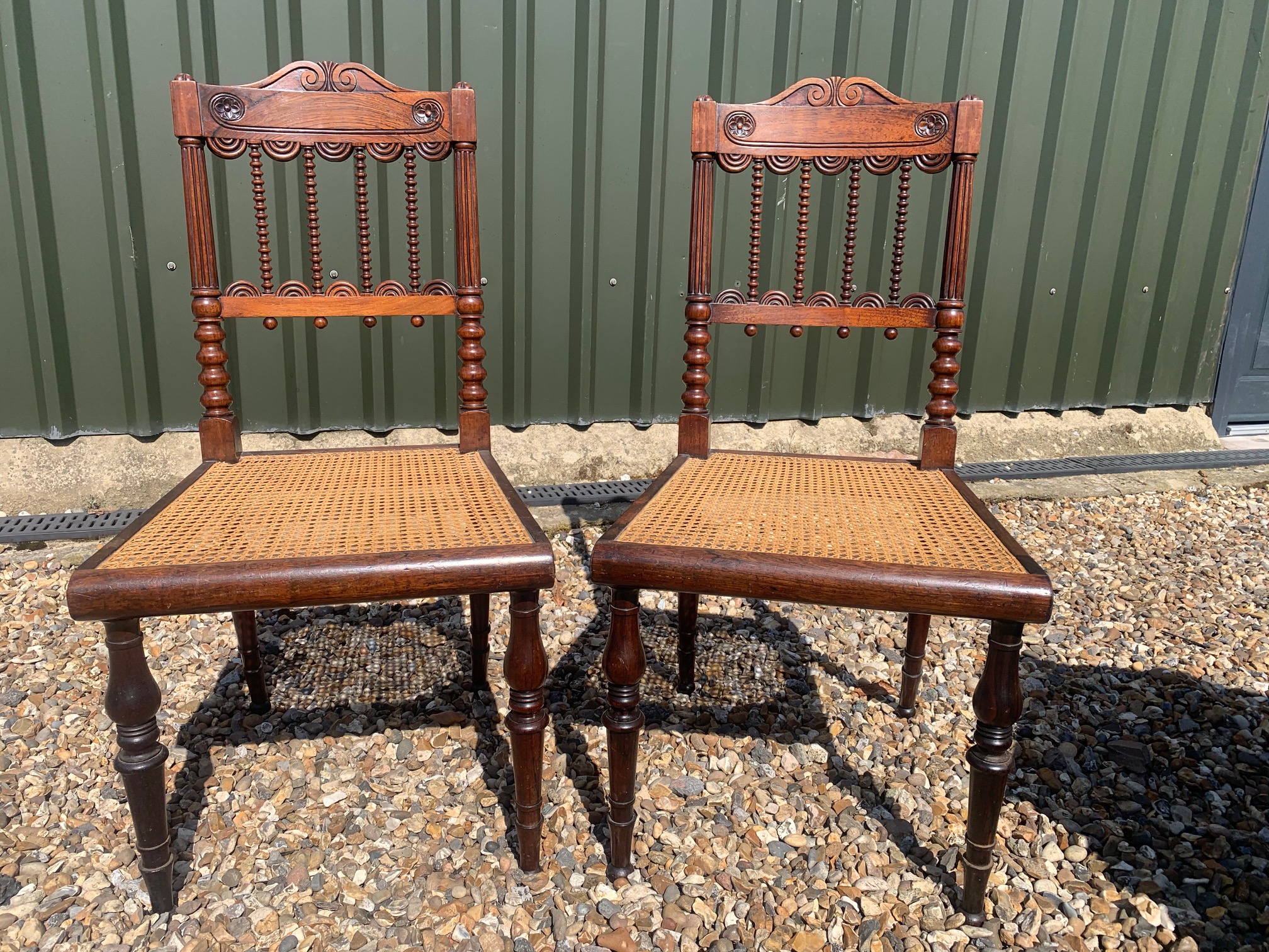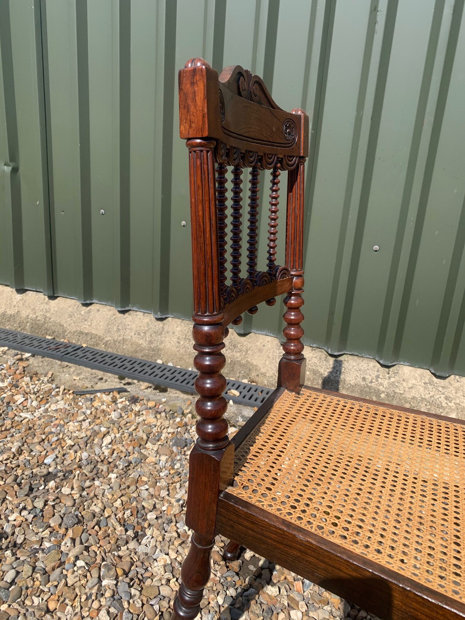 CompareA pair of Regency Period rosewood hall chairs. Each with an intricately carved rosewood back with half roundels, turned spindle supports and reeded columns, above a caned seat with a rosewood frame and turned front and rear supports. Regency circa 1820 very much in the style of George Smith, in lovely un-touched original condition