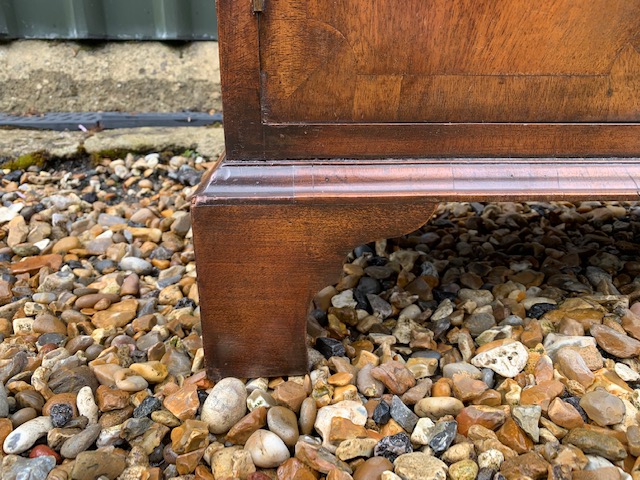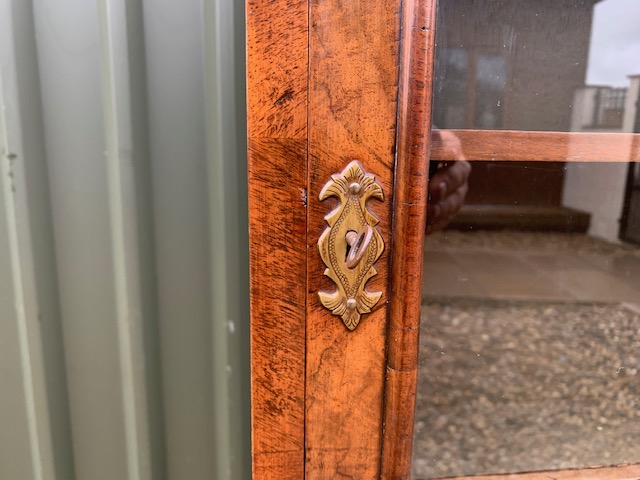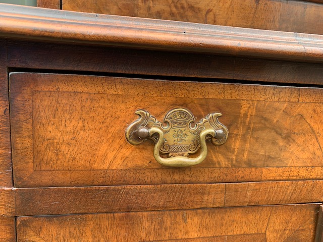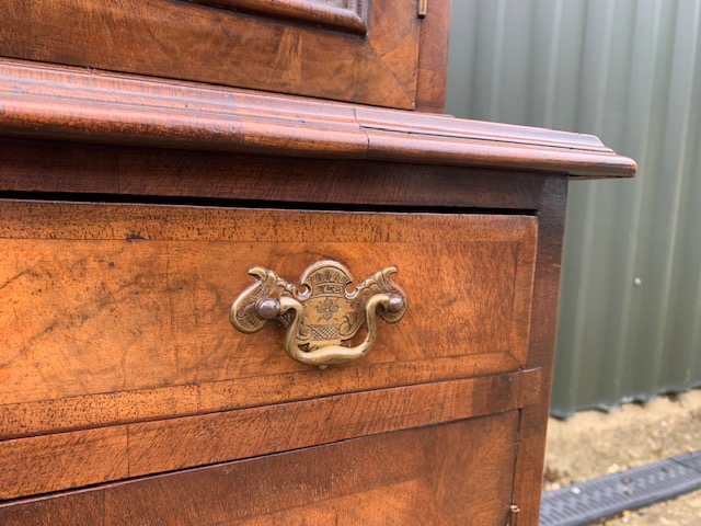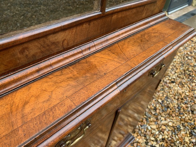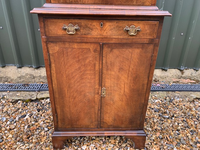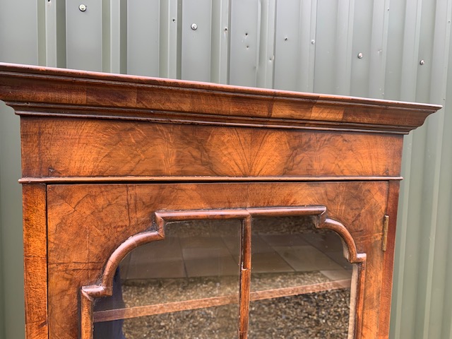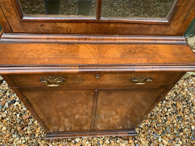 CompareA petite George I Style walnut antique bookcase. The upper glazed section having a block moulded cornice above a figured walnut frieze and door with moulded glazing bars and enclosing three adjustable shelves. The lower section again veneered in beautifully figured walnut and having a rectangular mahogany lined drawer with traditional Period style handles and backplates, above twin rectangular doors opening to reveal a single shelf, the whole raised on bracket feet with solid walnut sides. English circa 1900, in excellent original condition, a wonderful colour and patination, cleaned and waxed