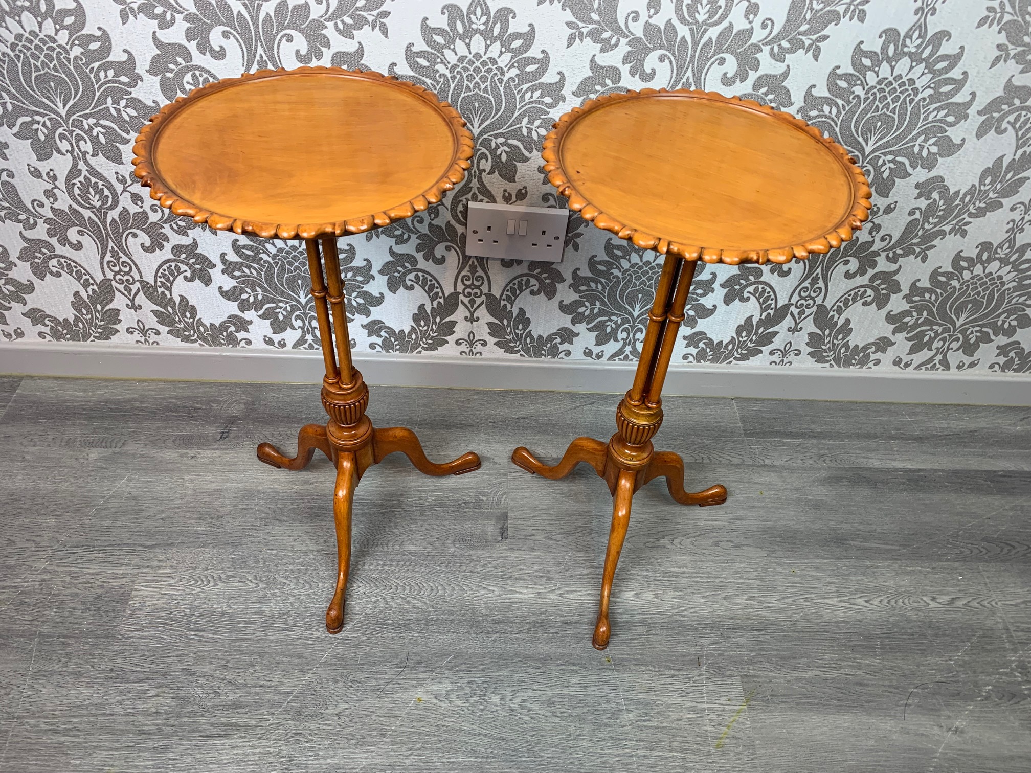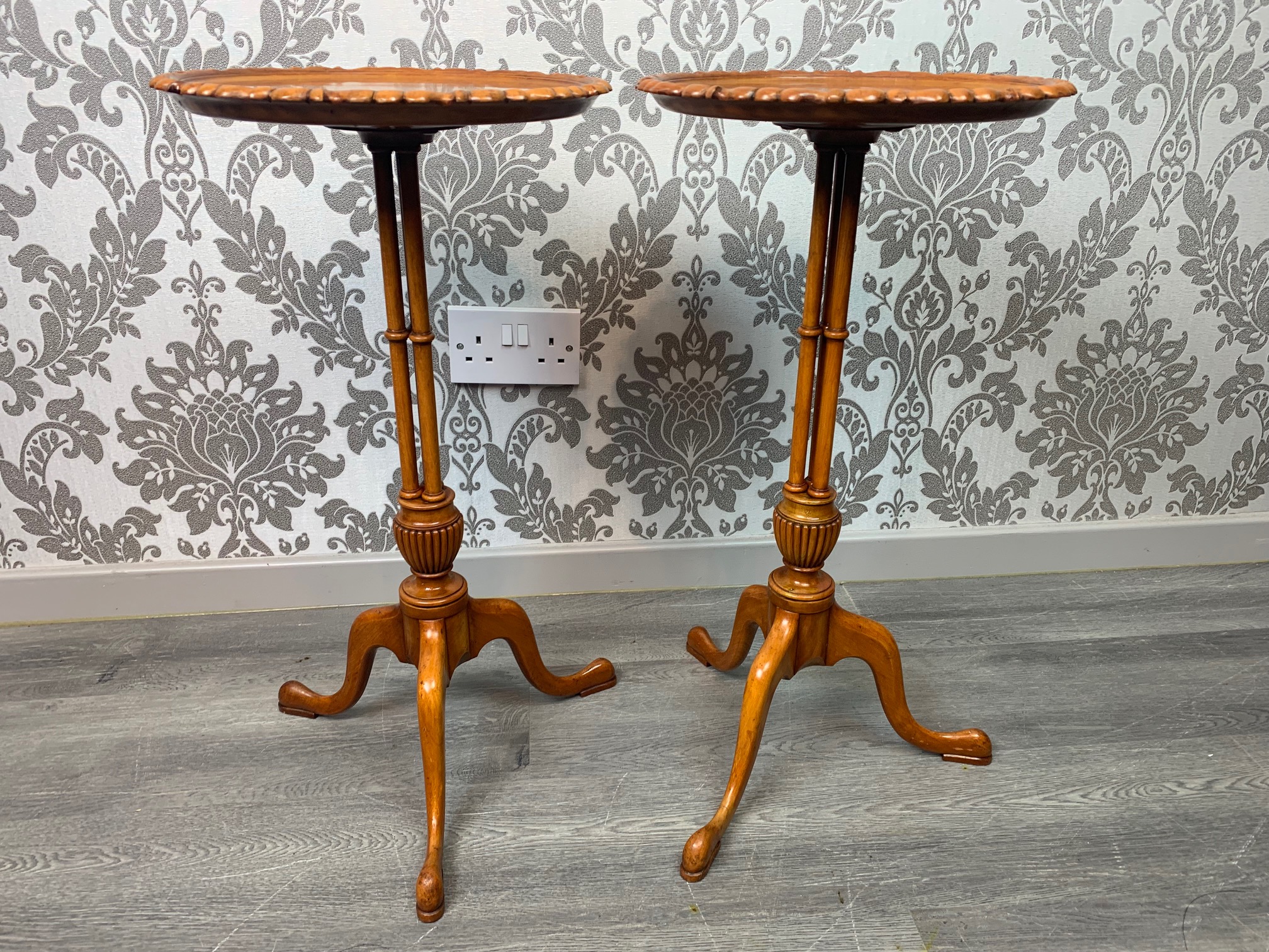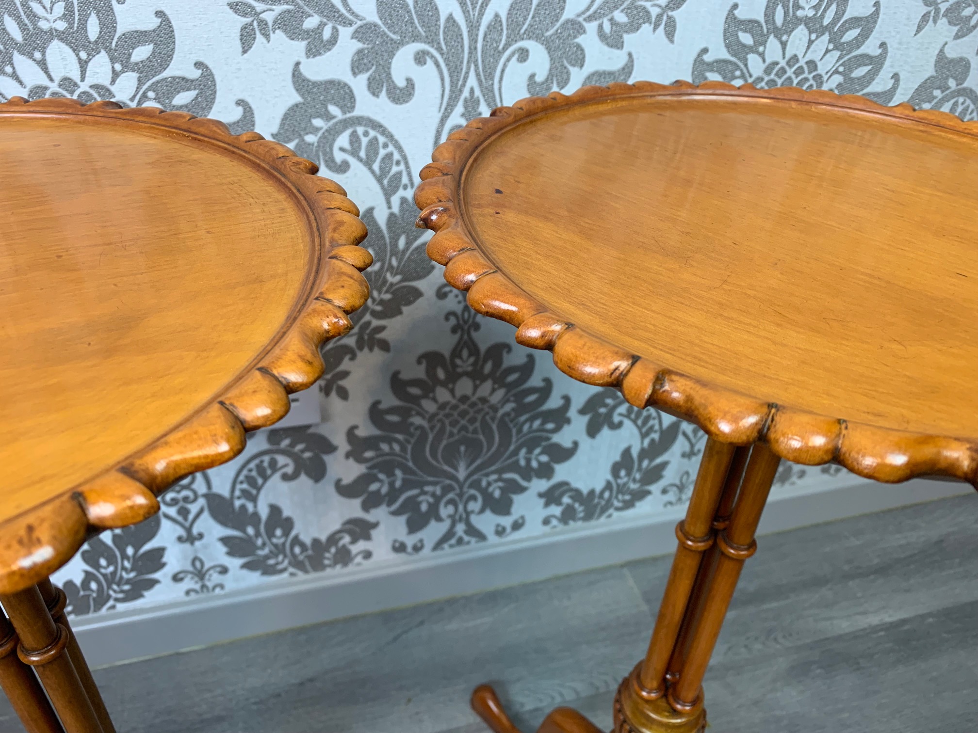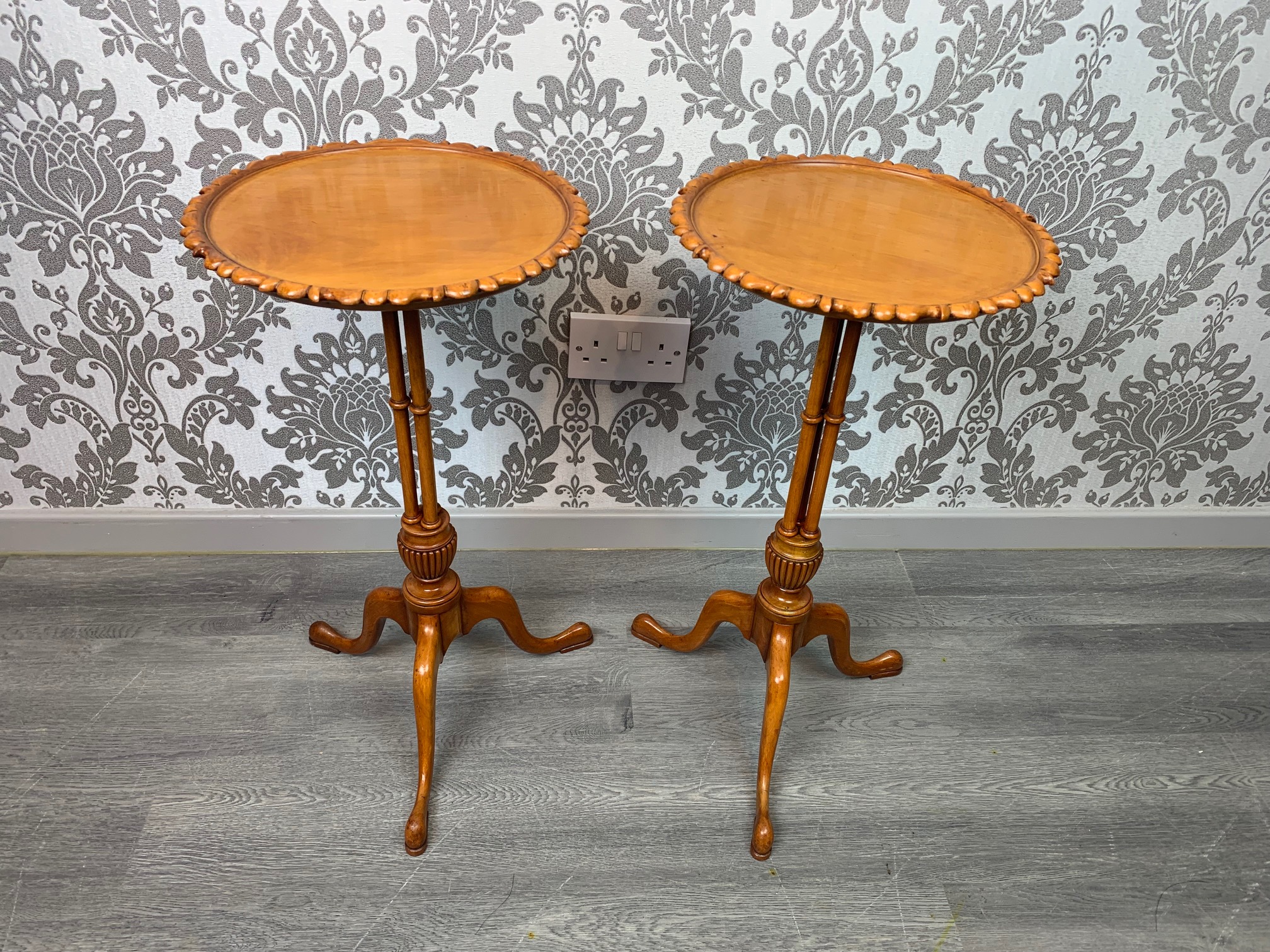CompareA Quality pair of Edwardian period satinwood wine tables. Each having circular tops with finely carved mouldings and raised on triple cluster columns on three cabriole supports with pad feet English circa 1900-1910, in superb original condition