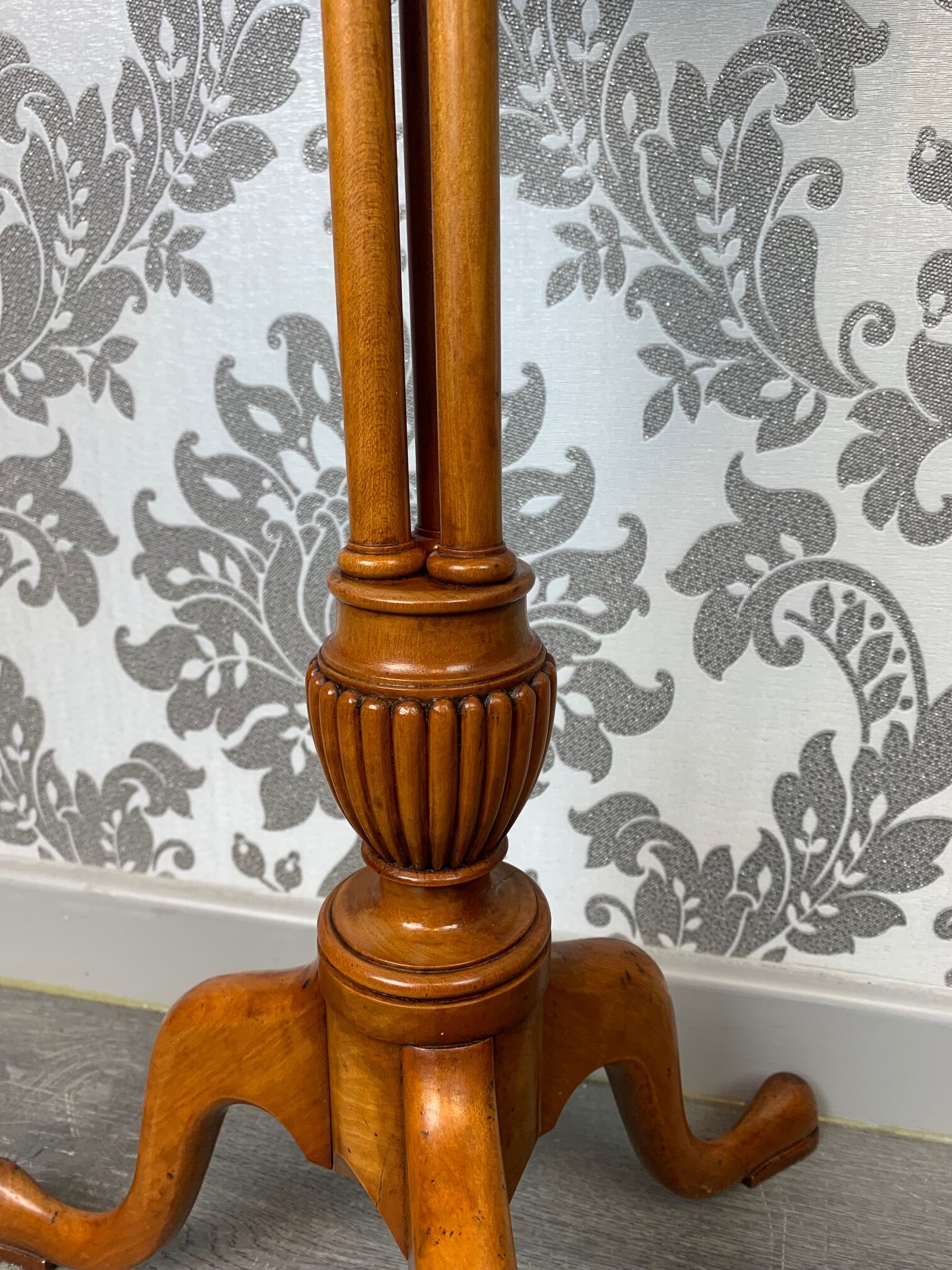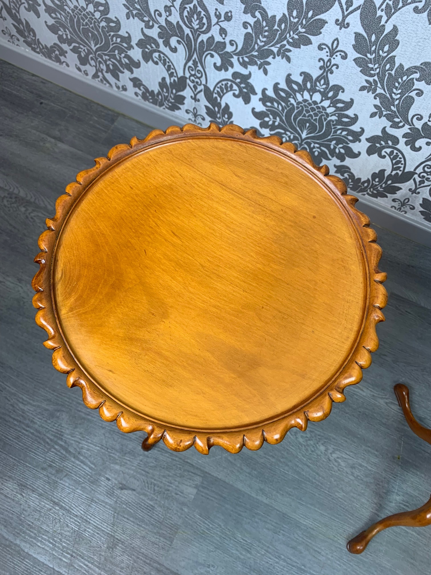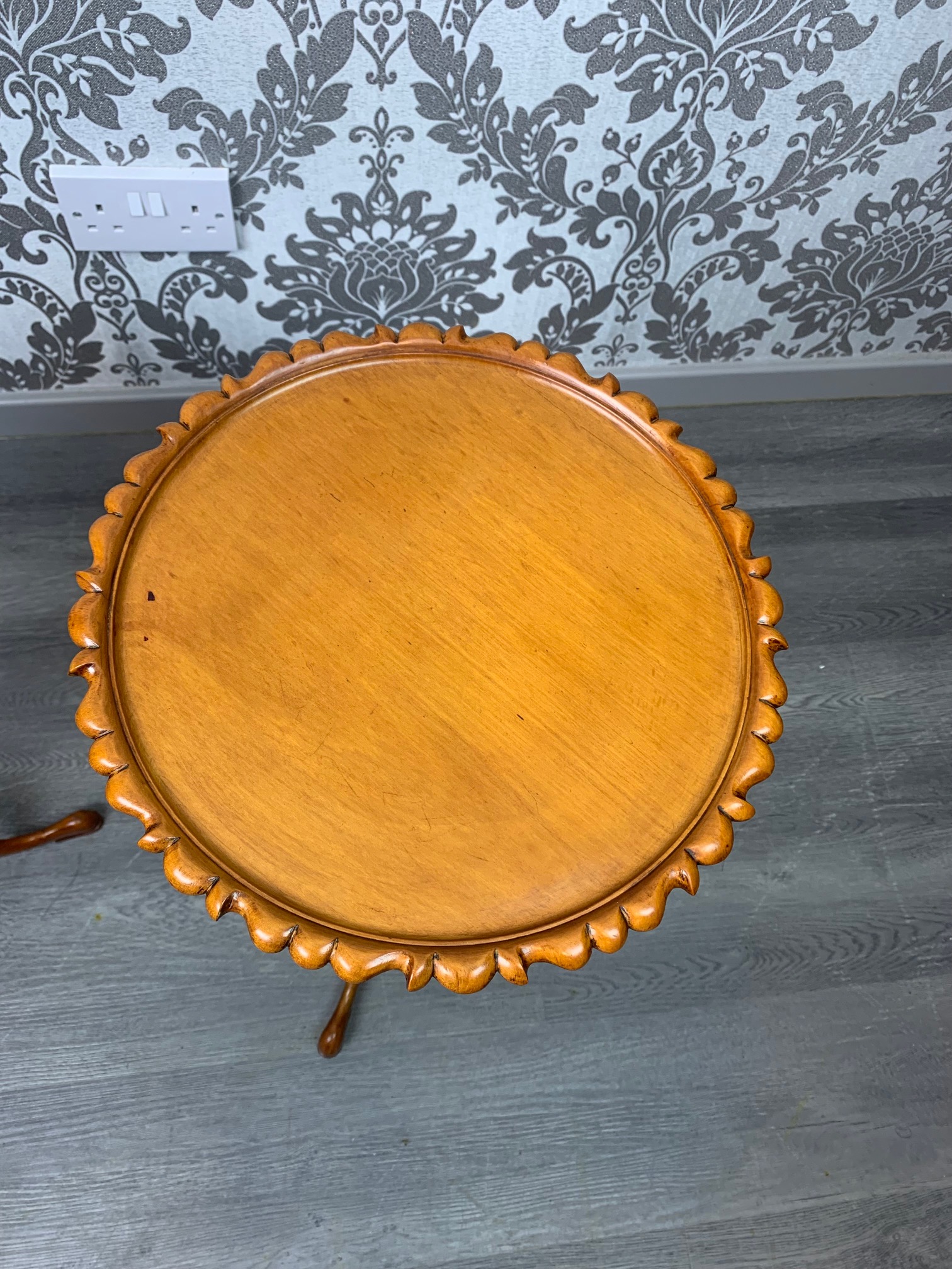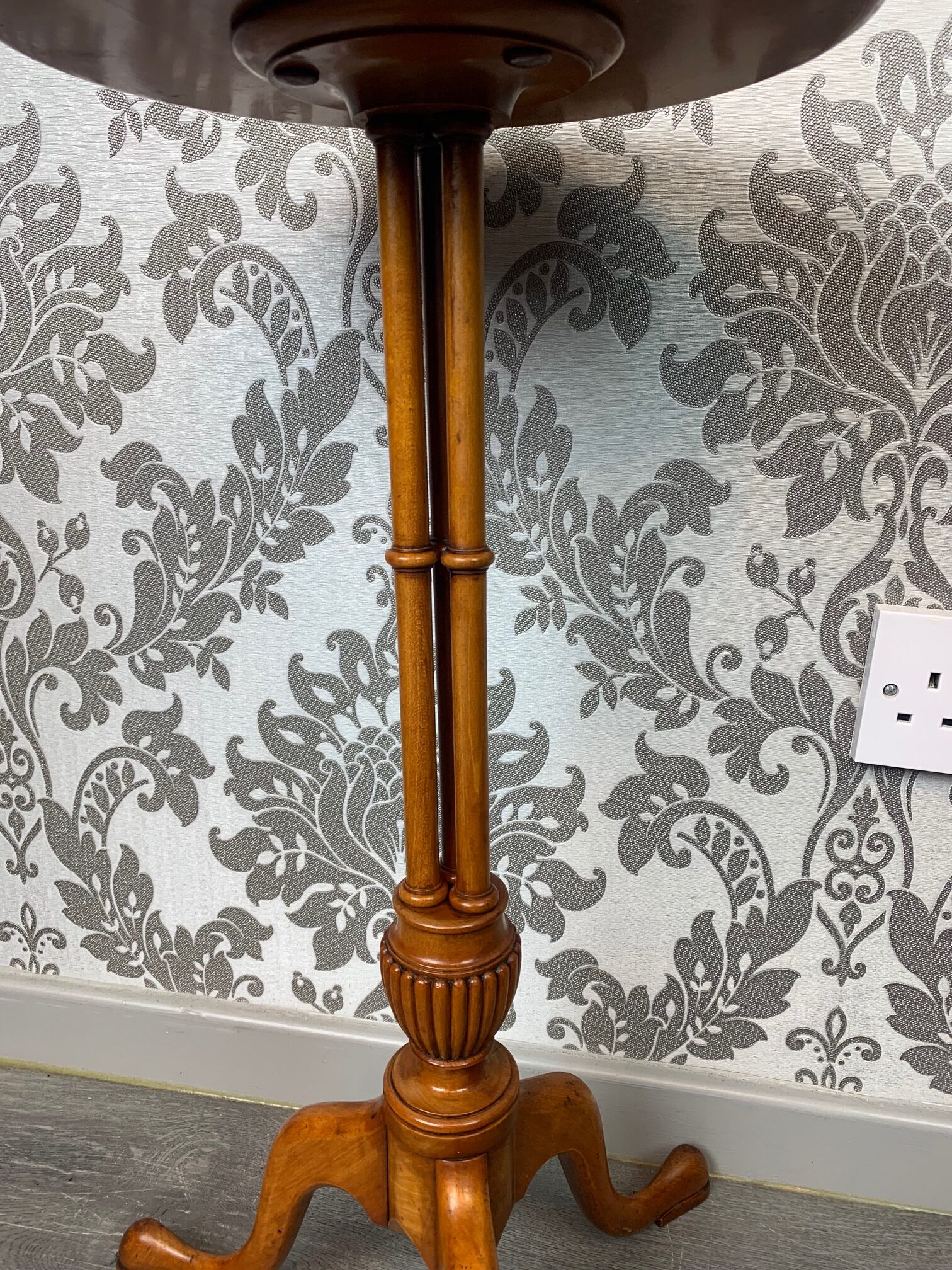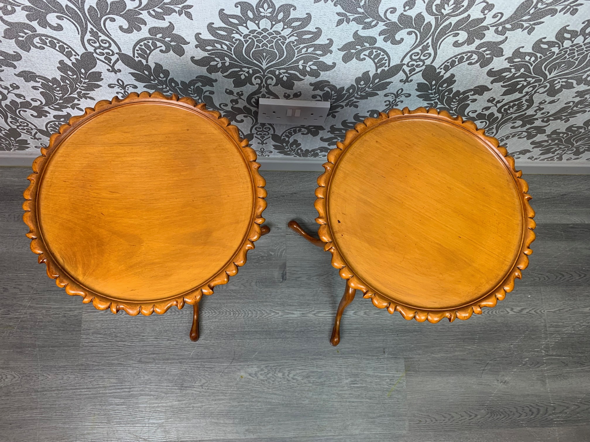 CompareA Quality pair of Edwardian period satinwood wine tables. Each having circular tops with finely carved mouldings and raised on triple cluster columns on three cabriole supports with pad feet English circa 1900-1910, in superb original condition