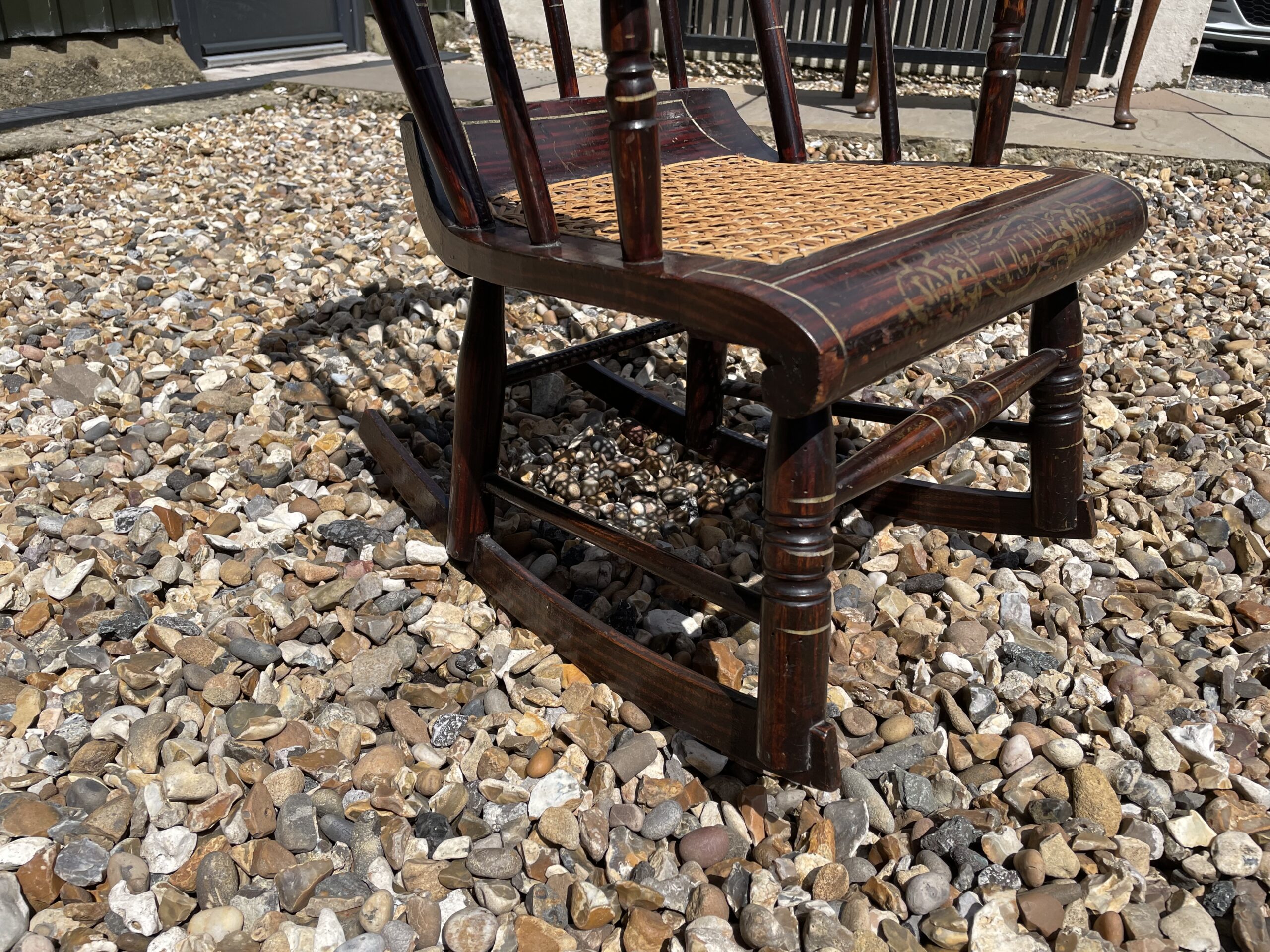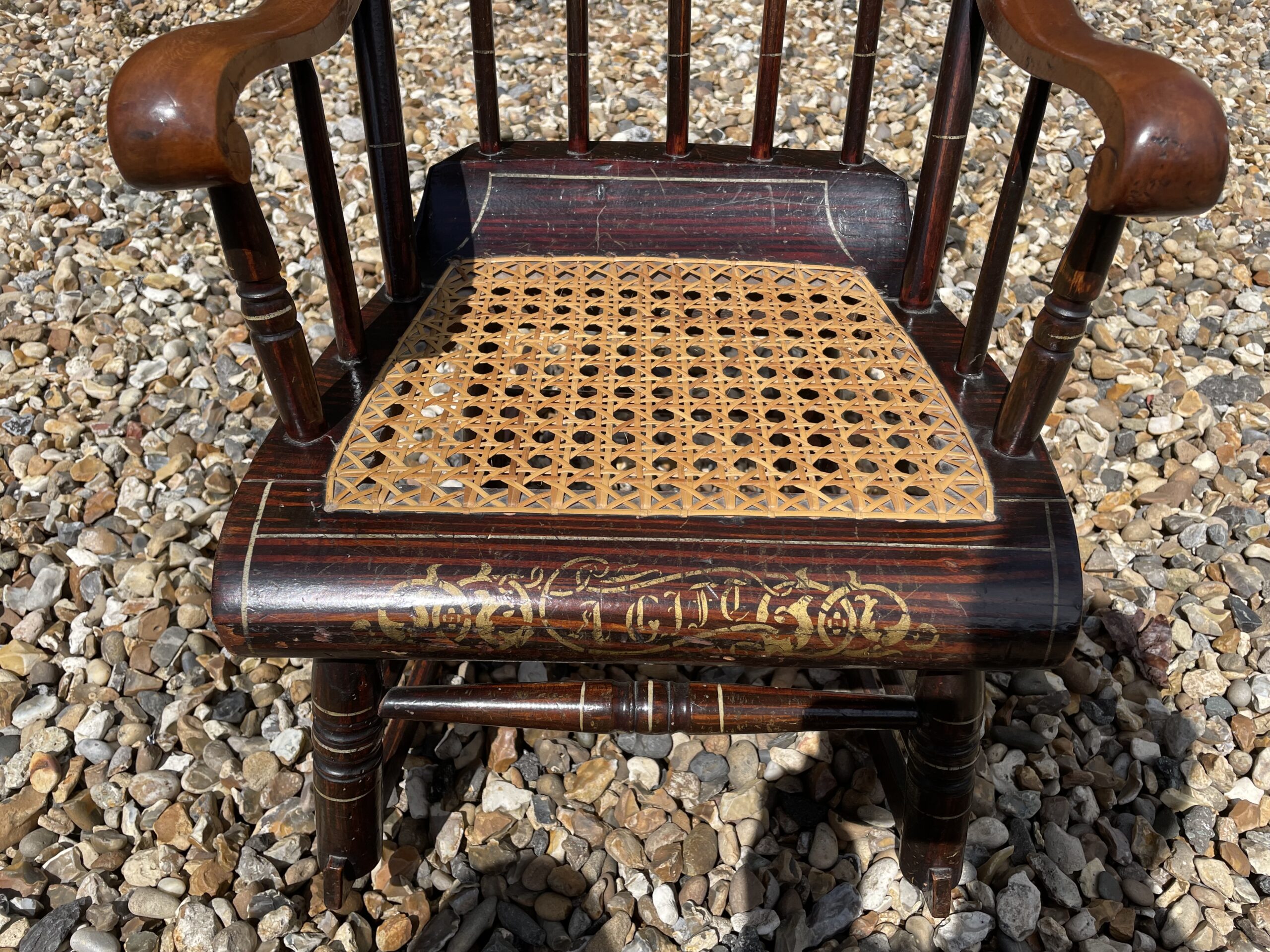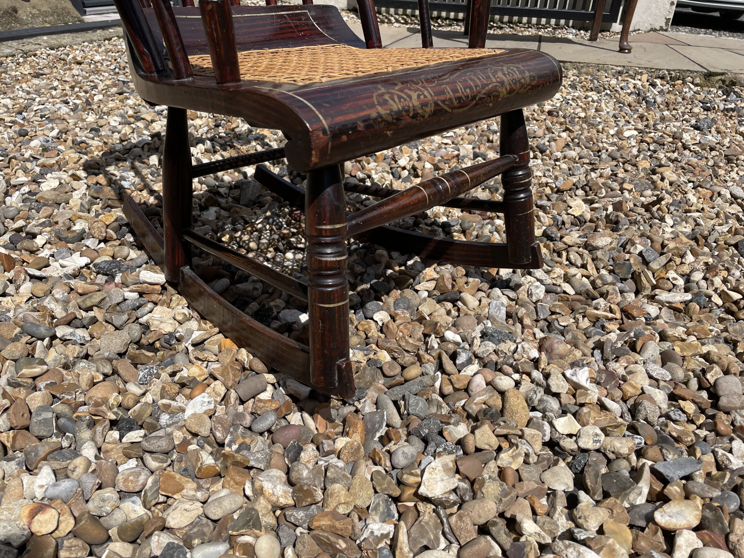 CompareA rare 19th Century American Boston Childs rocking chair. A charming fruitwood “Boston” Childs rocking chair with lovely original painted detail to the frame and having a cane seat, turned supports and curved rockers. In wonderful original condition, superb patination to the arms, the cane seat has been replaced at some time. American circa 1880-1900