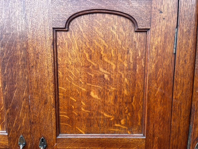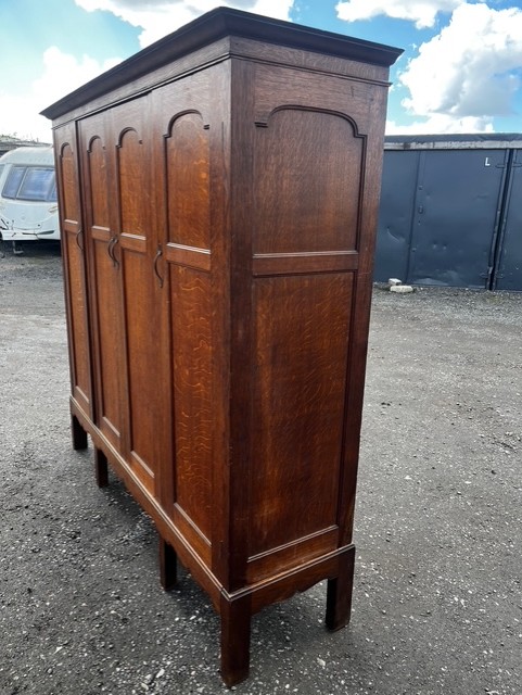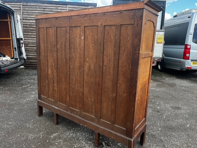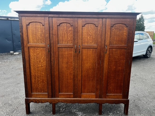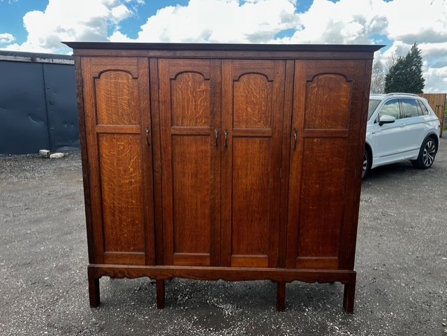 A Rare Arts & Crafts Period Oak Wardrobe/Hall Robe By Arthur Simpson Of Kendal. Made from solid oak throughout with a detachable moulded cornice and having four panelled doors in fumed quarter sawn oak with Rathbone heart shaped handles. Raised on a rectangular base with a wavy apron. English circa 1900-1910 by Arthur Simpson Of Kendal.