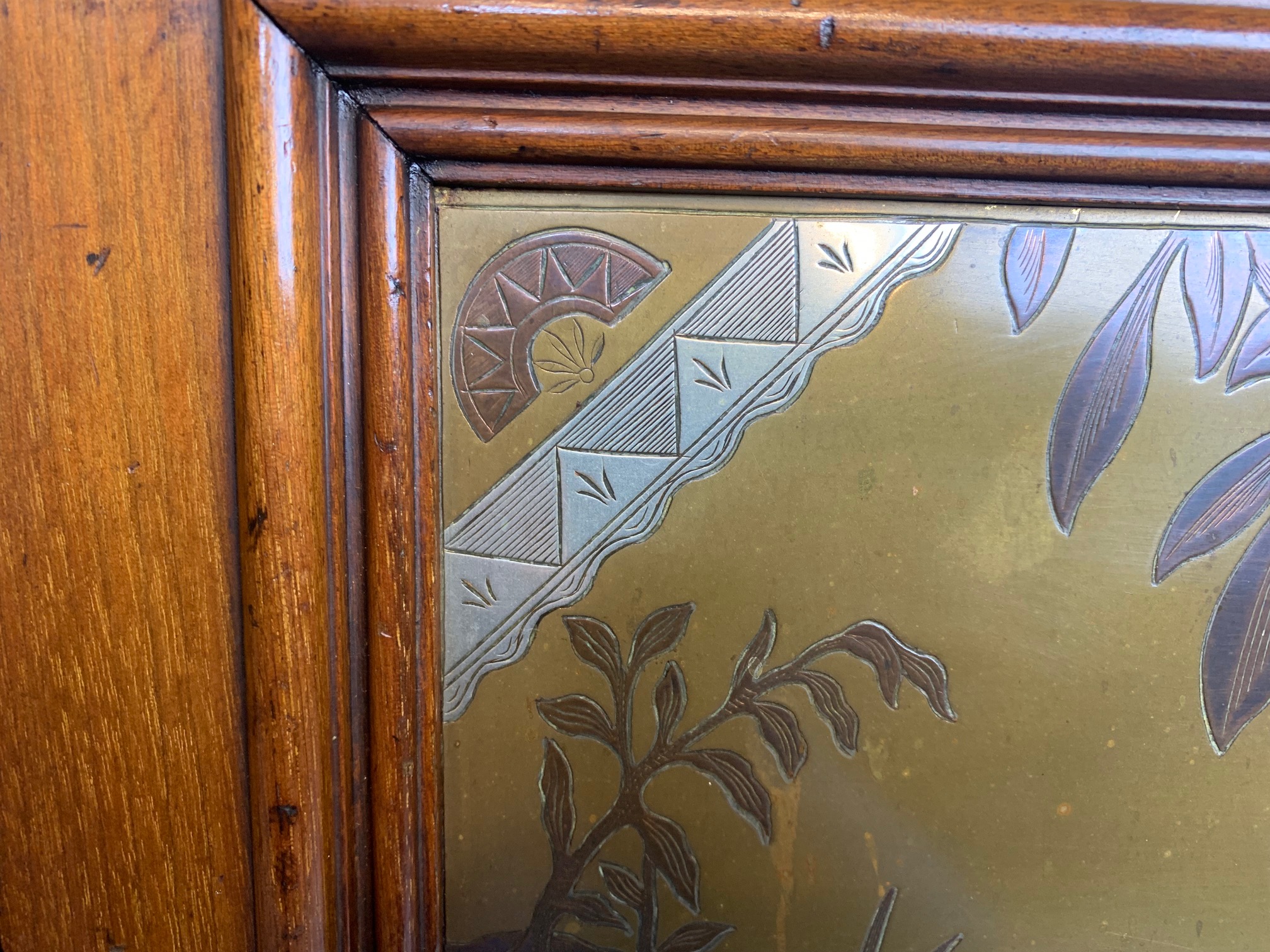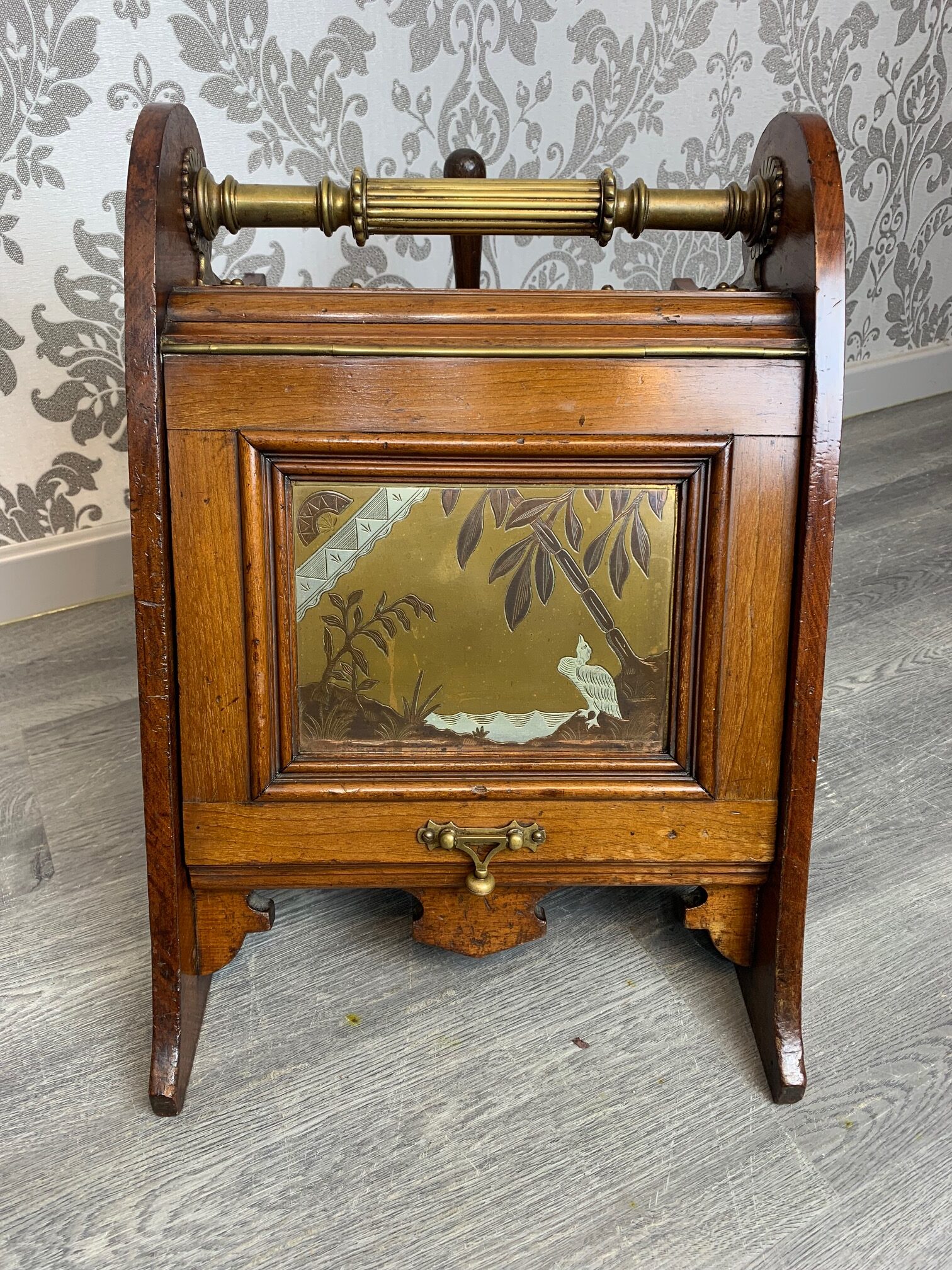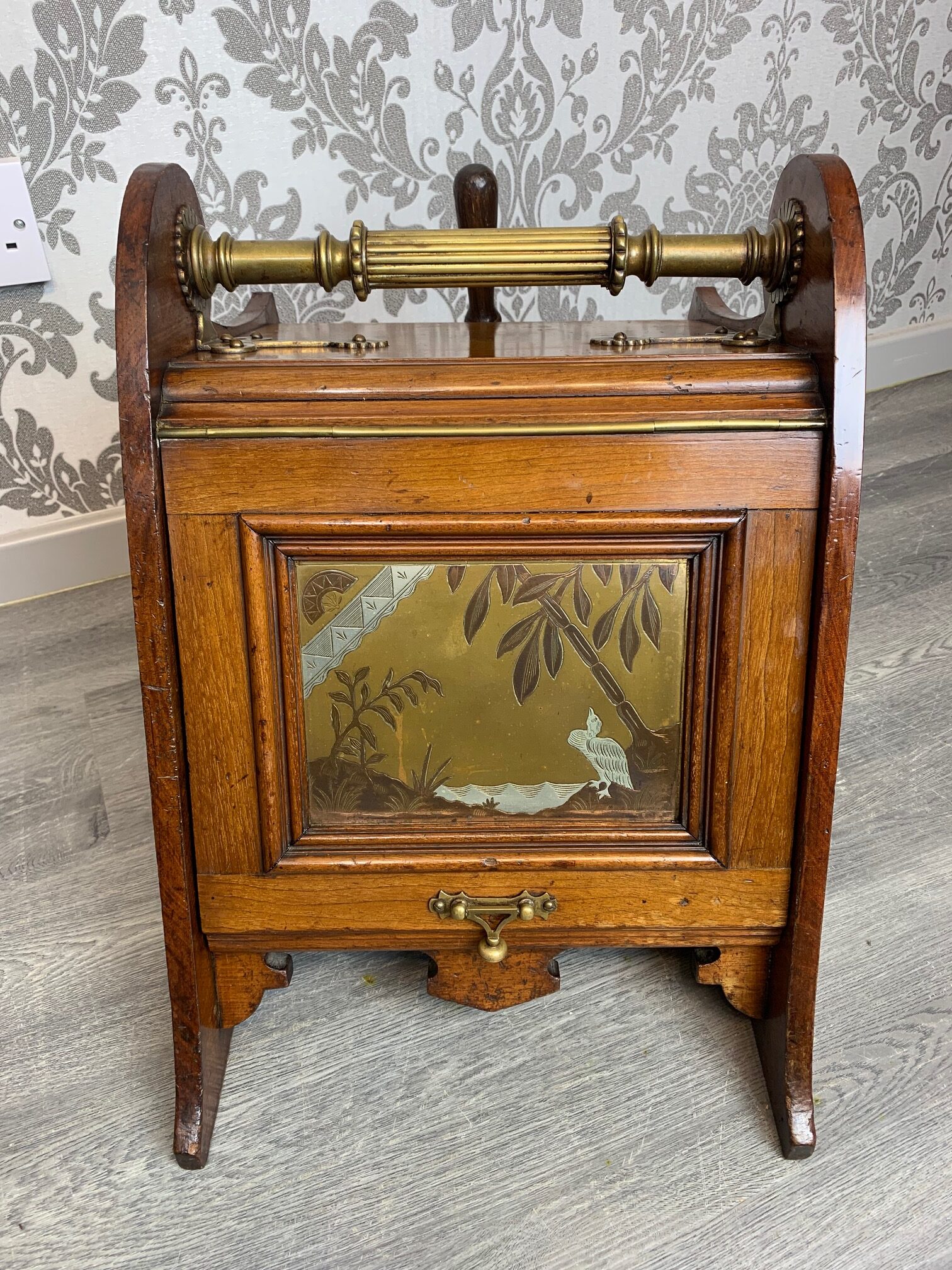 CompareA rare Christopher Dresser Design Victorian Period walnut coal box. The sloping hinged front having a wonderful Japaneske panel with silver and bronze detail. The carcase made from solid walnut and housing a brass coal scuttle with typical Christopher Dresser designed hardware and roundels. Made by Benham and Froud from an original Christopher Dresser design. English circa 1870-1880