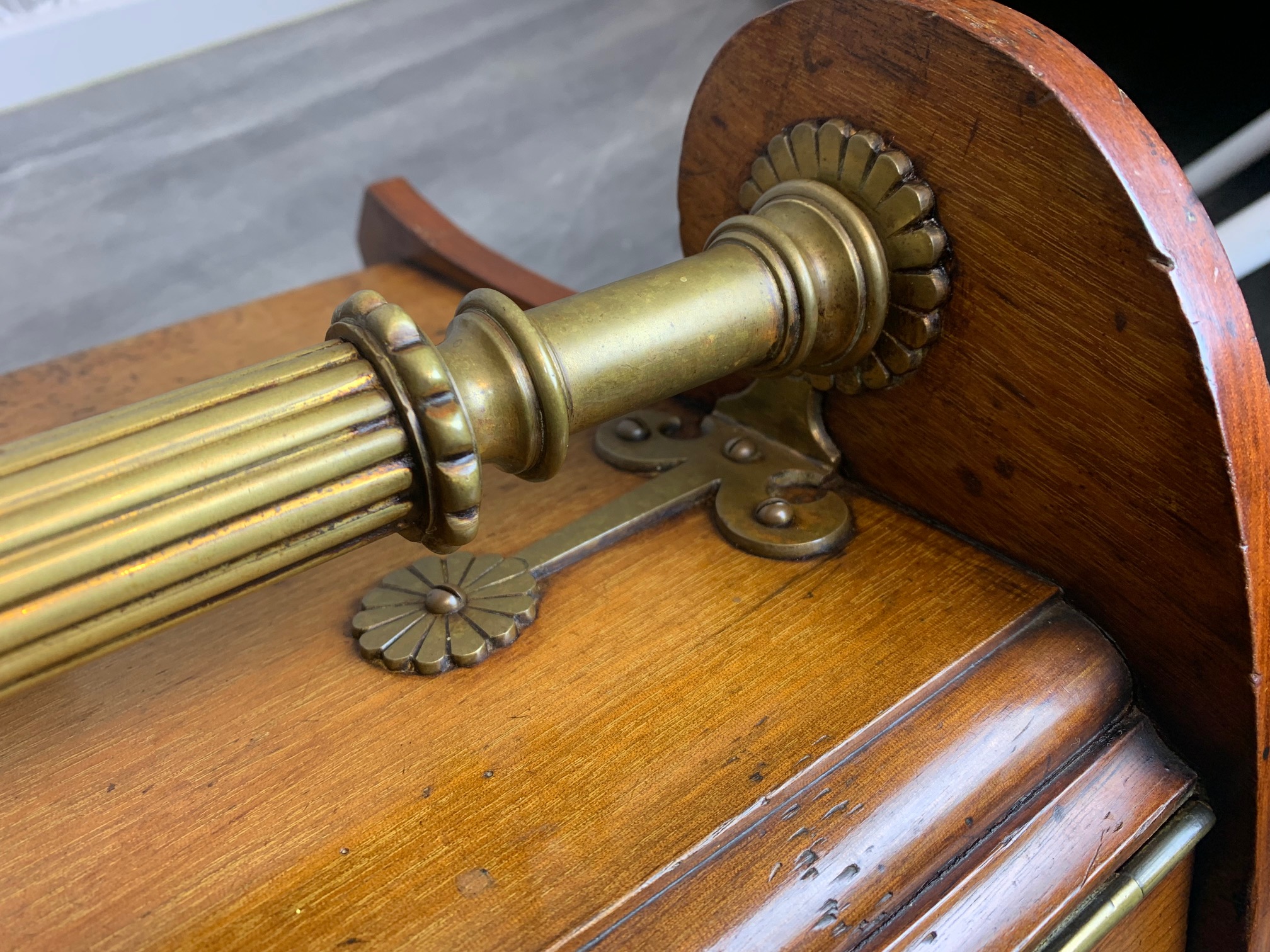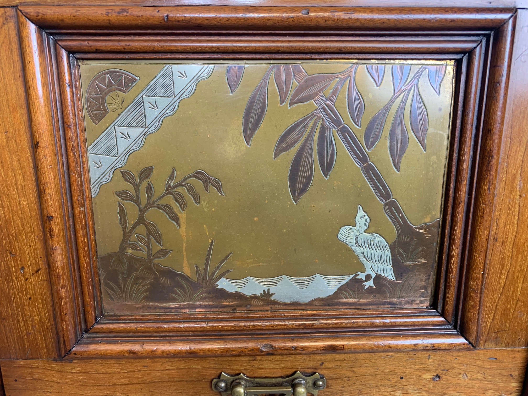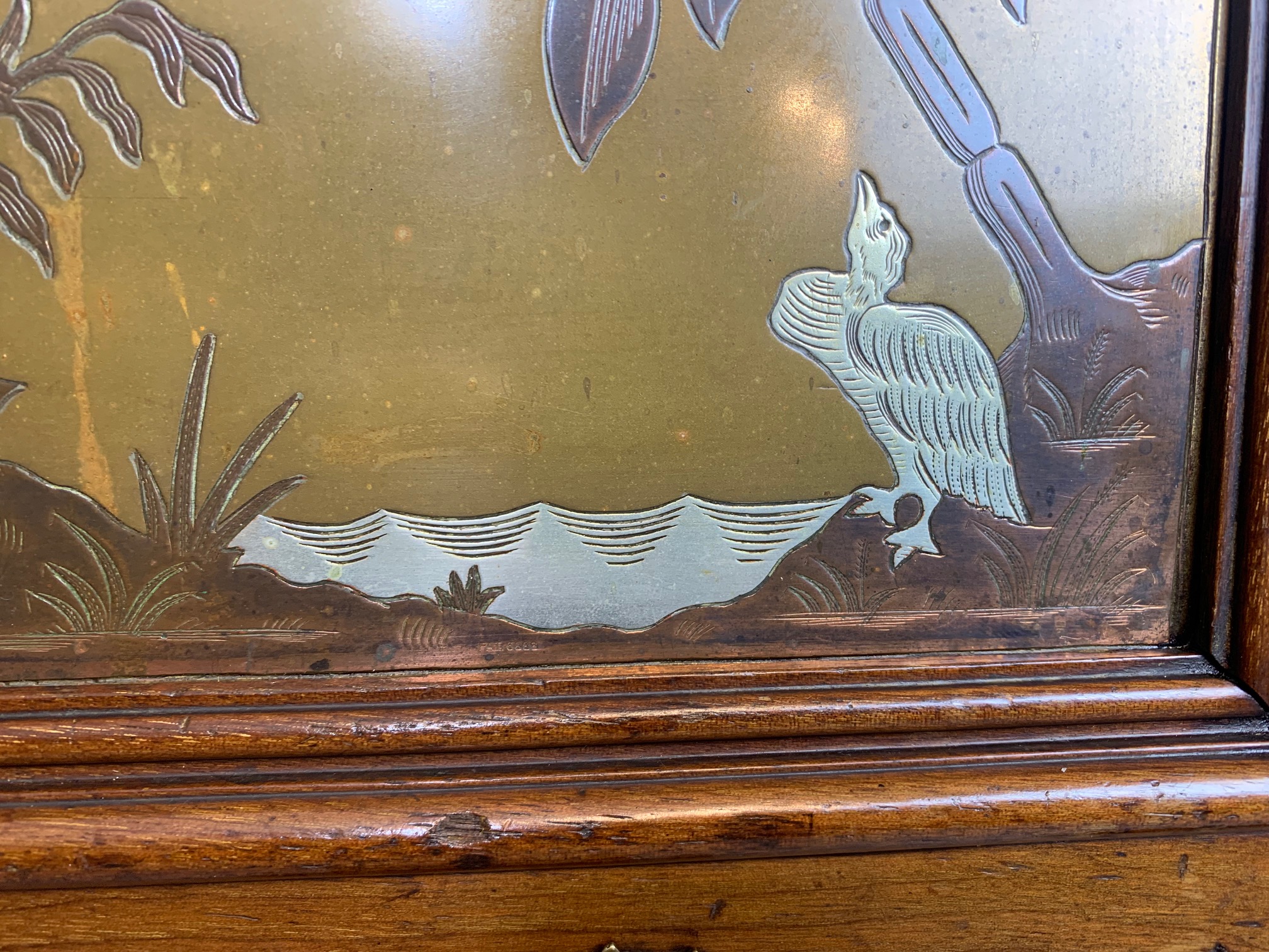 CompareA rare Christopher Dresser Design Victorian Period walnut coal box. The sloping hinged front having a wonderful Japaneske panel with silver and bronze detail. The carcase made from solid walnut and housing a brass coal scuttle with typical Christopher Dresser designed hardware and roundels. Made by Benham and Froud from an original Christopher Dresser design. English circa 1870-1880