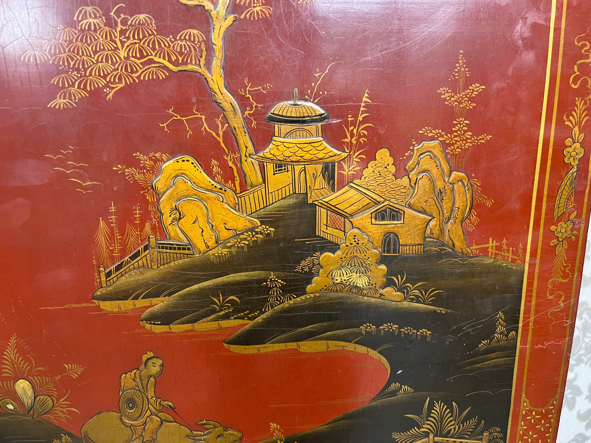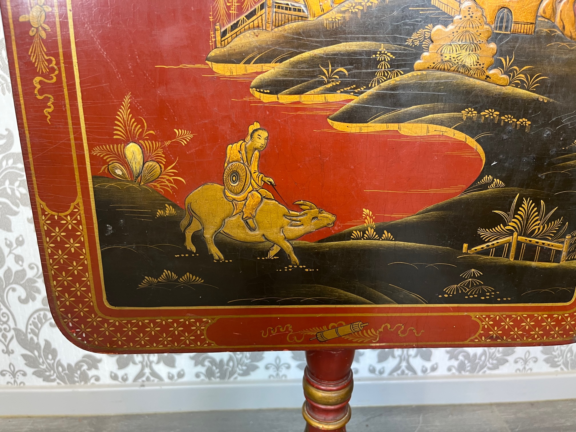 CompareA Regency Style chinoiserie tripod table. The rectangular tilting top with raised lacquer detail depicting a typical Oriental scene with a gilded border and raised on a turned and gilded column with swept supports. English circa 1920, in superb original condition, no loss of lacquer