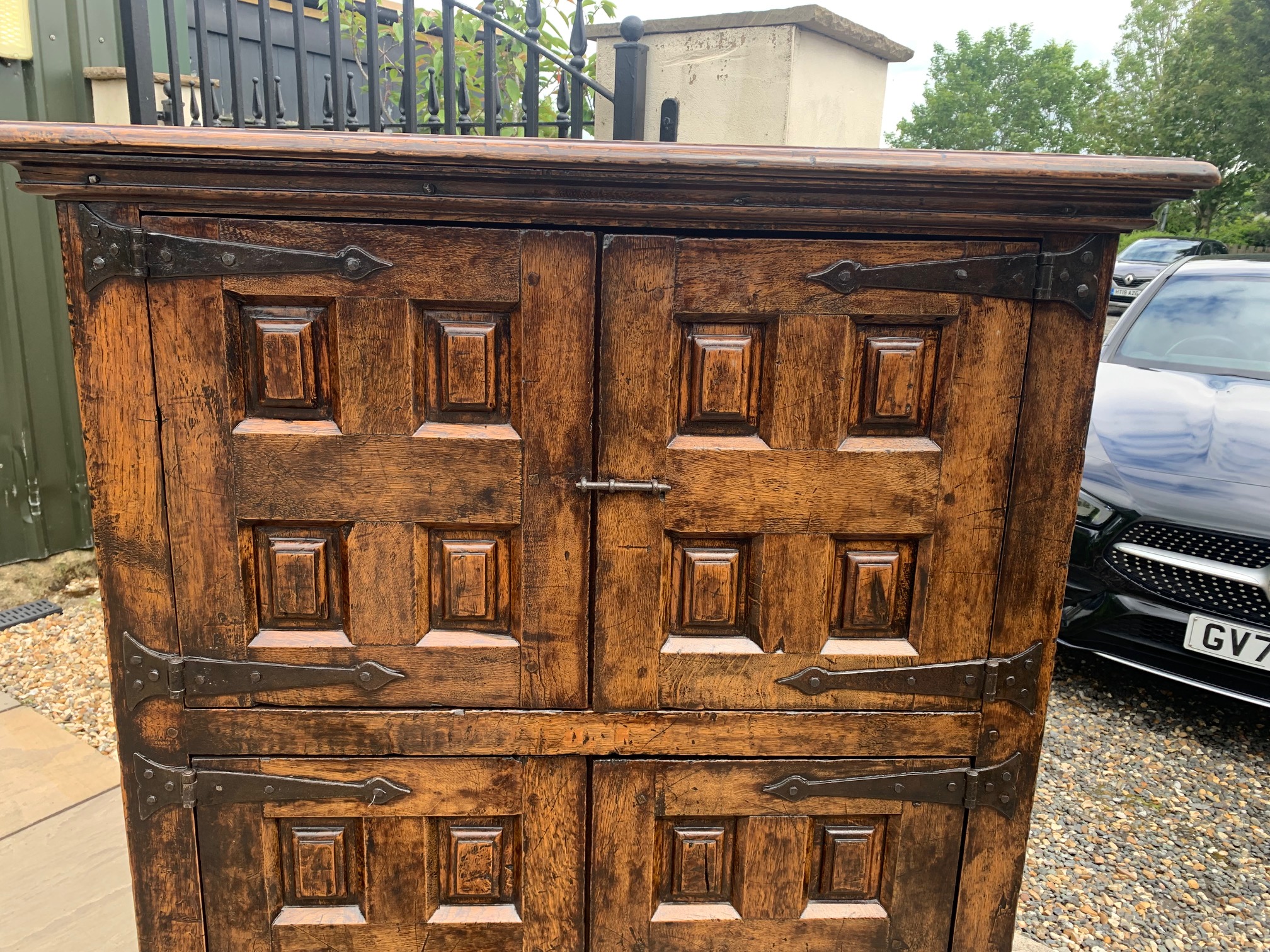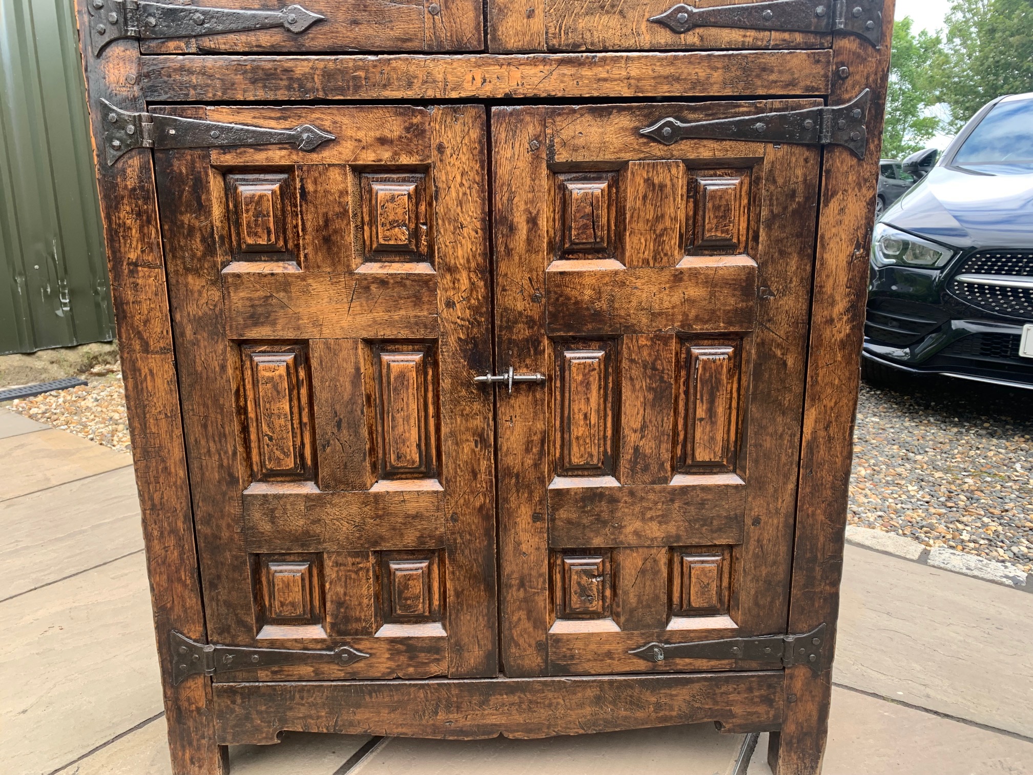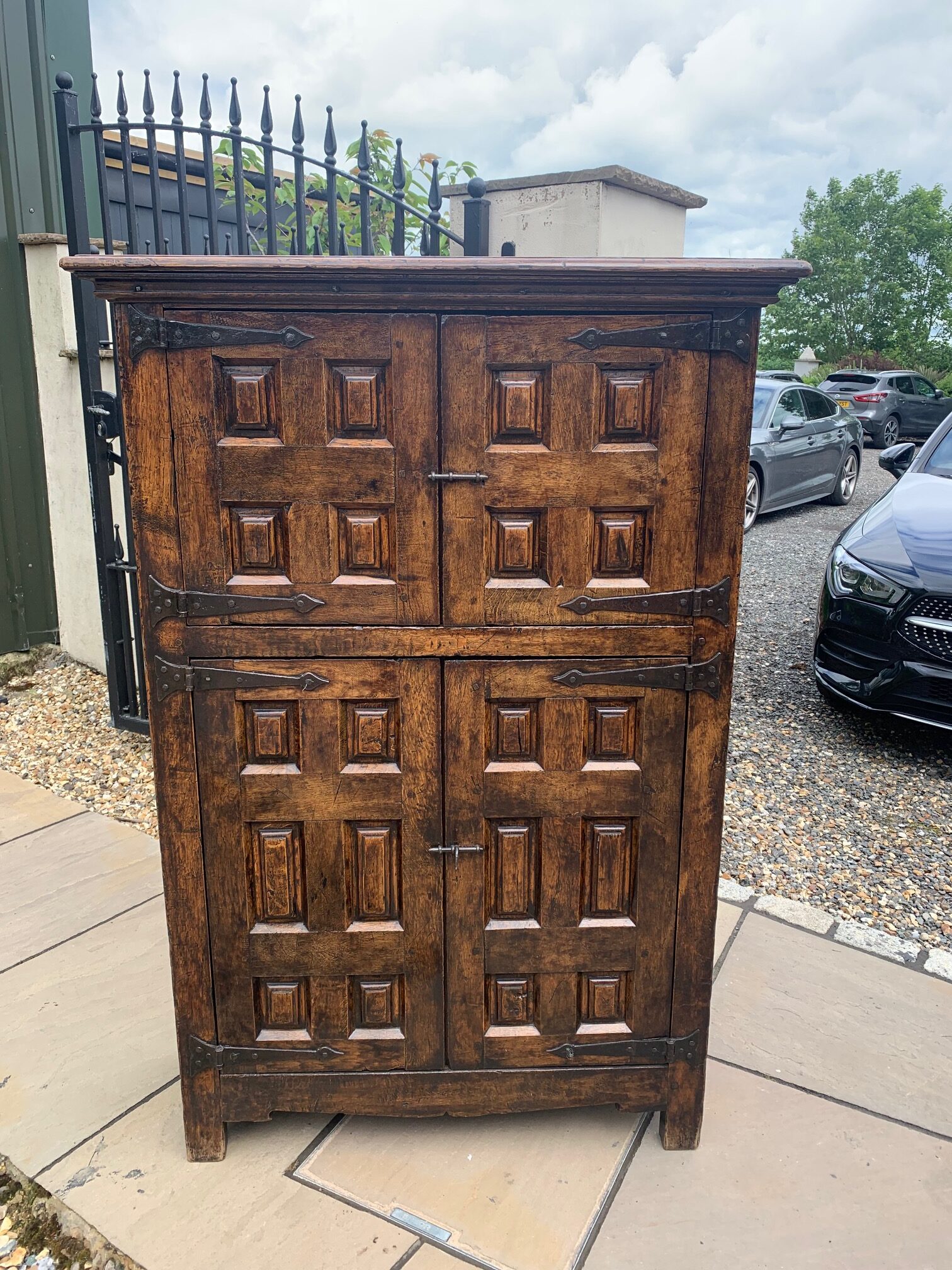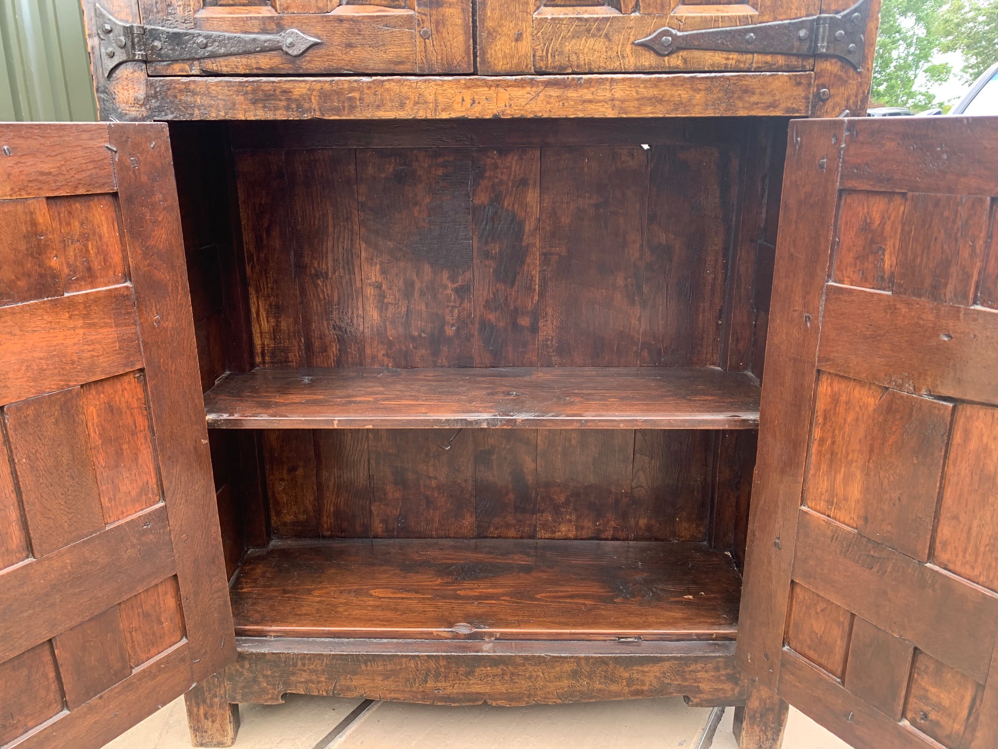 A rustic Spanish Style oak panelled cupboard constructed throughout in solid oak with four panelled doors, iron strap work hinges and handles. Having panelled sides and pegged construction throughout. English circa 1920 in the Spanish style. A lovely colour and patina