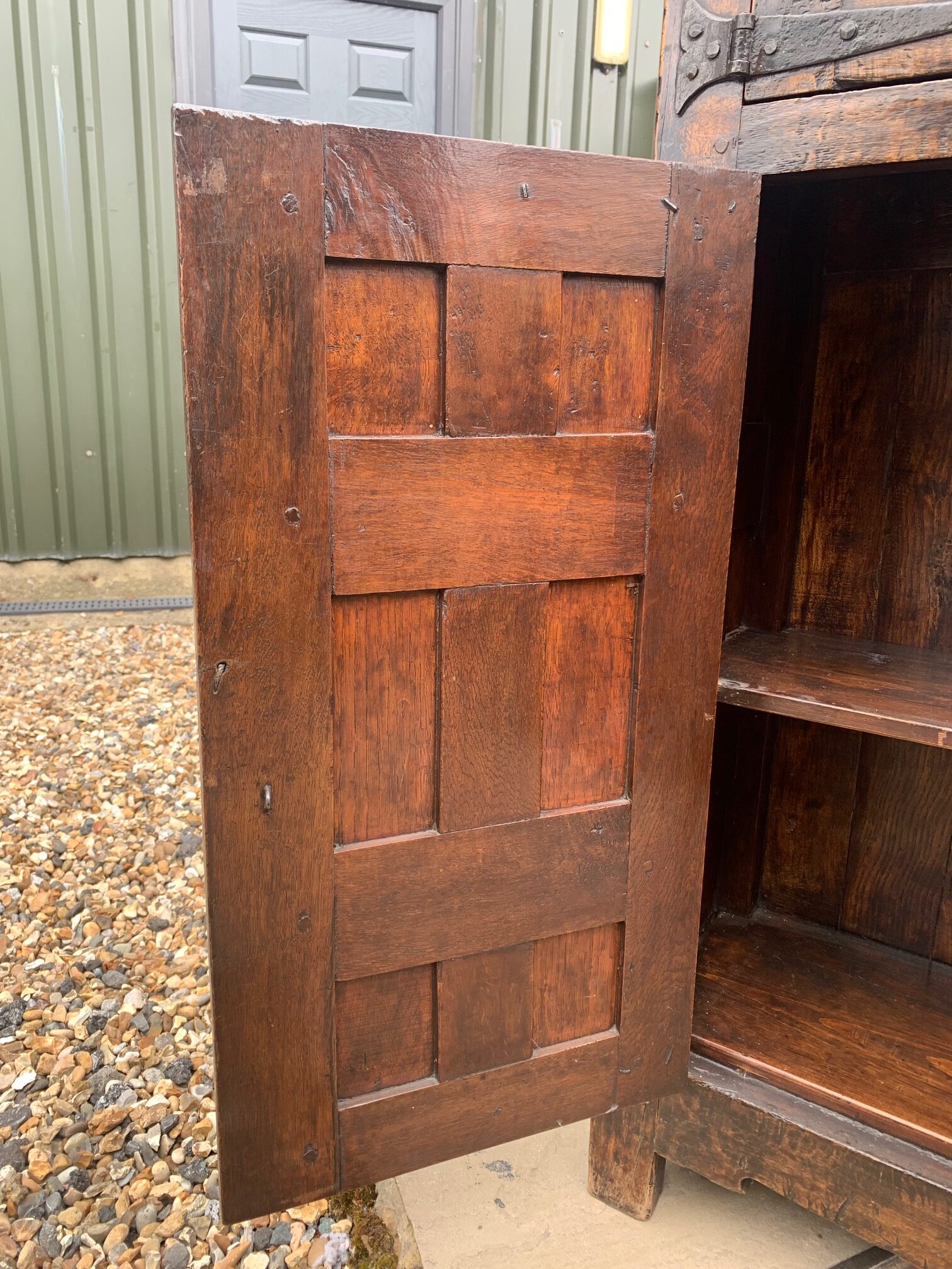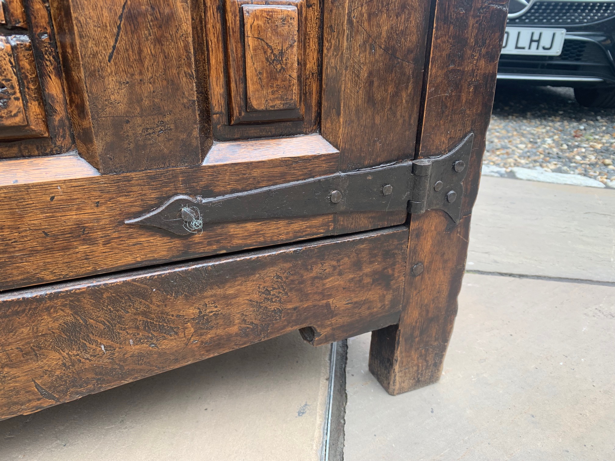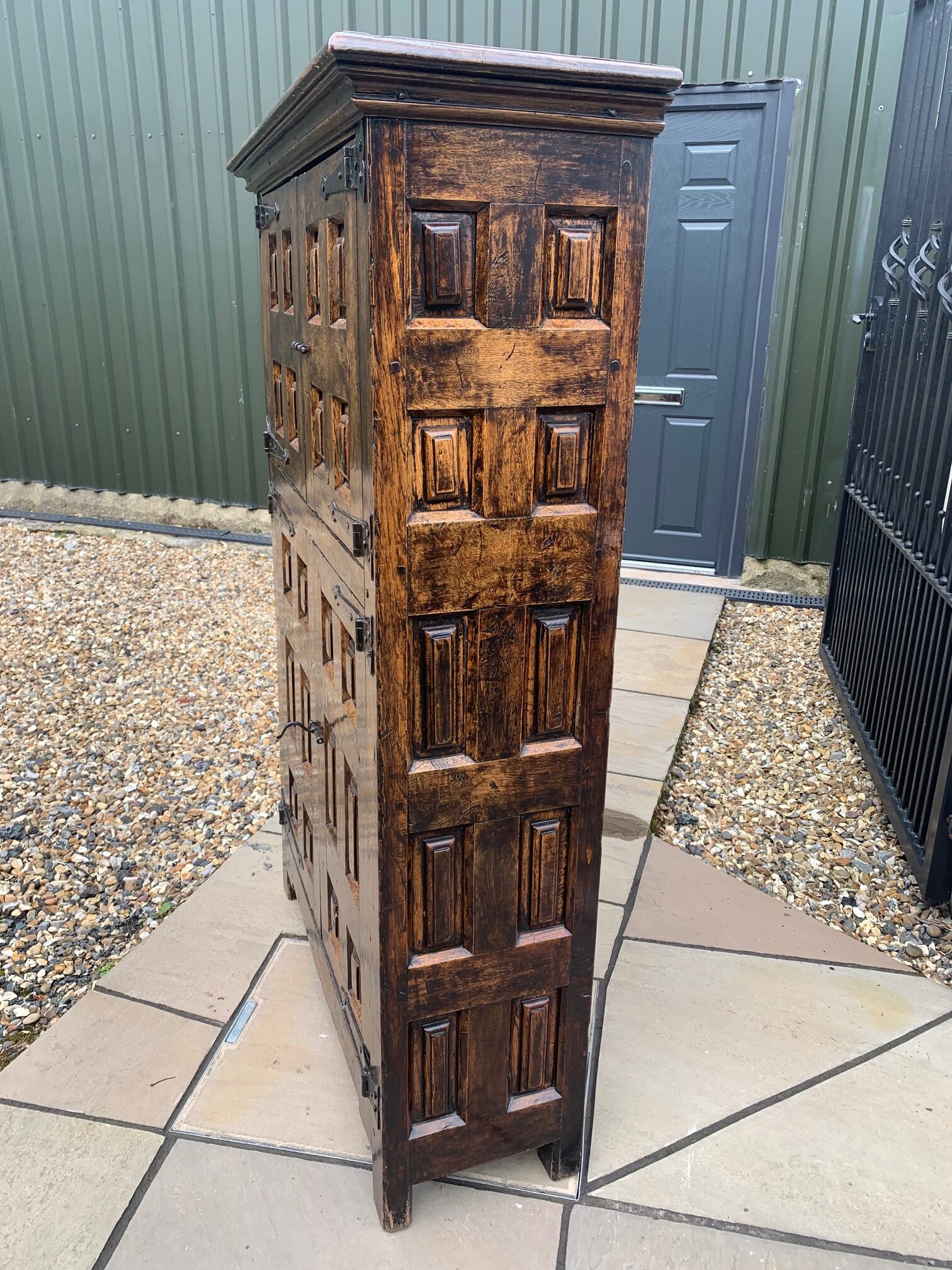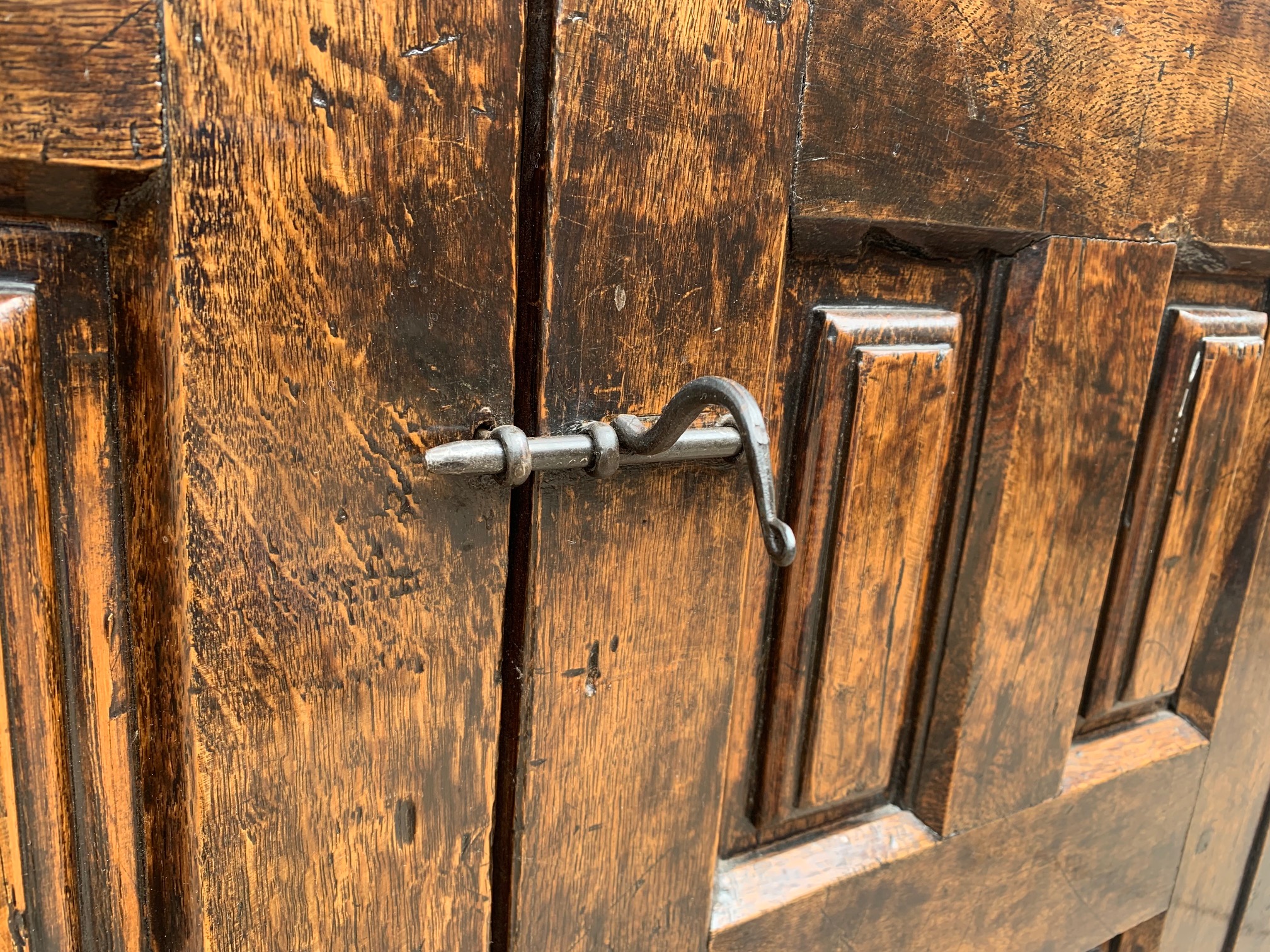 A rustic Spanish Style oak panelled cupboard constructed throughout in solid oak with four panelled doors, iron strap work hinges and handles. Having panelled sides and pegged construction throughout. English circa 1920 in the Spanish style. A lovely colour and patina