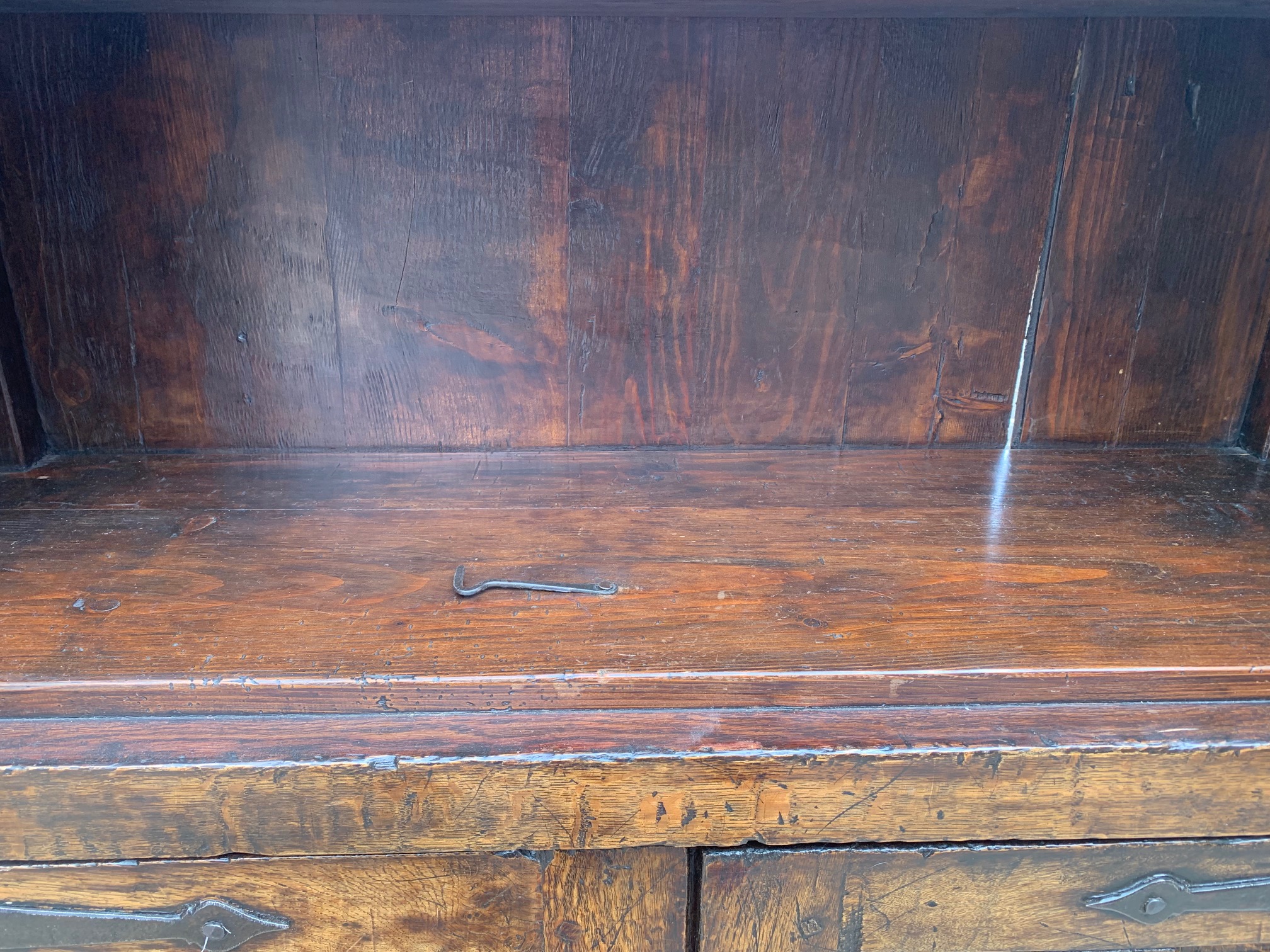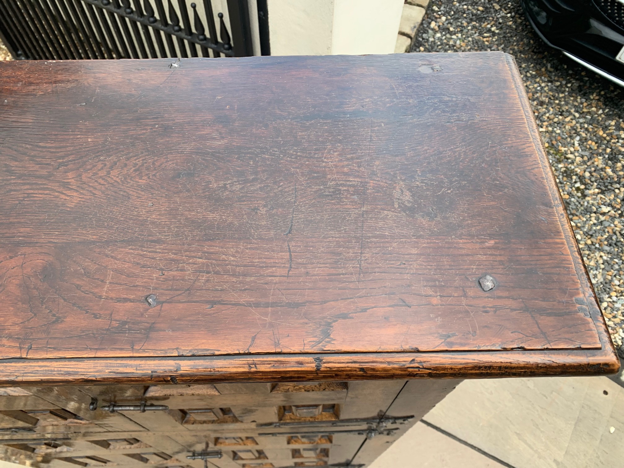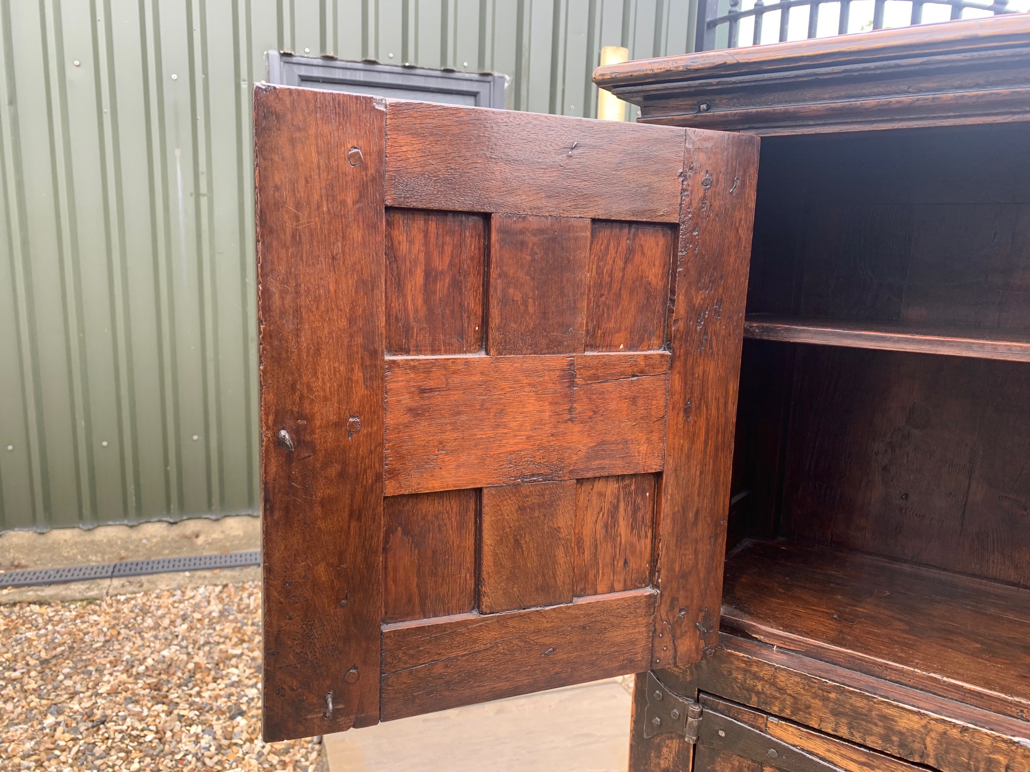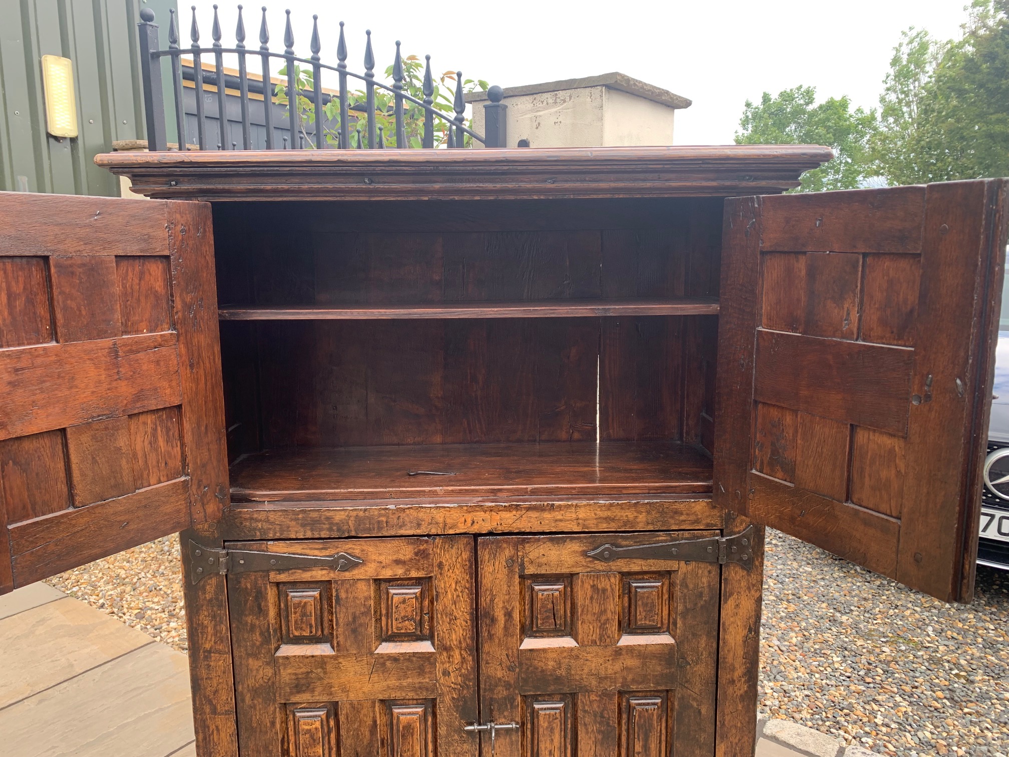A rustic Spanish Style oak panelled cupboard constructed throughout in solid oak with four panelled doors, iron strap work hinges and handles. Having panelled sides and pegged construction throughout. English circa 1920 in the Spanish style. A lovely colour and patina