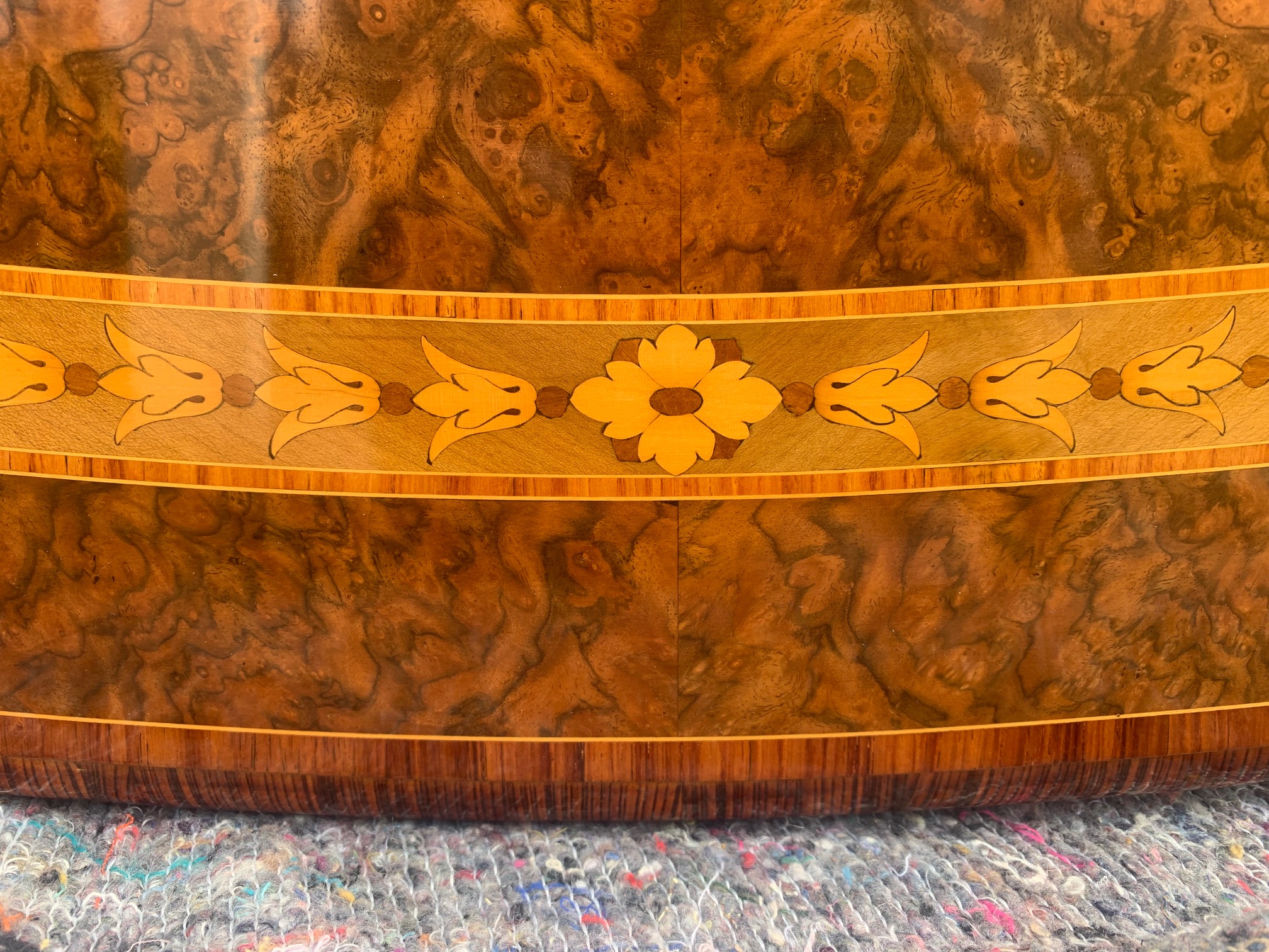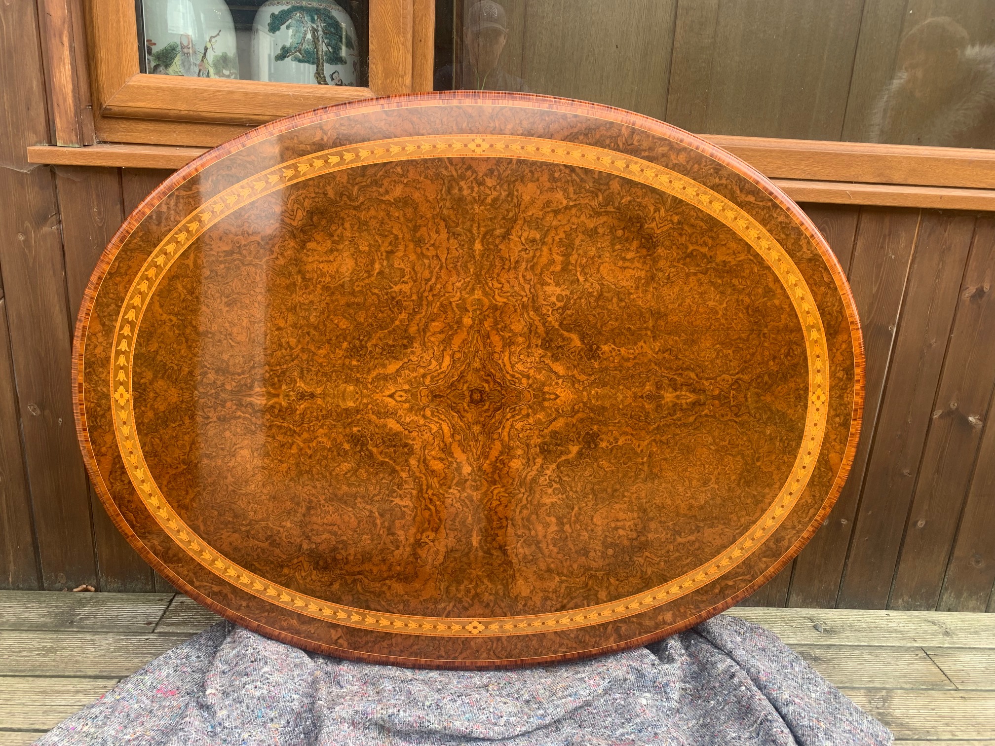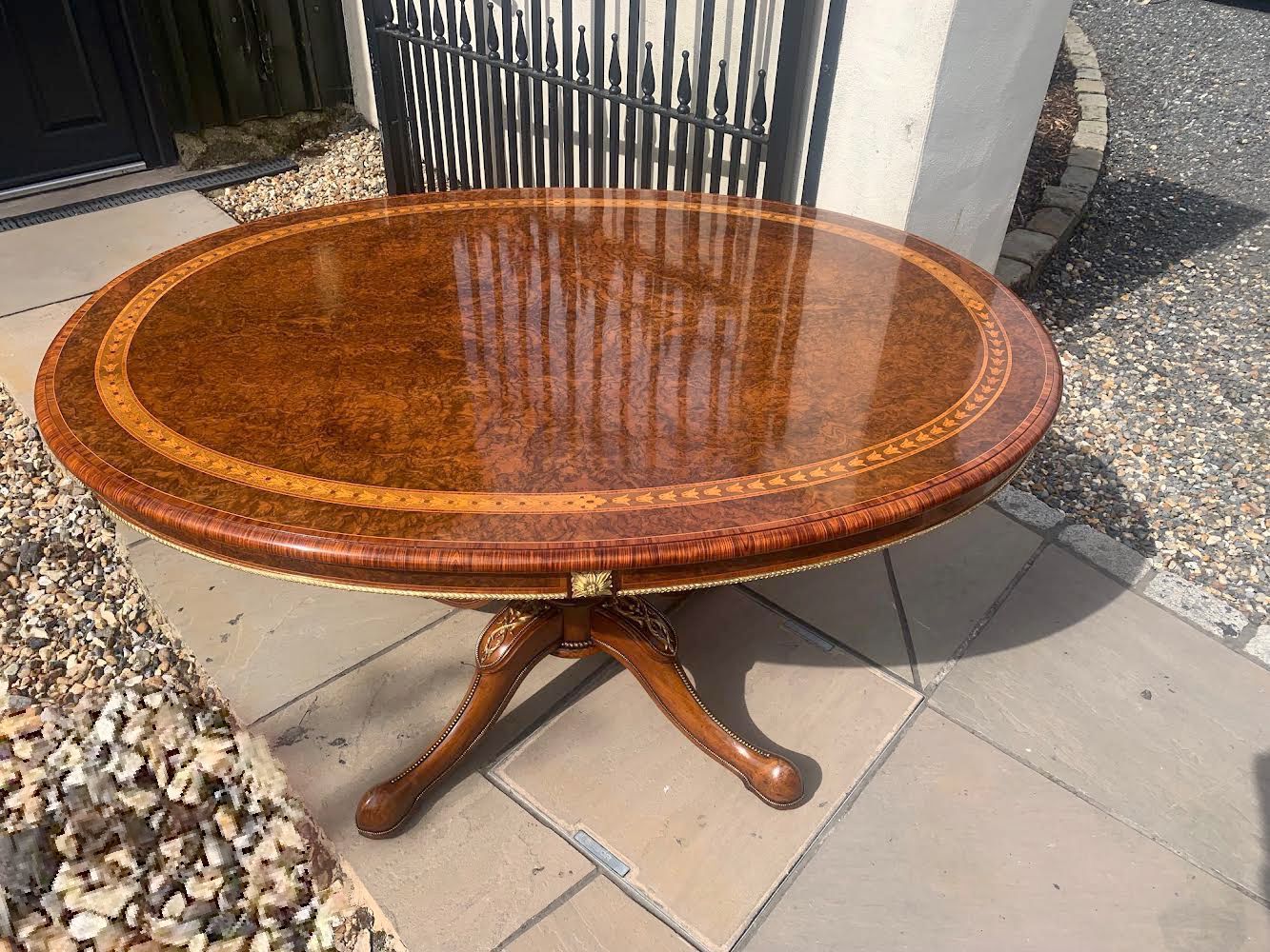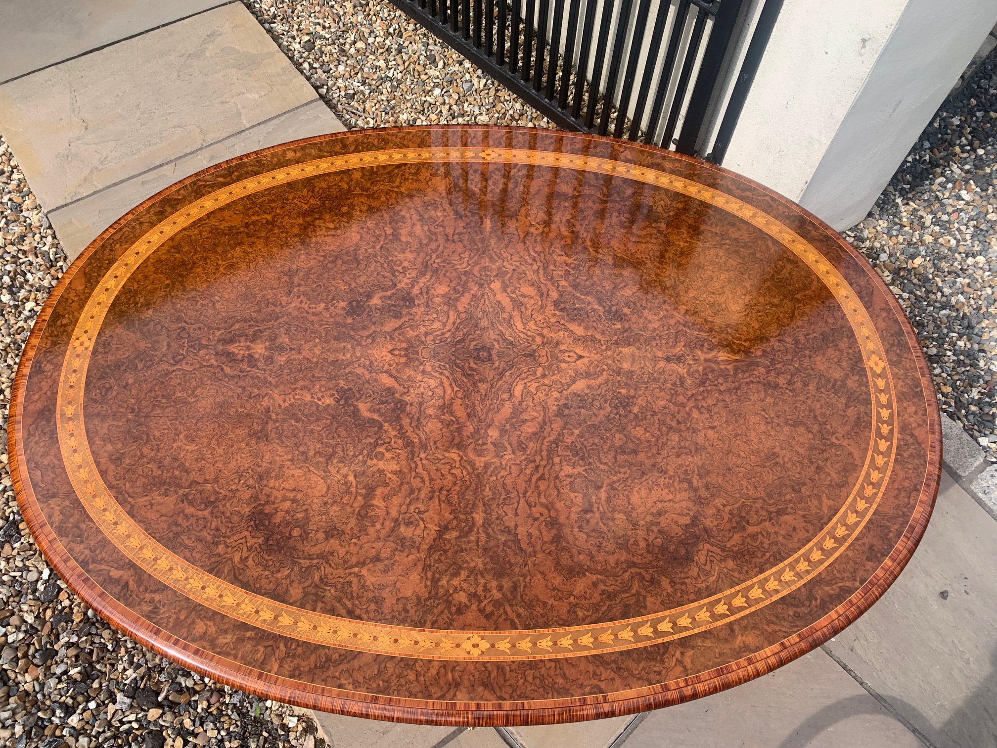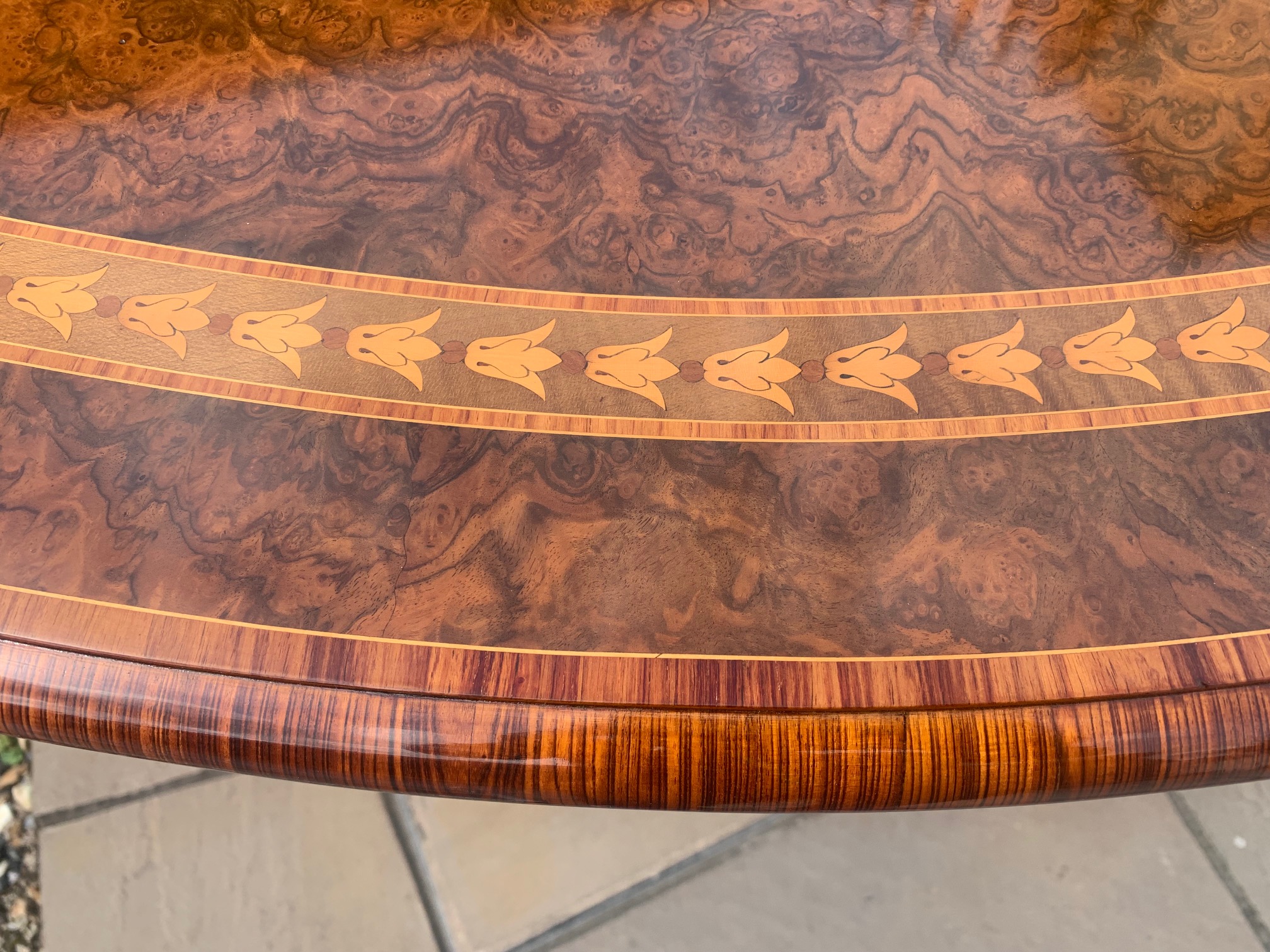 CompareA stunning quality Victorian Period burr walnut and ormolu mounted centre table. The oval top veneered in the finest burr walnut and having a trailing harebell inlaid border with tulipwood banding and moulding. The frieze also in burr walnut and tulipwood with ormolu rosettes and beading. Raised on a turned walnut column with four swept supports and pad feet, again with fine quality ormolu mounts. Although not stamped, this table is firmly attributable to Gillows Of Lancaster. We have owned several variants of this table in the past and they were all stamped Gillows, Lancaster. English circa 1870-1880, stunning condition