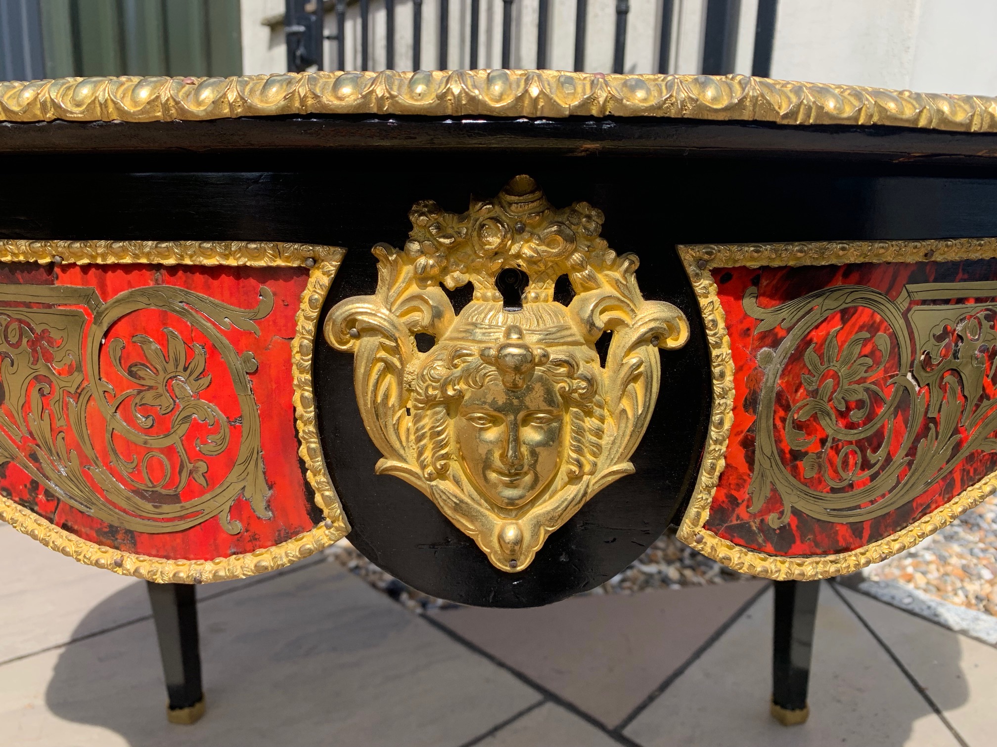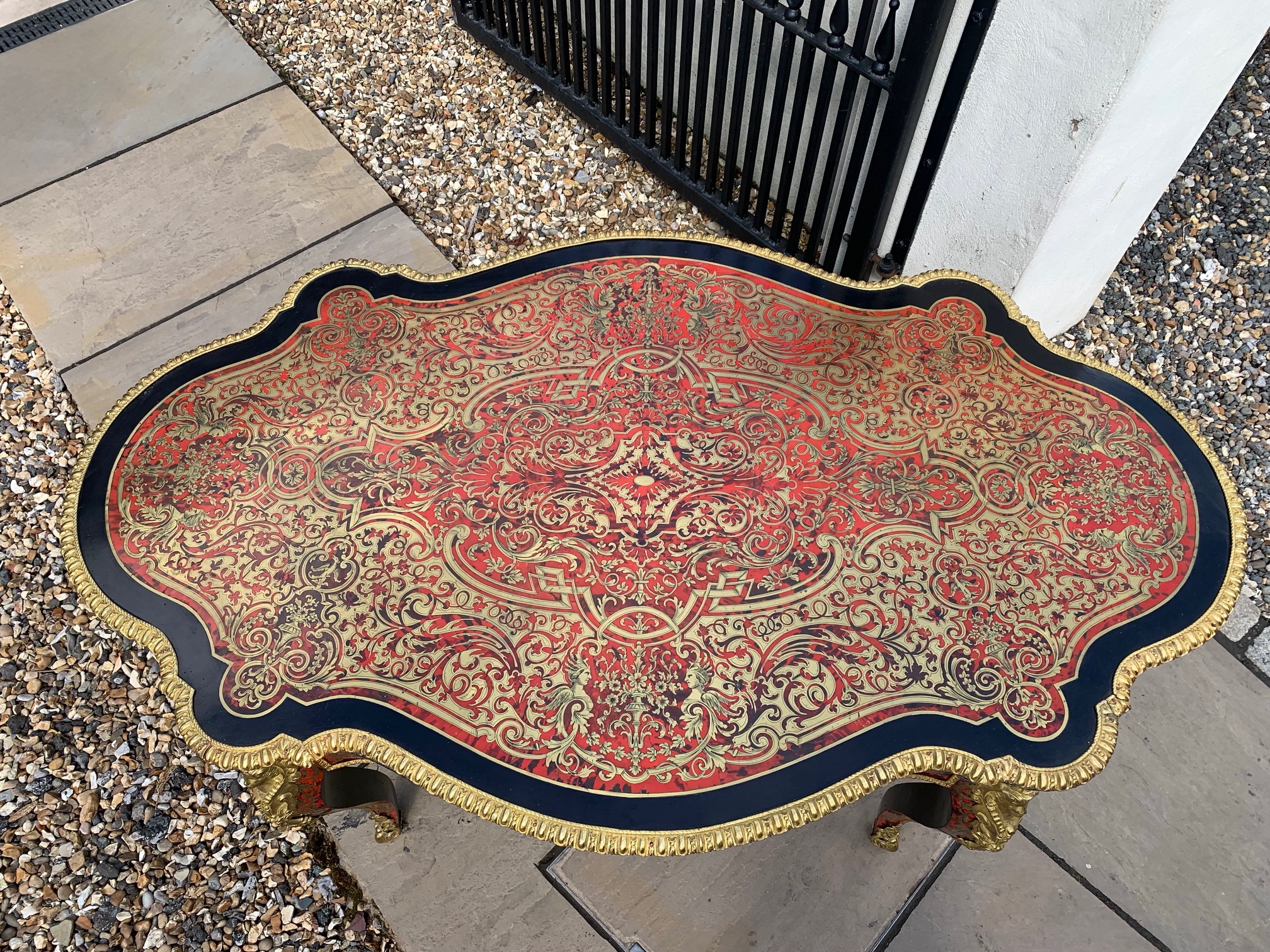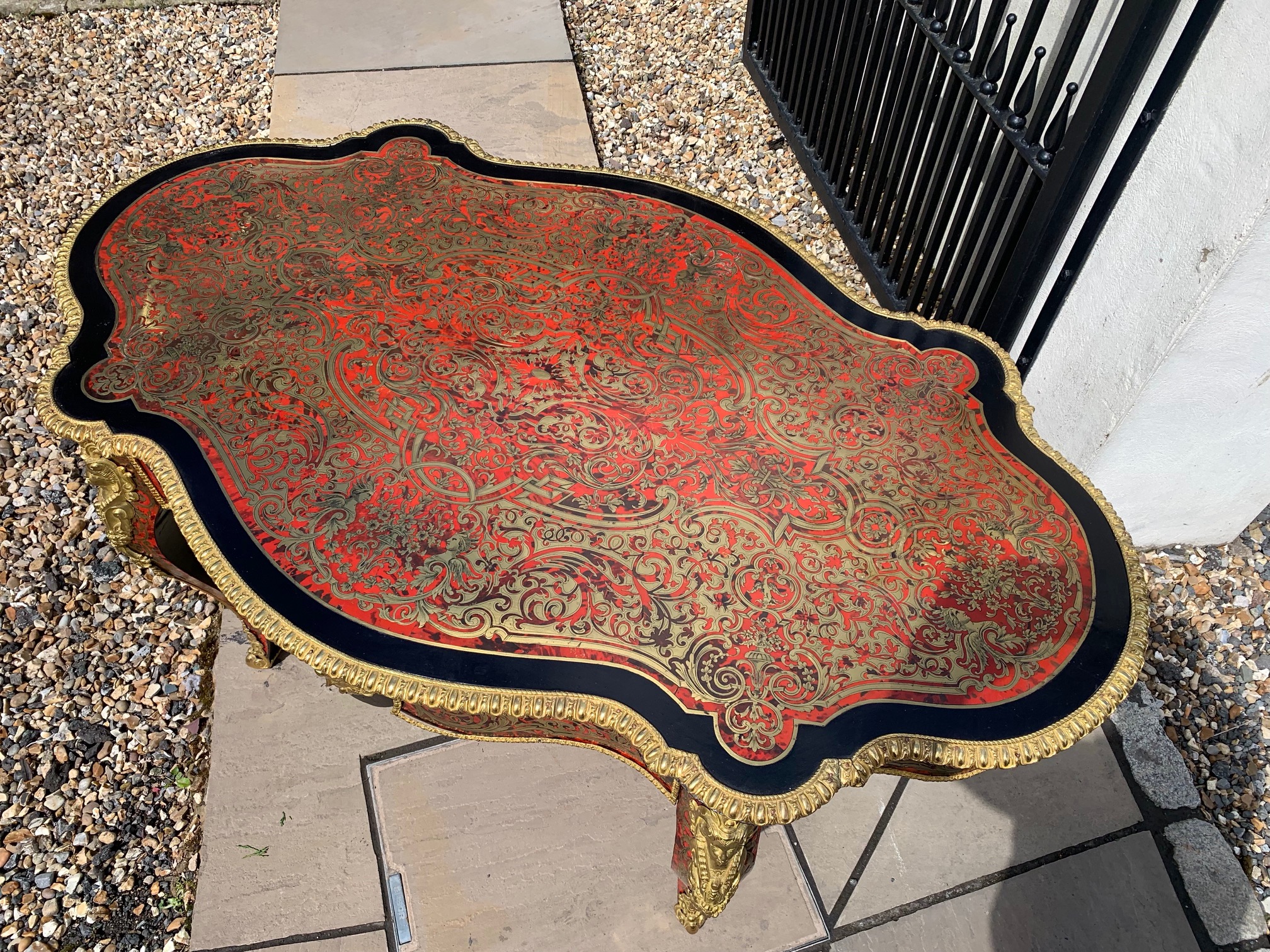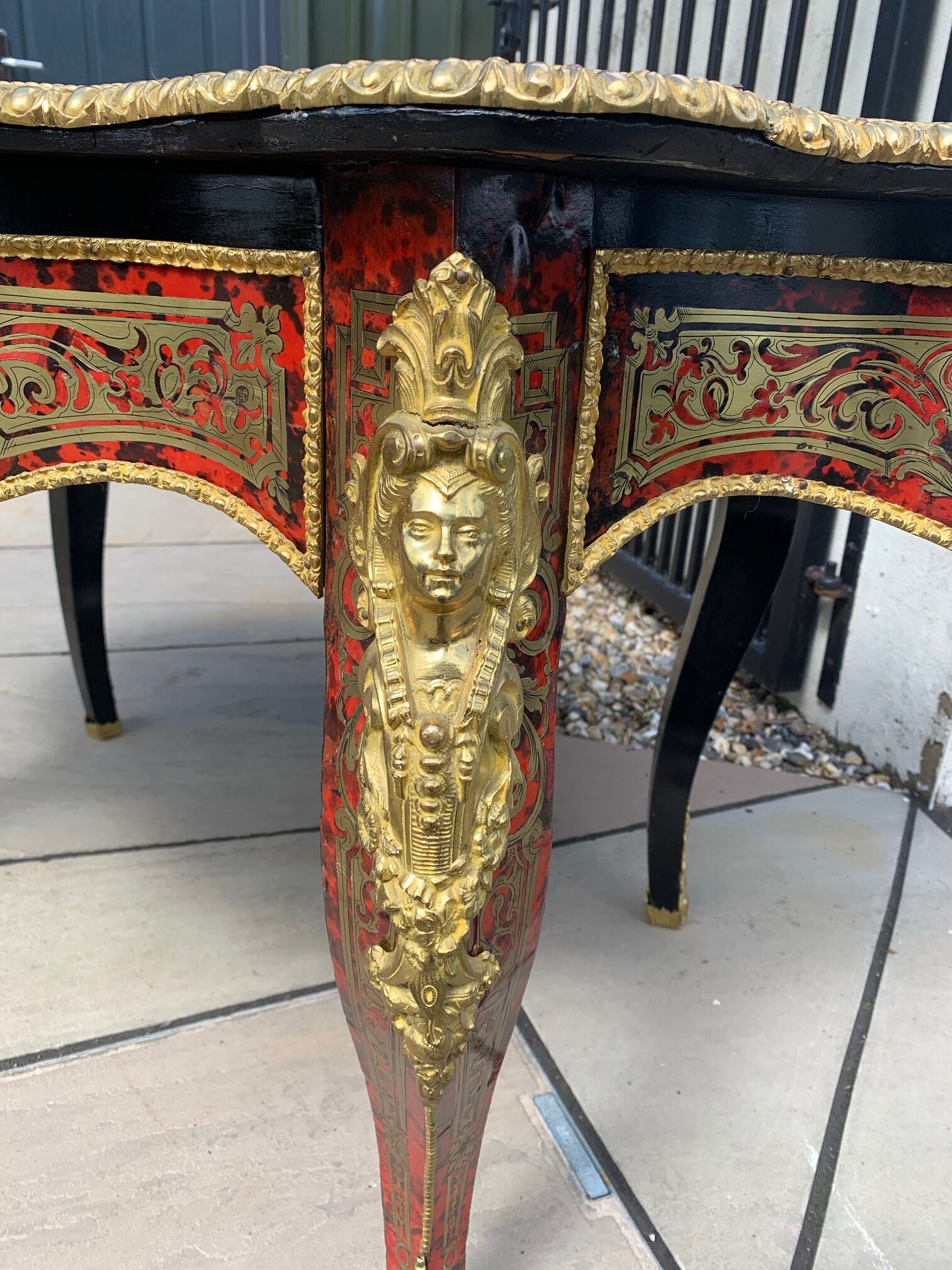 A superb French boulle centre table. The top of serpentine outline with finely engraved and cut brass detail to the red tortoise shell ground, with an ebonised border and ormolu moulding. The front having a concealed mahogany lined drawer with an ormolu mask and raised on cabriole supports with caryatid ormolu mounts and sabots. French circa 1880, in excellent original condition throughout.