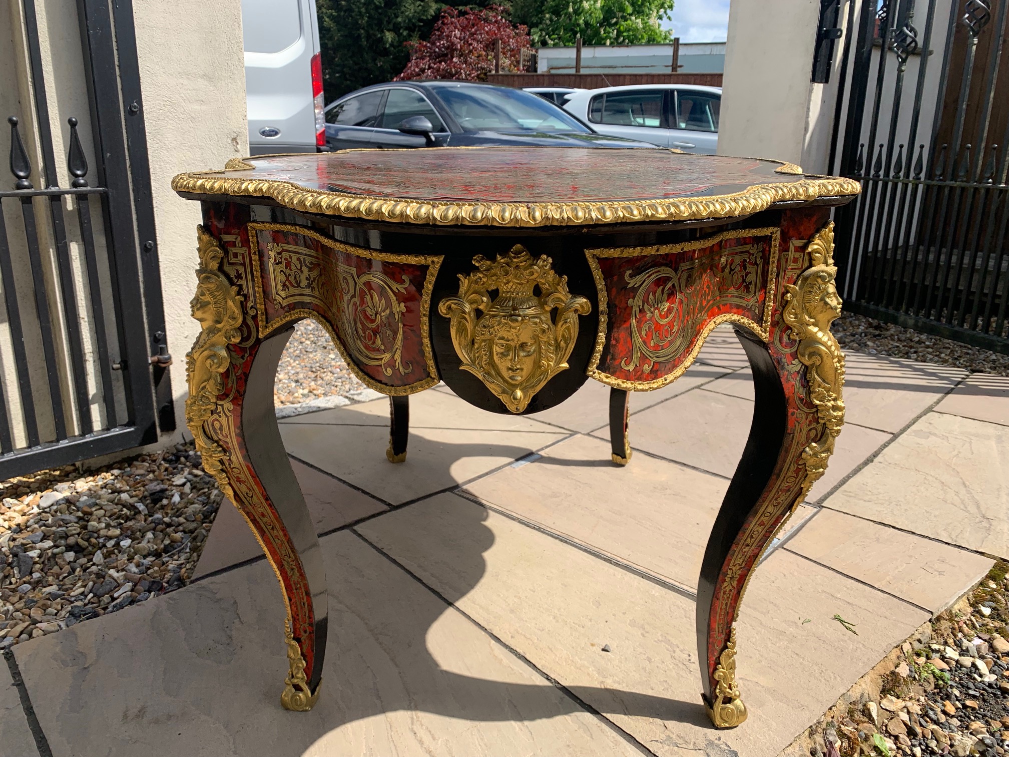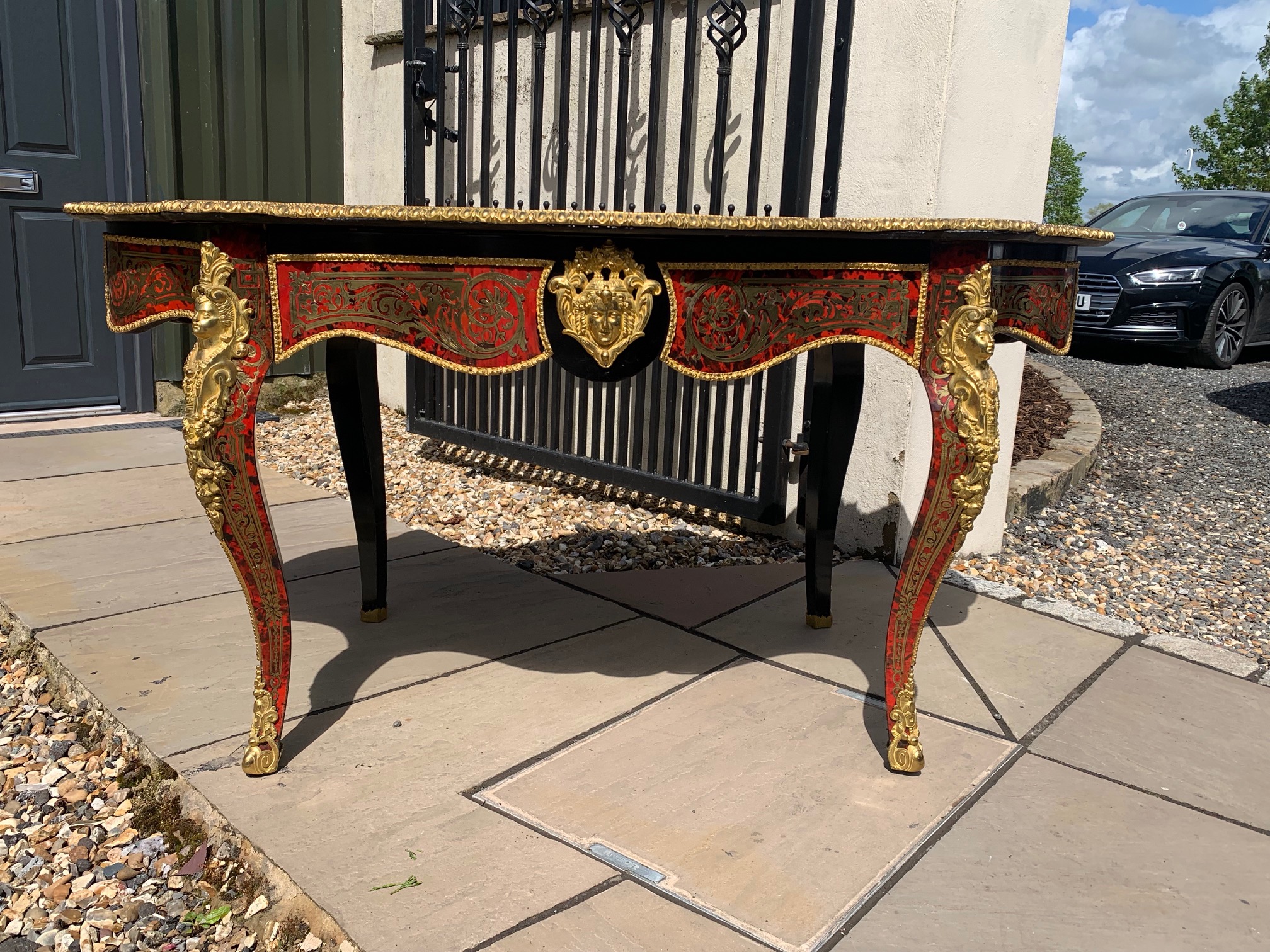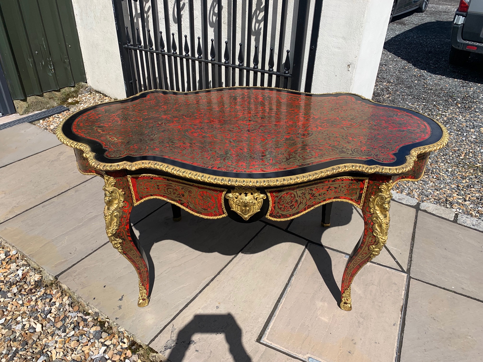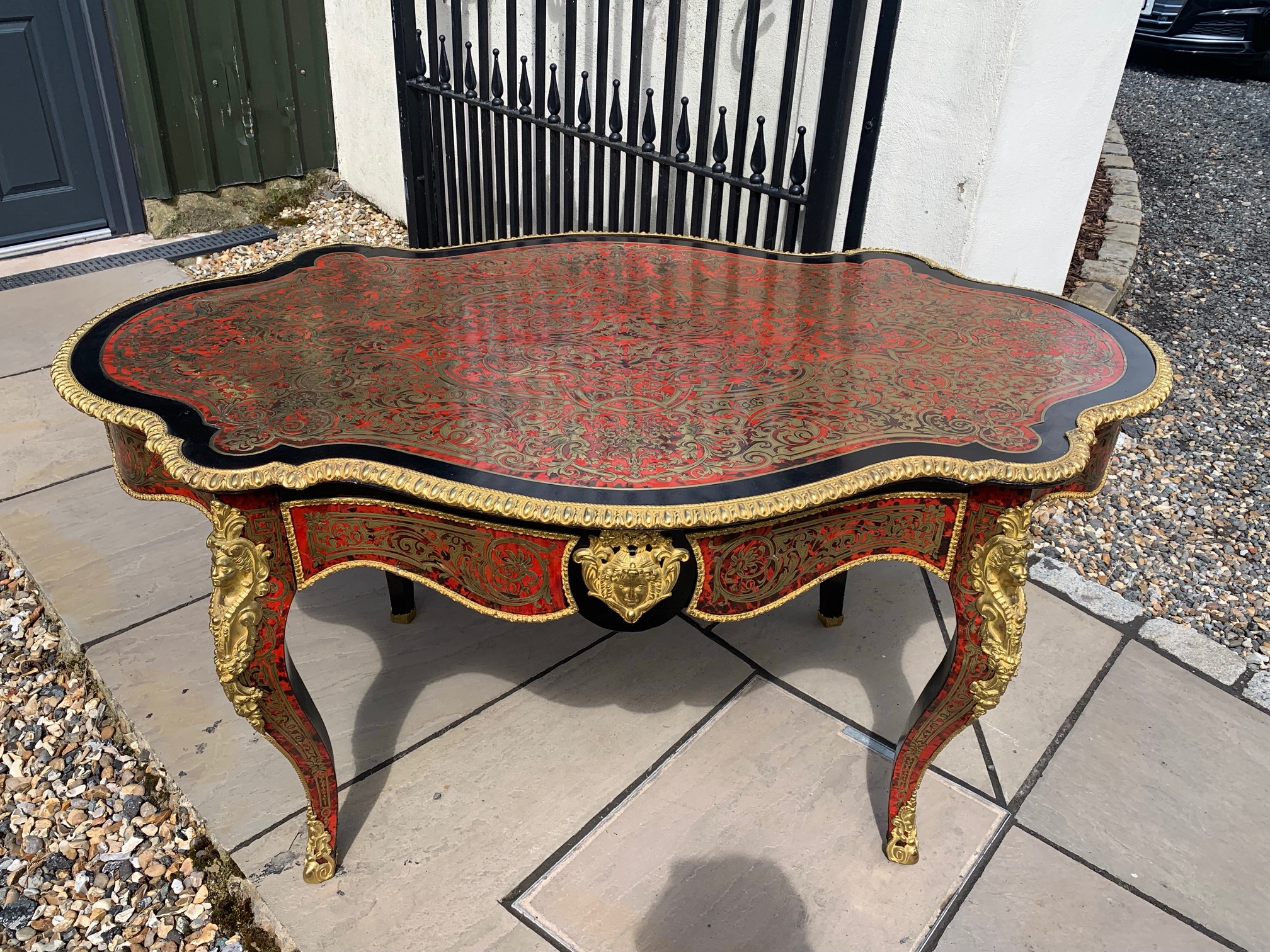 A superb French boulle centre table. The top of serpentine outline with finely engraved and cut brass detail to the red tortoise shell ground, with an ebonised border and ormolu moulding. The front having a concealed mahogany lined drawer with an ormolu mask and raised on cabriole supports with caryatid ormolu mounts and sabots. French circa 1880, in excellent original condition throughout.