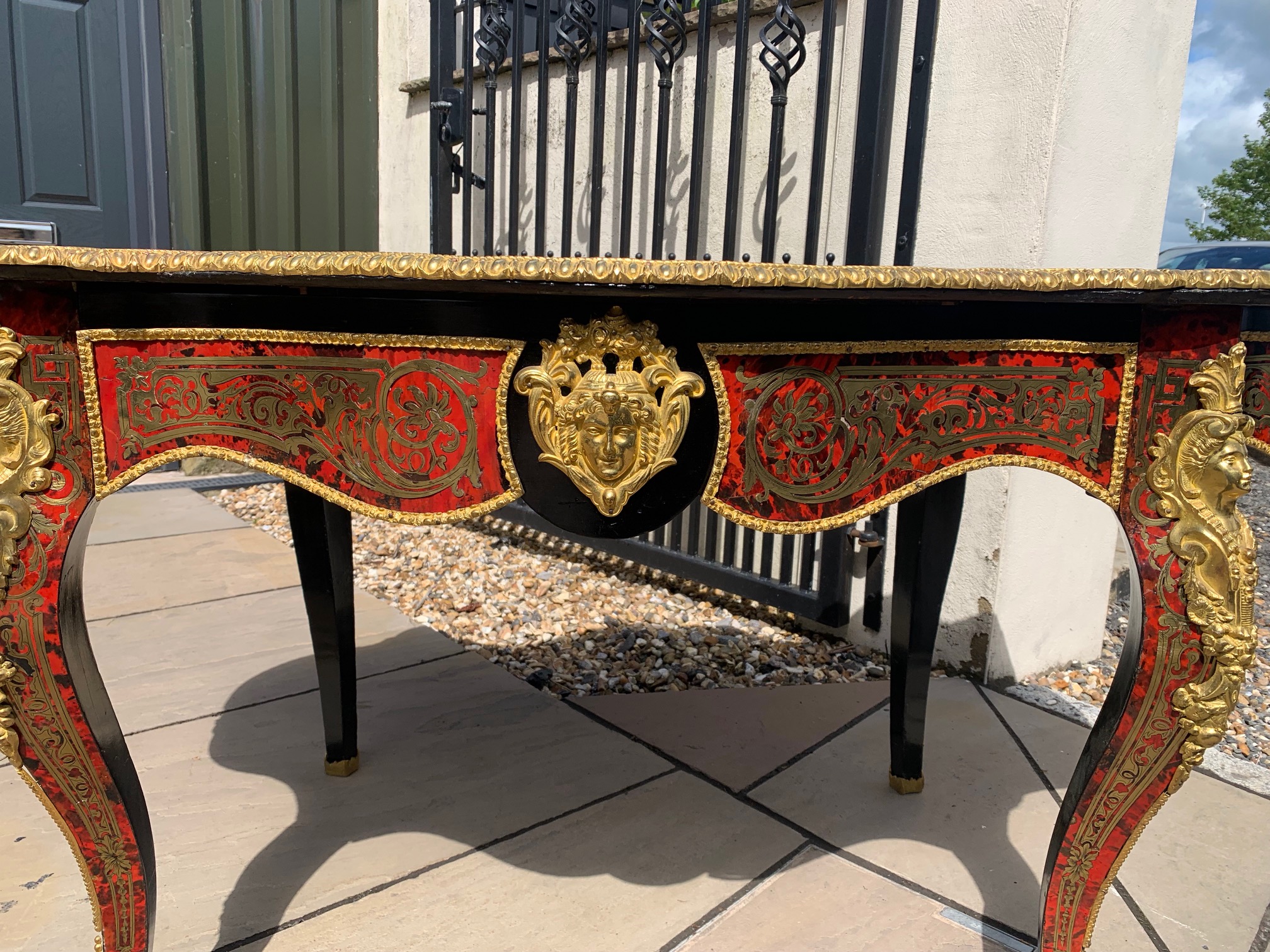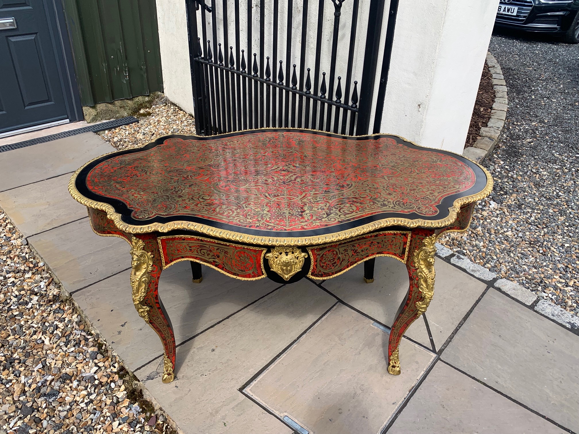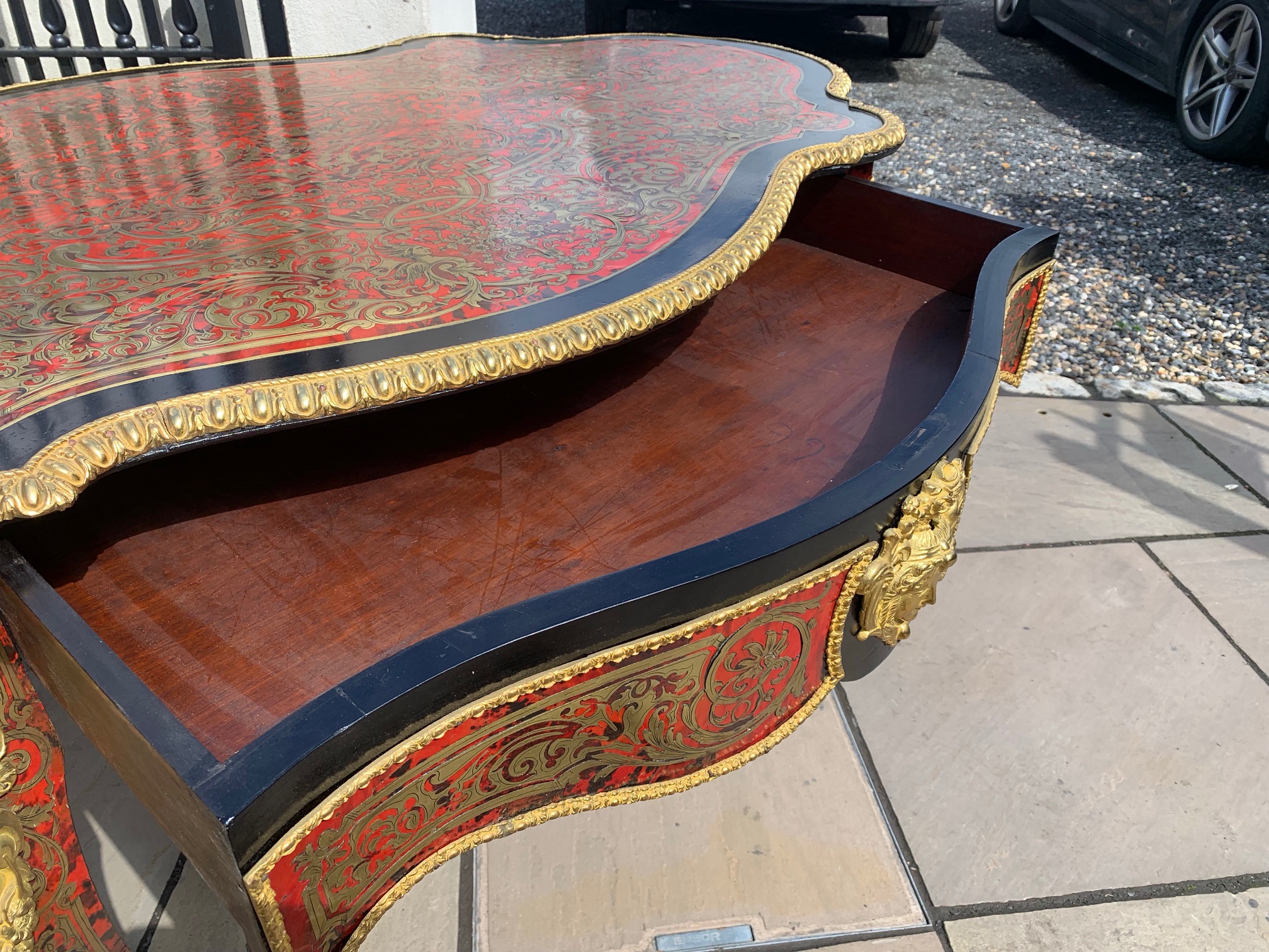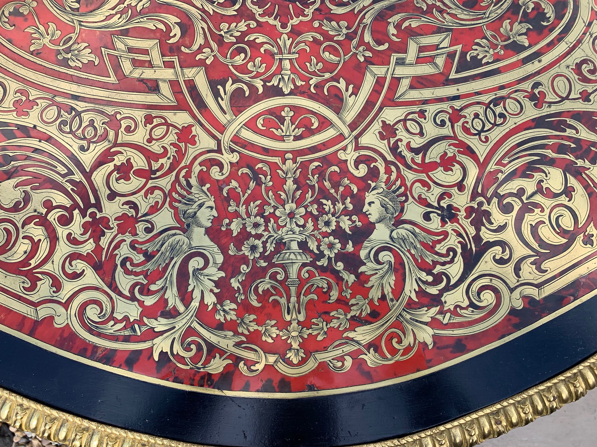 A superb French boulle centre table. The top of serpentine outline with finely engraved and cut brass detail to the red tortoise shell ground, with an ebonised border and ormolu moulding. The front having a concealed mahogany lined drawer with an ormolu mask and raised on cabriole supports with caryatid ormolu mounts and sabots. French circa 1880, in excellent original condition throughout.