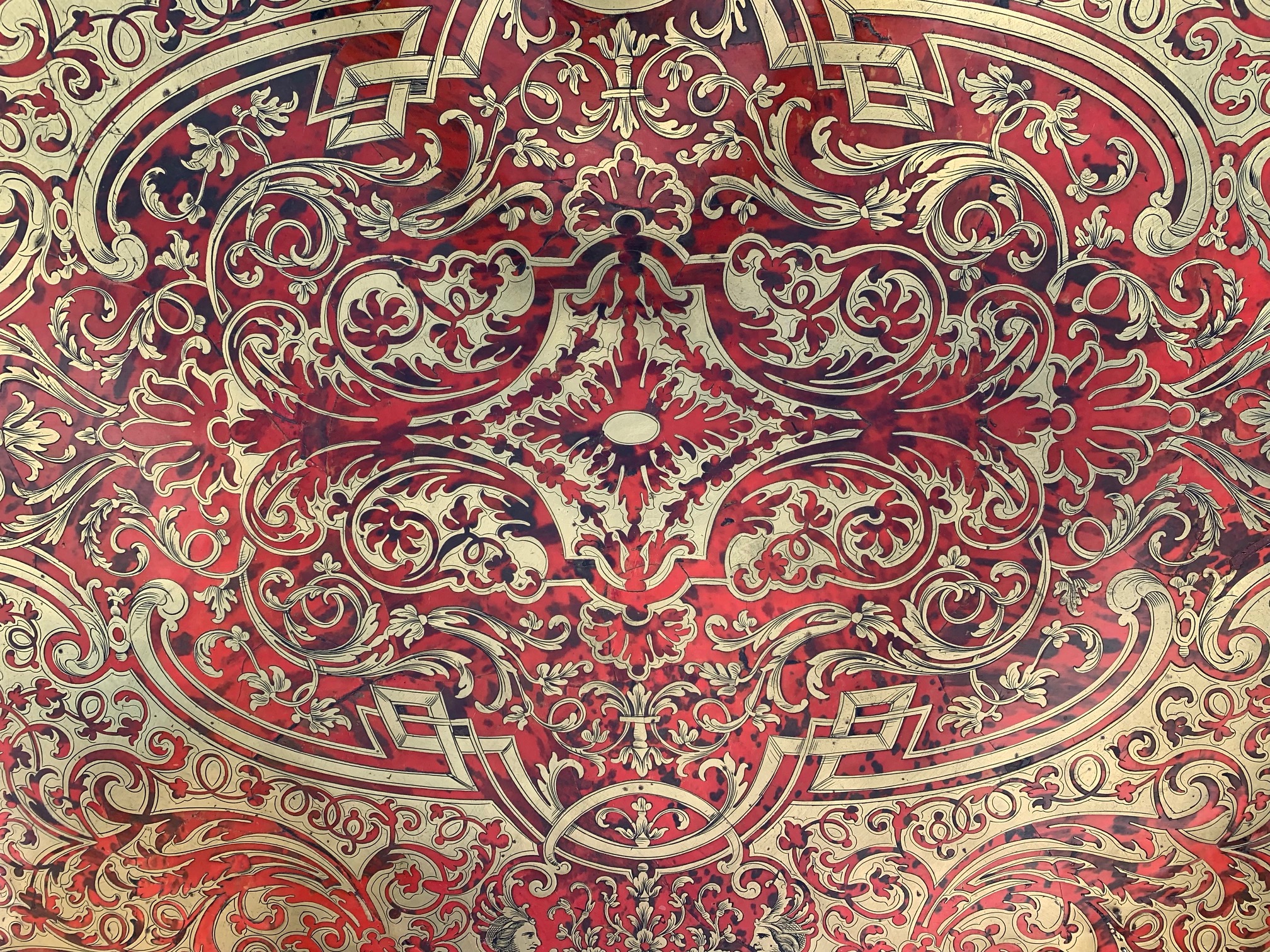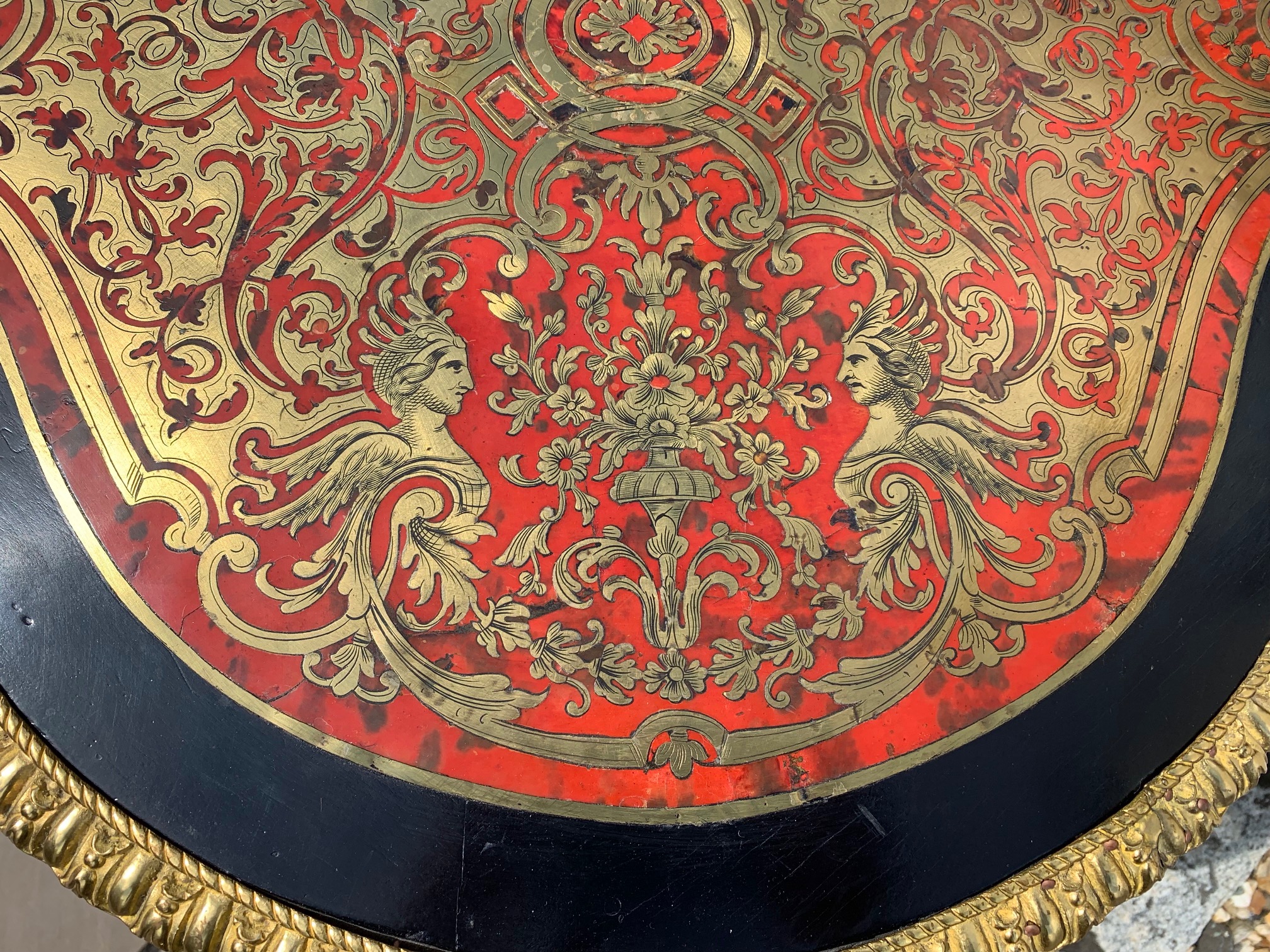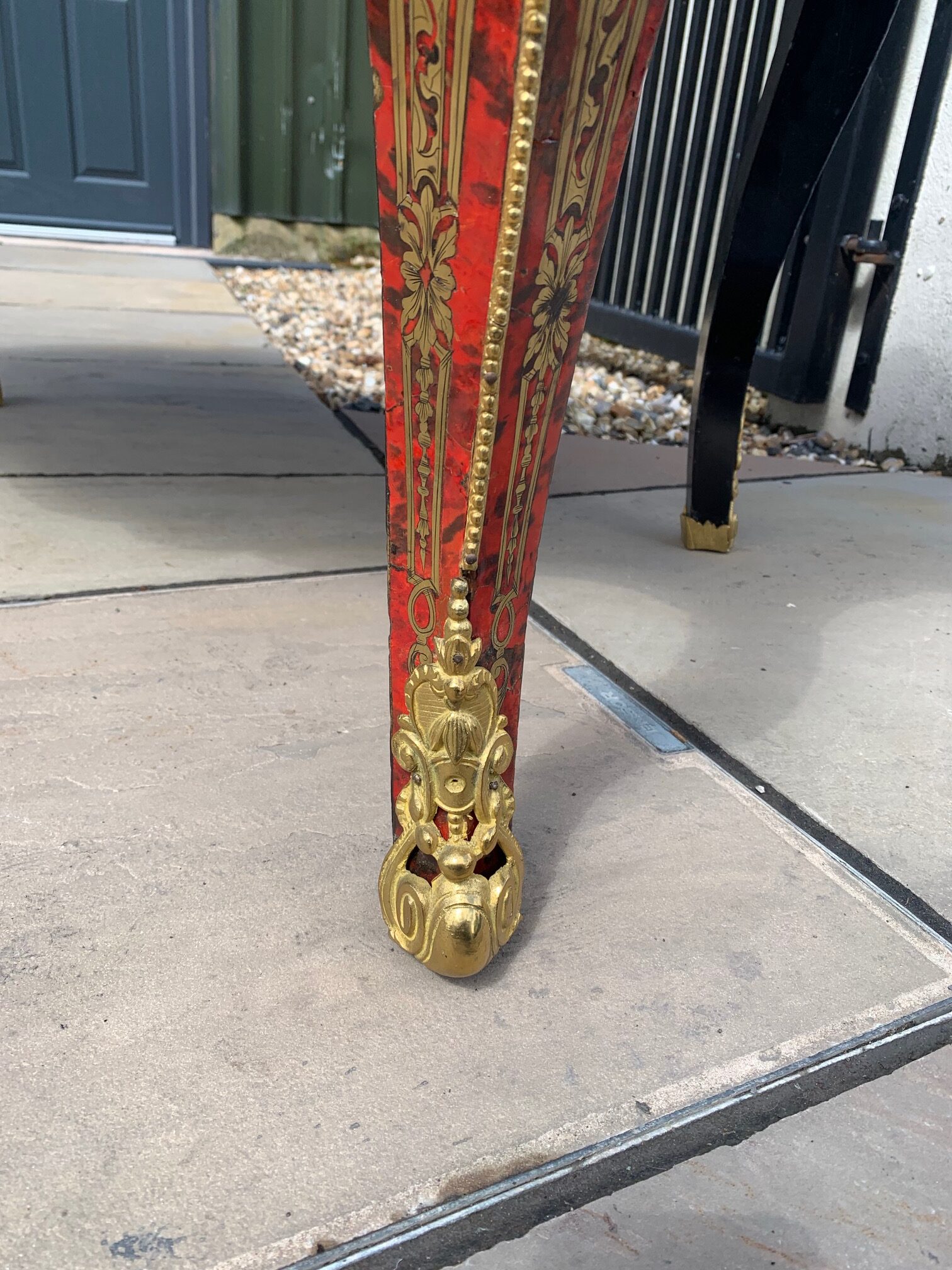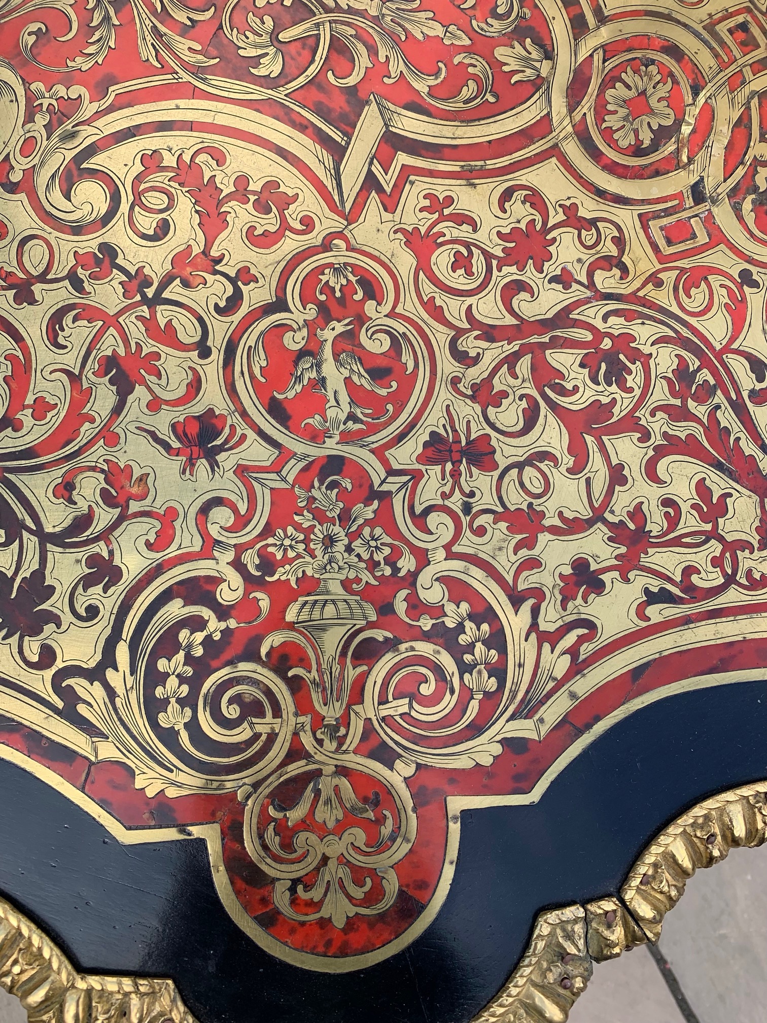 A superb French boulle centre table. The top of serpentine outline with finely engraved and cut brass detail to the red tortoise shell ground, with an ebonised border and ormolu moulding. The front having a concealed mahogany lined drawer with an ormolu mask and raised on cabriole supports with caryatid ormolu mounts and sabots. French circa 1880, in excellent original condition throughout.