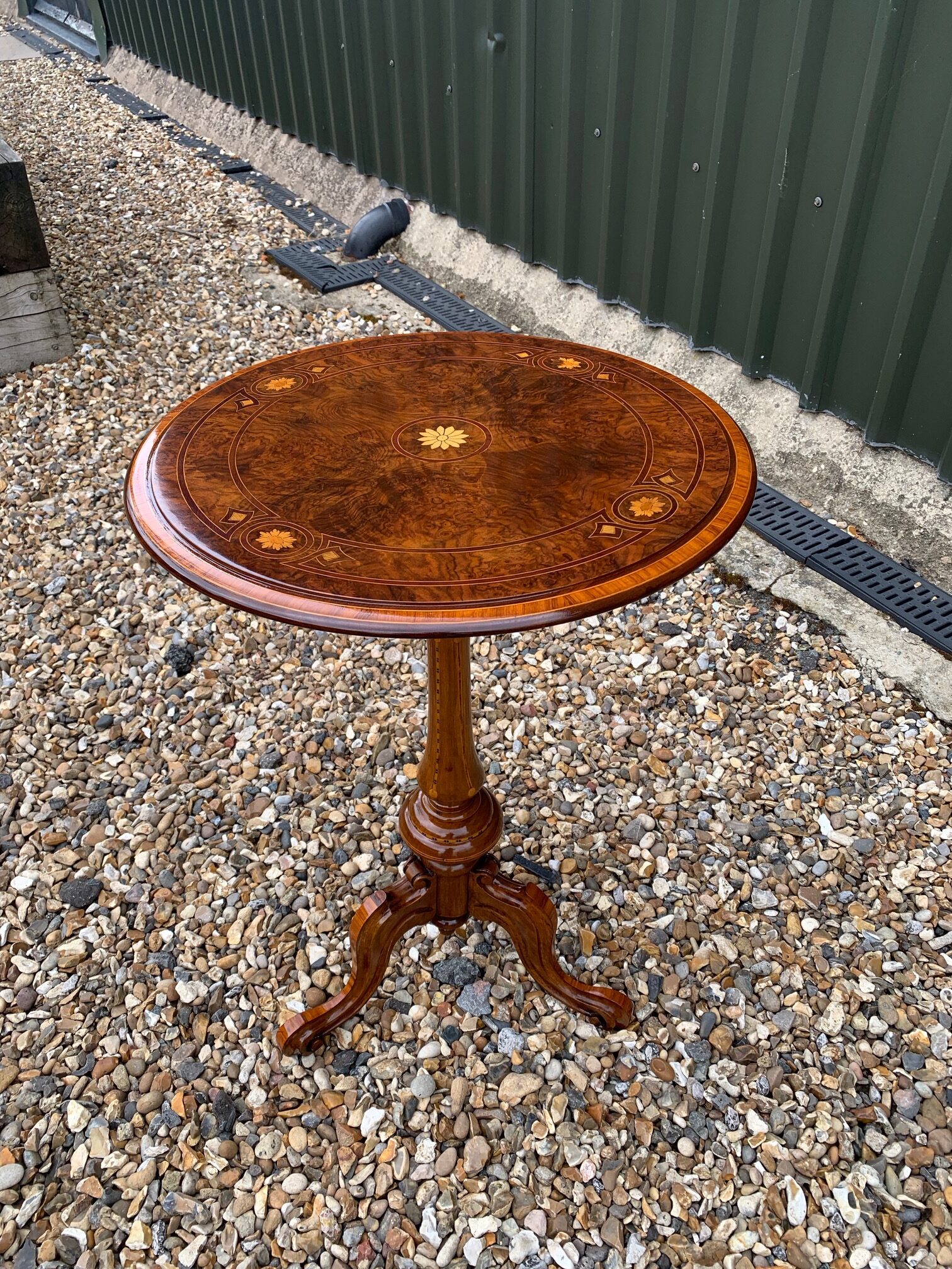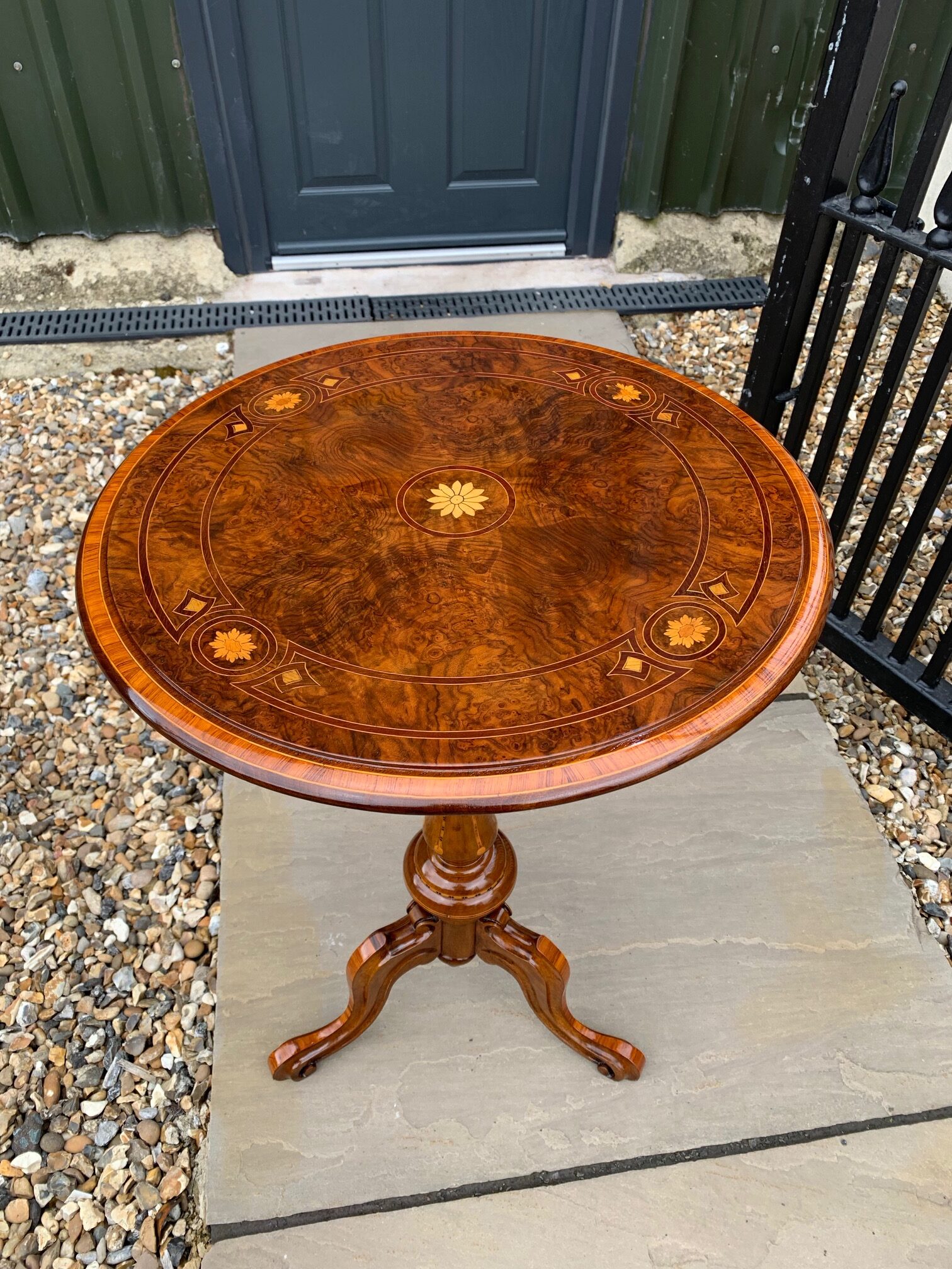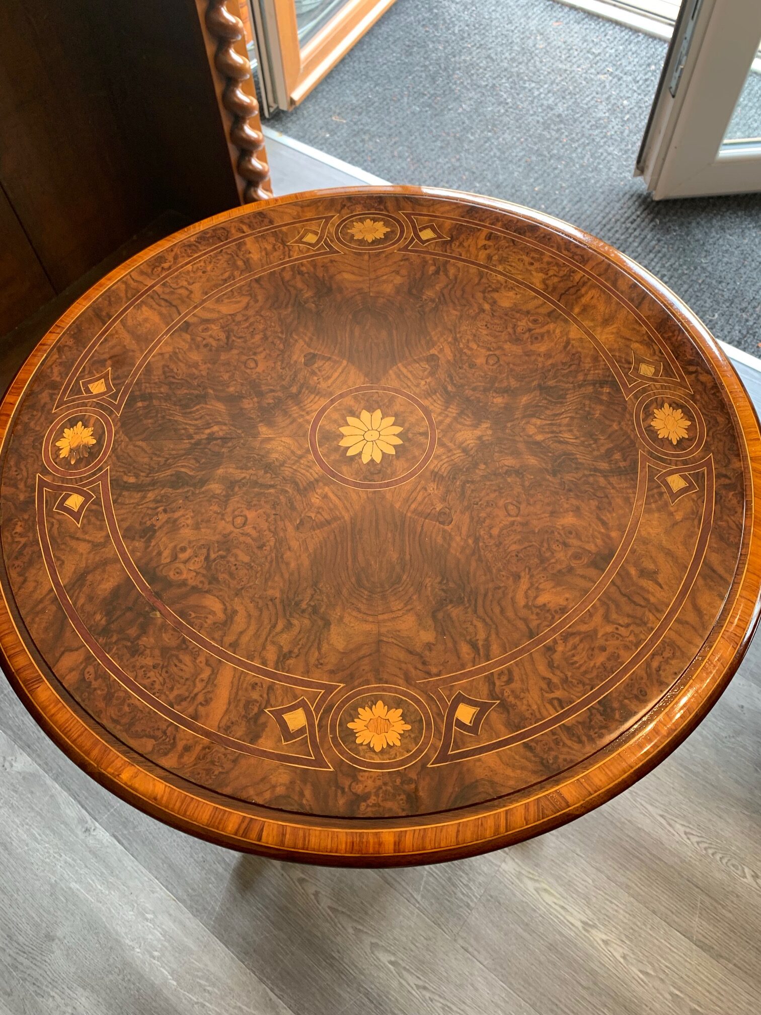 CompareA superb quality Victorian Period burr walnut and marquetry inlaid antique wine table. The circular top in striking burr walnut veneers with a purple heart and marquetry inlaid border and also banded in tulipwood to the moulded edge. Raised on a turned walnut column with chequer band and Purple Heart inlaid detail, with three French Cabriole leg supports with tulipwood banding. English circa 1870-1880, in superb condition
